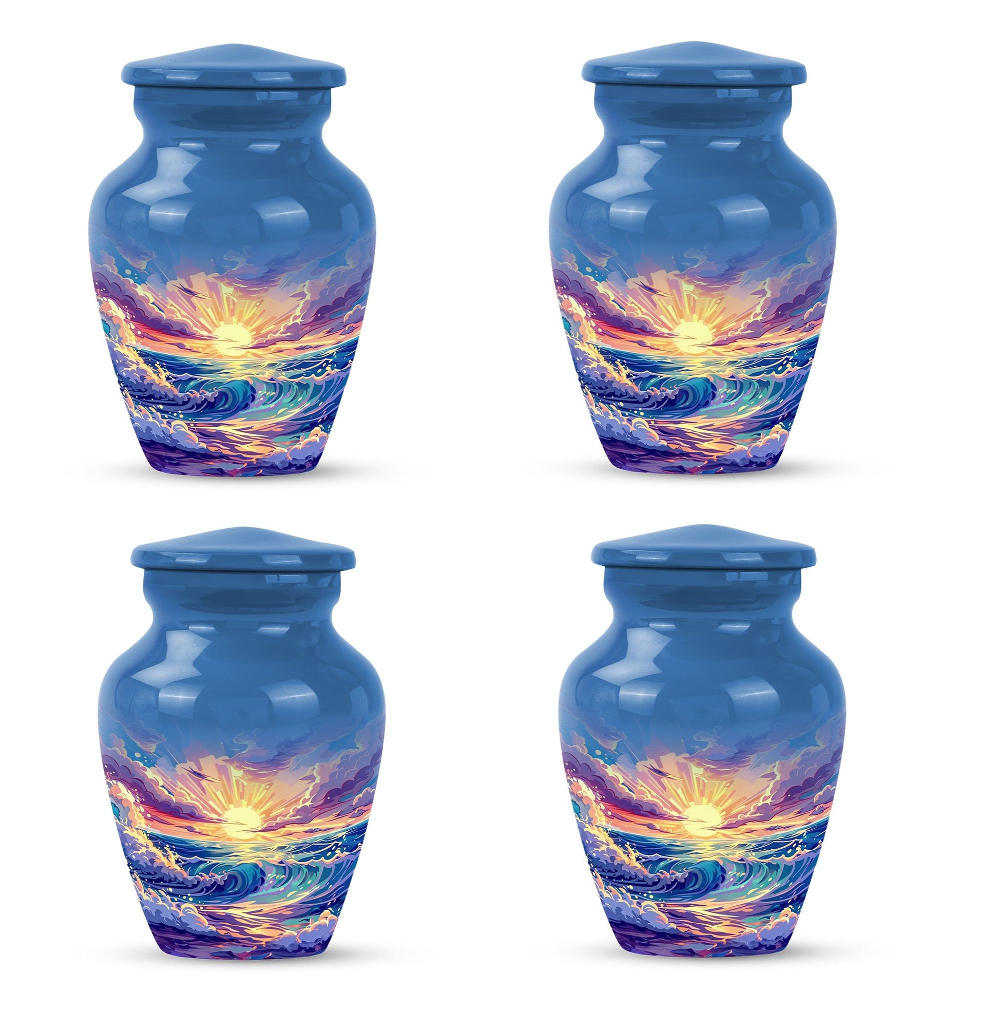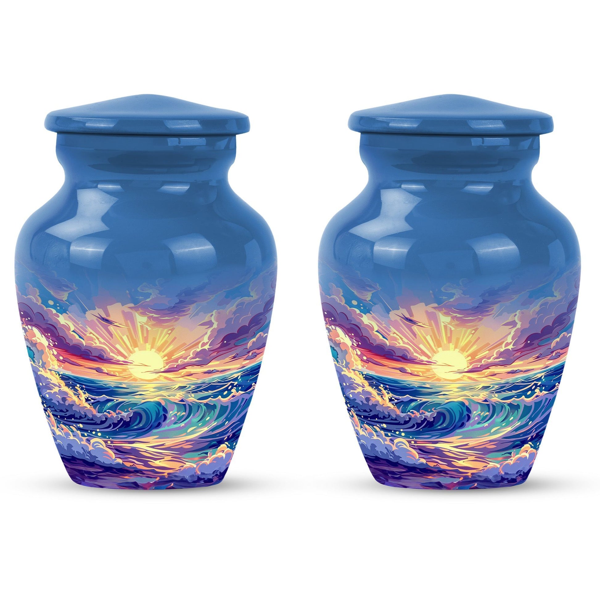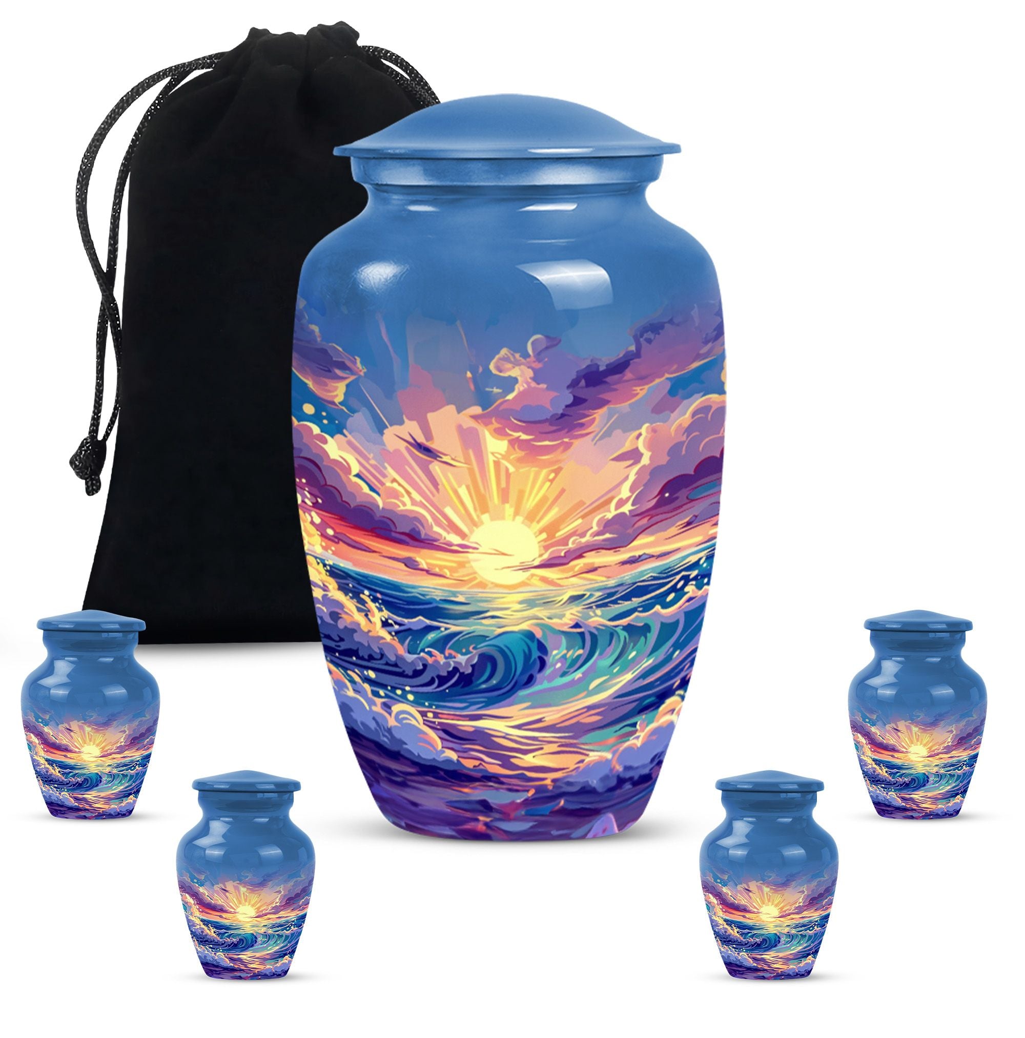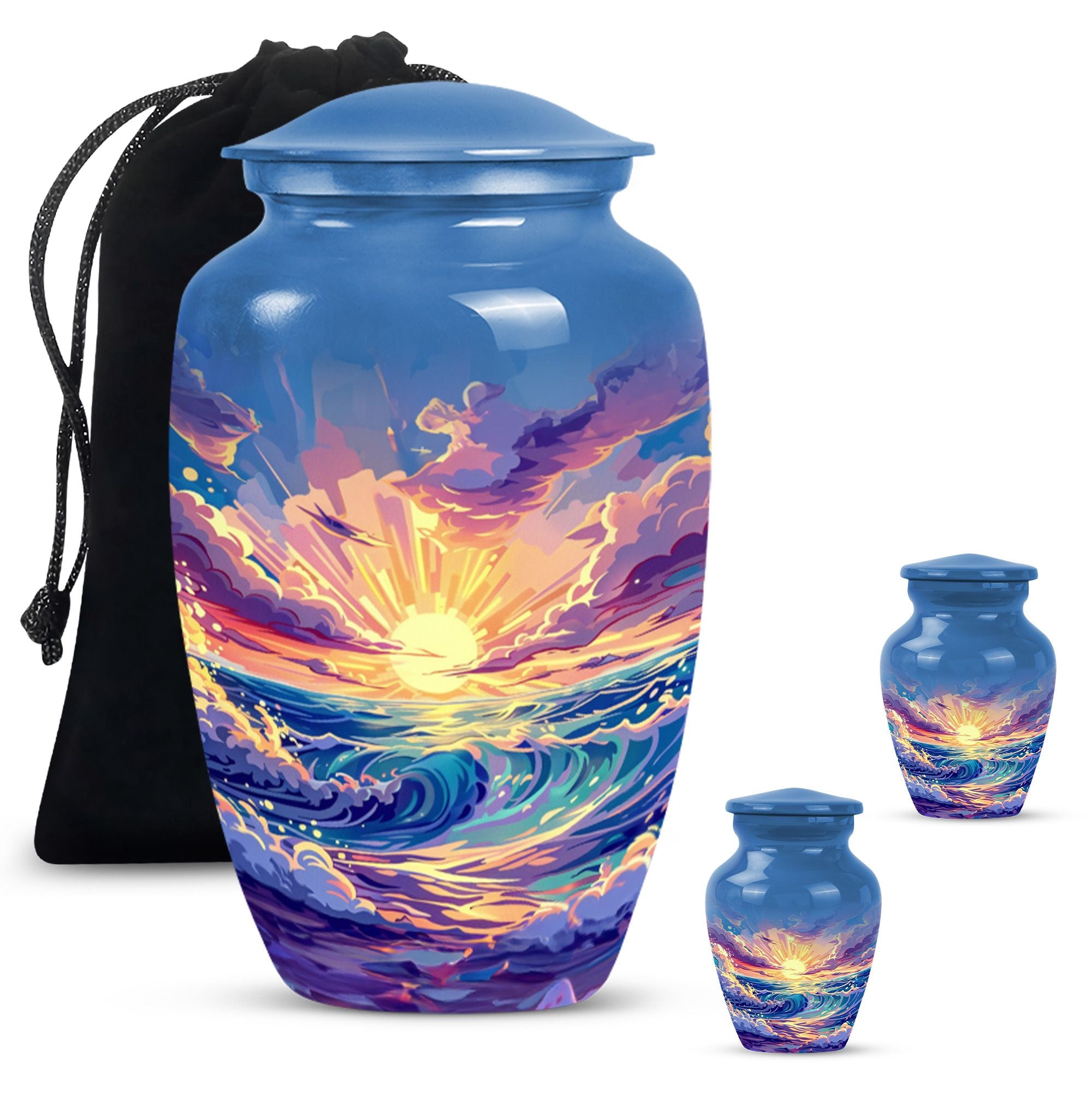 Our Ocean Waves Urn is a distinctive and solemn option for those seeking to remember a cherished adult male in their lives. Meticulously crafted from high-quality Aluminium, this large urn measures 10 inches in height and can comfortably accommodate 200 cubic inches of ashes. The dignified Butterfly theme imparts a gentle sense of tranquility, making it an exquisite addition to any memorial ceremony. To make it even more special, there is an option to personalize the urn with engraved names. It's conveniently sized- neither too big nor too small- a perfect fit for most ceremonial needs. Along with the urn, we provide a velvet pouch to carefully hold the ashes, ensuring they stay safe. Weighing just 3.3 pounds, the urn is easy to carry and handle. Pay tribute to your loved ones with this elegant cremation urn. Uncommon phrases related to this product include funeral urns for human ashes or companion urns for two adults.