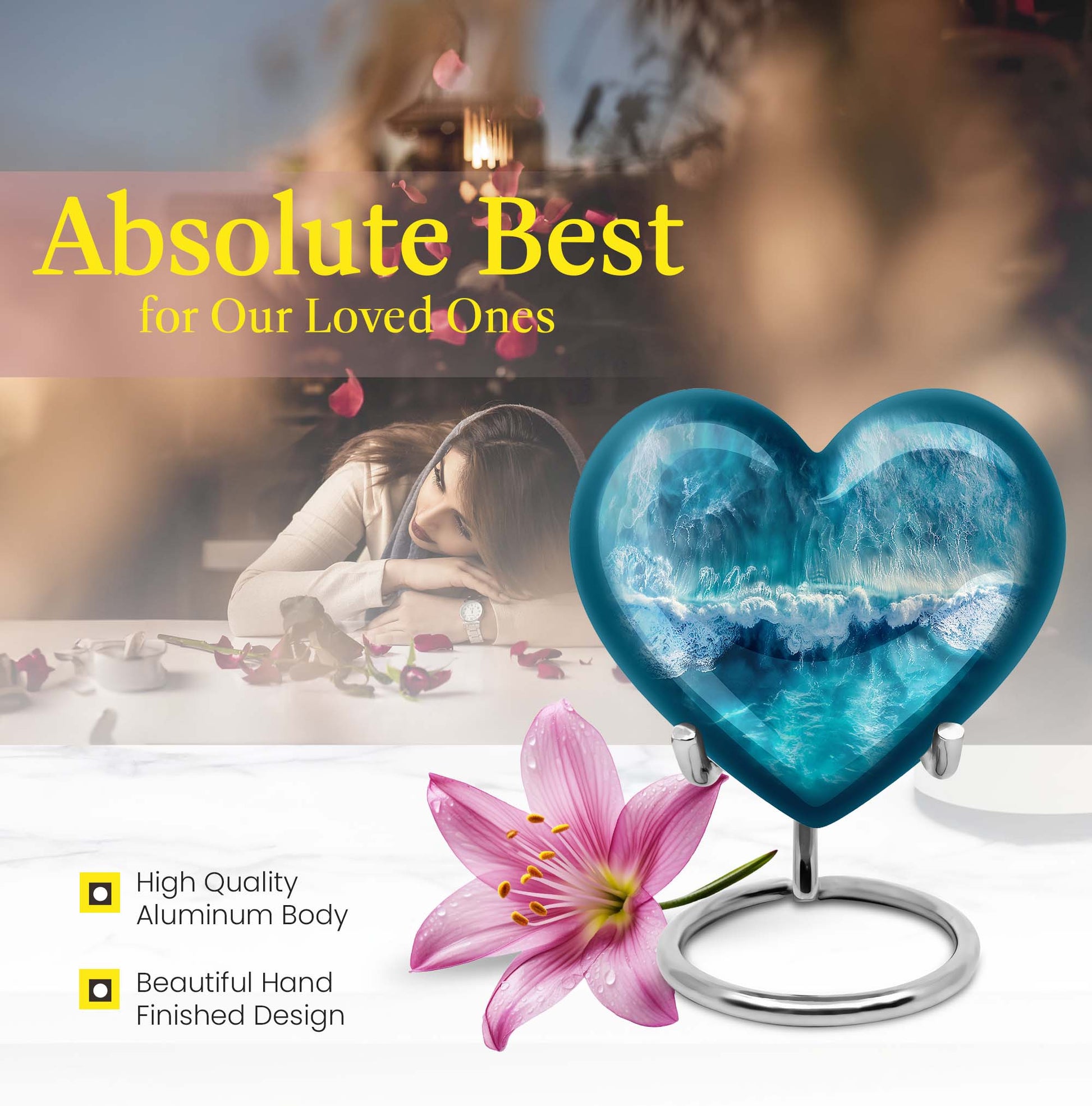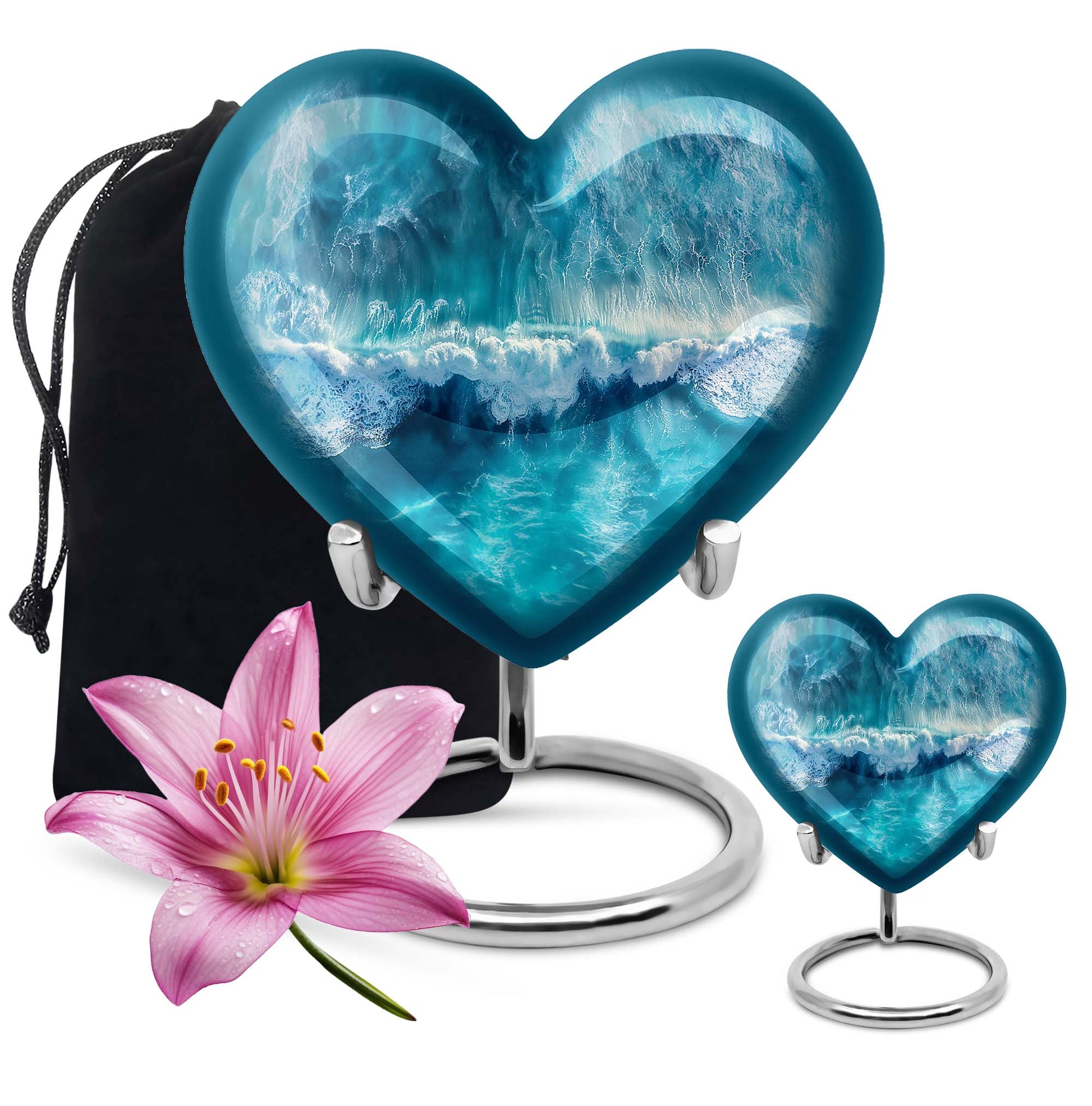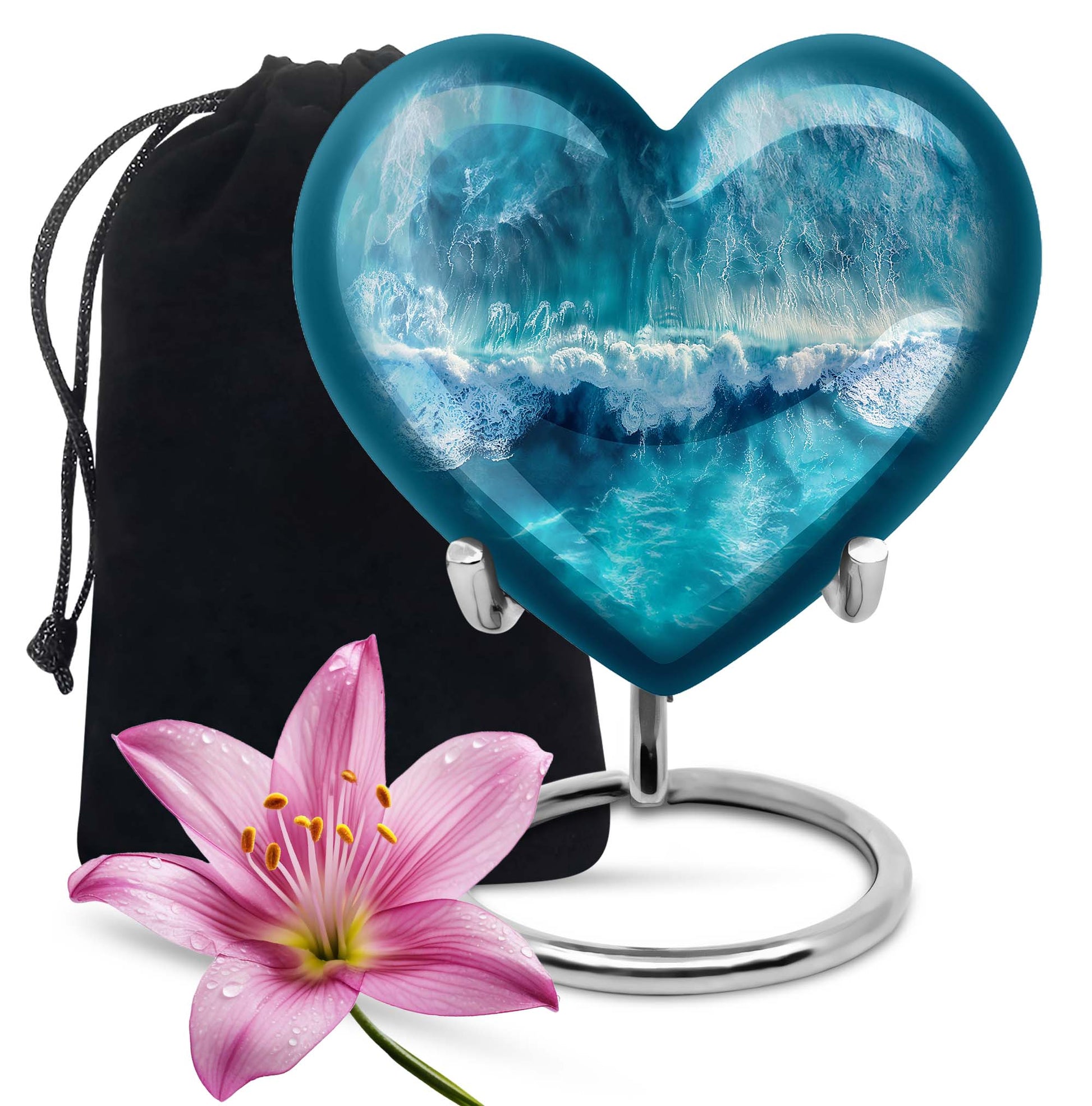 Celebrate the memory of your loved ones with our heart-shaped, ocean waves Urn. Created from durable aluminium, it gracefully stands 10 inches tall and accompanied with a velvet pouch for the secure containment of ashes. This funeral medium-size urn delivers a unique combination of strength, shades of serene ocean waves and a fluttering butterfly symbolising renewal and transformation. It has a capacity of holding up to 200 cubic inches of ashes, weighing a solid 3.3 pounds. Easily customizable, it offers space to personalize with engraved names. Ideal as a large urn for human ashes, its design offers a comforting sense of calm to help you keep cherished memories alive. Lastly, prepare for a pain-free aftercare with this beautifully designed cremation urn. Especially suited for those searching for 'Memorial medium urn', or 'urn human ash adult ash', this piece is a meaningful choice for remembrance.