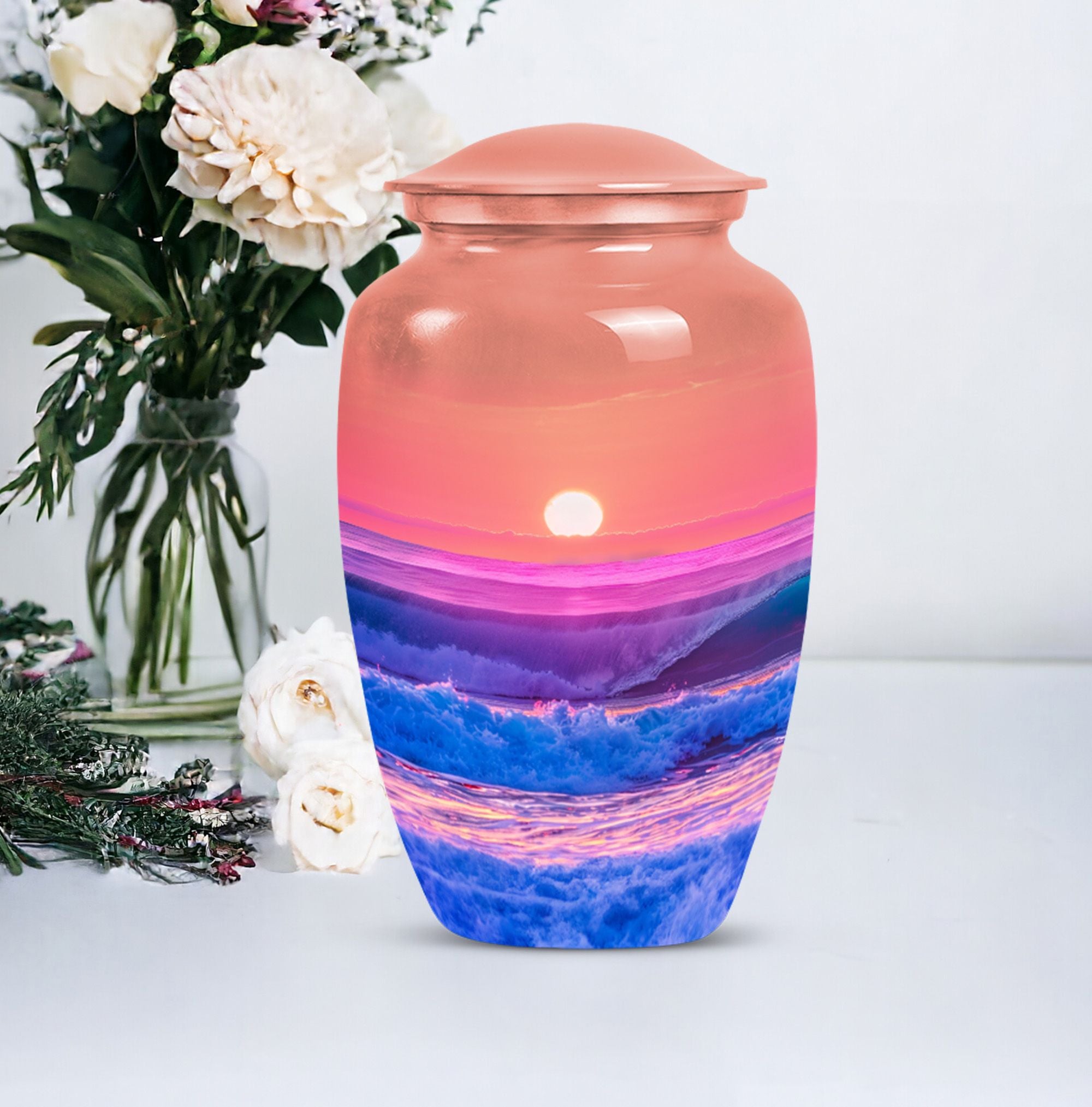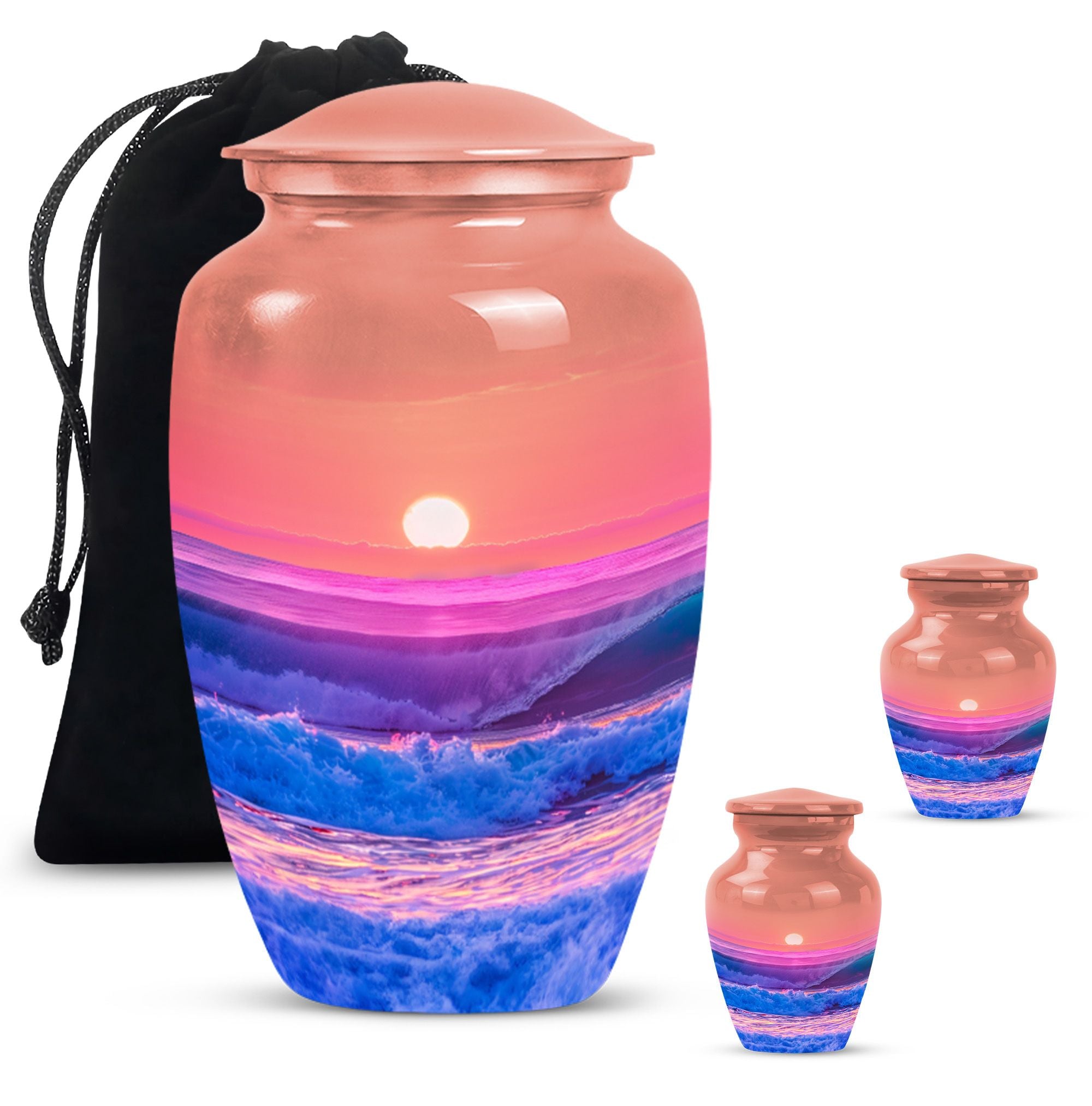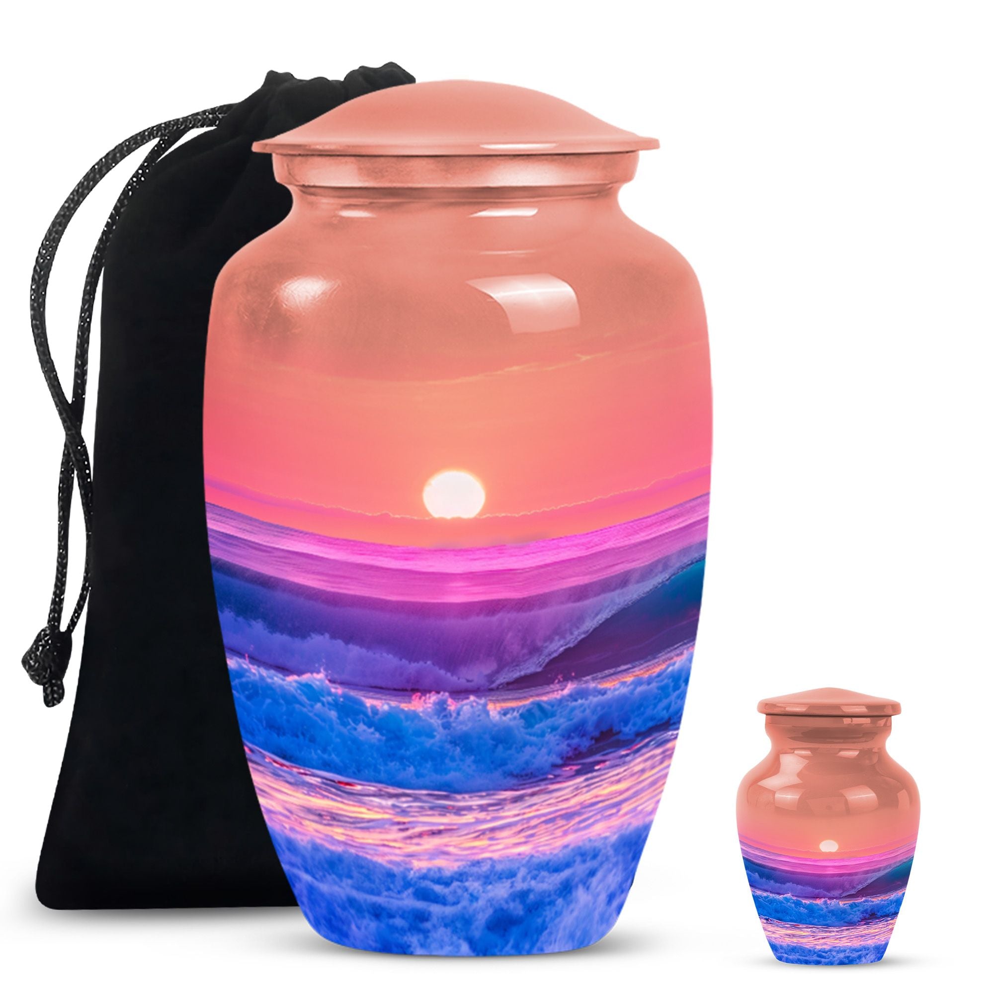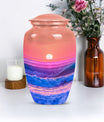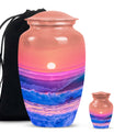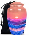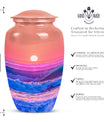 Immerse yourself in the serene elegance of this ocean waves urn, a fitting tribute to honor the memory of adults and seniors. Our ever-respected butterfly theme is delicately echoed in this large urn, hinting at peace, transformation, and continuity. Crafted meticulously from resilient aluminium, it resounds the high-quality tenacity the container possesses. The memorial urn stands proud and noticeable at 10 inches, with a weight of a reasonable 3.3 pounds, making it a tasteful centerpiece to any memorial ceremony. This funeral burial urn ensures a substantial capacity of 200 cubic inches, providing ample space for human ashes. Adding a personal touch, you have the option to customize this sublime urn by engraving names for an intimate remembrance. Each urn arrives with a luxurious velvet pouch for containment of ashes, encapsulating its elegance while adding an extra security layer. Dive into serenity with these exquisite human ash urns - providing a vessel of remembrance as boundless and ever-lasting as the ocean waves.