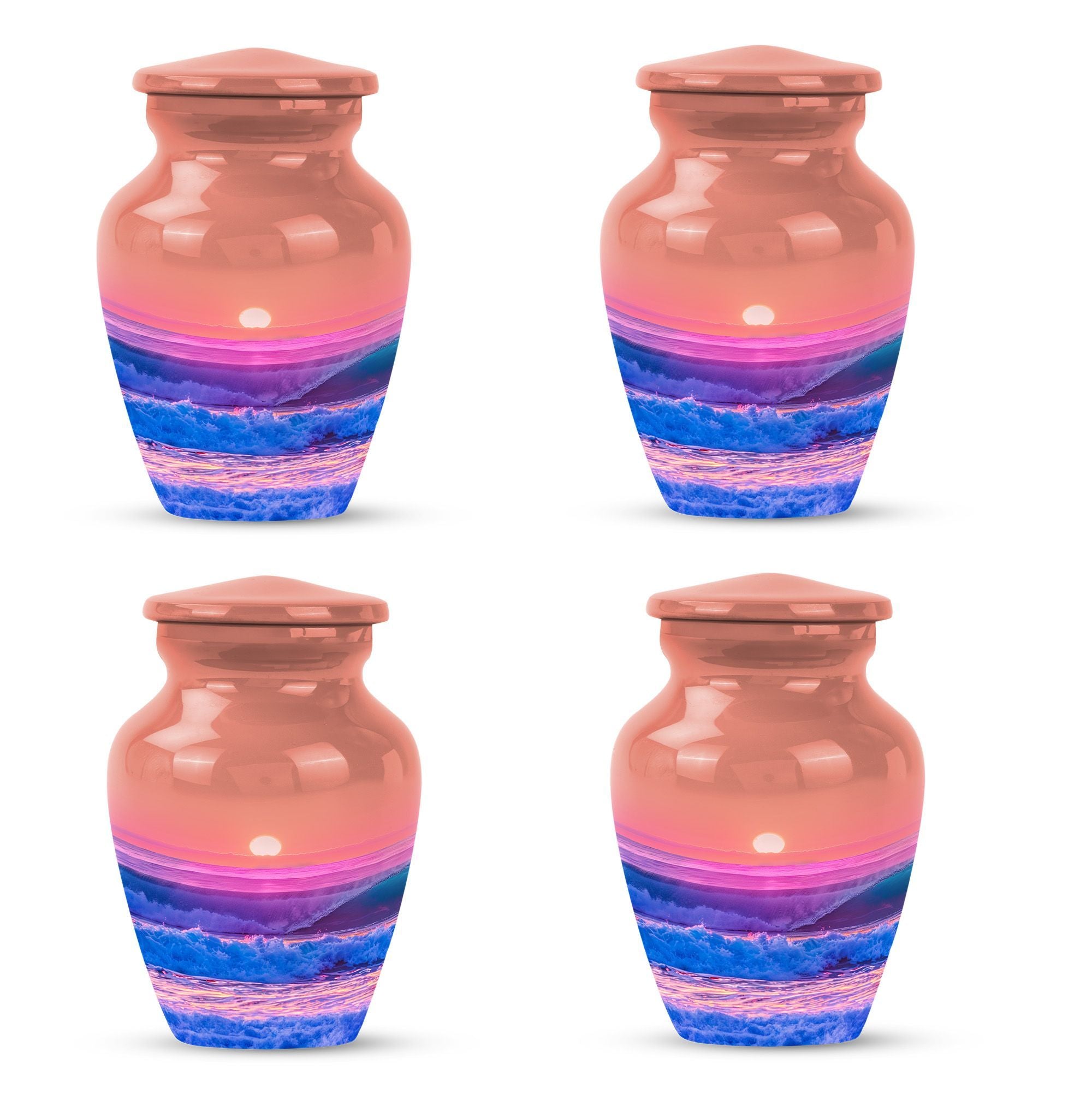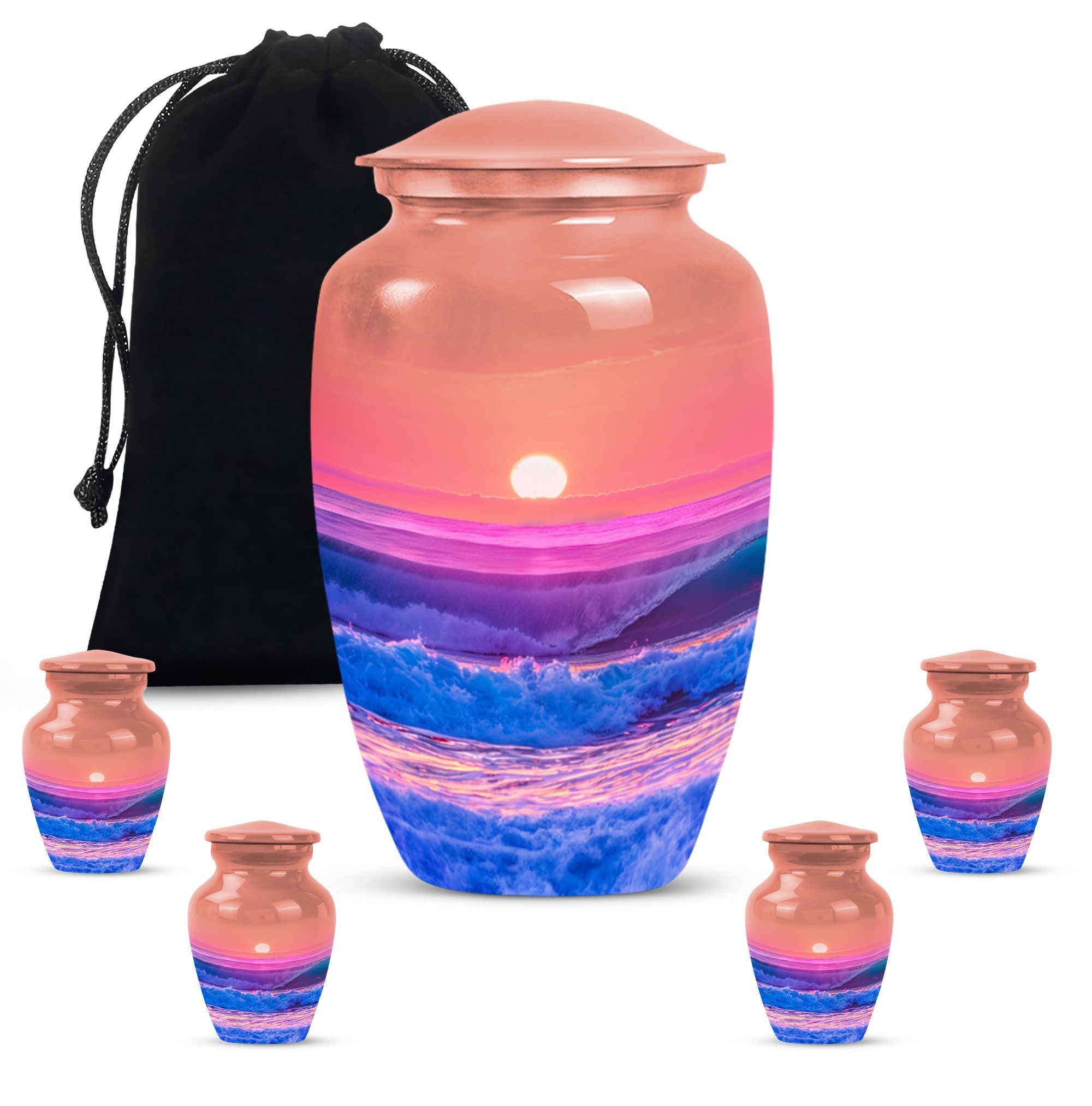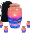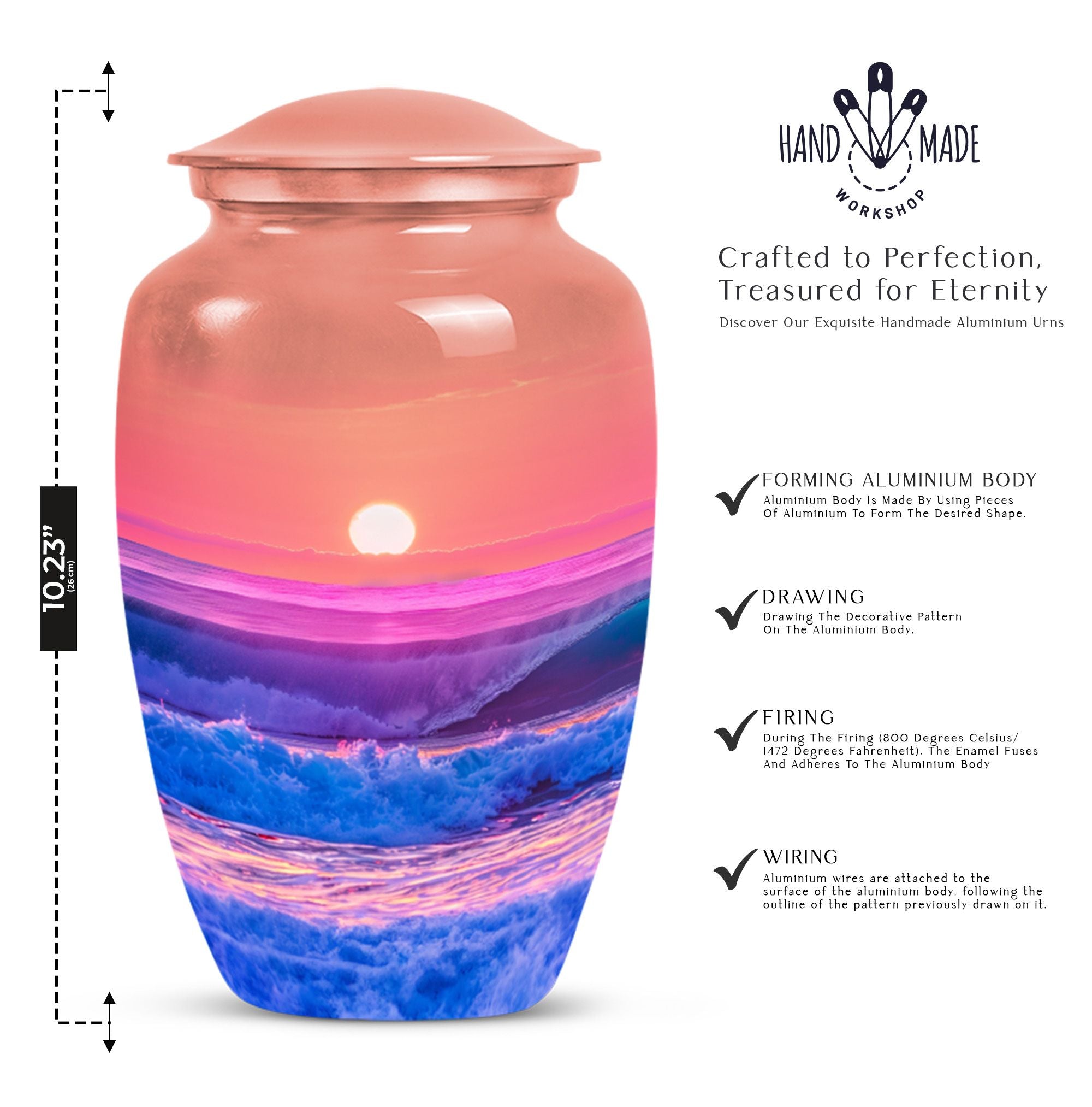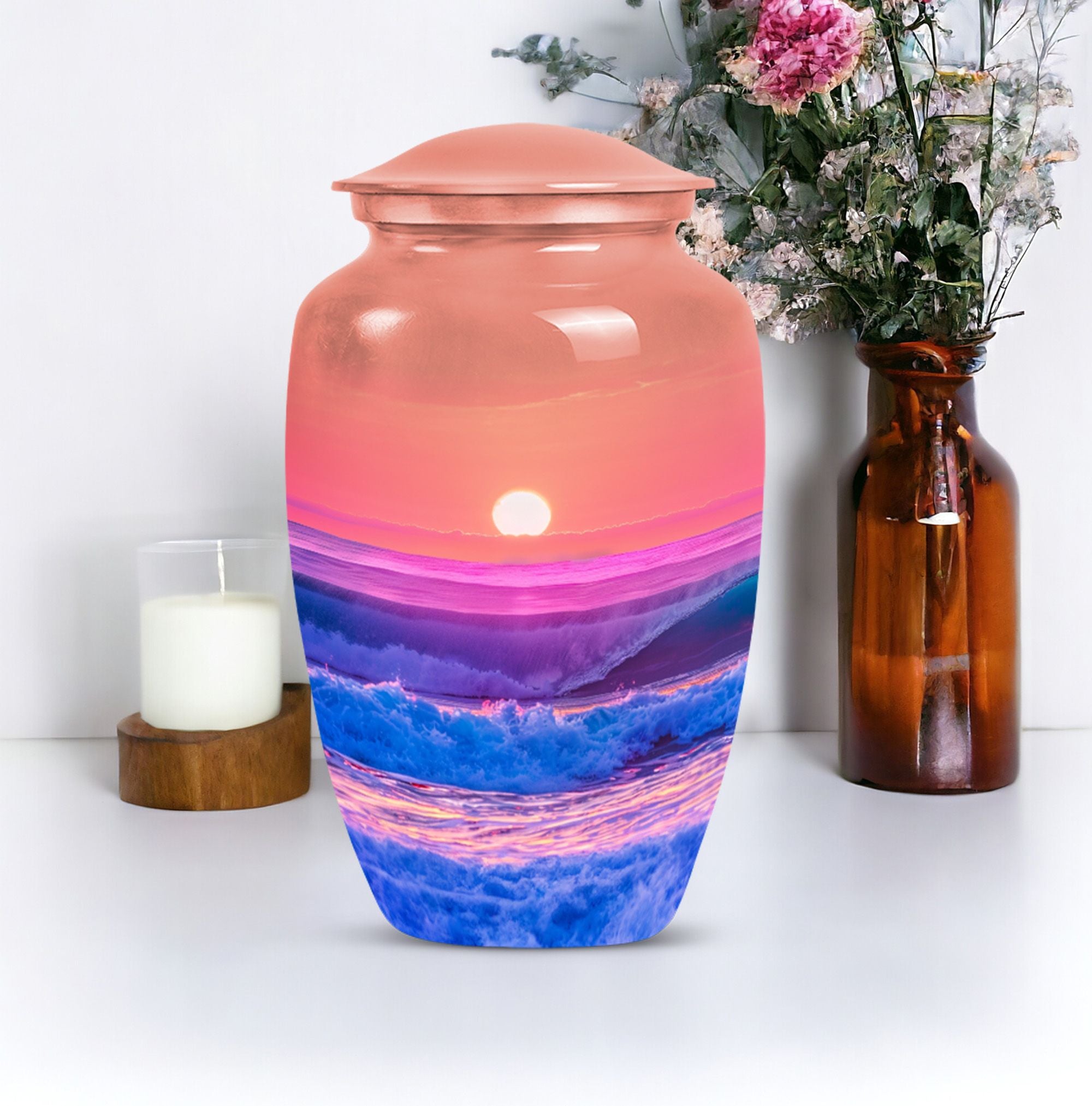 Immerse yourself in the serene elegance of this ocean waves urn, a fitting tribute to honor the memory of adults and seniors. Our ever-respected butterfly theme is delicately echoed in this large urn, hinting at peace, transformation, and continuity. Crafted meticulously from resilient aluminium, it resounds the high-quality tenacity the container possesses. The memorial urn stands proud and noticeable at 10 inches, with a weight of a reasonable 3.3 pounds, making it a tasteful centerpiece to any memorial ceremony. This funeral burial urn ensures a substantial capacity of 200 cubic inches, providing ample space for human ashes. Adding a personal touch, you have the option to customize this sublime urn by engraving names for an intimate remembrance. Each urn arrives with a luxurious velvet pouch for containment of ashes, encapsulating its elegance while adding an extra security layer. Dive into serenity with these exquisite human ash urns - providing a vessel of remembrance as boundless and ever-lasting as the ocean waves.