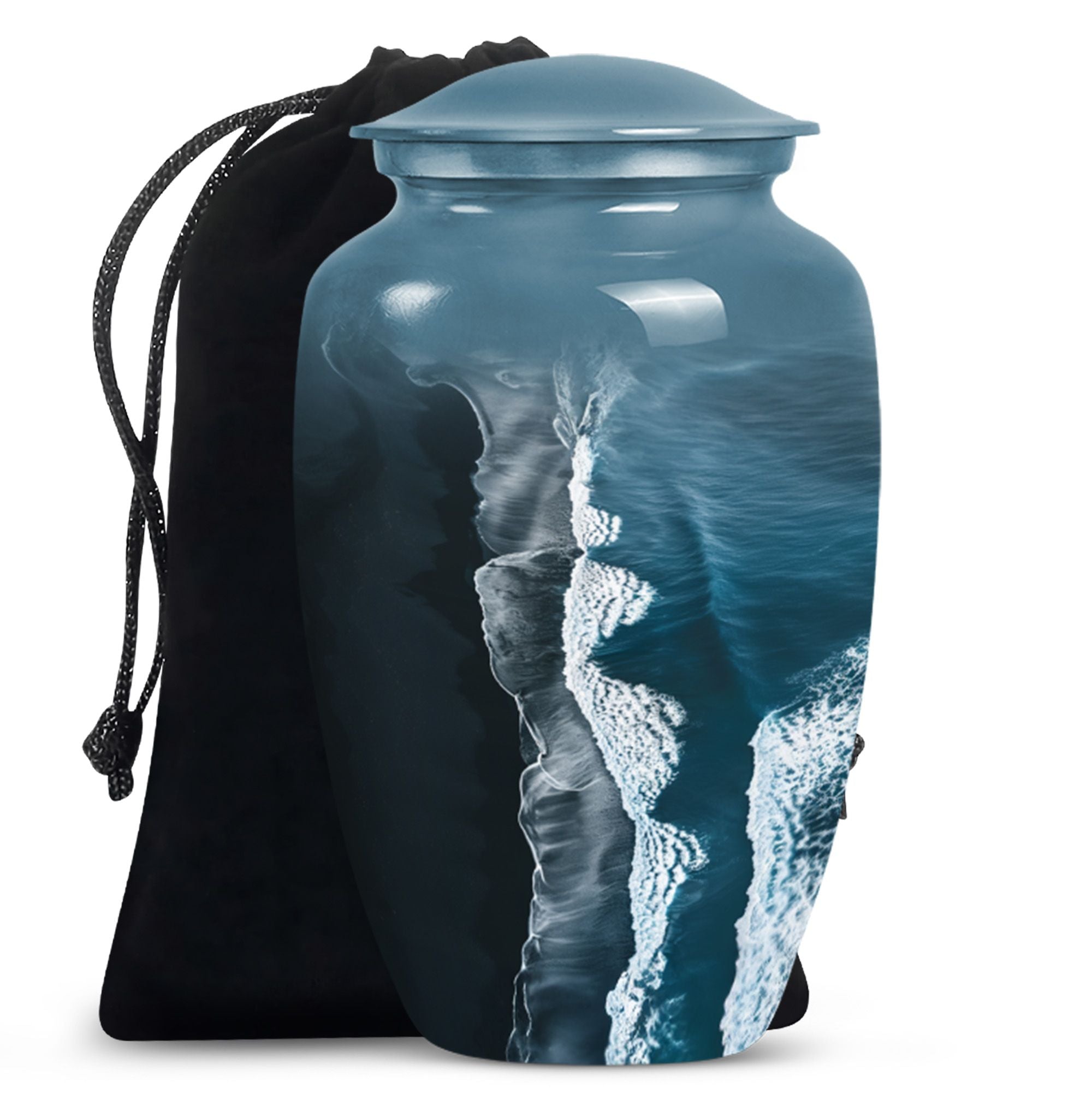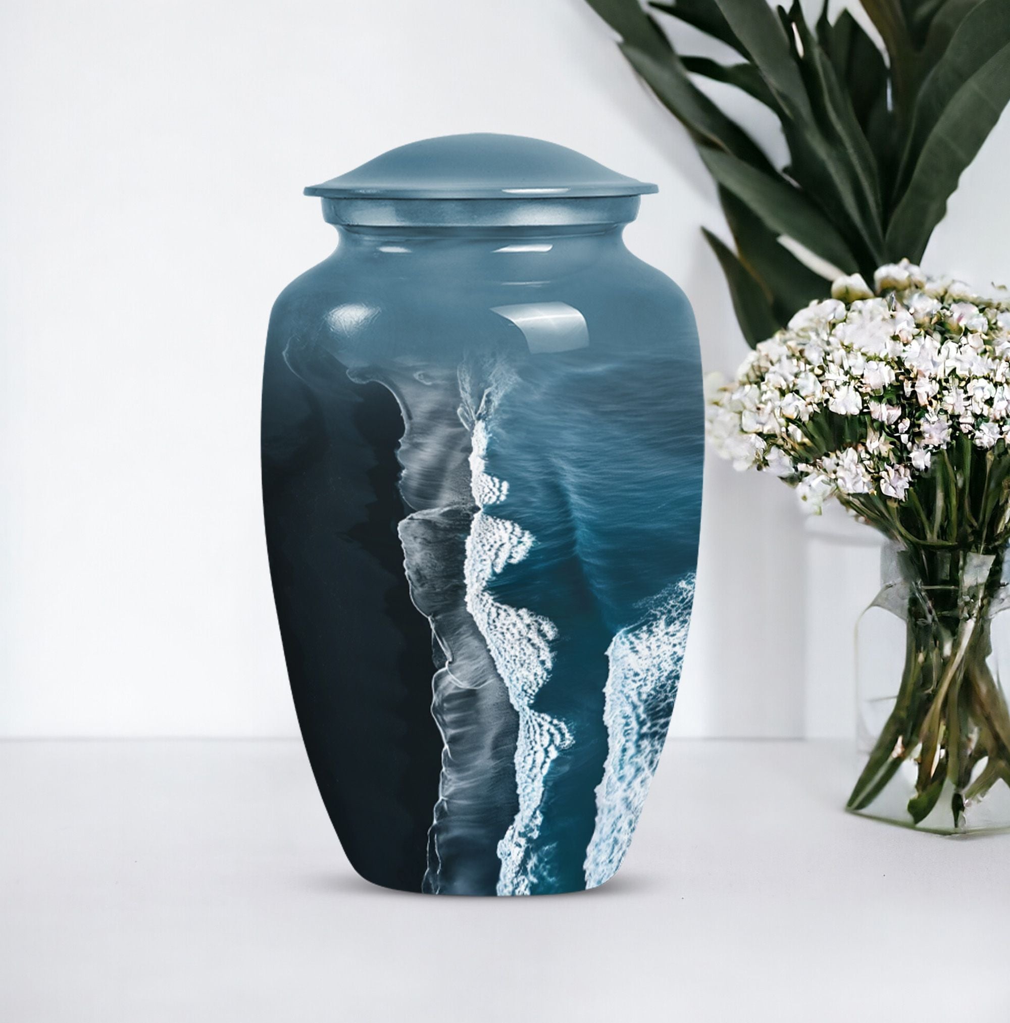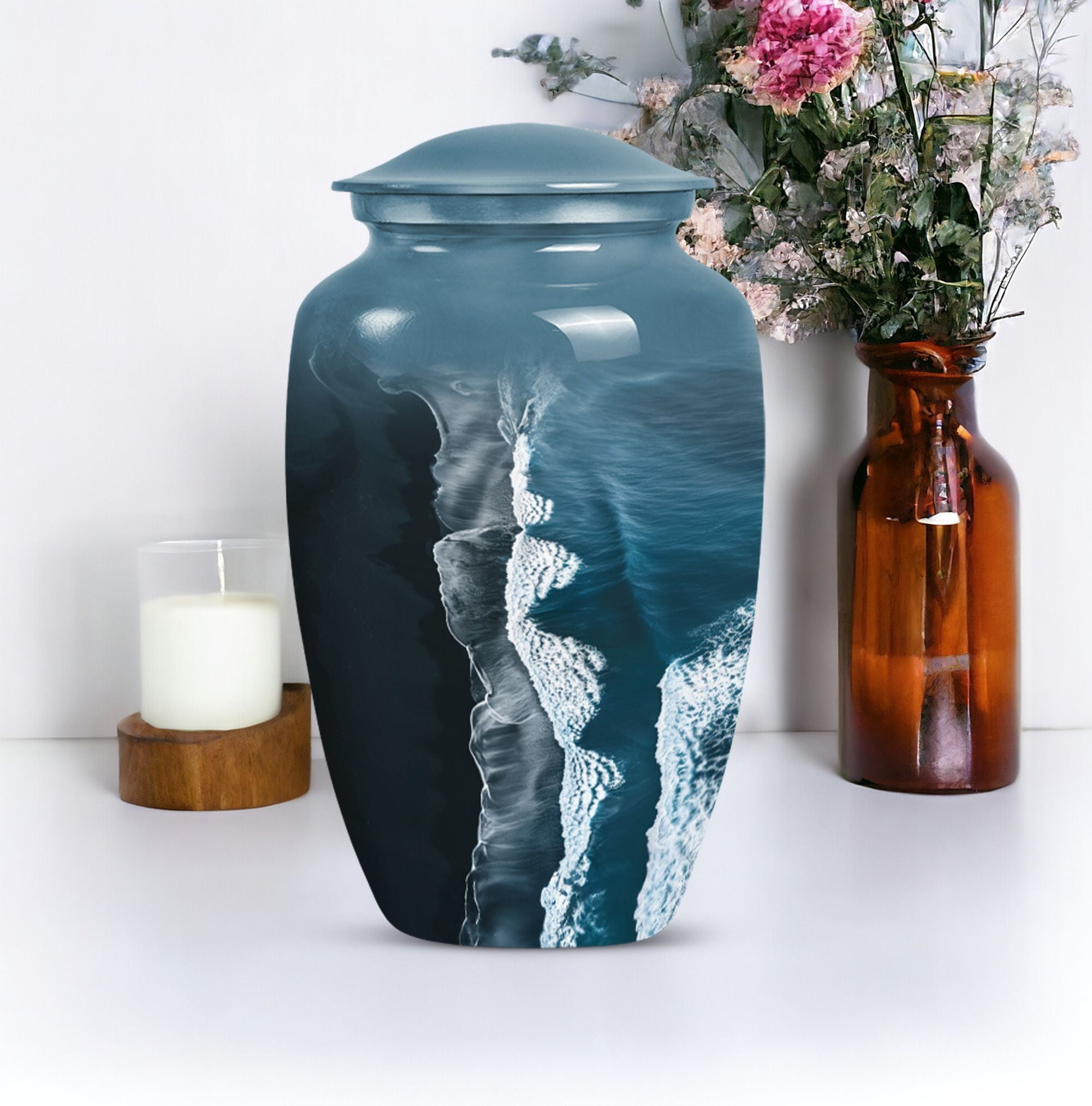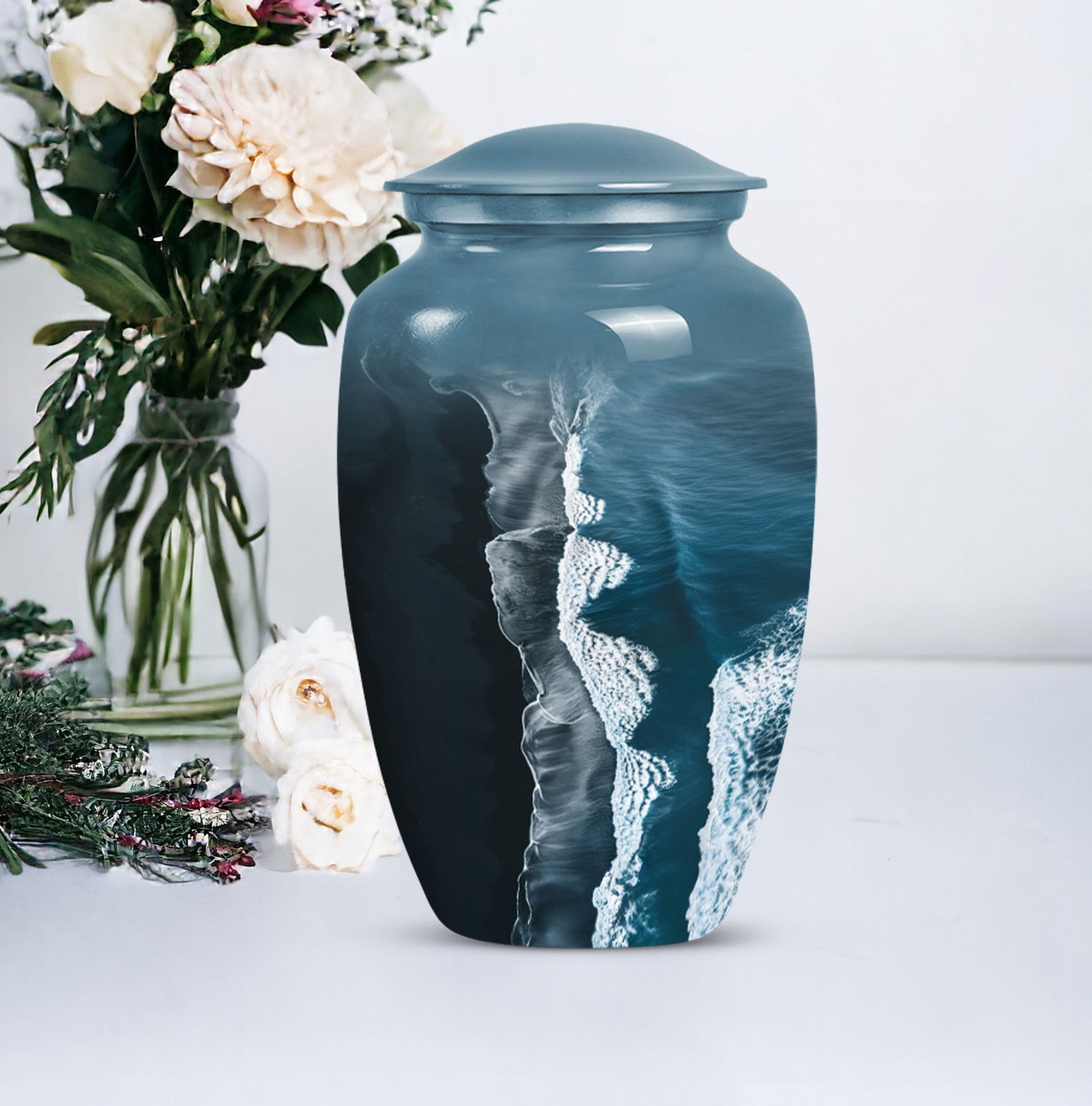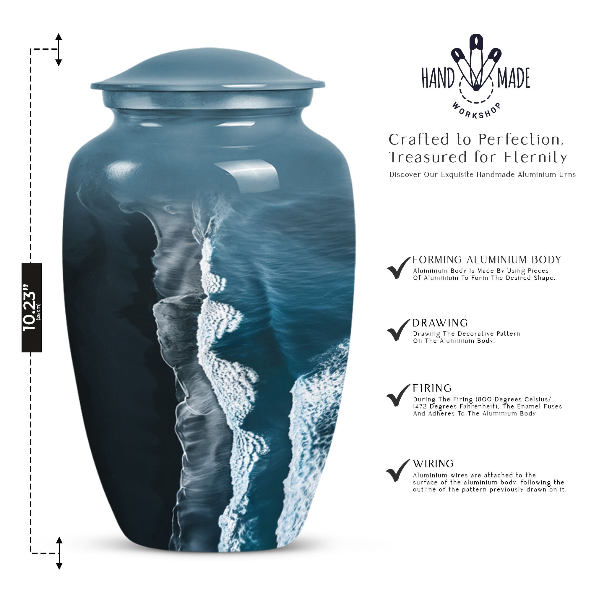Immerse in the serenity of deep ocean waves with our eloquent cremation urn, crafted at a substantial size of 10 inches. This robust urn boasts a weight of 3.3 pounds, resonating its high-quality aluminium material. The distinctive 'Classic Urn' design flaunts a tranquil butterfly theme, each detail meticulously engraved, offering an unconventional appeal to this memorial ceremony supply. Along with the urn, the package includes a velvet pouch for containment of ashes, reiterating our concern for your delicate needs. With a spacious capacity of 200 cubic inches, this urn can respectfully hold the treasured ashes. Providing an additional touch of respect, it also extends customization through personalized engraving. Ideal for adults and seniors who are in seek of 'cremation urn for dad' or 'burial ash urns for humans', this immersive ocean-themed urn truly symbolizes eternity, offering you a peaceful way to remember your loved ones.