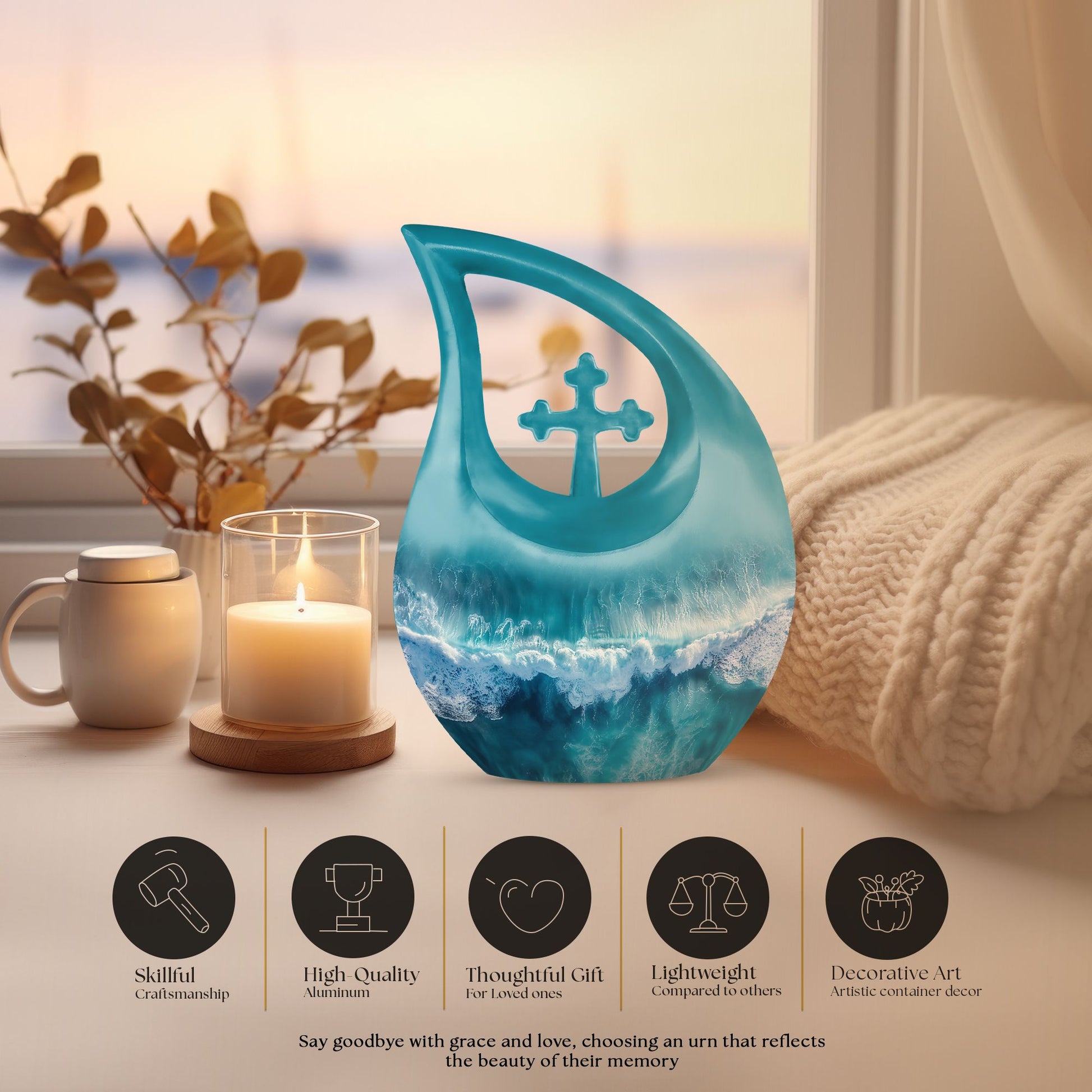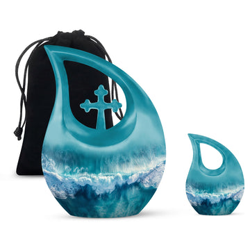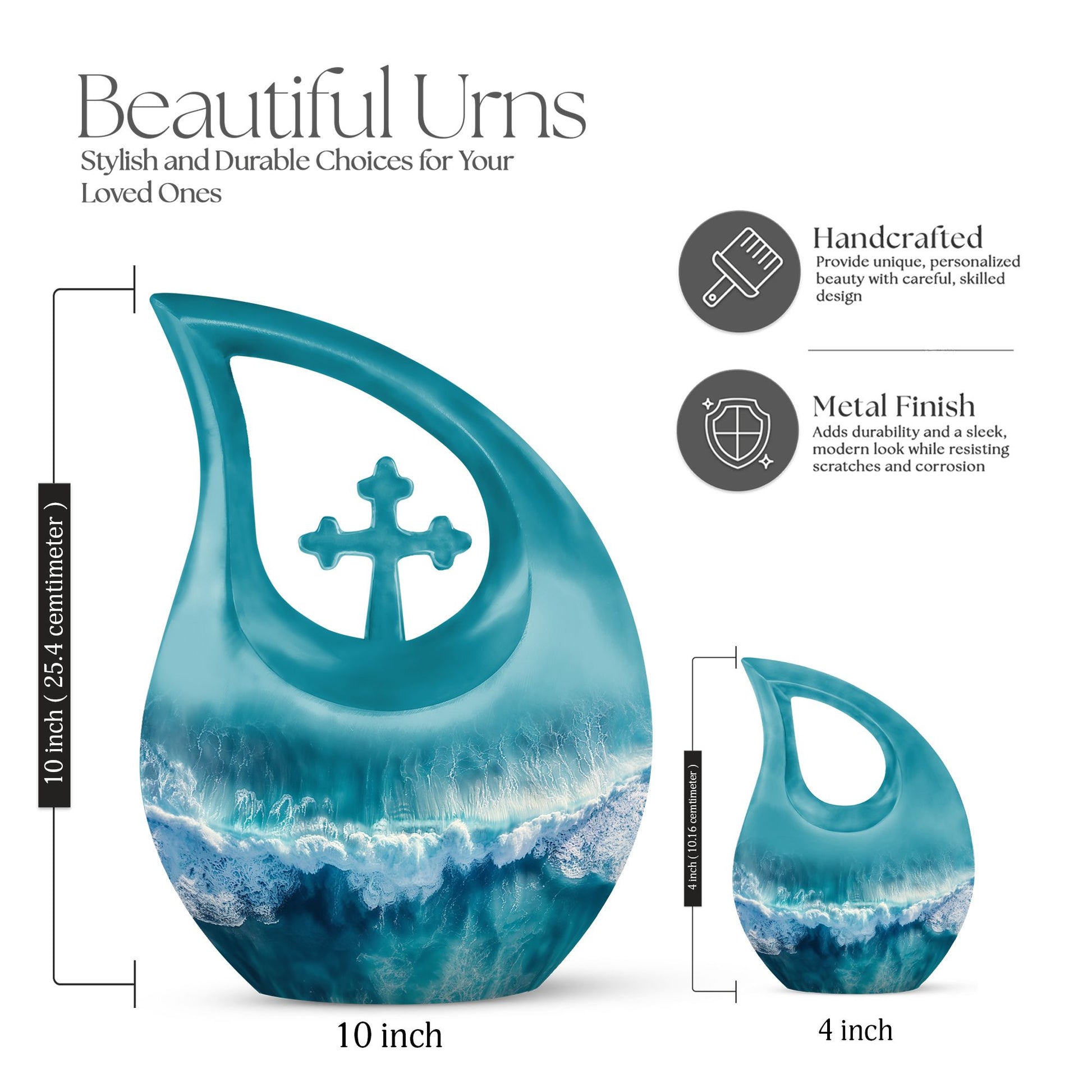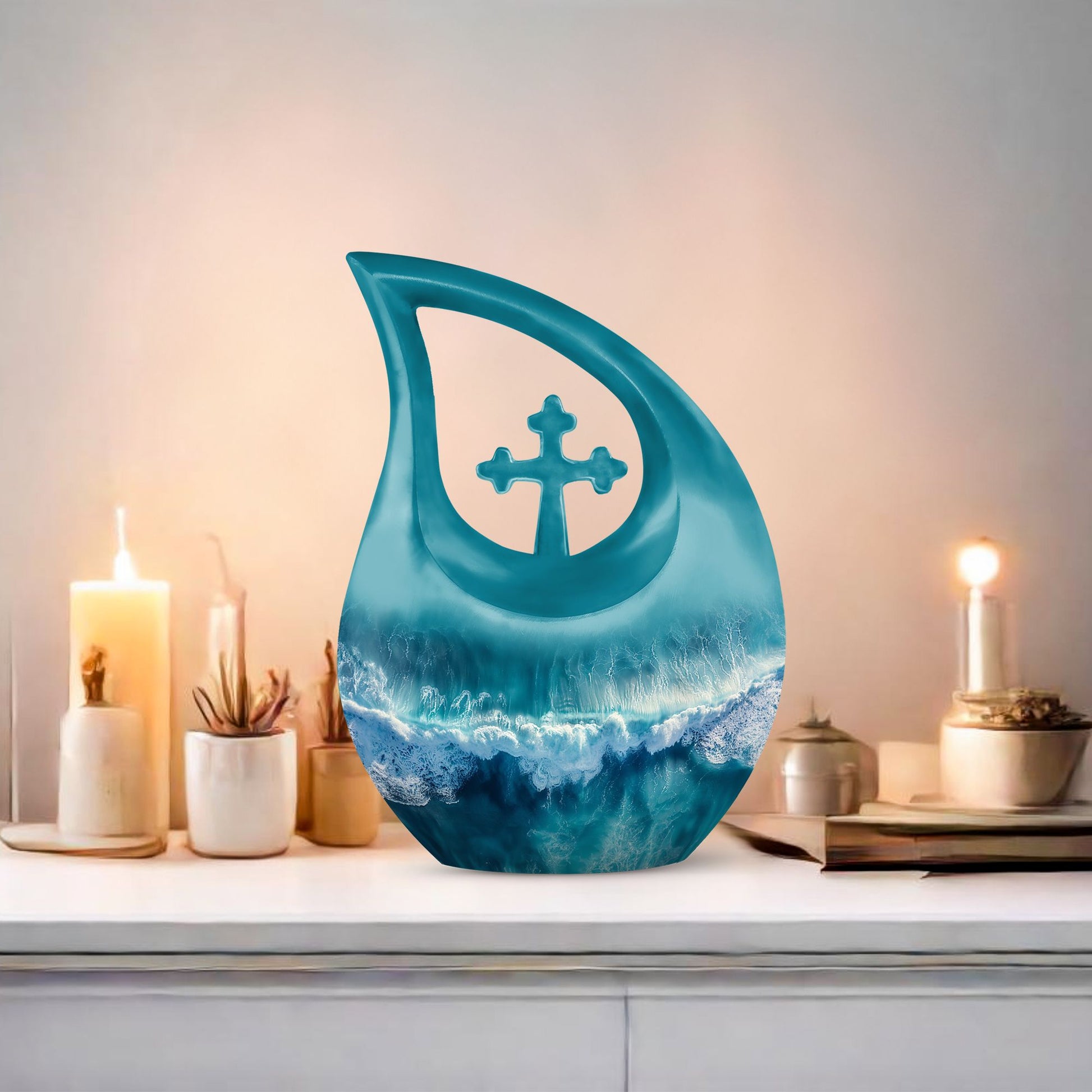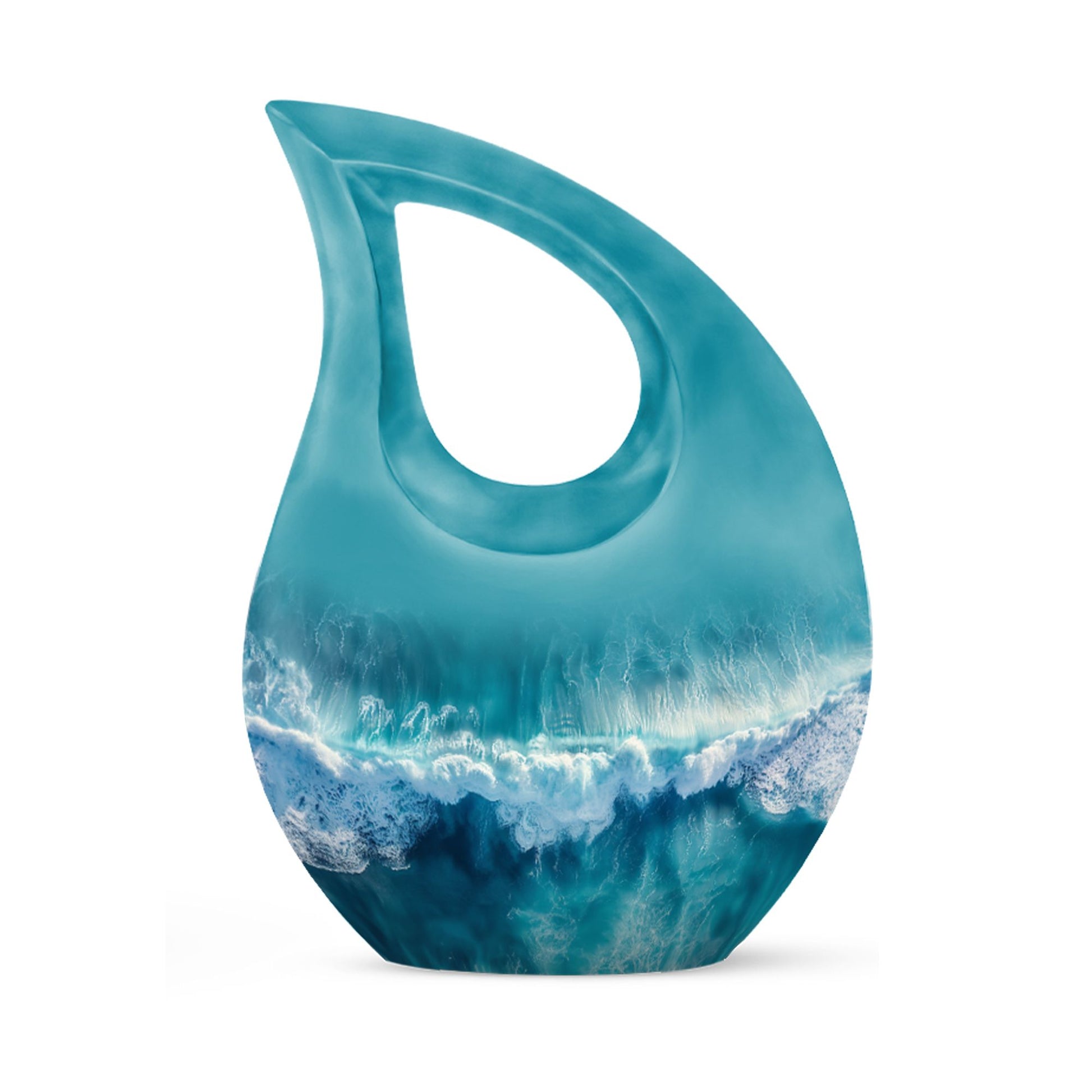 Pay special tribute to your loved ones with our uniquely designed Ocean Waves Urn. Crafted from robust Aluminium, this 10-inch large urn has a hauntingly beautiful 'Cross Drop' theme reminiscent of ocean waves. With a sizeable capacity of 200 cubic inches and weighing just 3.3 pounds, it can respectfully hold the ashes of a loved one. The urn comes with a soft velvet pouch, assuring secure containment and respectfully tribute. For added uniqueness, you have the option to personalize this urn with engraved names, making it a truly unique and precious keepsake. Ideal for both adults and seniors, this urn fits well under the 'Urns For Human Ashes' category, serving as an elegant choice for memorial urns. Notably, its unique design might also cater to searches for 'Pink Urns For Human Ashes', 'Urn For Mom', 'Butterfly Urns For Ashes' or 'Angel Urn'.
