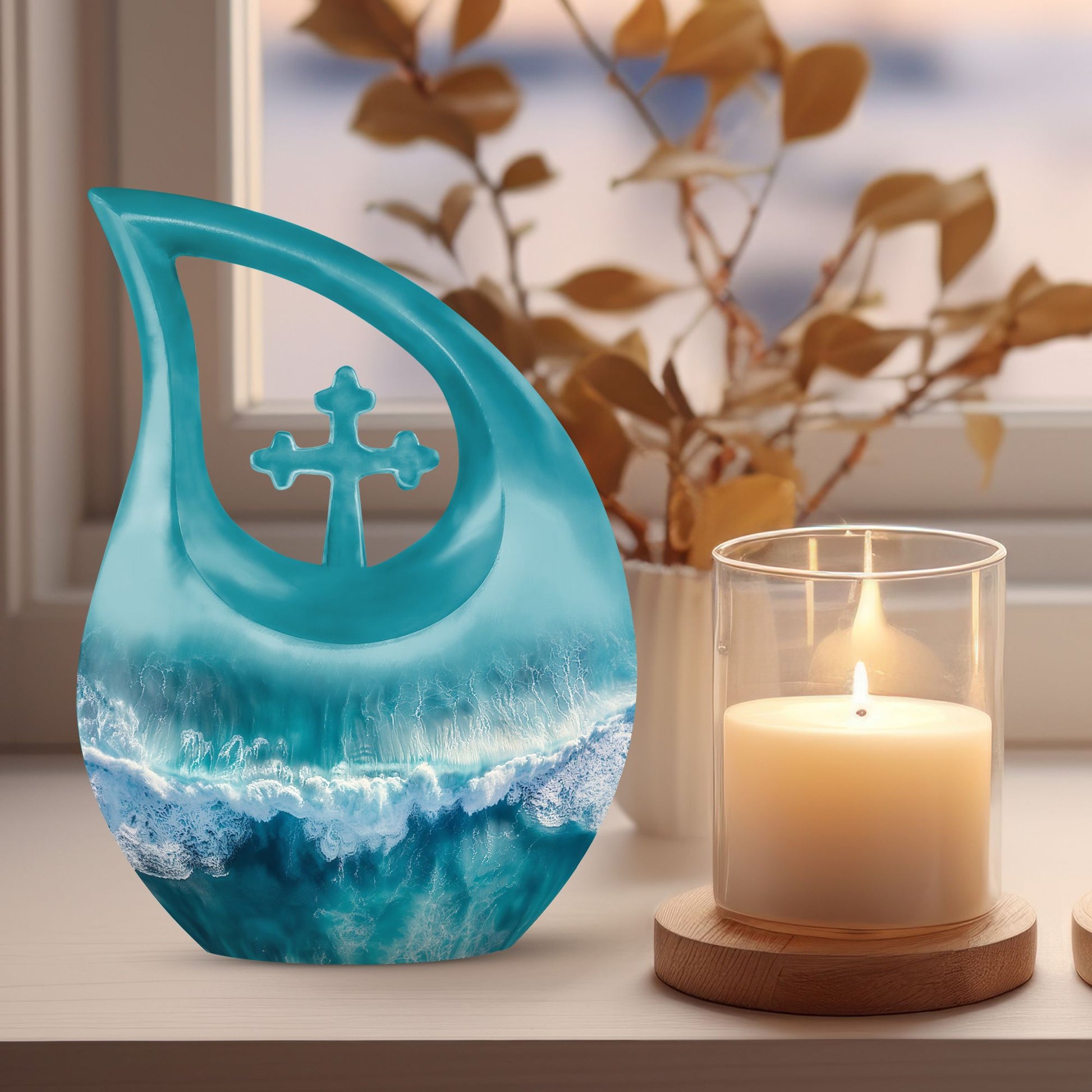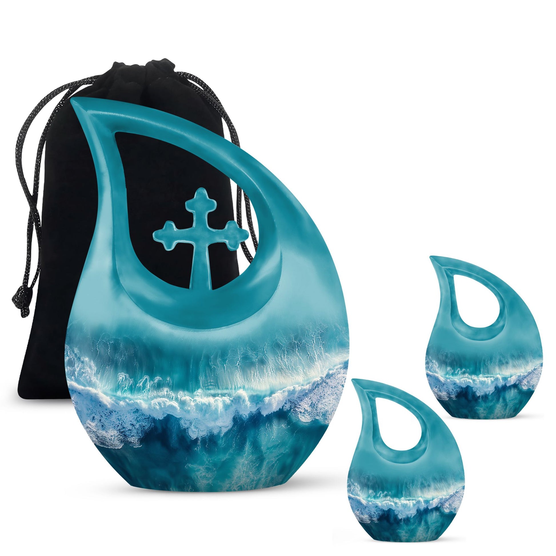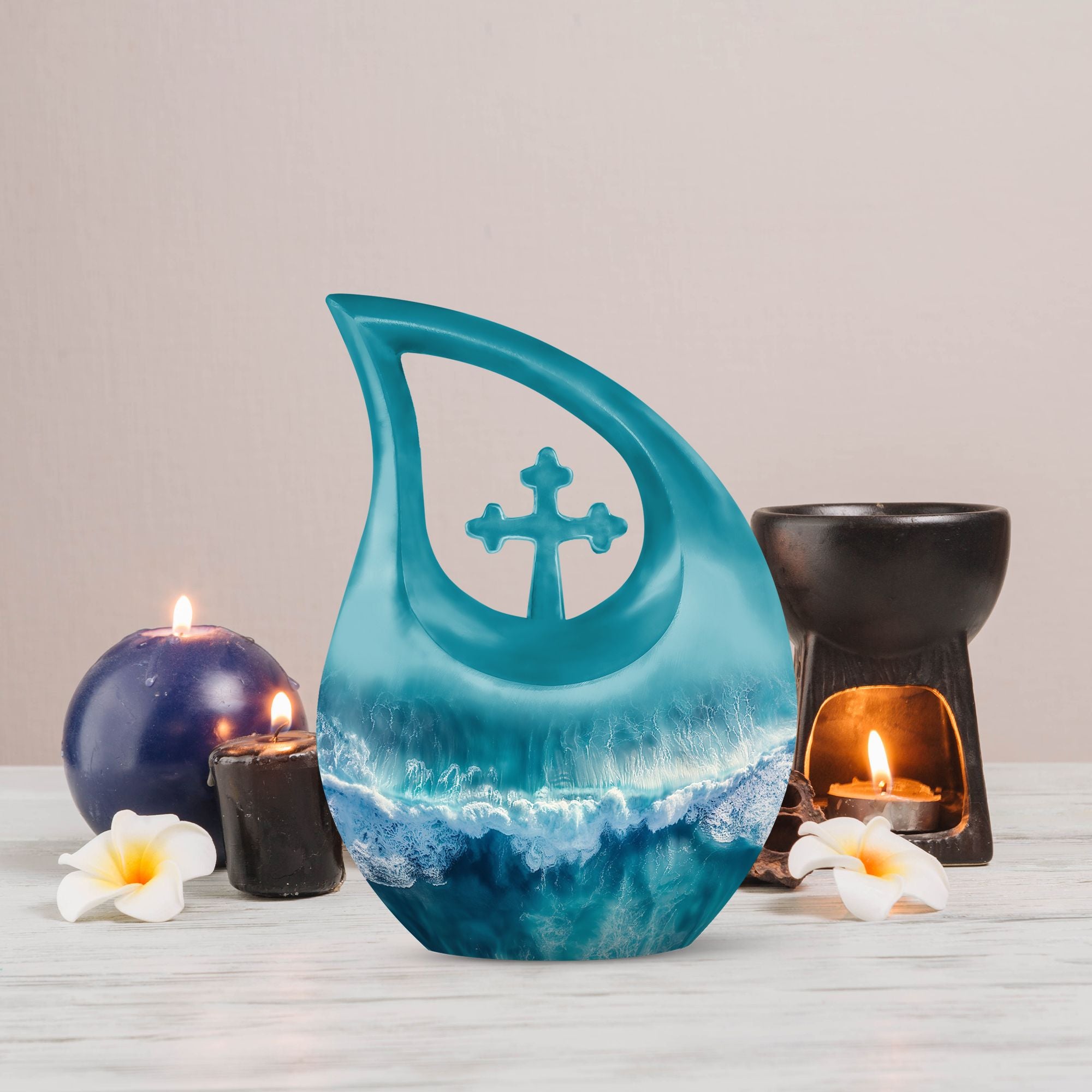 Pay special tribute to your loved ones with our uniquely designed Ocean Waves Urn. Crafted from robust Aluminium, this 10-inch large urn has a hauntingly beautiful 'Cross Drop' theme reminiscent of ocean waves. With a sizeable capacity of 200 cubic inches and weighing just 3.3 pounds, it can respectfully hold the ashes of a loved one. The urn comes with a soft velvet pouch, assuring secure containment and respectfully tribute. For added uniqueness, you have the option to personalize this urn with engraved names, making it a truly unique and precious keepsake. Ideal for both adults and seniors, this urn fits well under the 'Urns For Human Ashes' category, serving as an elegant choice for memorial urns. Notably, its unique design might also cater to searches for 'Pink Urns For Human Ashes', 'Urn For Mom', 'Butterfly Urns For Ashes' or 'Angel Urn'.