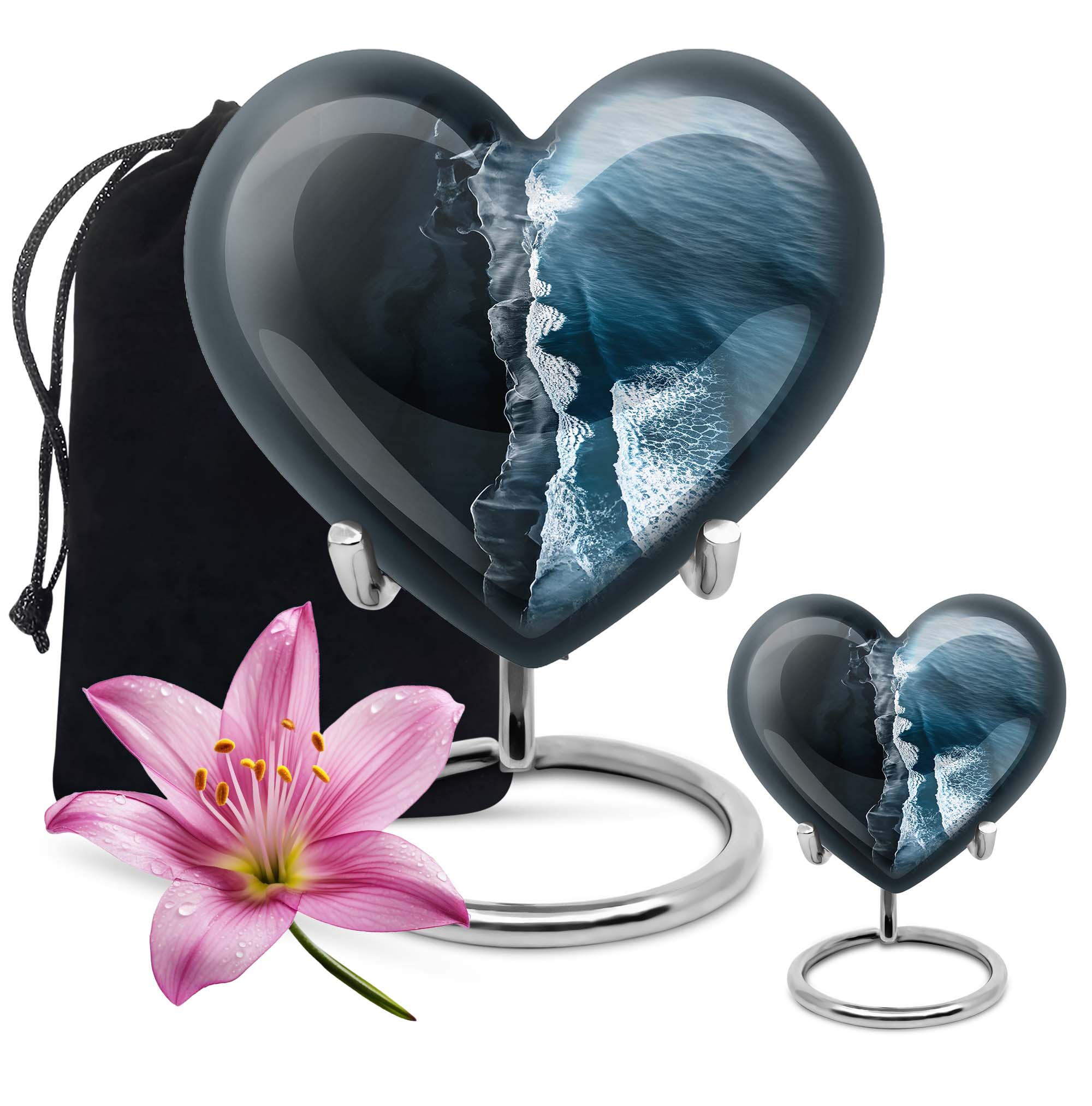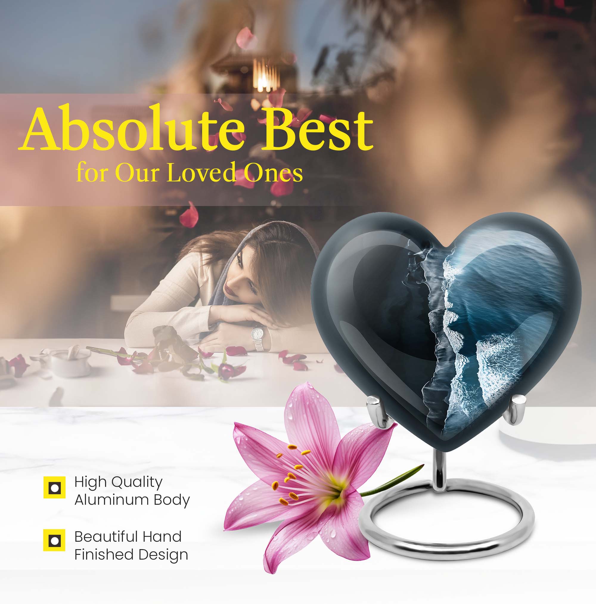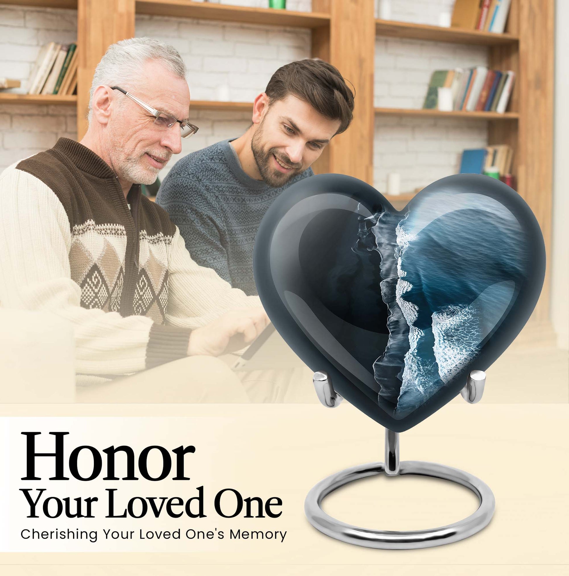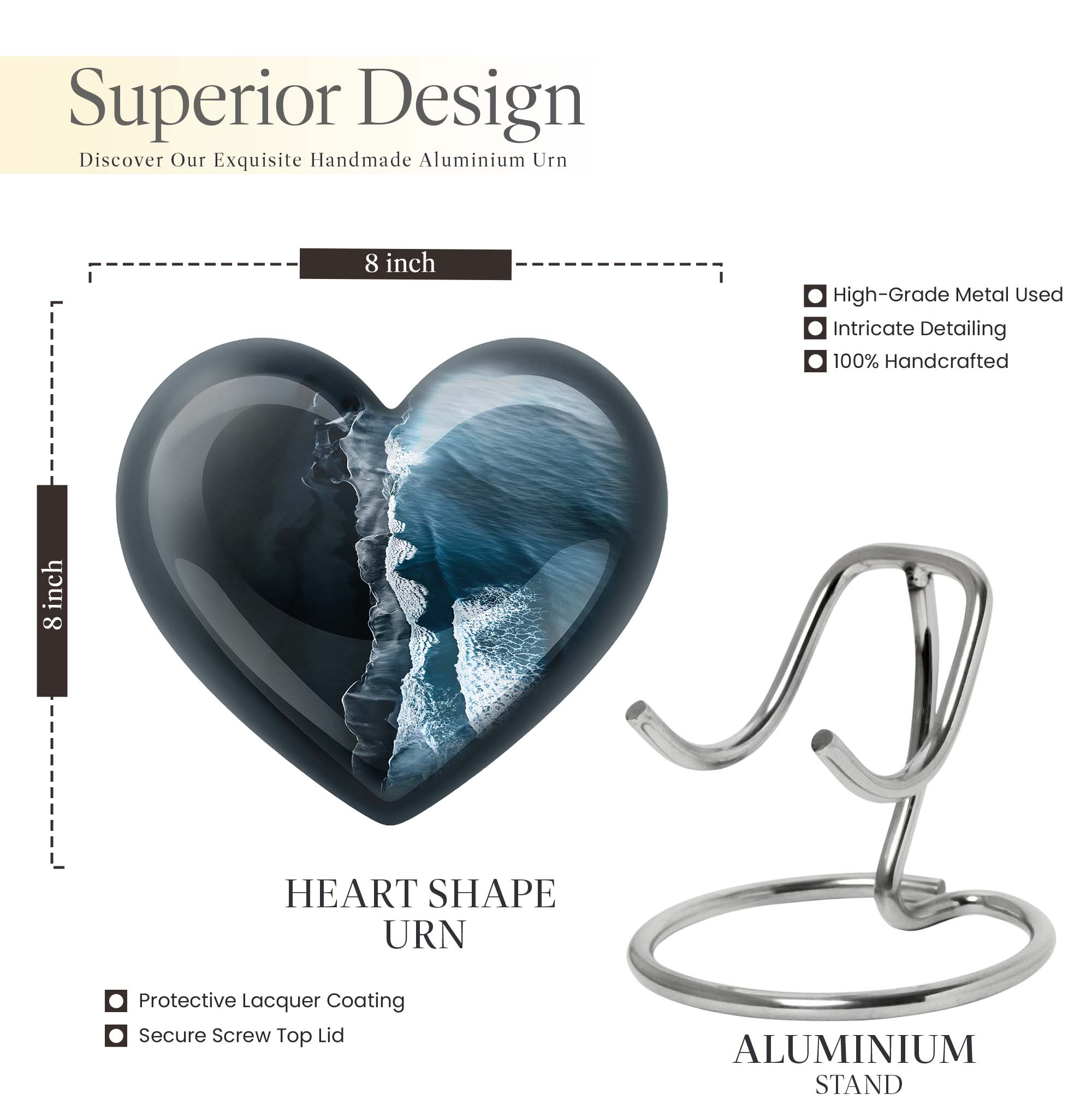 Honor the memory of your cherished loved one with our captivating 'Ocean Waves Urn,' a top-quality choice in the category of large-sized urns. This unique, heart-shaped cremation urn stands 10 inches tall, crafted from strong and long-lasting Aluminium. Measuring at 3.3 pounds, it provides ample space with a capacity of an impressive 200 cubic inches. Our cremation urn is meticulously designed with a beautiful butterfly theme, radiating serenity and love. The urn for human ashes arrives with a soft velvet pouch, ensuring safe containment of the ashes, offering peace of mind for adults and seniors alike. For a personal touch, take advantage of our customization option and personalize with engraved names. This makes a perfect, touching memorial for a parent with the alternative title, 'cremation urn for dad.' Search keywords include 'burial ash urns for humans' and 'human ash urn ashes.'