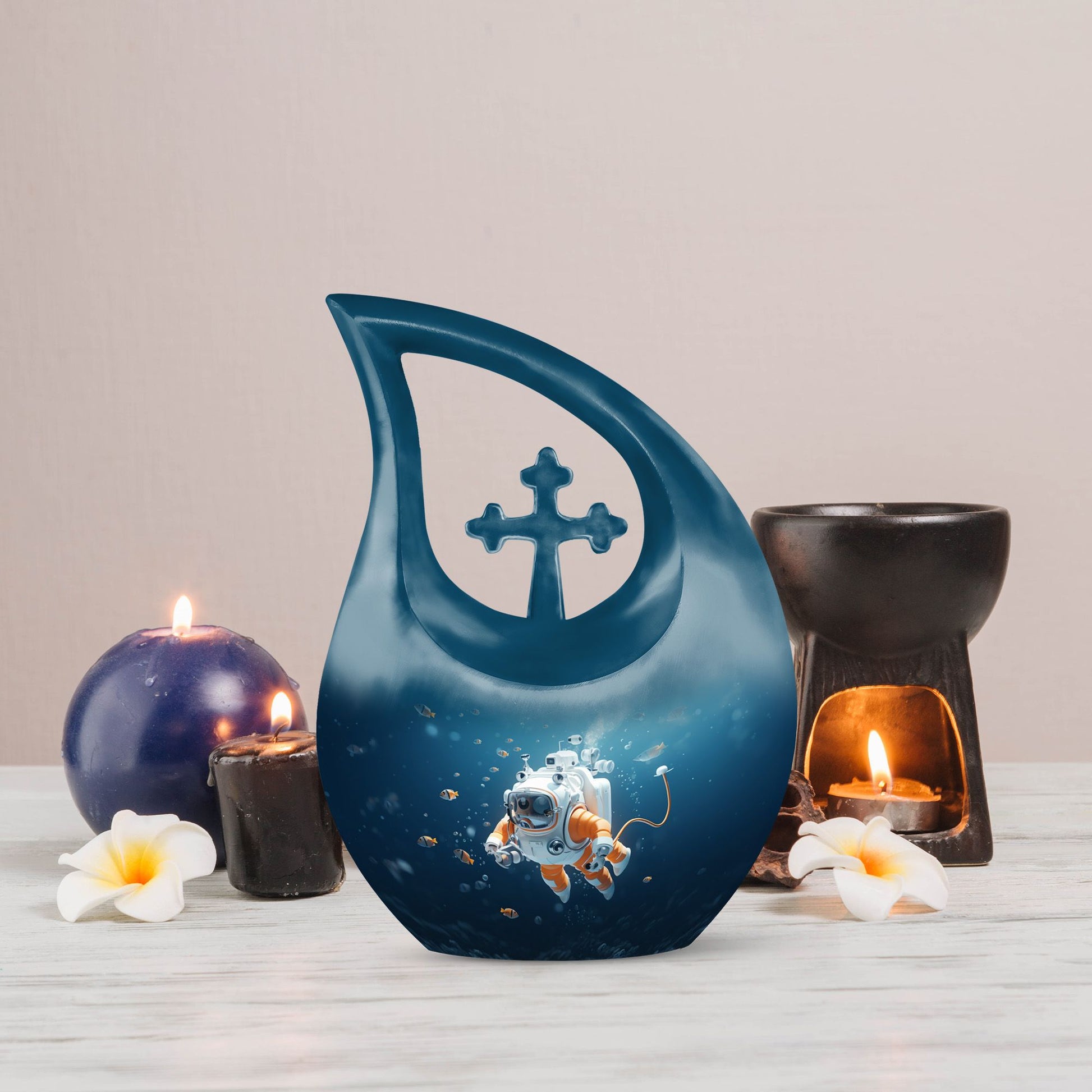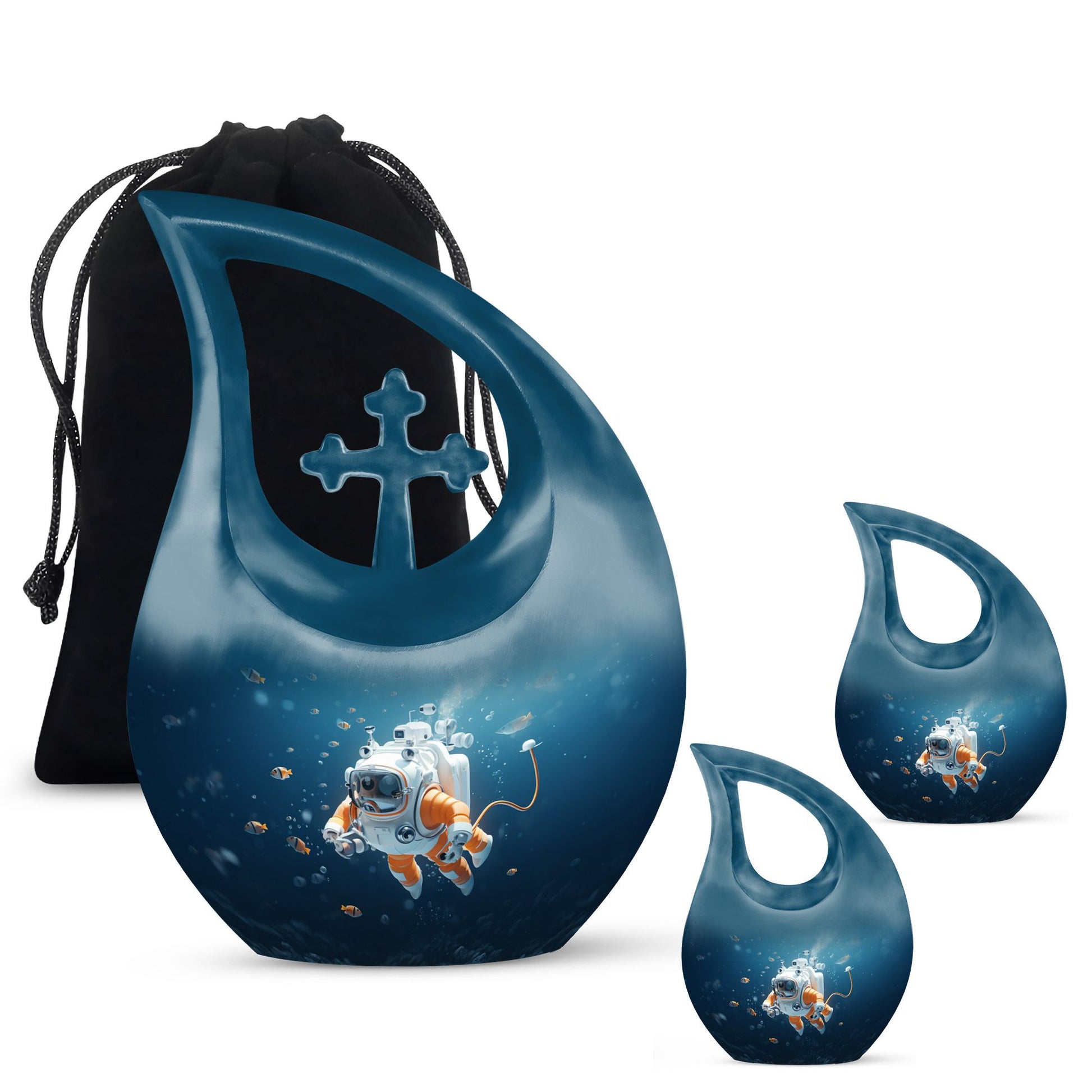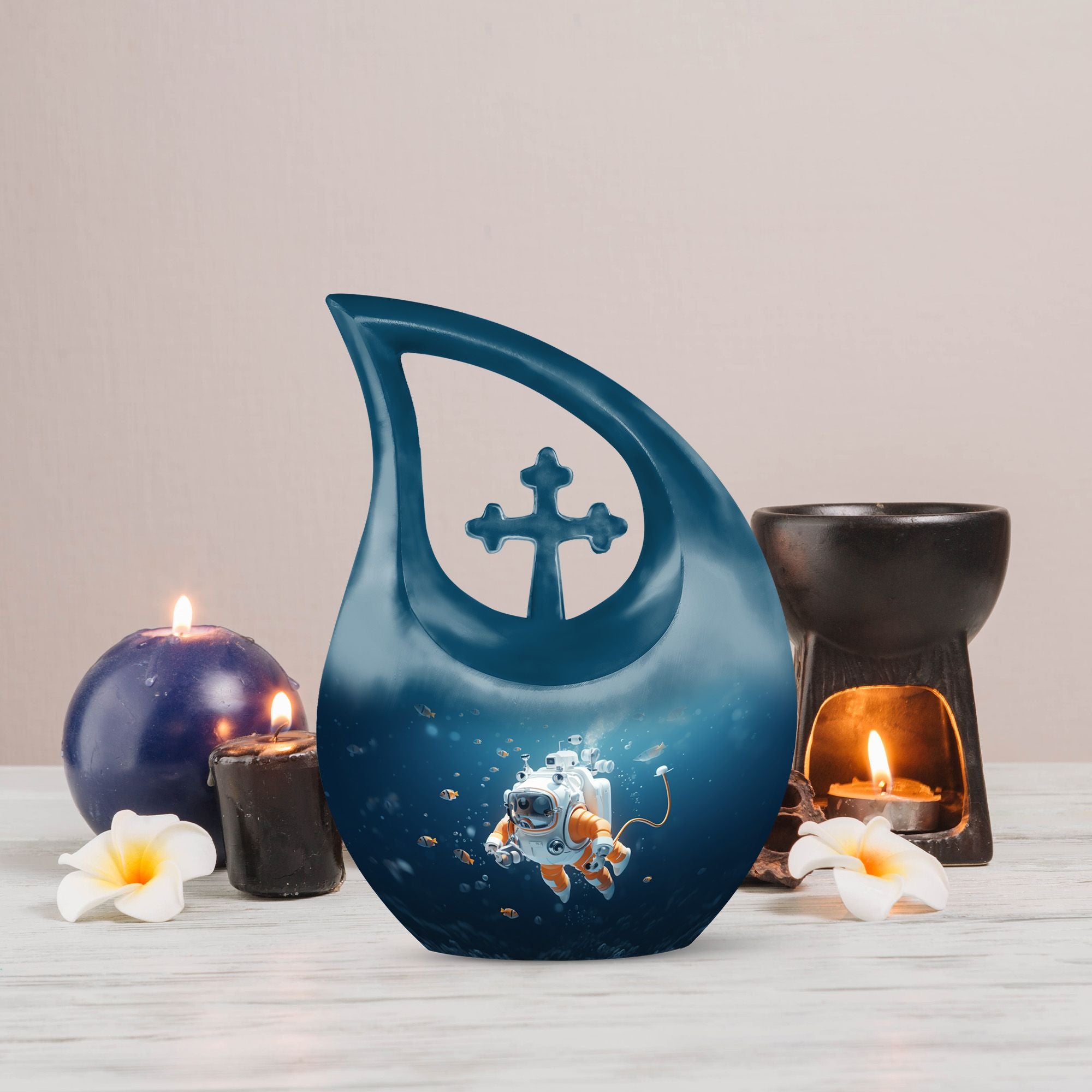 Embark on a poignant voyage of remembrance with our Exploring The Oceanic Urn. Crafted from high-quality aluminium, this Large Urn harmoniously combines aesthetics and functionality. Its weight of 3.3 pounds and dimensions of 10 inches in height, make it as sturdy as it is striking. Designed with a capacity of 200 cubic inches, the urn comfortably and securely holds your loved one's ashes. The Cross Drop Urn design exudes a serene ambiance, echoing the vastness and tranquility of the ocean. Adding a personal touch, you can also personalize this remembrance urn for ashes with engraved names, etching your memories gently into its form. To further ease your process of grief, it comes with a velvet pouch providing a respectable containment for the ashes. From urns that don’t look like urns to cremation urn liners and cremation monuments, our memorial urns offer a sublime selection for adults and seniors. With our ‘Exploring The Oceanic Urn’, embrace a unique token of remembrance that reverberates with the profound depths of the ocean.