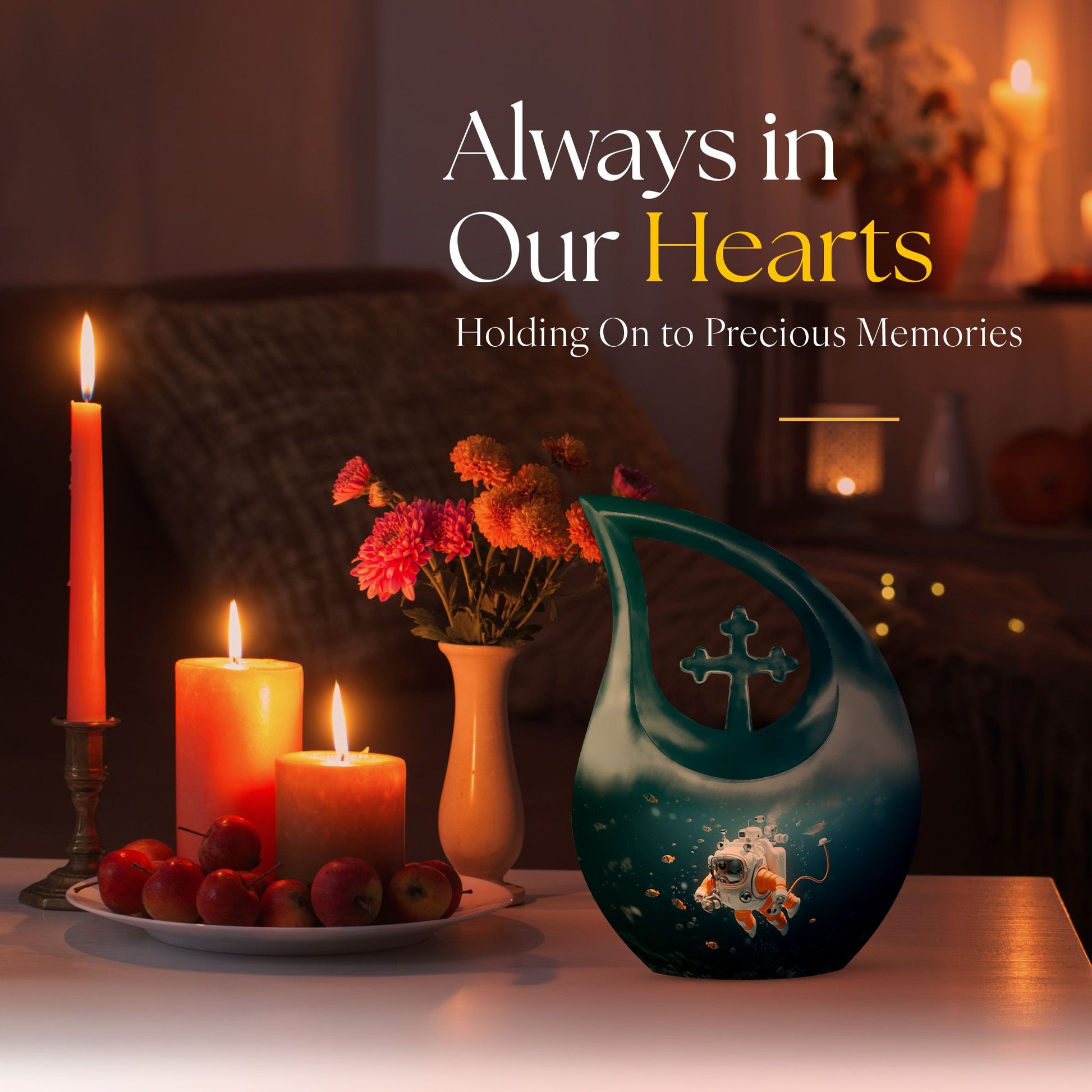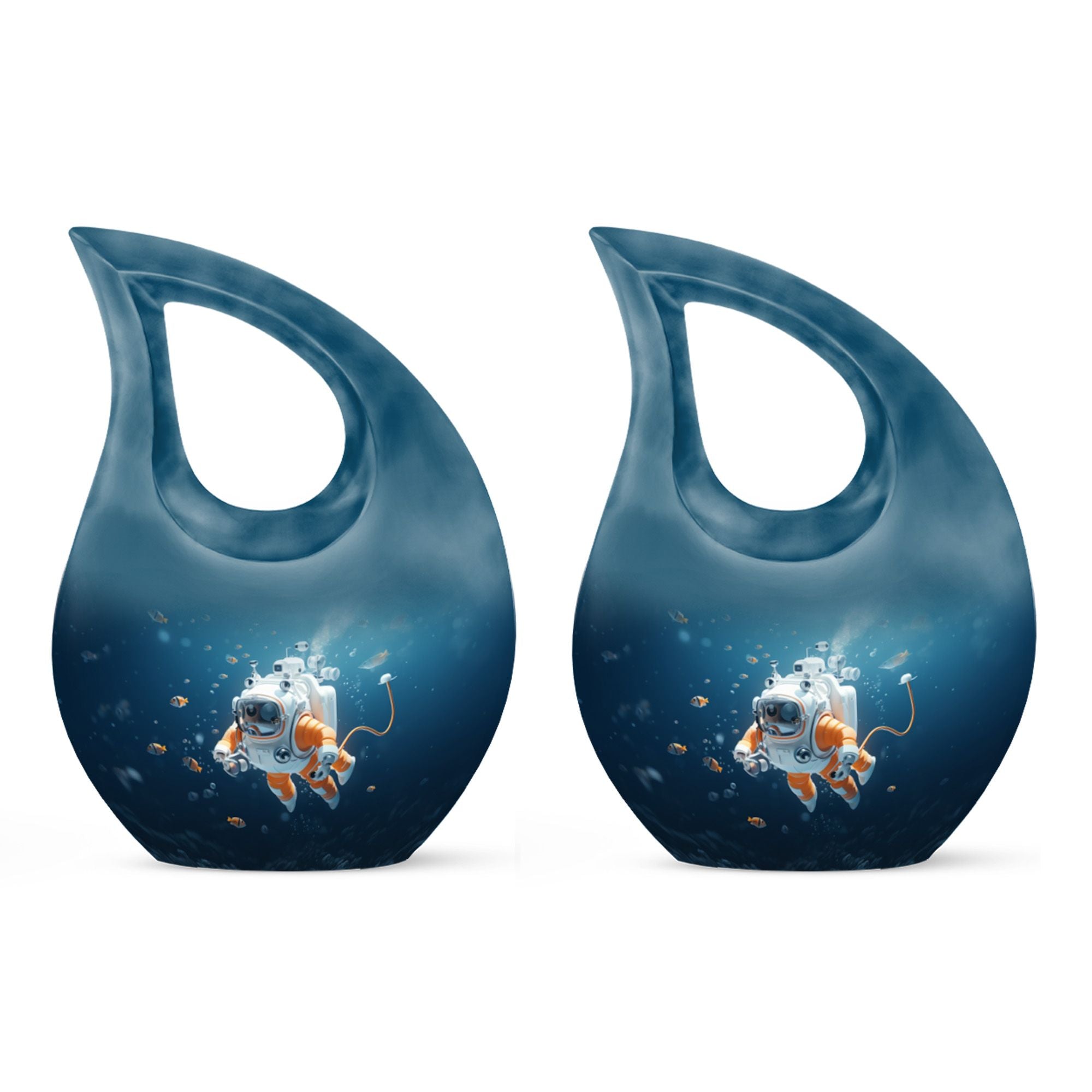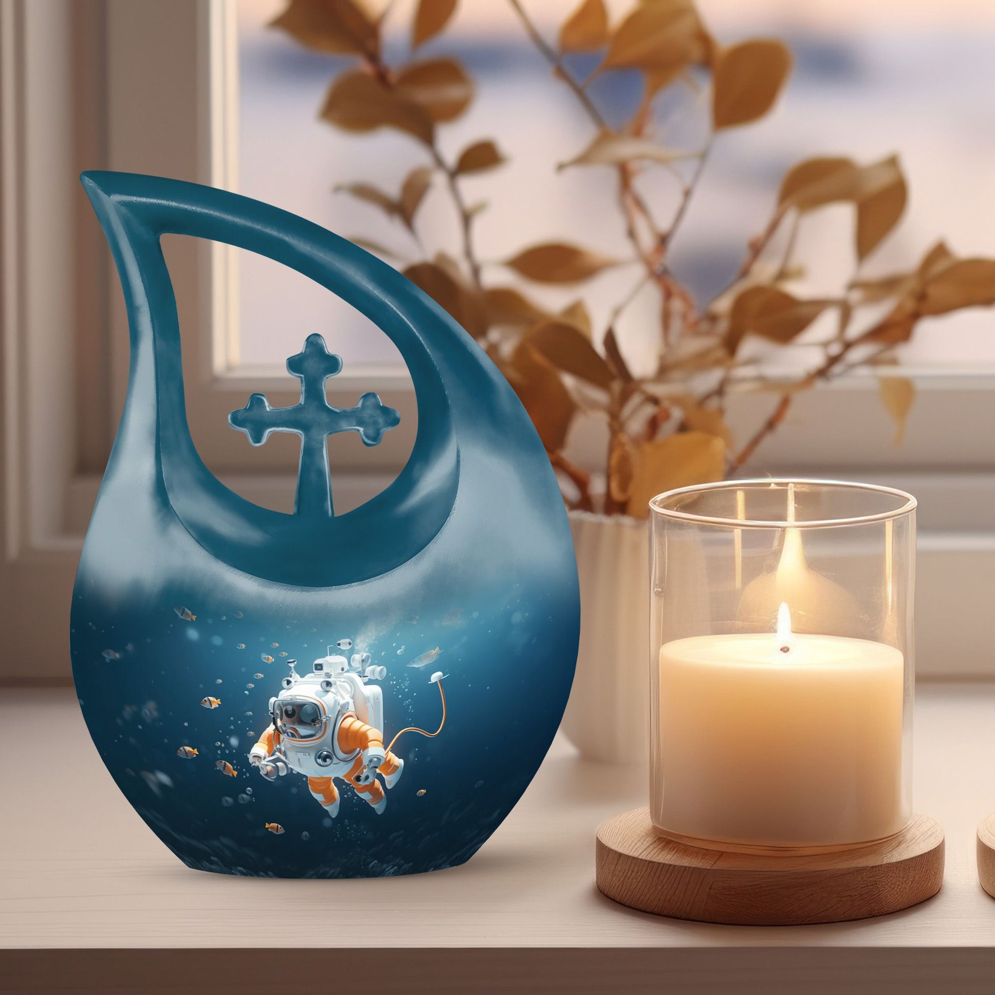 Embark on a poignant voyage of remembrance with our Exploring The Oceanic Urn. Crafted from high-quality aluminium, this Large Urn harmoniously combines aesthetics and functionality. Its weight of 3.3 pounds and dimensions of 10 inches in height, make it as sturdy as it is striking. Designed with a capacity of 200 cubic inches, the urn comfortably and securely holds your loved one's ashes. The Cross Drop Urn design exudes a serene ambiance, echoing the vastness and tranquility of the ocean. Adding a personal touch, you can also personalize this remembrance urn for ashes with engraved names, etching your memories gently into its form. To further ease your process of grief, it comes with a velvet pouch providing a respectable containment for the ashes. From urns that don’t look like urns to cremation urn liners and cremation monuments, our memorial urns offer a sublime selection for adults and seniors. With our ‘Exploring The Oceanic Urn’, embrace a unique token of remembrance that reverberates with the profound depths of the ocean.
