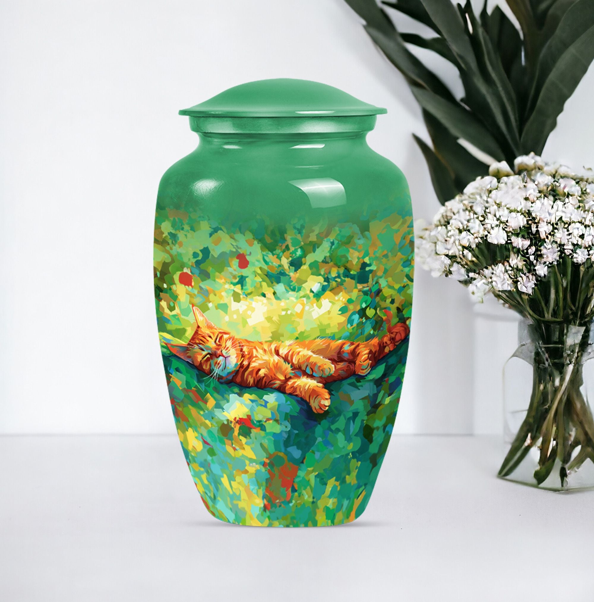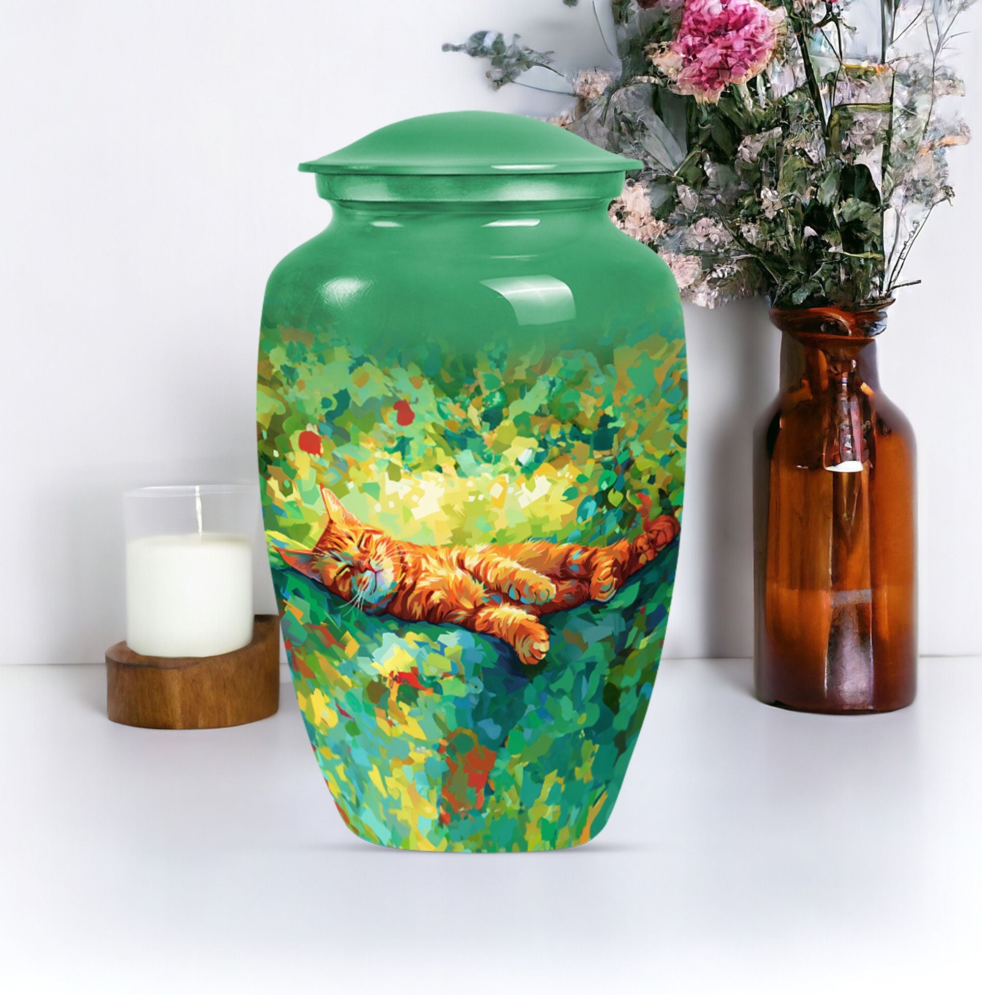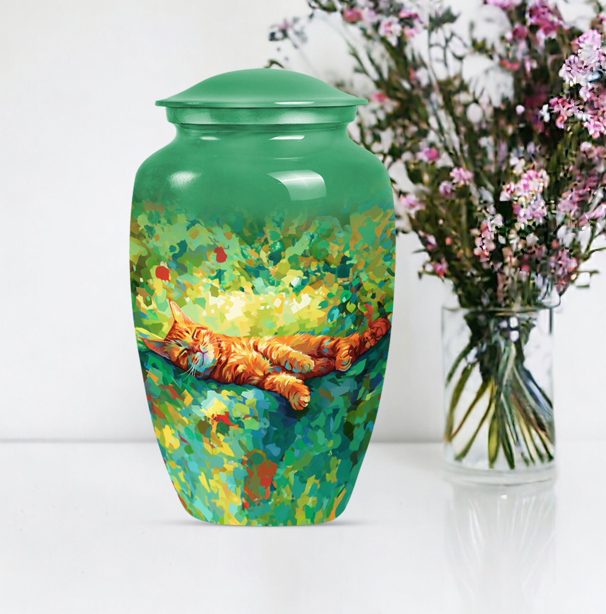 Enhance your remembrance ritual with our distinct 'orange cat urn', crafted to perfection and designed to pay lasting respect to your beloved. This 10-inch urn, made out of durable aluminium, offers an abstract theme that transcends the norm. The Large urn features a sturdy weight of 3.3 pounds, giving it the formidable presence it deserves. With its meaningful capacity of 200 cubic inches, this cremation urn suffices to hold human ashes, signifying the importance of the person you pay homage to. From our collection of funeral urns for human ashes, this one sets itself distinct with the classic urn style, adding volume and grace to the memorial corner of your house. The urn comes with a sophisticated velvet pouch for secure containment of ashes. For that customized touch, engraving services are available to etch names, making the urn personal and special. Our memorial urns for ashes, takes remembrance and homage rituals to a new level, like timeless stone urns, they create lasting memories. This product does not only symbolize respect but it is designed to speak volumes about the fondness and memories you shared with your beloved ones.