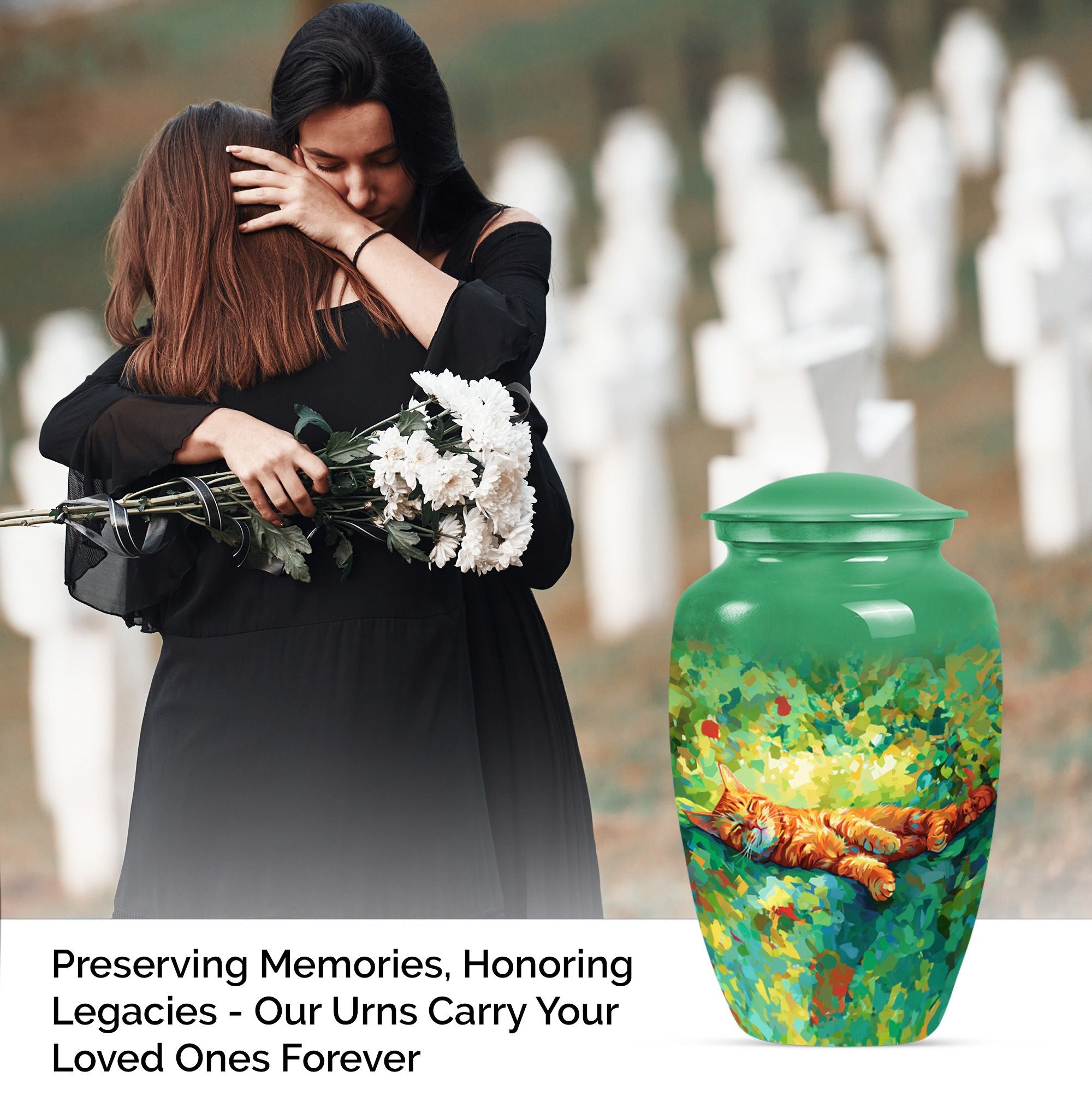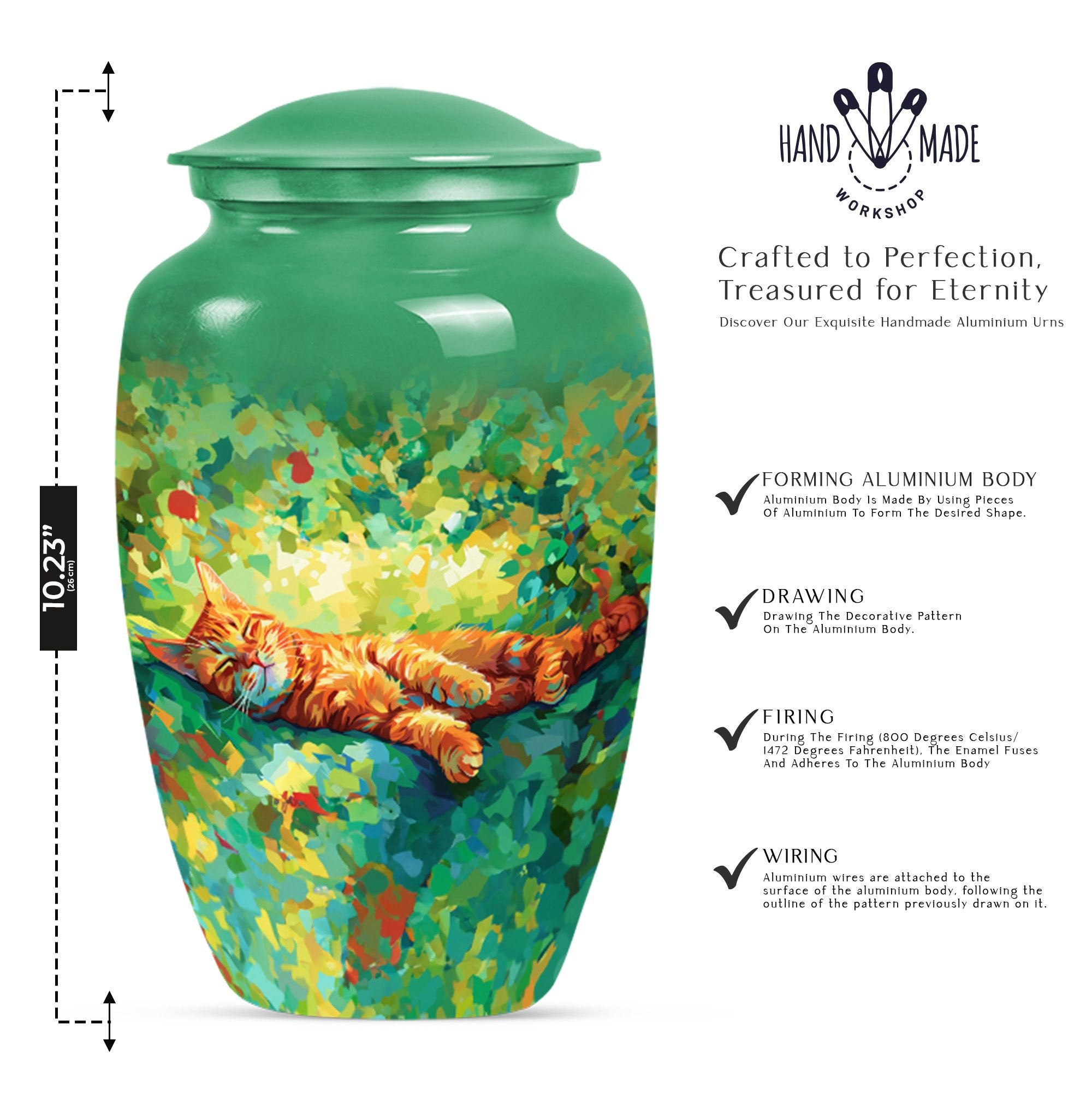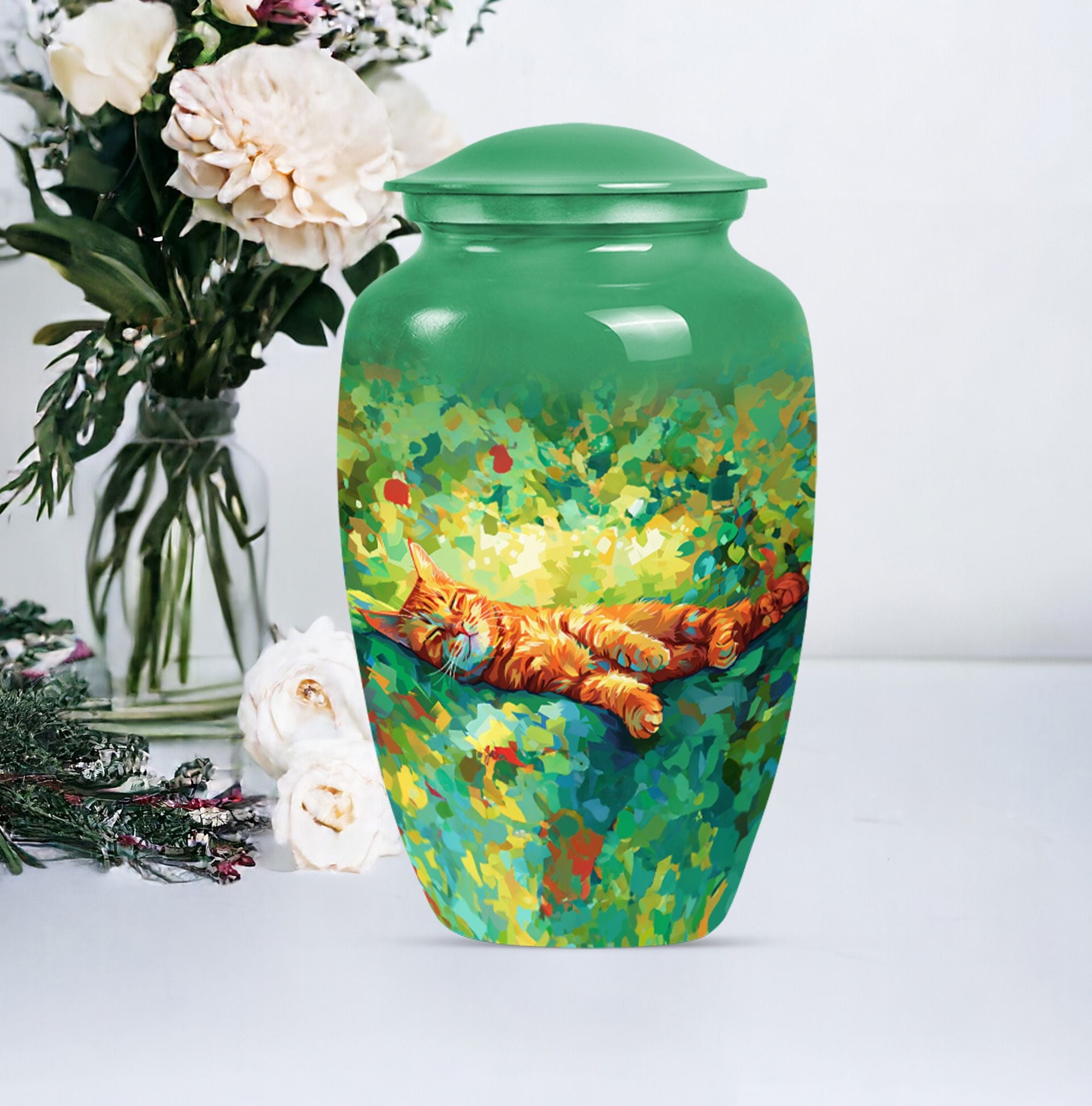 Enhance your remembrance ritual with our distinct 'orange cat urn', crafted to perfection and designed to pay lasting respect to your beloved. This 10-inch urn, made out of durable aluminium, offers an abstract theme that transcends the norm. The Large urn features a sturdy weight of 3.3 pounds, giving it the formidable presence it deserves. With its meaningful capacity of 200 cubic inches, this cremation urn suffices to hold human ashes, signifying the importance of the person you pay homage to. From our collection of funeral urns for human ashes, this one sets itself distinct with the classic urn style, adding volume and grace to the memorial corner of your house. The urn comes with a sophisticated velvet pouch for secure containment of ashes. For that customized touch, engraving services are available to etch names, making the urn personal and special. Our memorial urns for ashes, takes remembrance and homage rituals to a new level, like timeless stone urns, they create lasting memories. This product does not only symbolize respect but it is designed to speak volumes about the fondness and memories you shared with your beloved ones.
