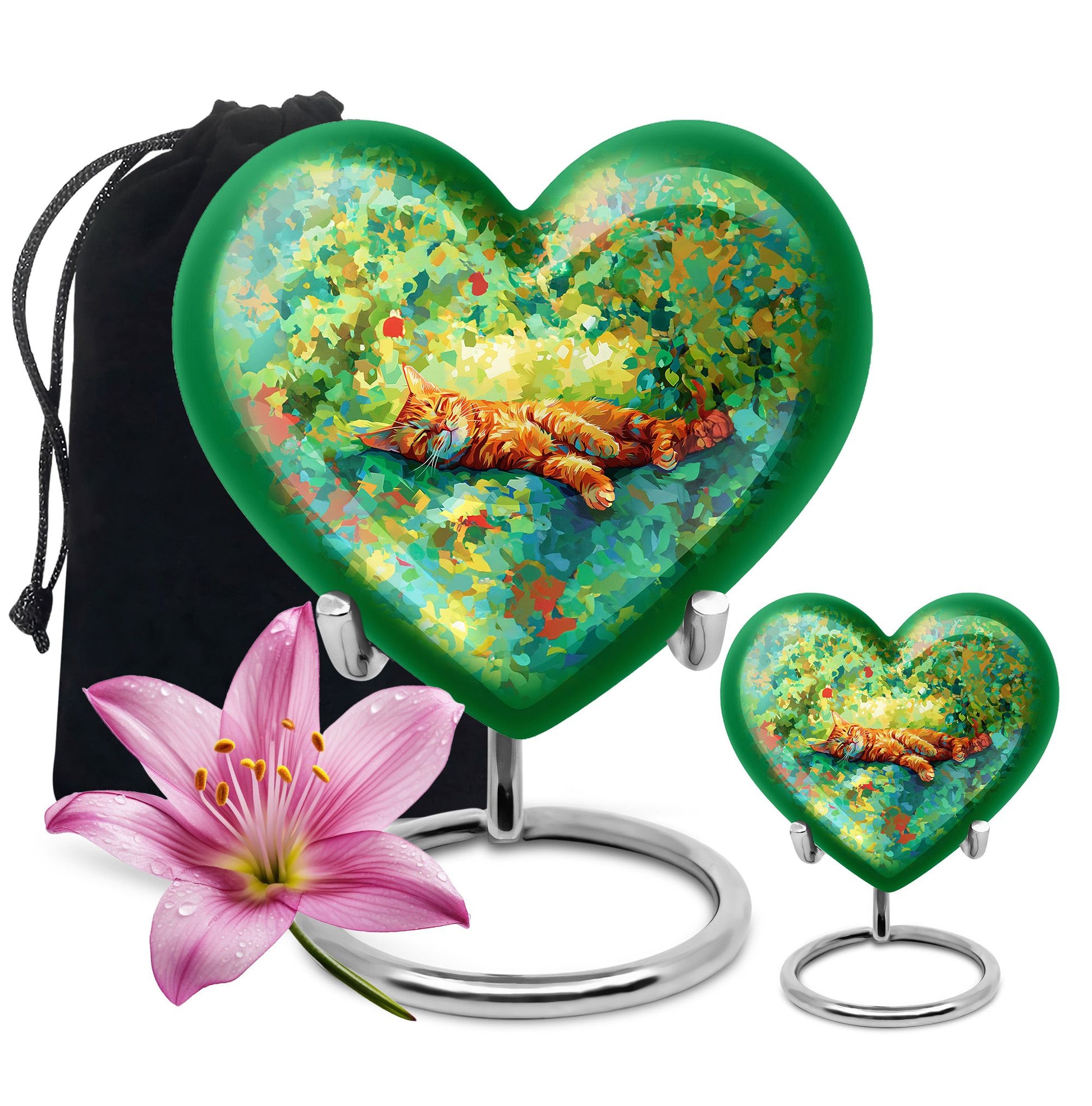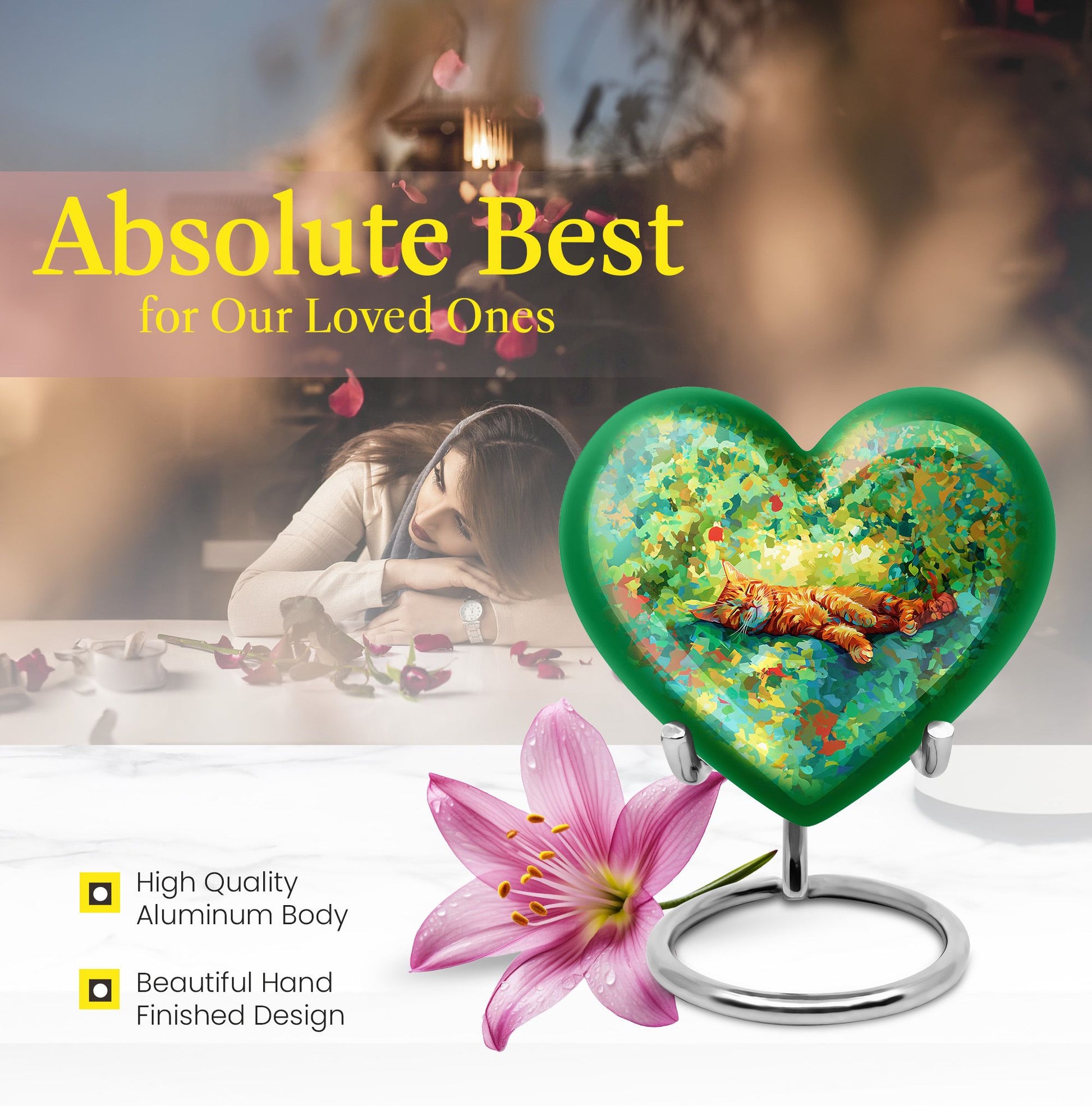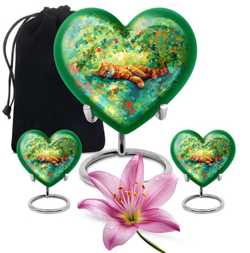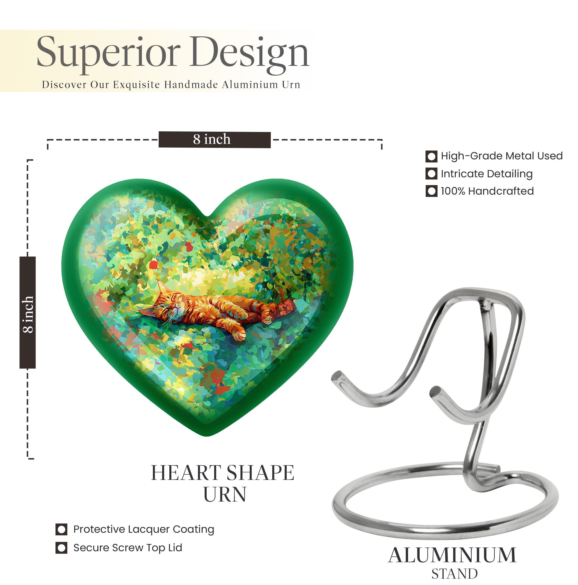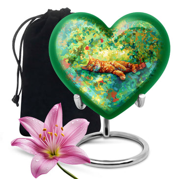 Discover a meaninful centerpiece for your treasured memories with our 10 inch, orange cat-style cremation urn. Crafted from durable aluminium, this large urn exhibits an abstract theme conveying the timeless beauty and lasting remembrance. With a weight of 3.3 pounds, it ensures stability and durability. The heart urn's capacity is a substantial 200 cubic inches, providing ample space for ashes. This urn comes with a velvet pouch, a respectful arrangement for carrying the precious content. A special feature of this item is the option to personalize it with engraved names, making it even unique and close to heart. Introduce an element of tranquility to any space with this tastefully crafted orange cat urn, a funeral piece that raises to the occasion, testament to the memory of a dear, departed one. Rendered in finely polished aluminium, it serves as a worthy vessel to keep the dearly loved ones close.