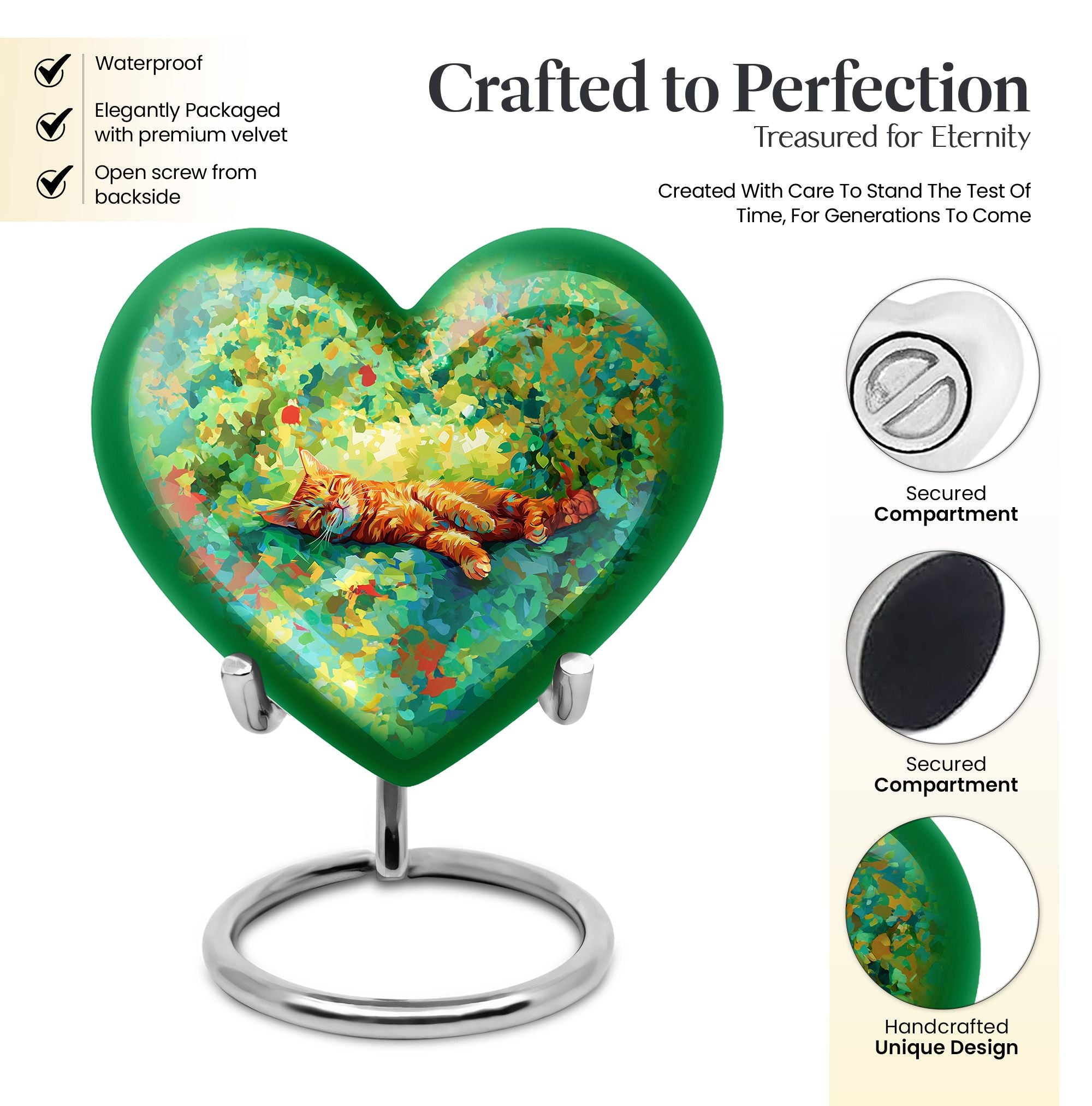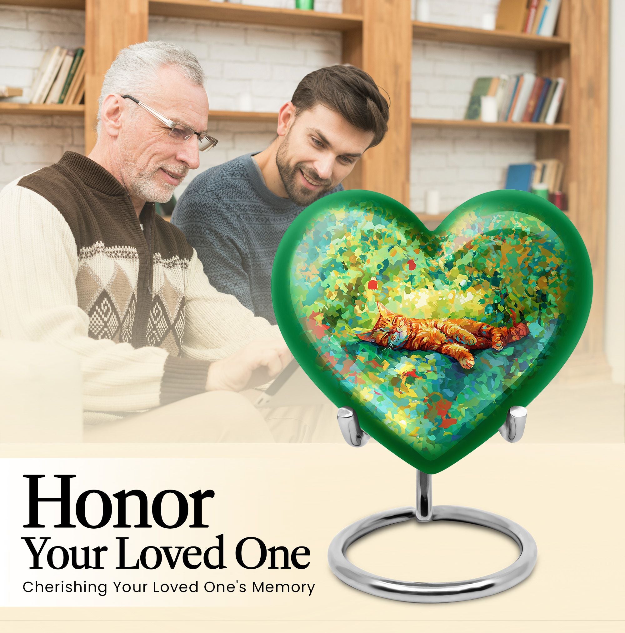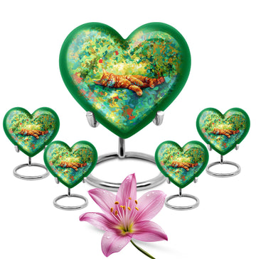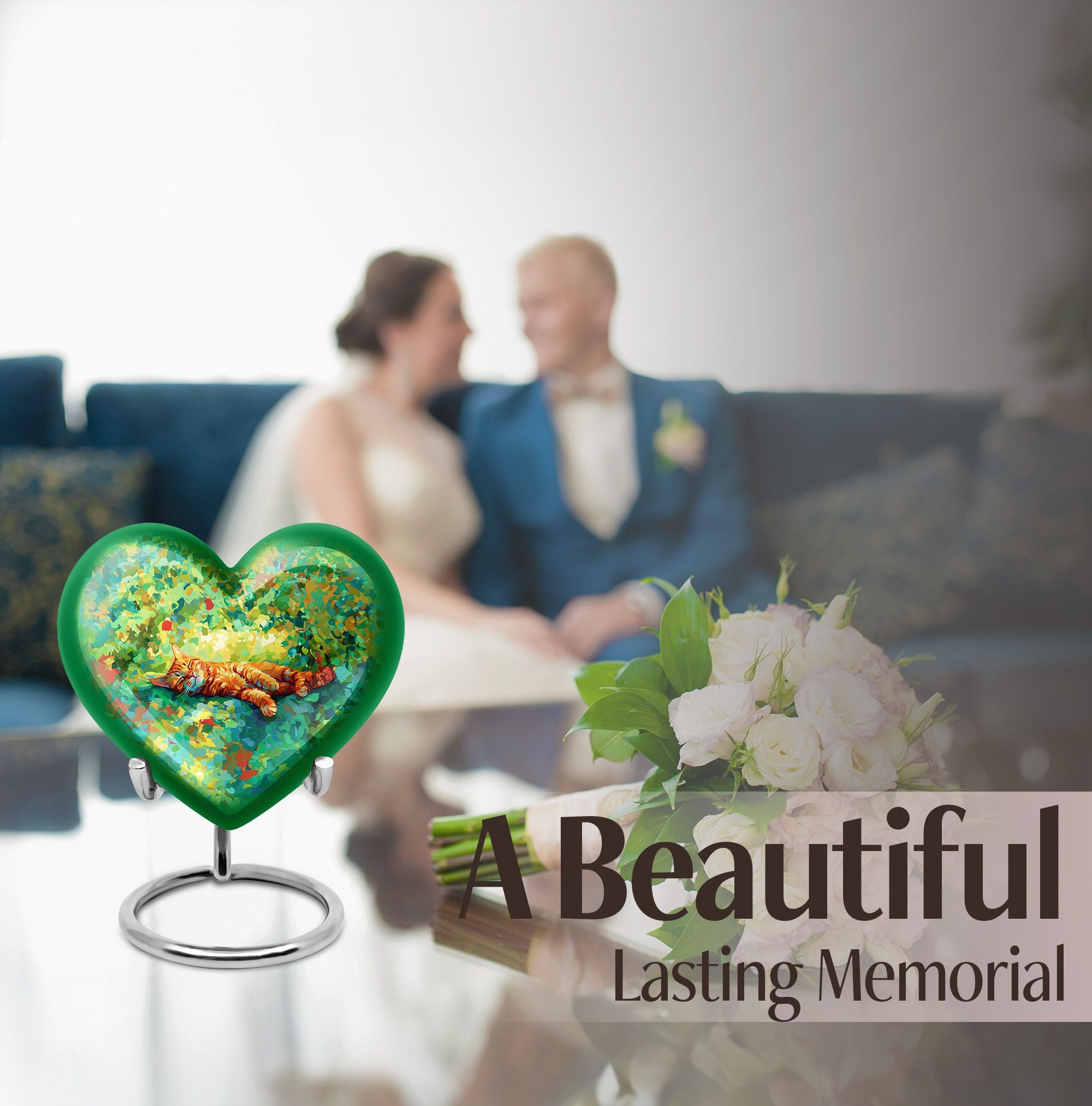Discover a meaninful centerpiece for your treasured memories with our 10 inch, orange cat-style cremation urn. Crafted from durable aluminium, this large urn exhibits an abstract theme conveying the timeless beauty and lasting remembrance. With a weight of 3.3 pounds, it ensures stability and durability. The heart urn's capacity is a substantial 200 cubic inches, providing ample space for ashes. This urn comes with a velvet pouch, a respectful arrangement for carrying the precious content. A special feature of this item is the option to personalize it with engraved names, making it even unique and close to heart. Introduce an element of tranquility to any space with this tastefully crafted orange cat urn, a funeral piece that raises to the occasion, testament to the memory of a dear, departed one. Rendered in finely polished aluminium, it serves as a worthy vessel to keep the dearly loved ones close.