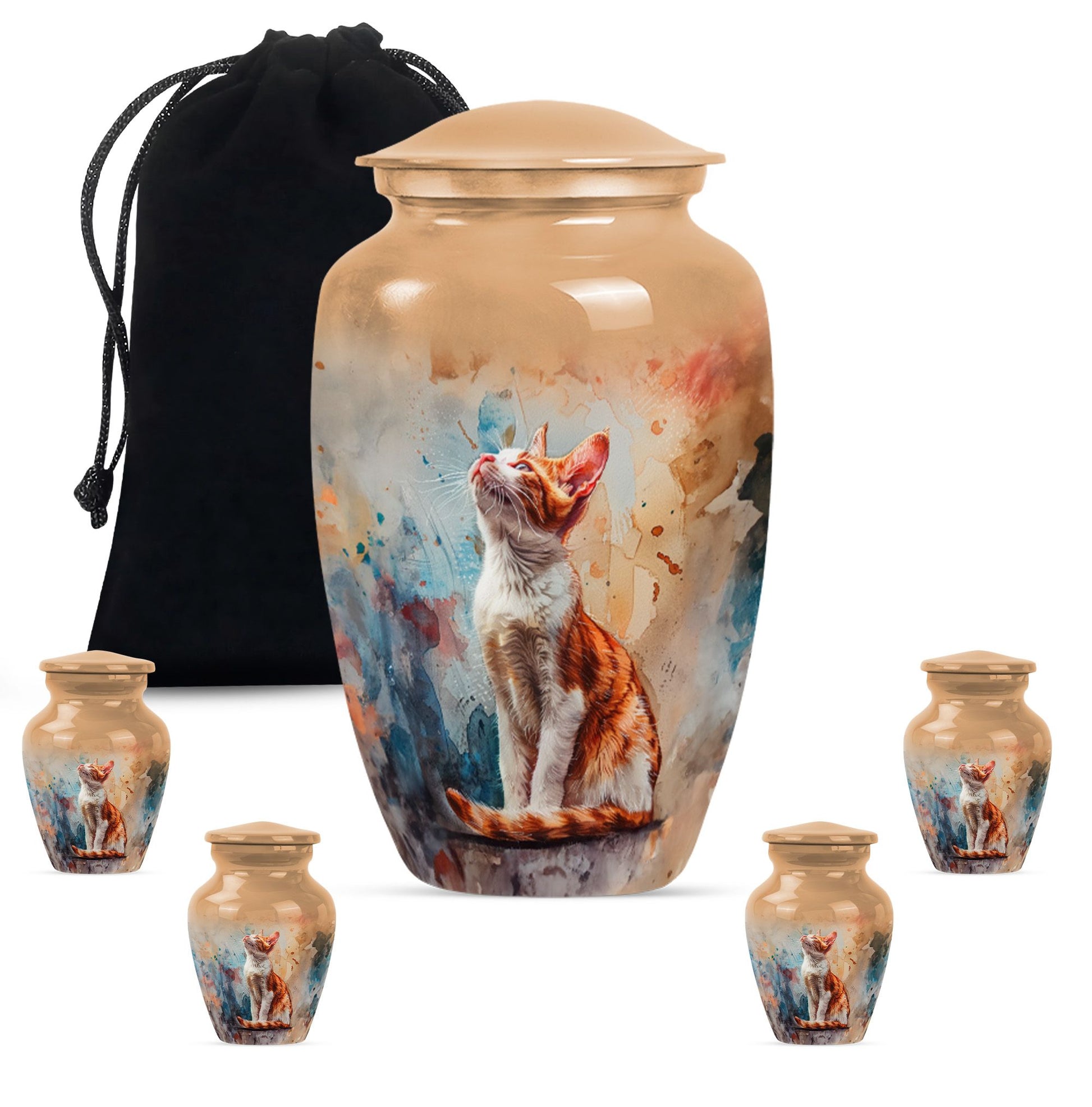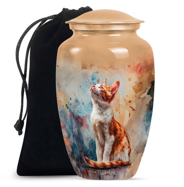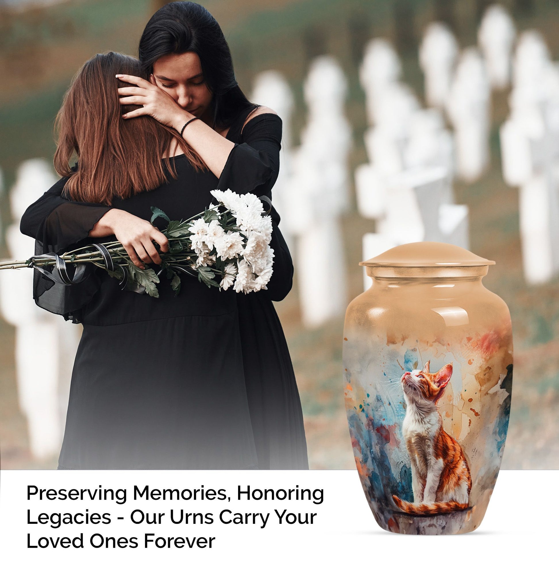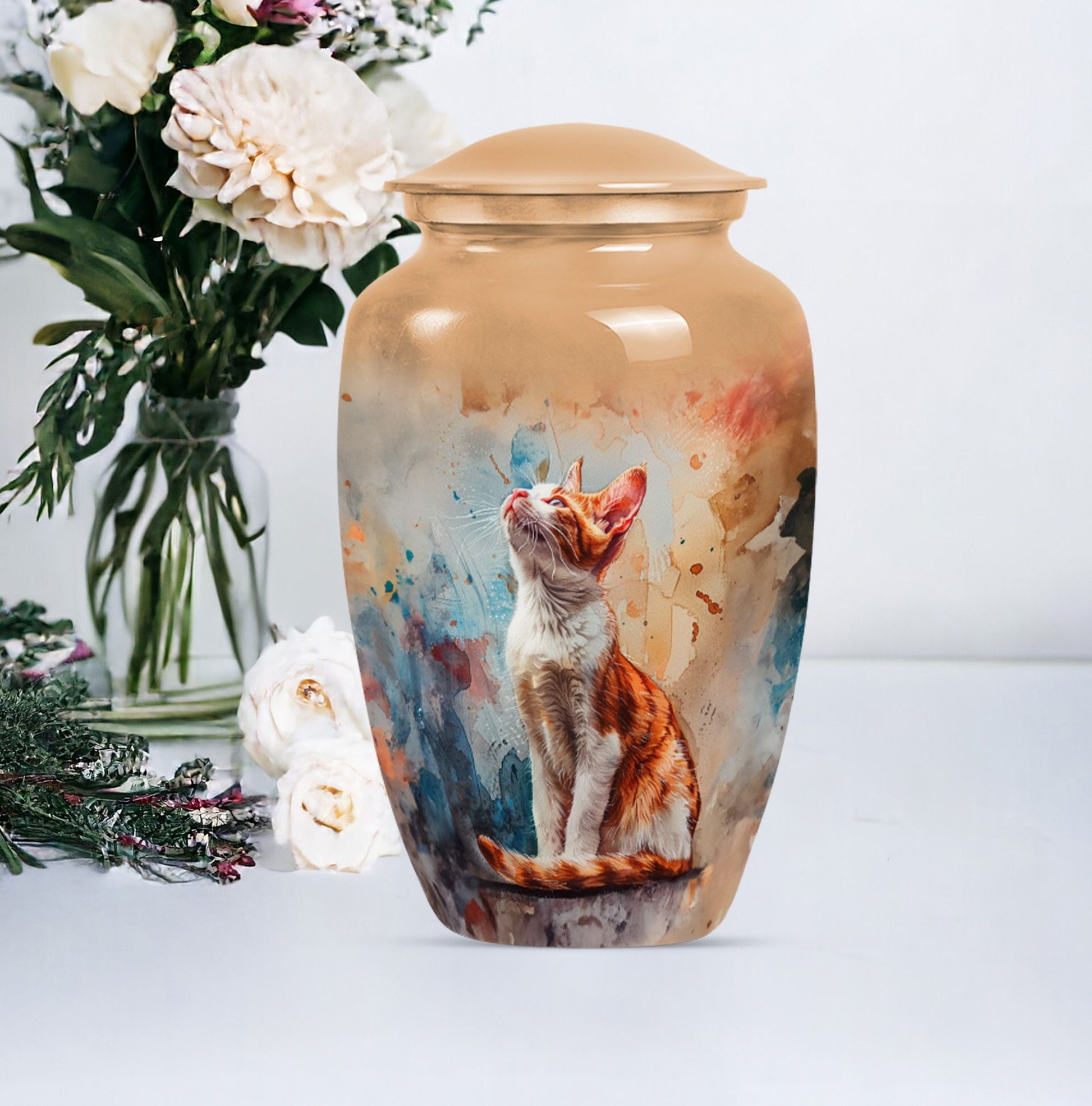 Preserve cherished memories with an enduring Orange Cat Cremation Urn. With its abstract theme, this large urn emanates a sense of tranquility; perfect for those seeking a poignant and respectful remembrance piece. Crafted of high-quality, sturdy aluminium, it weighs a substantial 3.3 pounds and stands 10 inches tall. It is not merely a cremation urn but a piece to respectfully honor your beloved. Its remarkable capacity of 200 cubic inches can securely keep your loved one's ashes. For a truly special touch, we offer an option to personalize it with engraved names, adding an added layer of sentimentality. The urn is also accompanied by a plush velvet pouch, designed for the secure containment of ashes. Whether you are in search of burial urns for men or a large urn adorned with an iridescent metal, this product caters elegantly to your needs. Keep in mind, however, that the beautiful design of a classic urn stays immutable irrespective of personalization. Aesthetics and functionality are both seamlessly achieved, making this urn a precious symbol of recall.