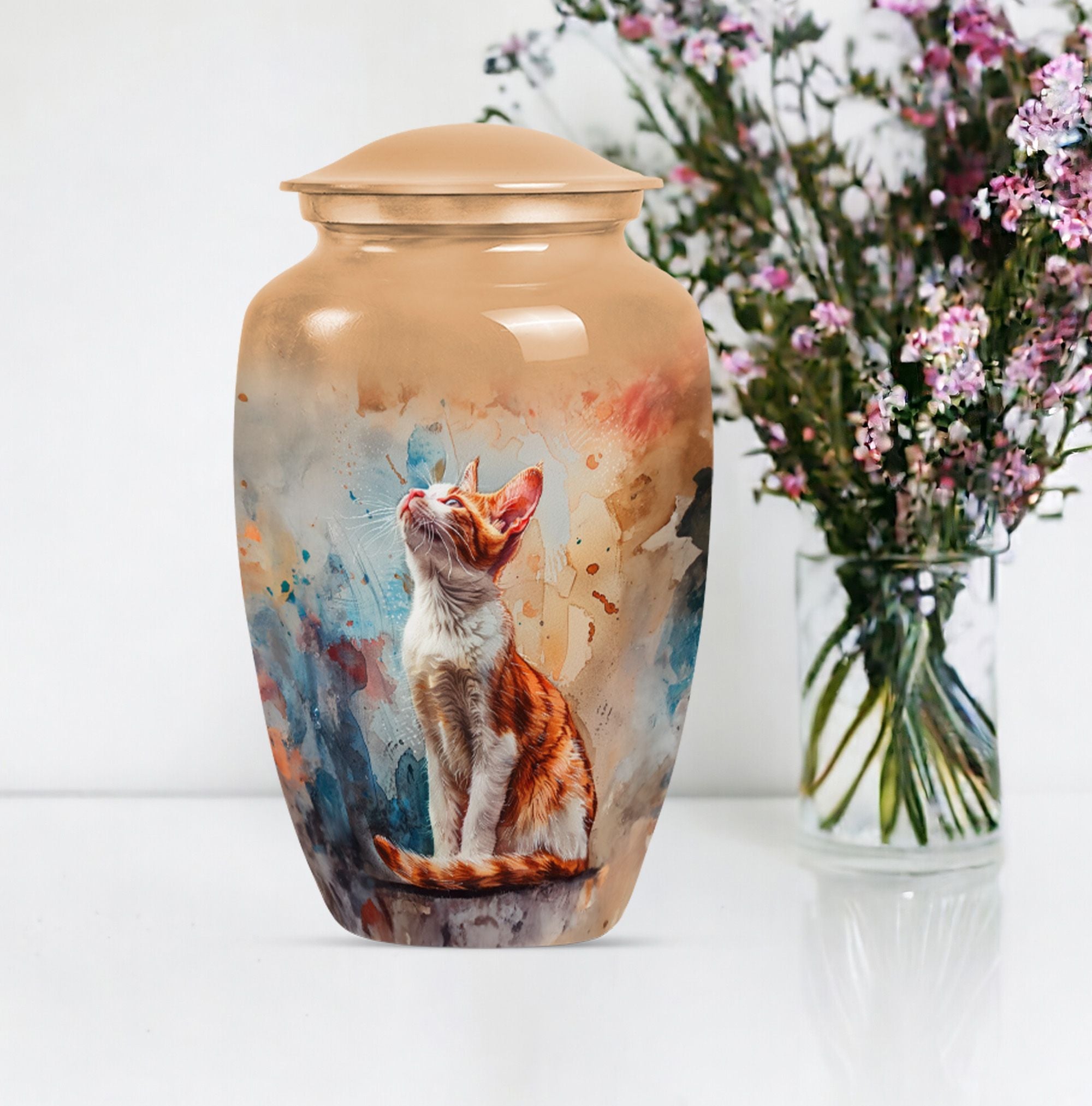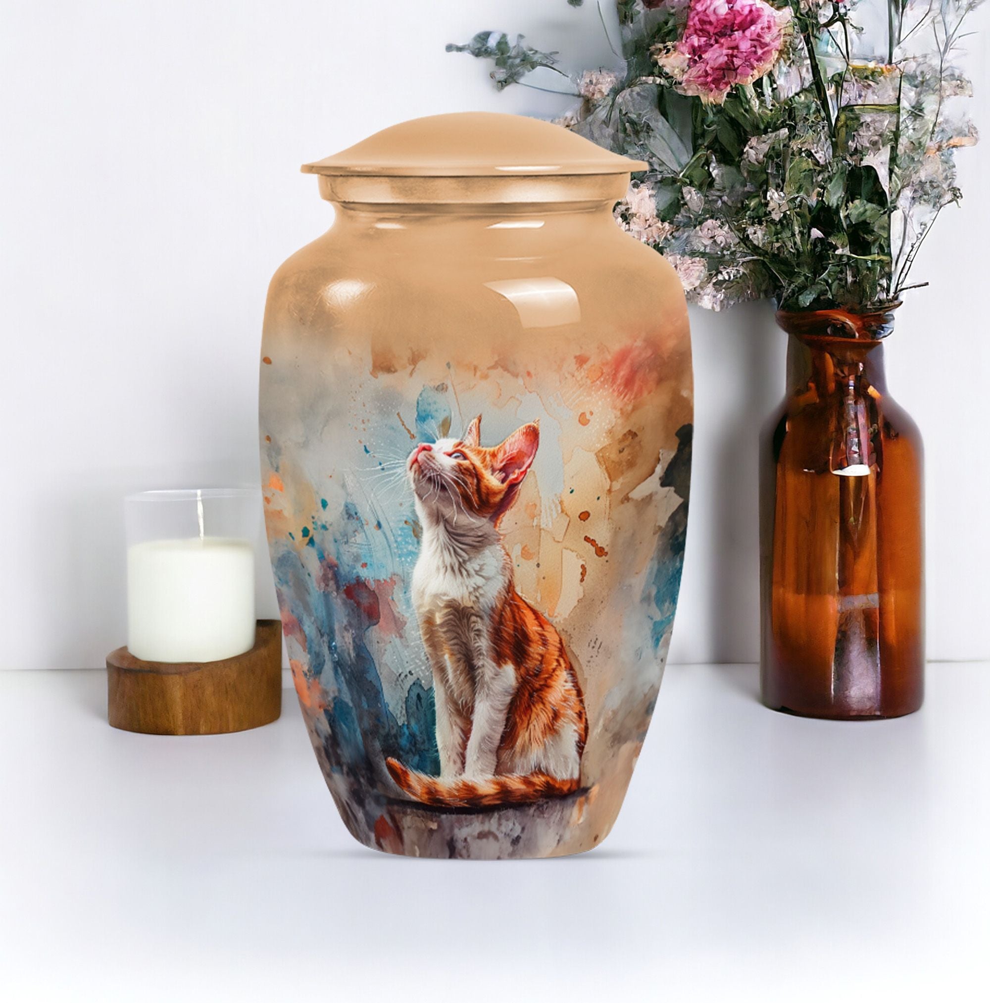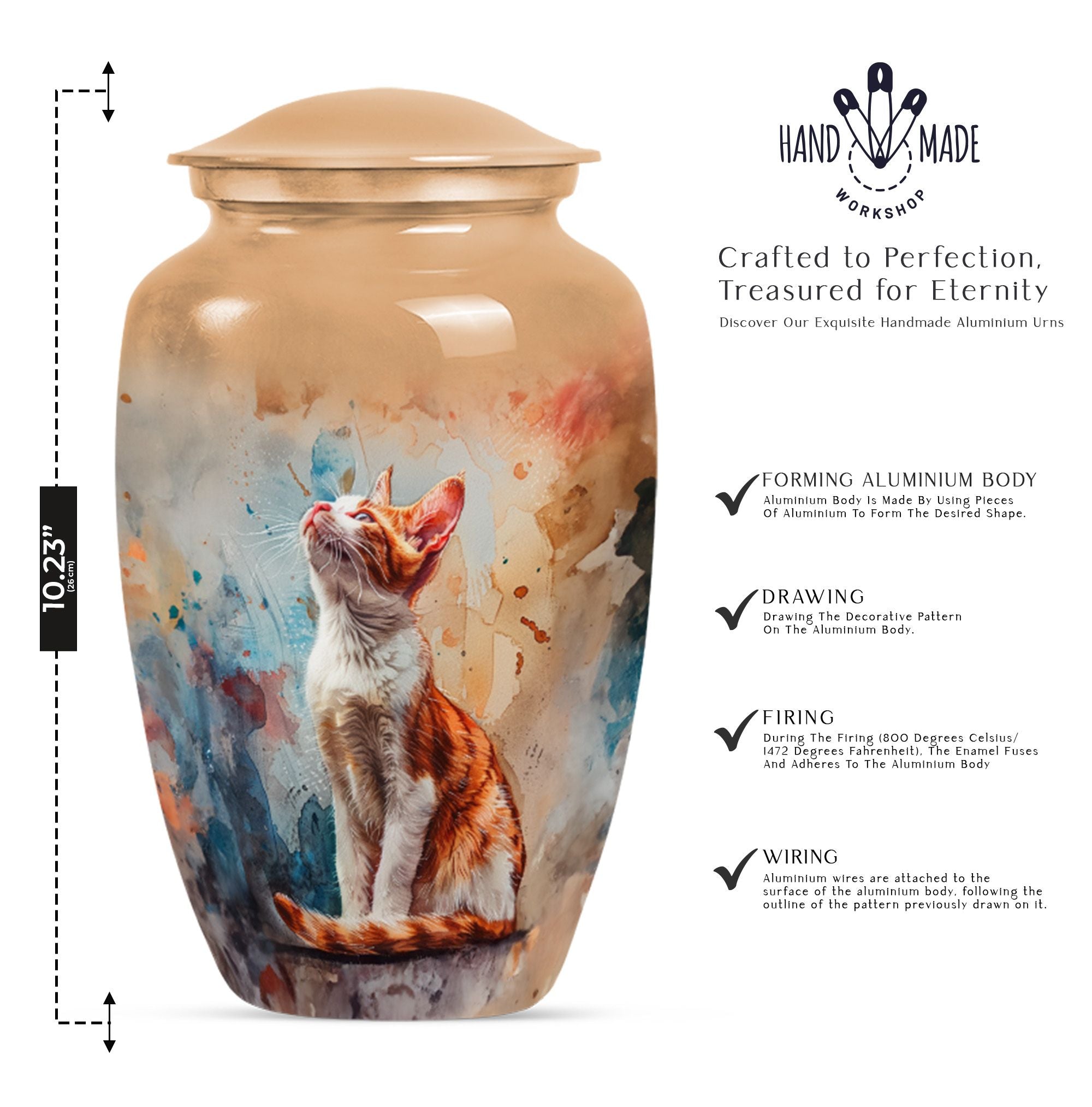 Preserve cherished memories with an enduring Orange Cat Cremation Urn. With its abstract theme, this large urn emanates a sense of tranquility; perfect for those seeking a poignant and respectful remembrance piece. Crafted of high-quality, sturdy aluminium, it weighs a substantial 3.3 pounds and stands 10 inches tall. It is not merely a cremation urn but a piece to respectfully honor your beloved. Its remarkable capacity of 200 cubic inches can securely keep your loved one's ashes. For a truly special touch, we offer an option to personalize it with engraved names, adding an added layer of sentimentality. The urn is also accompanied by a plush velvet pouch, designed for the secure containment of ashes. Whether you are in search of burial urns for men or a large urn adorned with an iridescent metal, this product caters elegantly to your needs. Keep in mind, however, that the beautiful design of a classic urn stays immutable irrespective of personalization. Aesthetics and functionality are both seamlessly achieved, making this urn a precious symbol of recall.