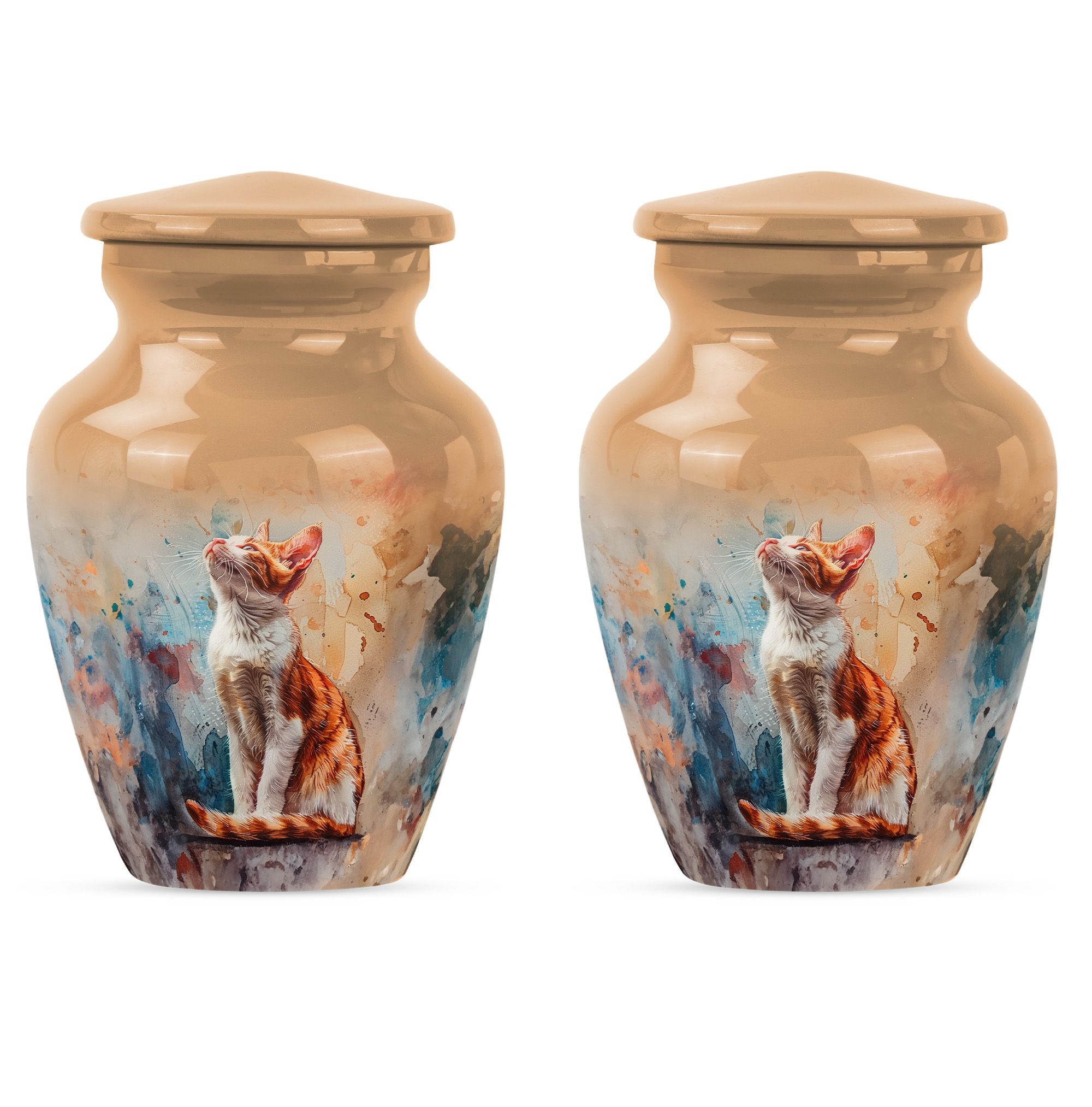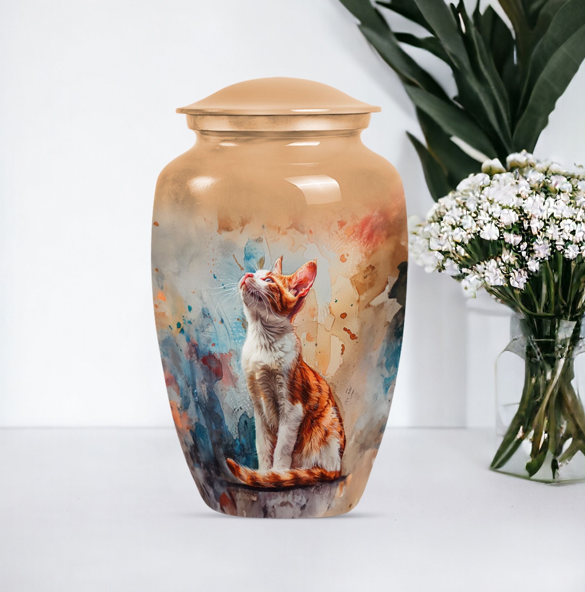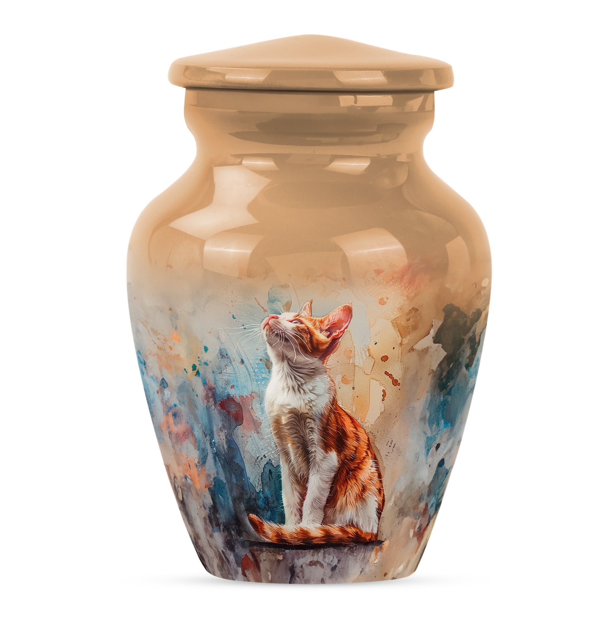 Preserve cherished memories with an enduring Orange Cat Cremation Urn. With its abstract theme, this large urn emanates a sense of tranquility; perfect for those seeking a poignant and respectful remembrance piece. Crafted of high-quality, sturdy aluminium, it weighs a substantial 3.3 pounds and stands 10 inches tall. It is not merely a cremation urn but a piece to respectfully honor your beloved. Its remarkable capacity of 200 cubic inches can securely keep your loved one's ashes. For a truly special touch, we offer an option to personalize it with engraved names, adding an added layer of sentimentality. The urn is also accompanied by a plush velvet pouch, designed for the secure containment of ashes. Whether you are in search of burial urns for men or a large urn adorned with an iridescent metal, this product caters elegantly to your needs. Keep in mind, however, that the beautiful design of a classic urn stays immutable irrespective of personalization. Aesthetics and functionality are both seamlessly achieved, making this urn a precious symbol of recall.