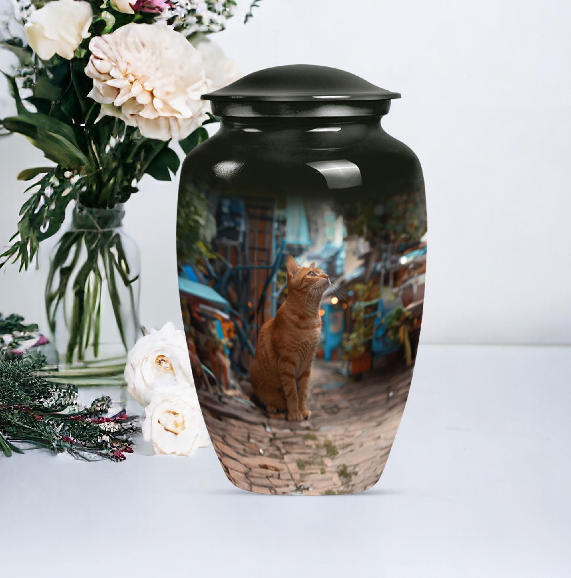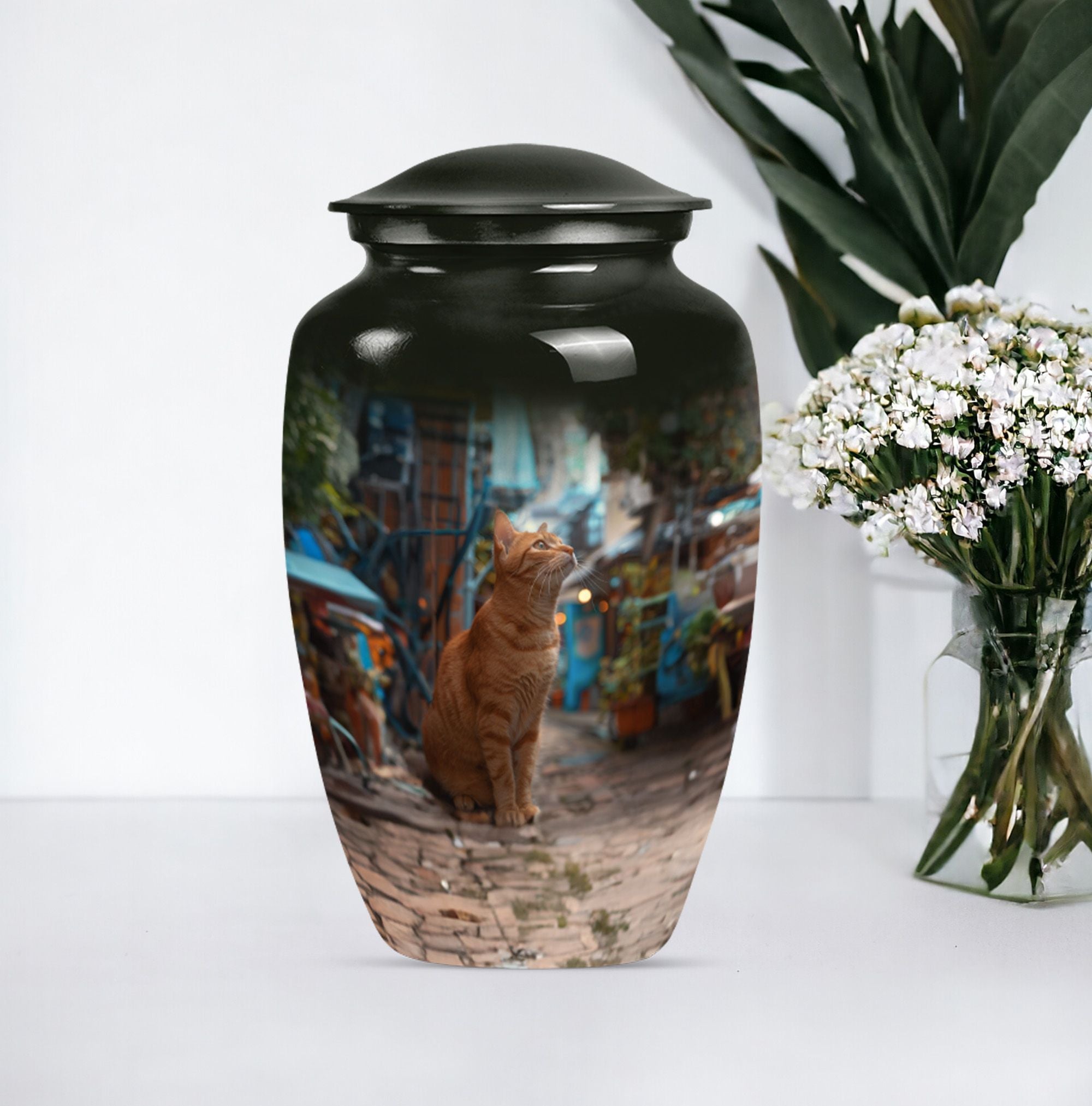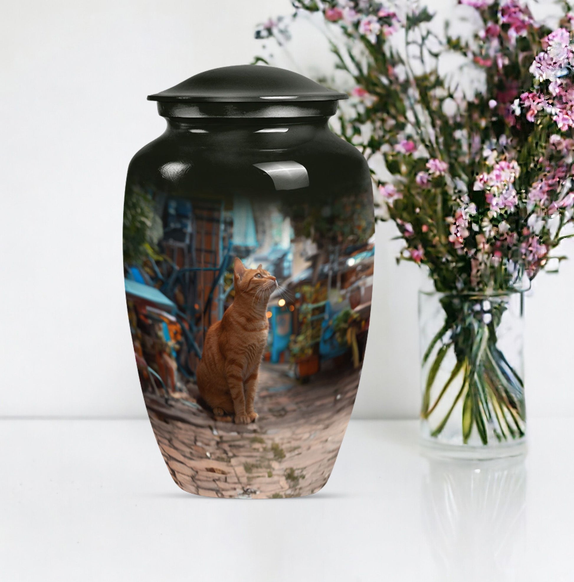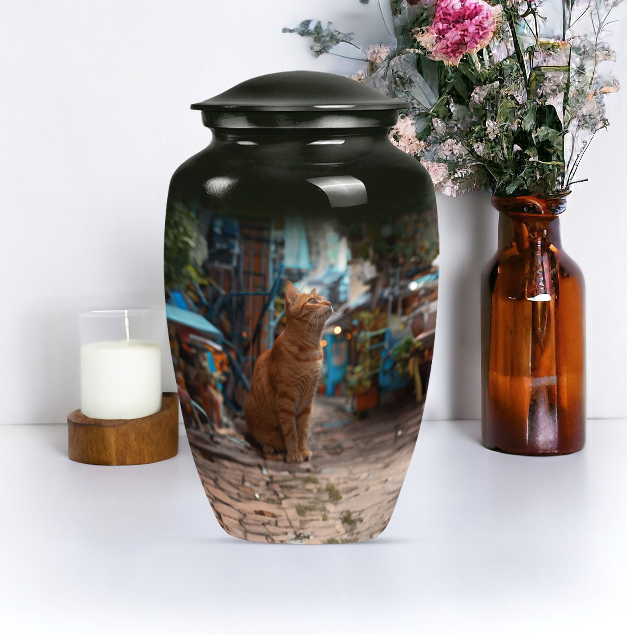 Encapsulate the essence of your loved ones with our captivating 'Orange Cat Urn,' a large 10-inch cremation urn for ashes, meticulously crafted from high-grade aluminium. The abstract theme imparts an artistic touch while harmonizing with the classic urn style. This urn is robust, with a weight of 3.3 pounds, assuring resilience and durability. The urn has an overall height of 10 inches and can hold up to 200 cubic inches, providing ample room for preservation. Our urns are also customizable, allowing engraved names for personalization and fond remembrance. The package also includes a velvet pouch, ensuring secure containment of the ashes. Our burial urn is designed to be multipurpose, doubling as a photo frame for added sentimental value. Apt for funeral urns for adult ashes women. Ignite a sense of eternal connection with our unique cremation urn, a memorial solution blending elegance, sentiment, and purpose.