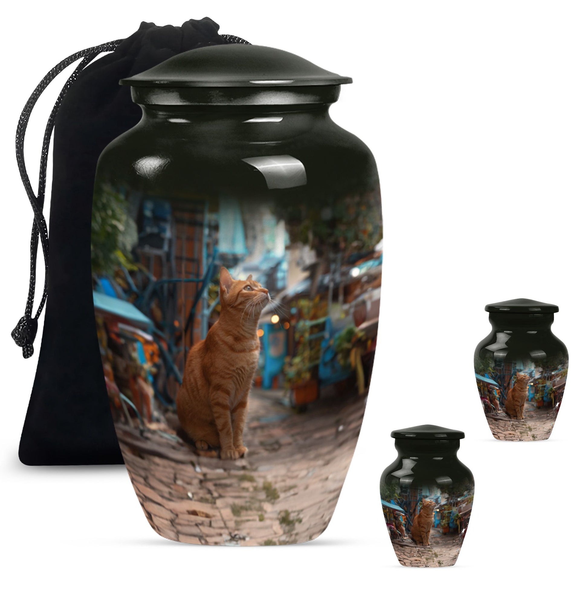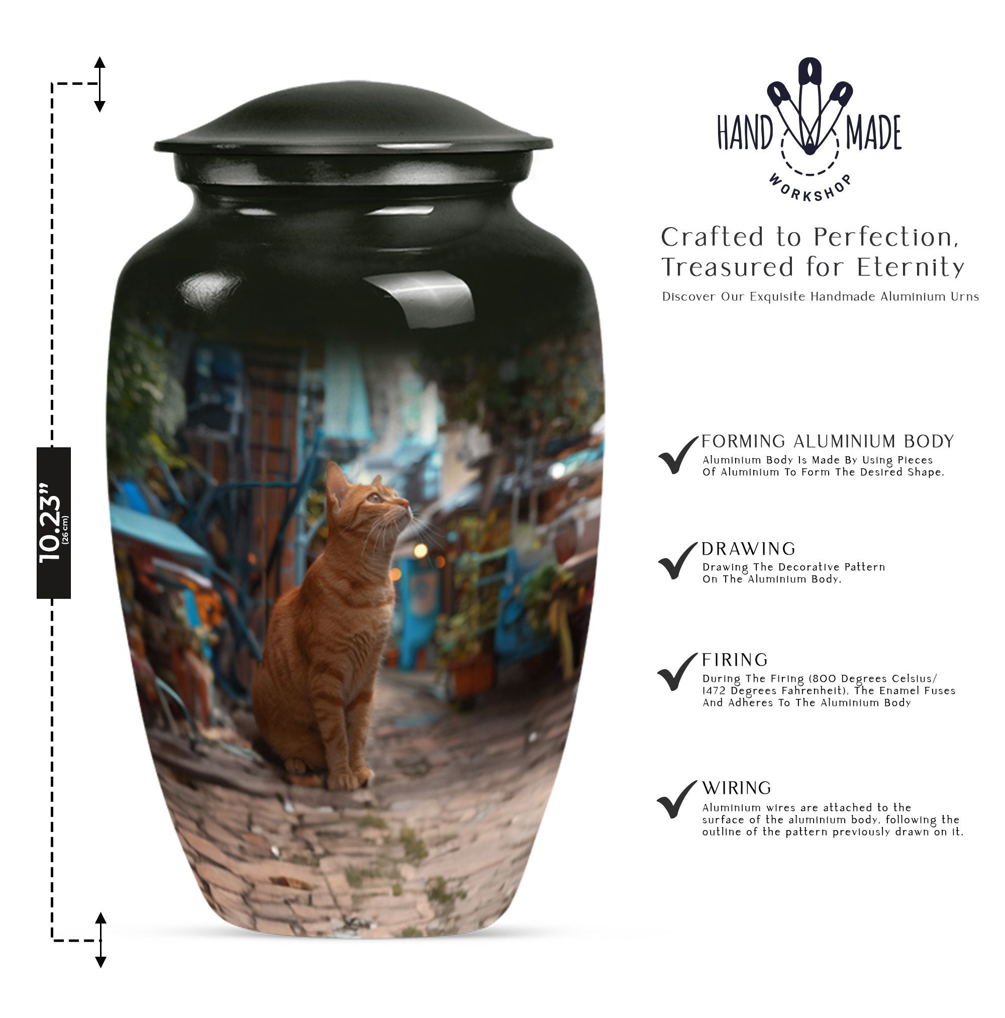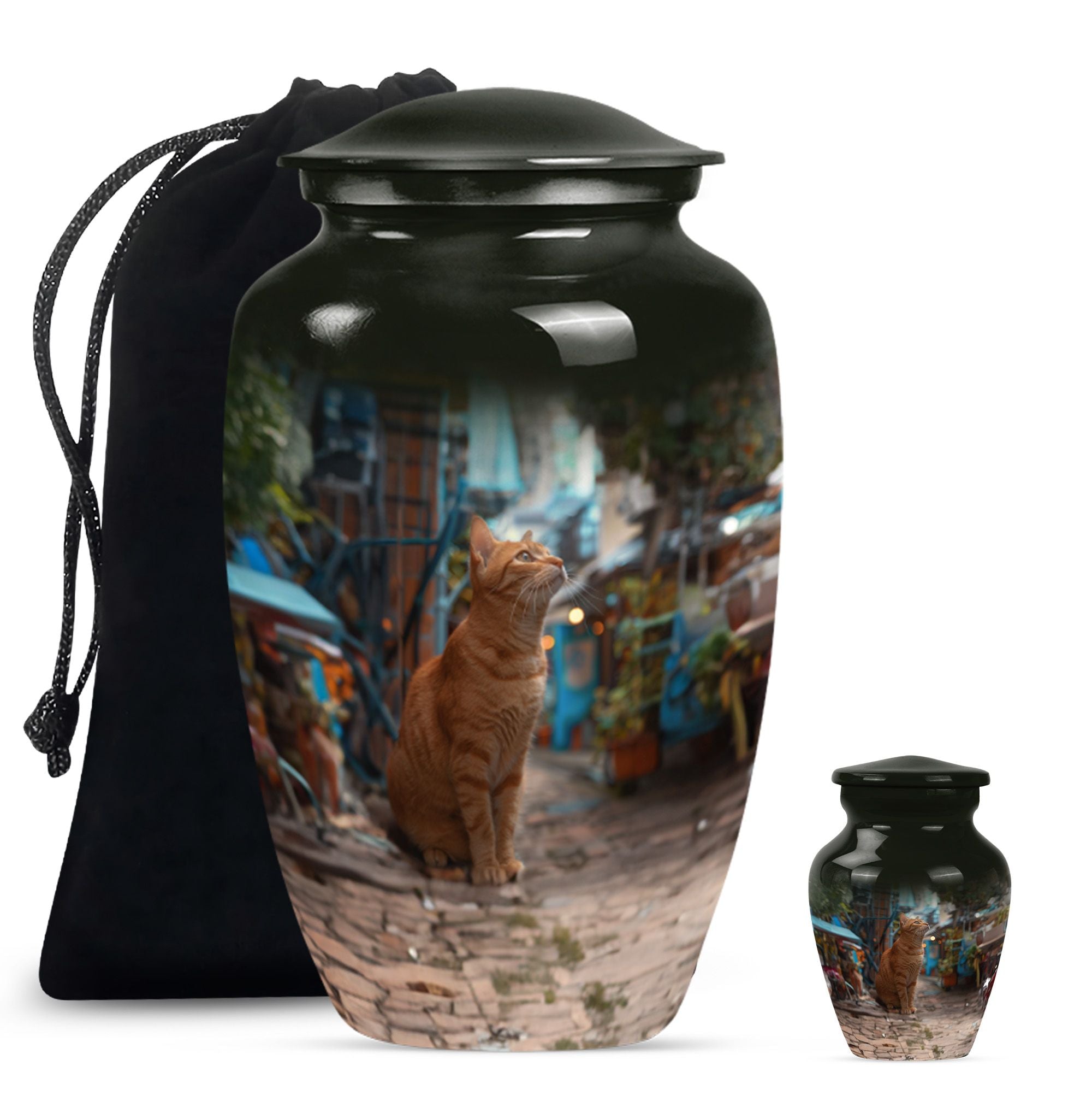 Encapsulate the essence of your loved ones with our captivating 'Orange Cat Urn,' a large 10-inch cremation urn for ashes, meticulously crafted from high-grade aluminium. The abstract theme imparts an artistic touch while harmonizing with the classic urn style. This urn is robust, with a weight of 3.3 pounds, assuring resilience and durability. The urn has an overall height of 10 inches and can hold up to 200 cubic inches, providing ample room for preservation. Our urns are also customizable, allowing engraved names for personalization and fond remembrance. The package also includes a velvet pouch, ensuring secure containment of the ashes. Our burial urn is designed to be multipurpose, doubling as a photo frame for added sentimental value. Apt for funeral urns for adult ashes women. Ignite a sense of eternal connection with our unique cremation urn, a memorial solution blending elegance, sentiment, and purpose.