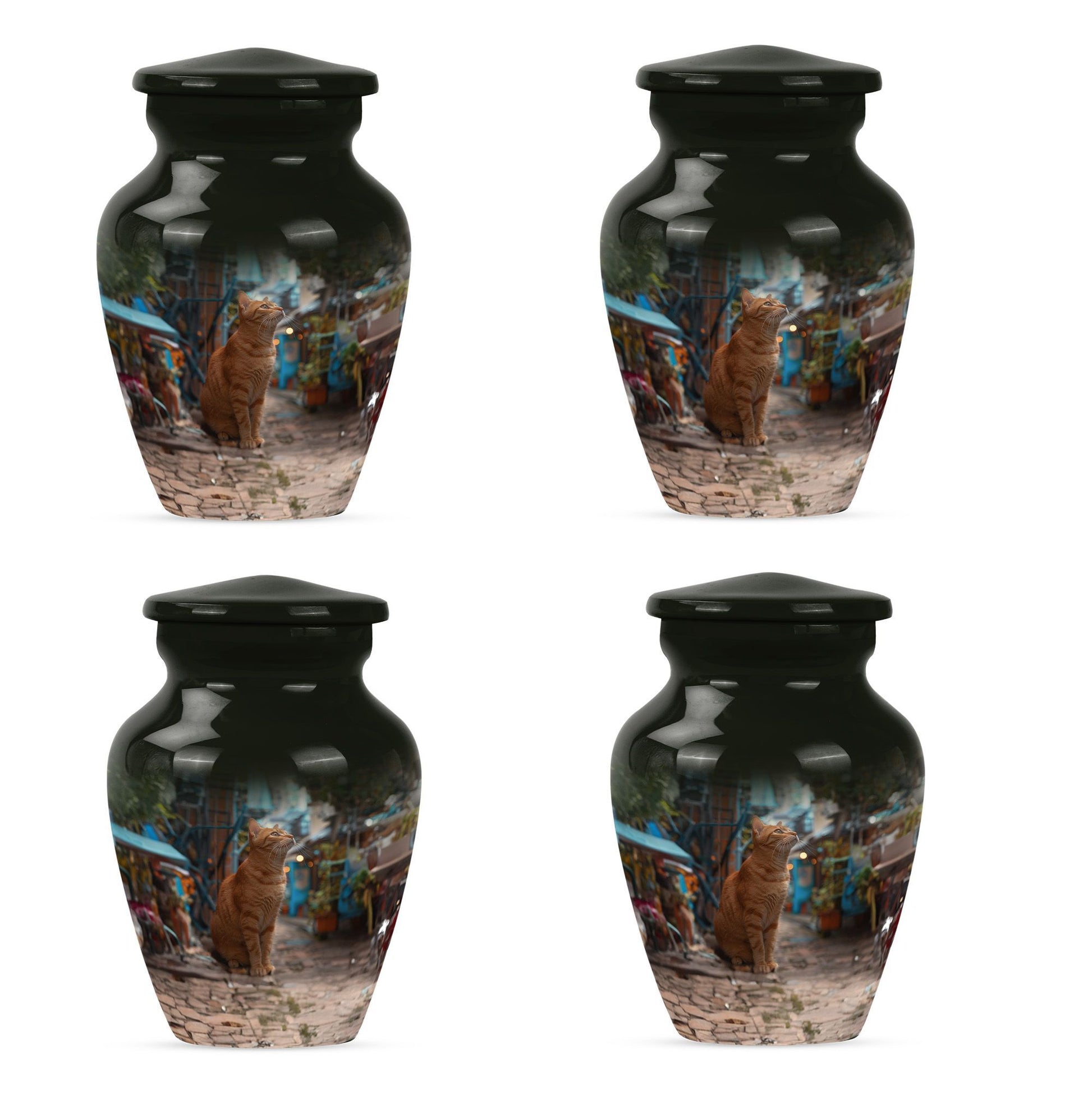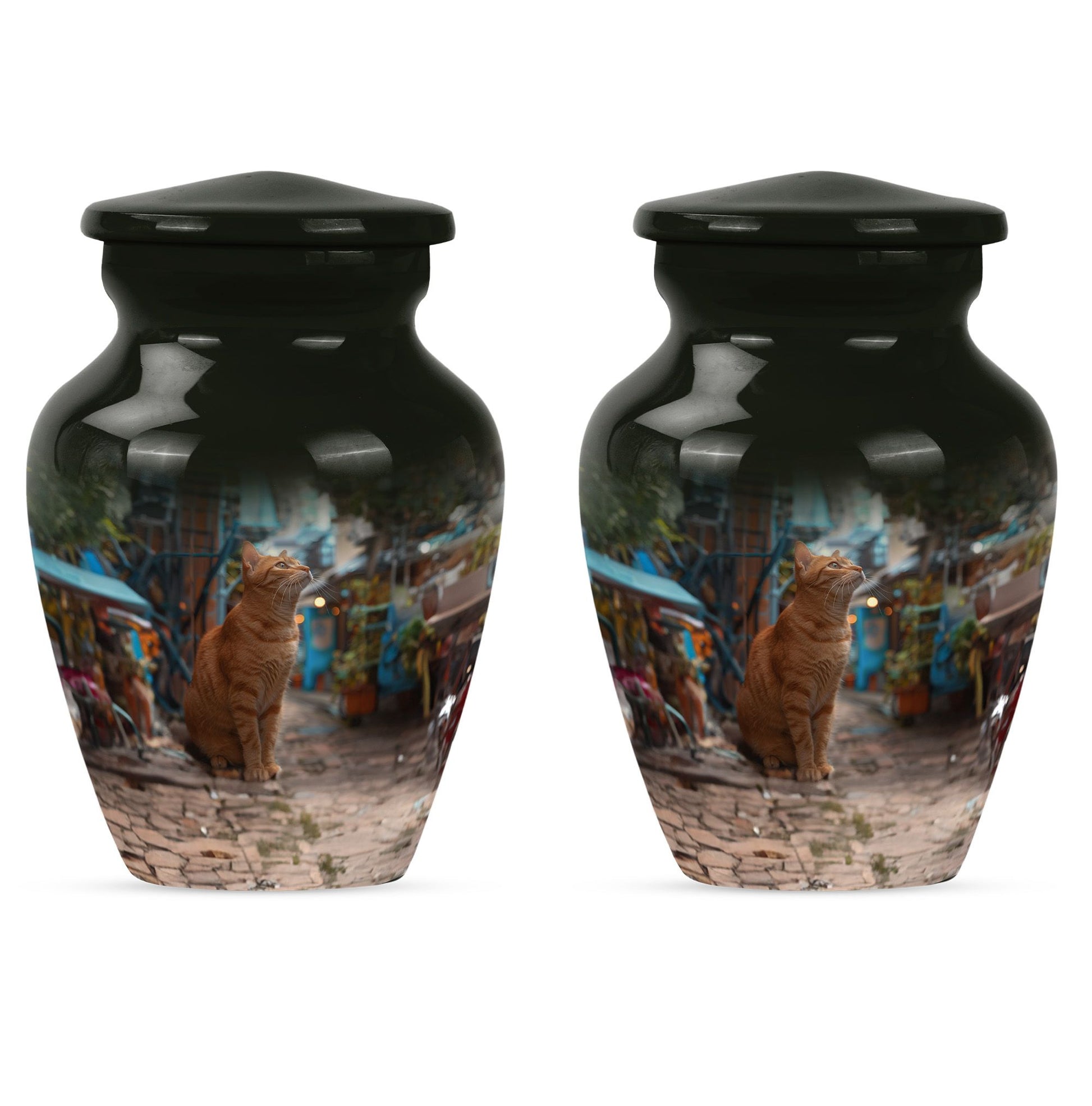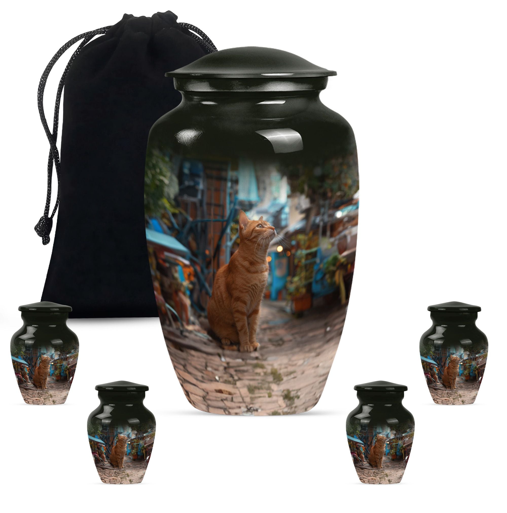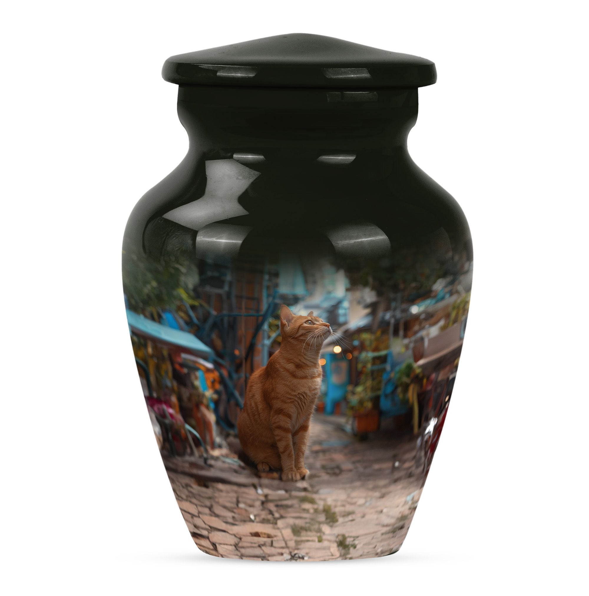 Encapsulate the essence of your loved ones with our captivating 'Orange Cat Urn,' a large 10-inch cremation urn for ashes, meticulously crafted from high-grade aluminium. The abstract theme imparts an artistic touch while harmonizing with the classic urn style. This urn is robust, with a weight of 3.3 pounds, assuring resilience and durability. The urn has an overall height of 10 inches and can hold up to 200 cubic inches, providing ample room for preservation. Our urns are also customizable, allowing engraved names for personalization and fond remembrance. The package also includes a velvet pouch, ensuring secure containment of the ashes. Our burial urn is designed to be multipurpose, doubling as a photo frame for added sentimental value. Apt for funeral urns for adult ashes women. Ignite a sense of eternal connection with our unique cremation urn, a memorial solution blending elegance, sentiment, and purpose.