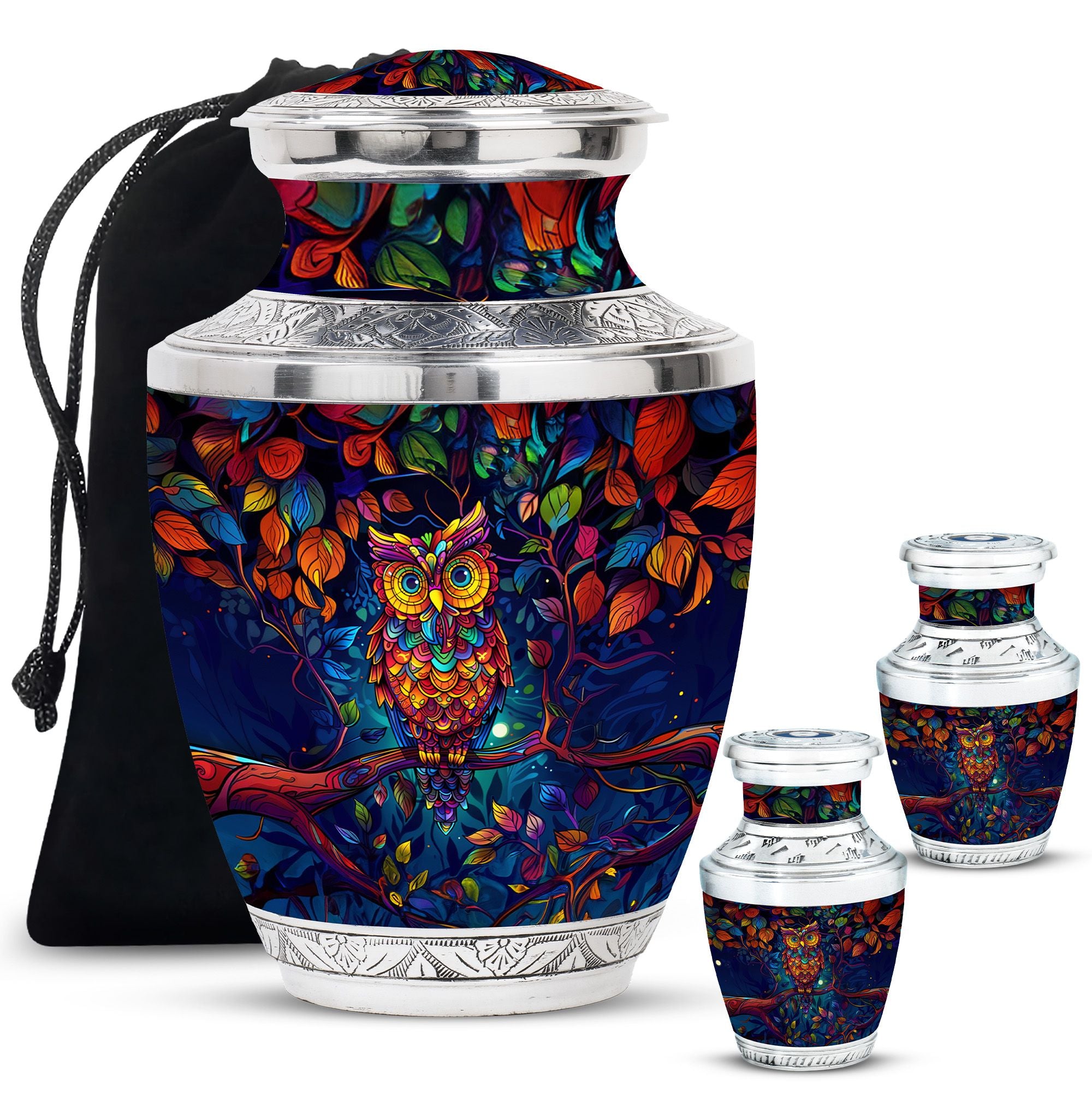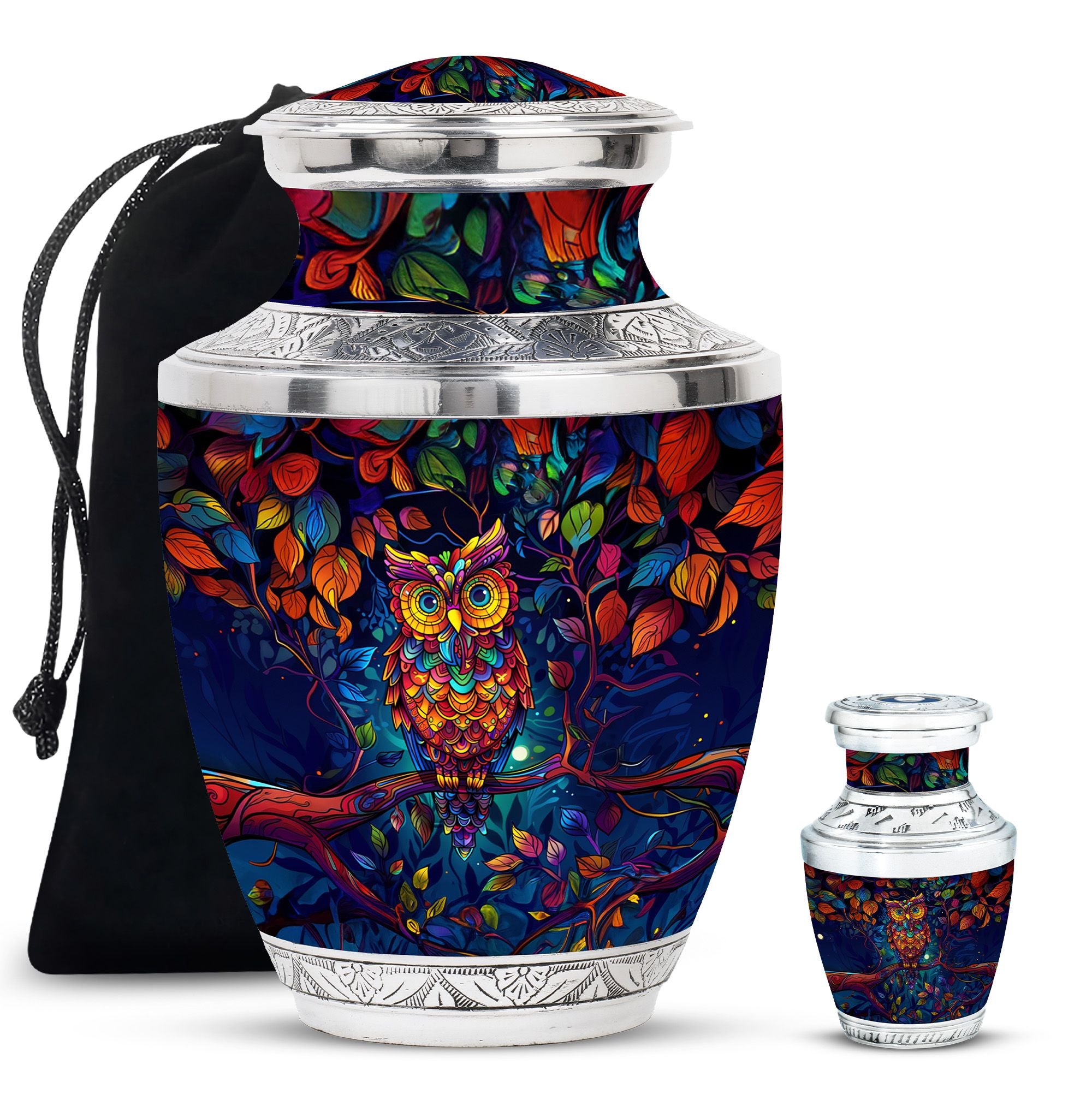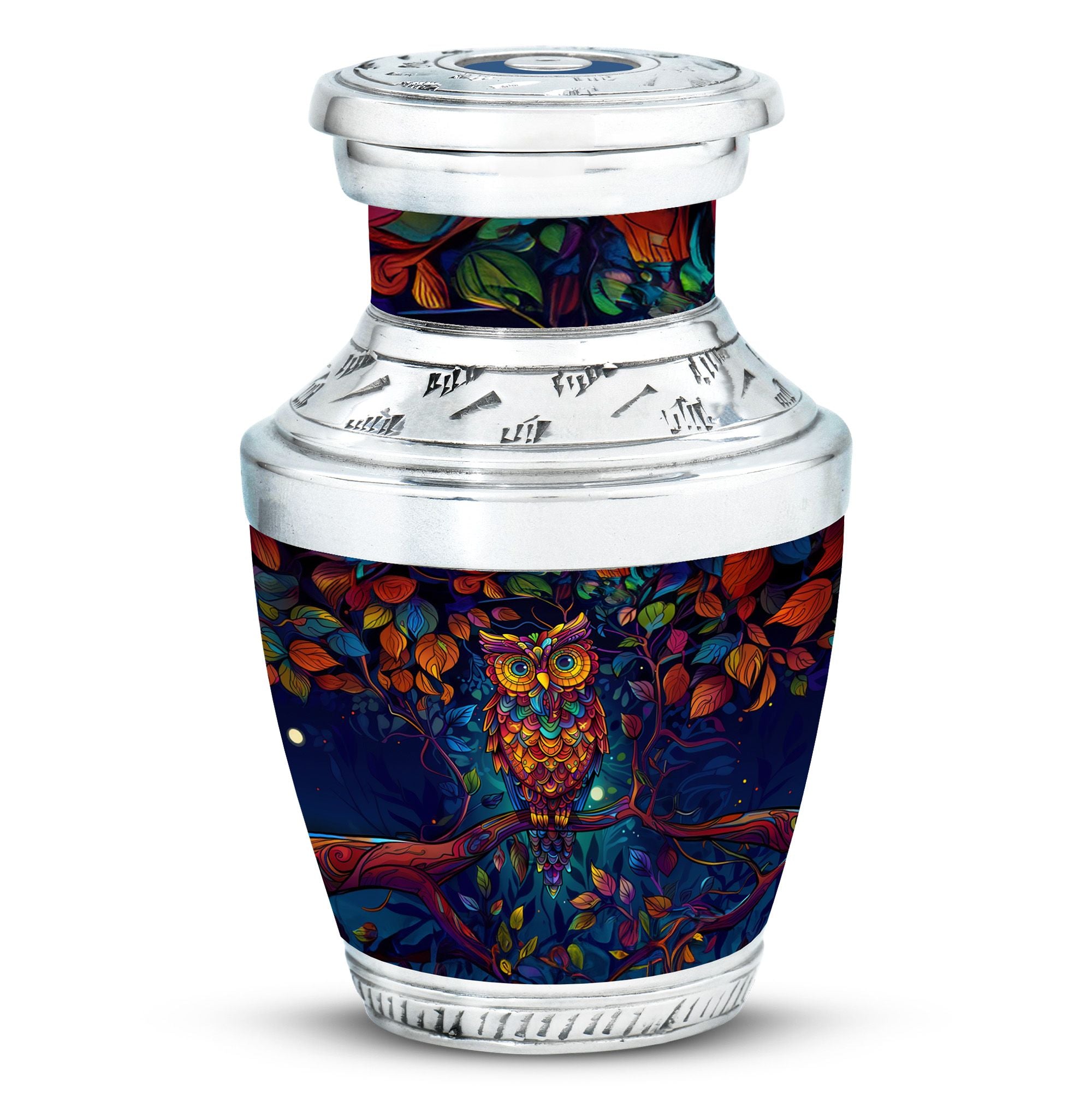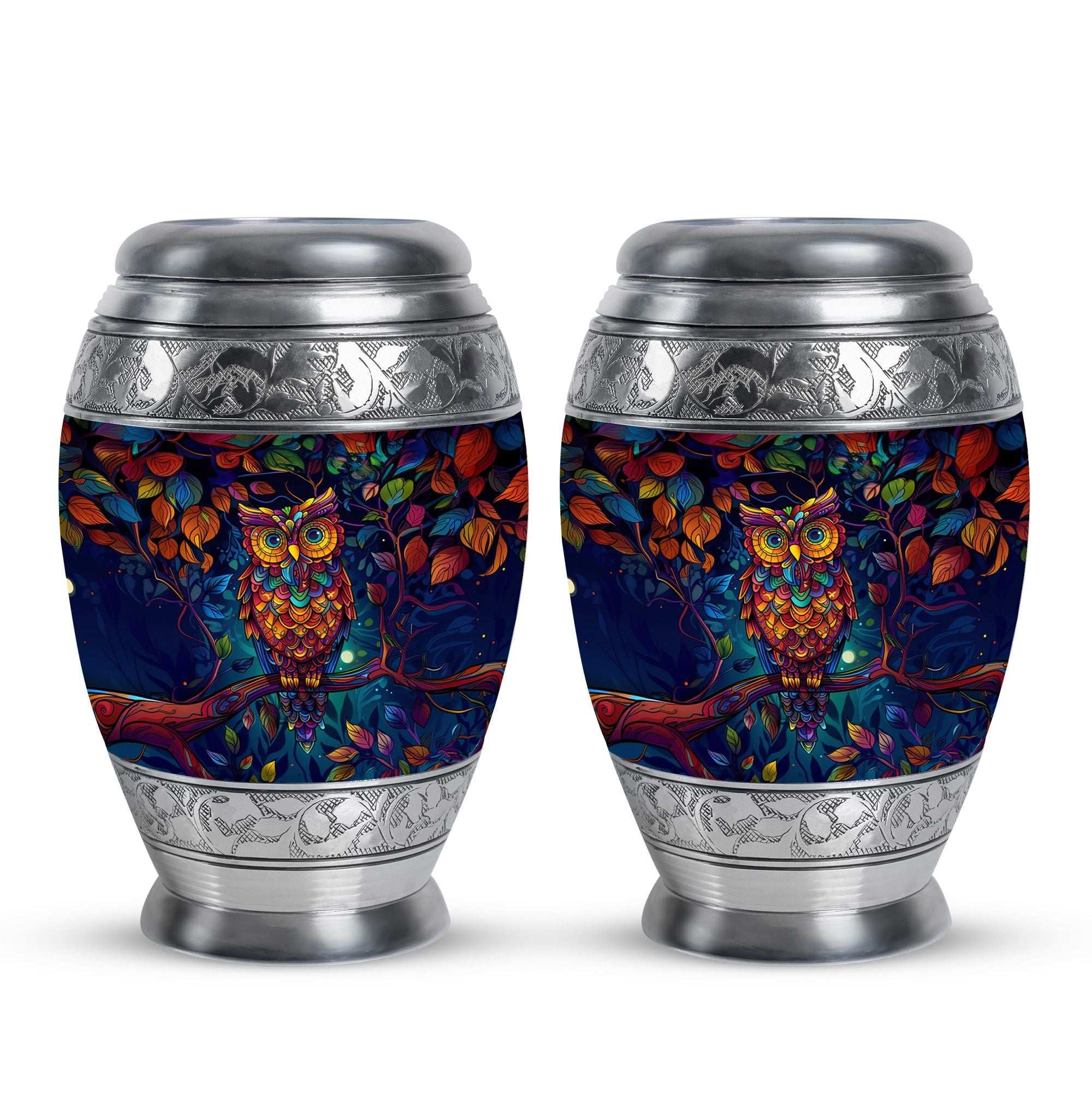 Crafted from durable aluminum, this urn offers both strength and elegance. The detailed owl artwork reflects peace and guidance, making it ideal as a human urn for ashes adult male or one of the most symbolic human urns for ashes adult female. Designed with a secure screw-top lid, it ensures ashes remain safe, whether used as a large urn for display, a burial urn, or paired with small urns for adult male or urns for human ashes adult female small size for sharing among family members.