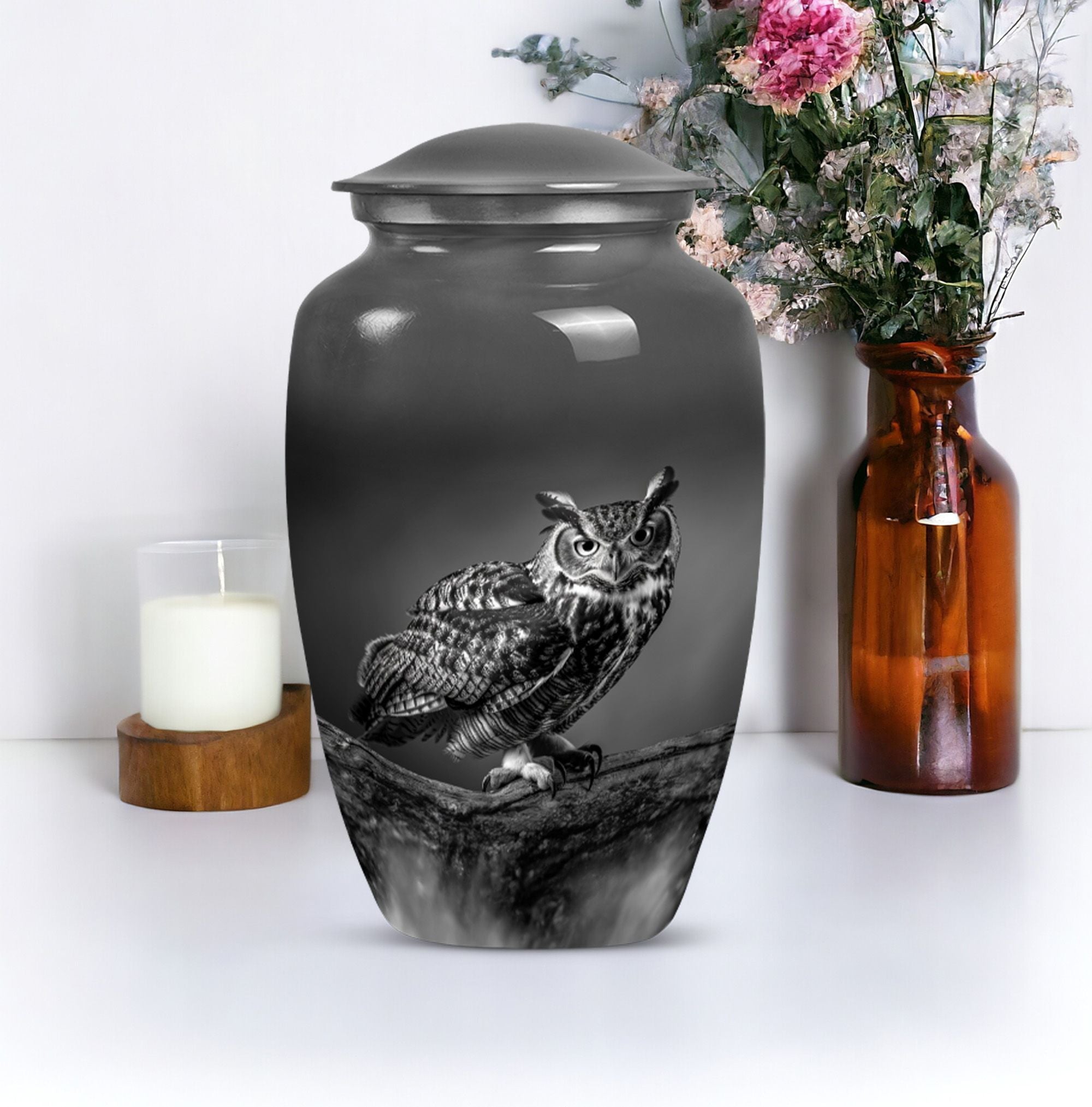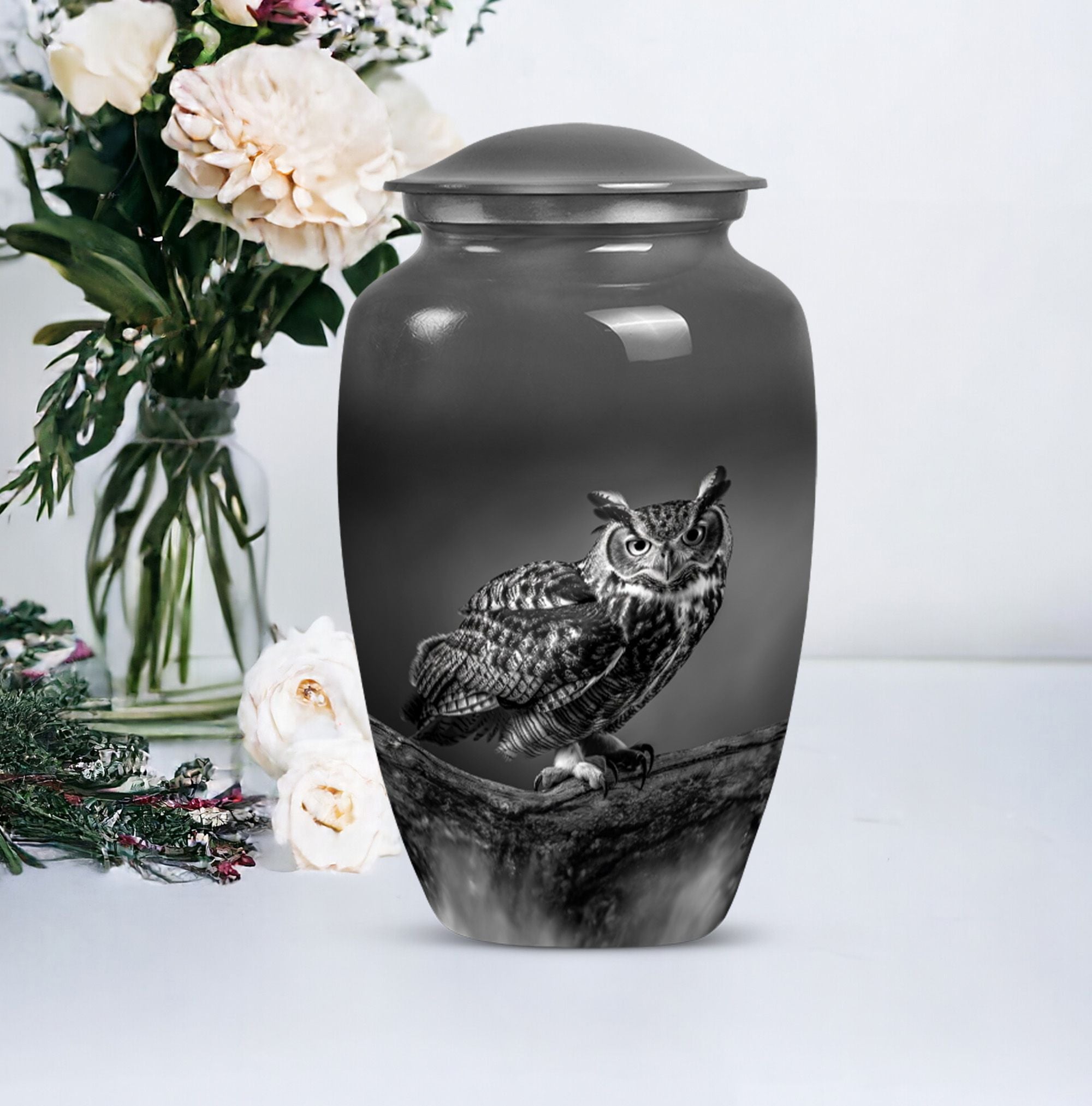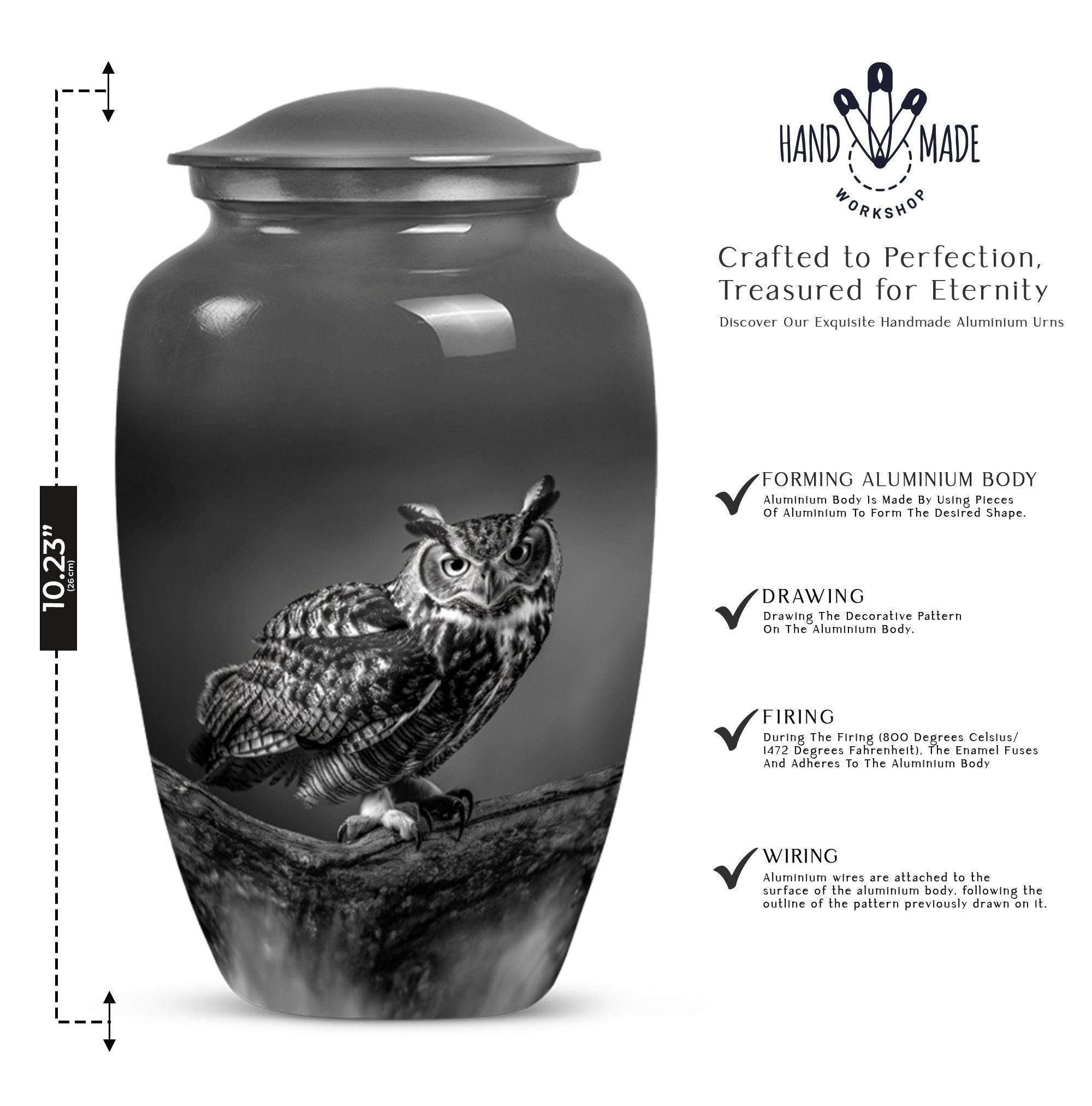An ode to fond memories and a symbol of everlasting love, this classic Owl Urn serves as a poignant memorial urn for male adults. Its elegant 10-inch size and 3.3 pounds of exquisite aluminum craftsmanship offer a respectful and dignified choice when selecting an urn for your loved one. Every aspect of this piece, from its abstract theme to its large capacity of 200 cubic inches, speaks of its top-tier quality. Customization options adorn this urn, offering space for personalized engraved names, making it truly unique and sentimental. The package also includes a rich velvet pouch that serves to contain the ashes with reverence and care. Whether you are seeking female urns or companion urns, this cremation urn effortlessly encapsulates the essence of memorabilia with its well-thought-out design. Larger than average, it provides ample space for ashes, making it a fitting choice for a large metal urn. Transcending ordinary descriptions, this owl urn serves as more than a mere memorial product; it's a vessel for treasured memories, loving sentiments, and a celebration of a life well-lived.