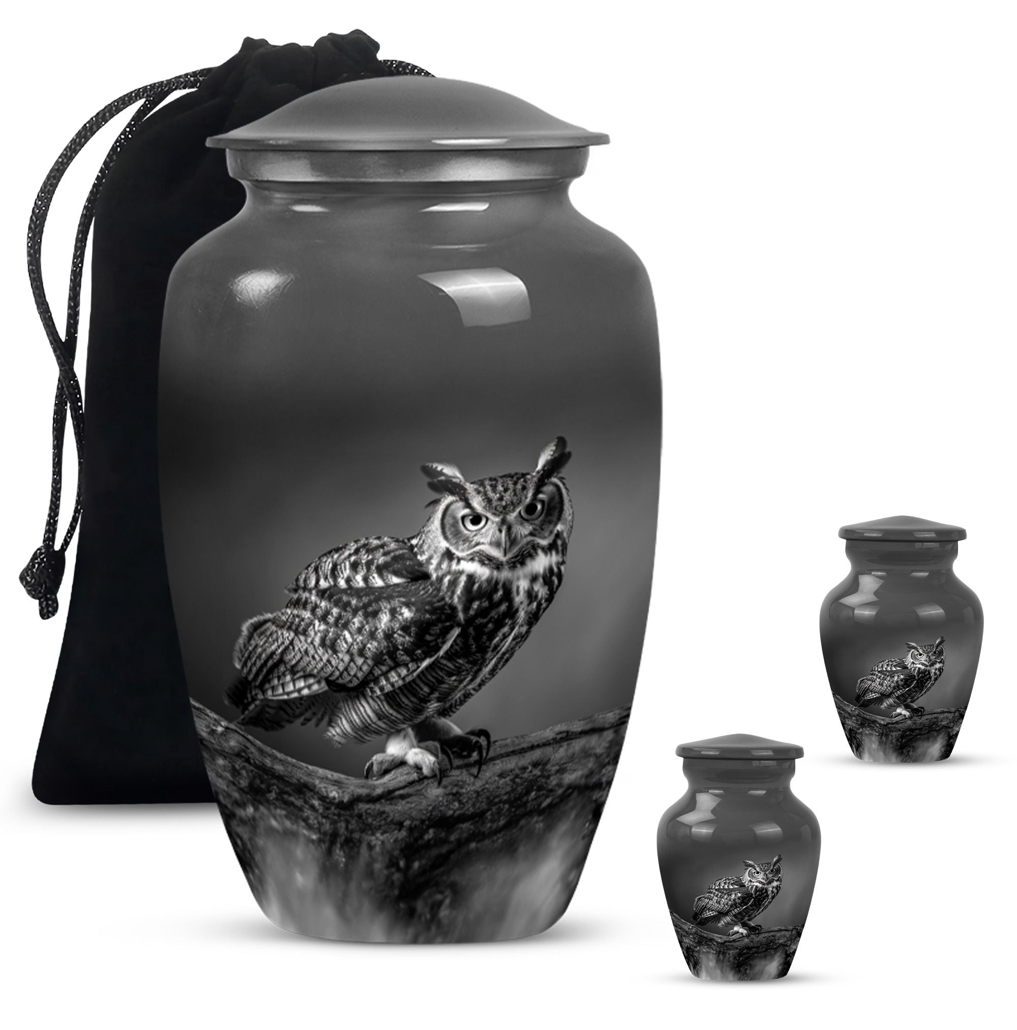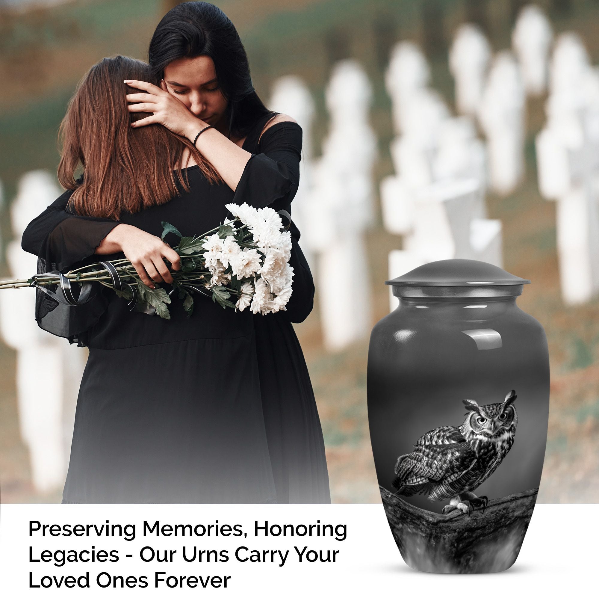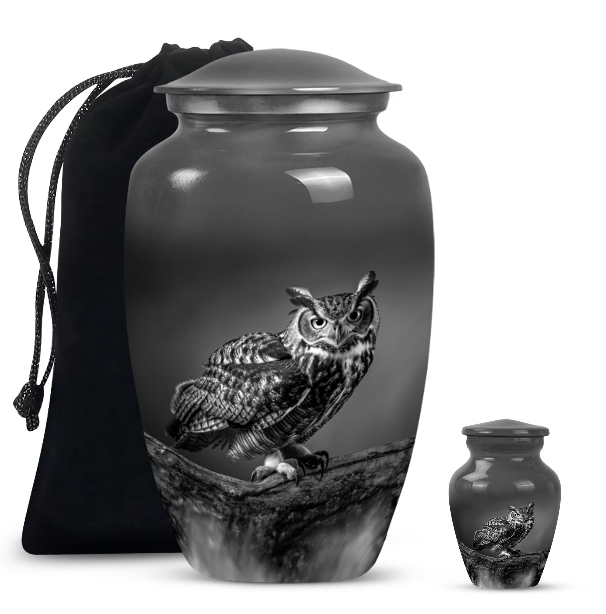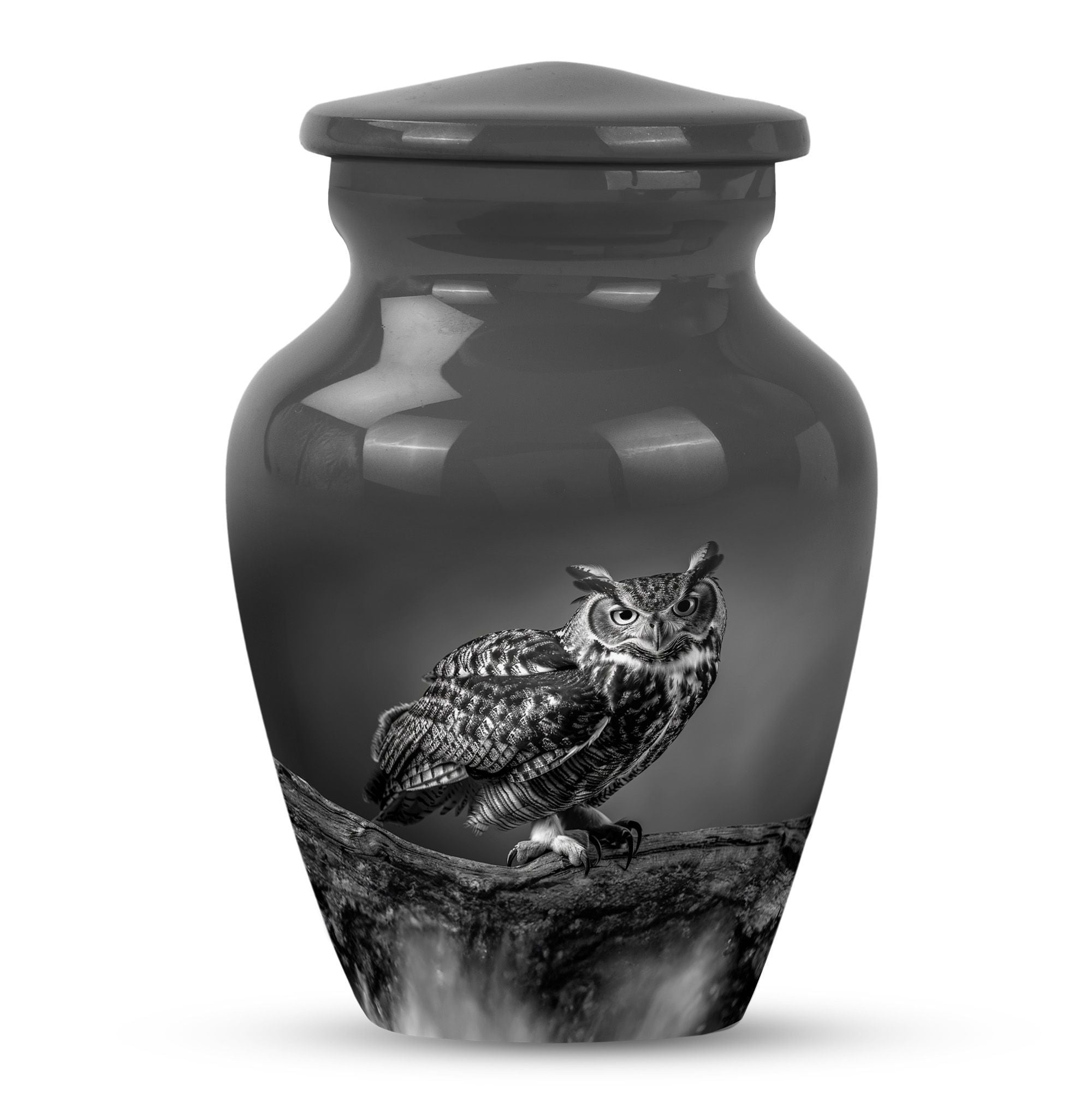 An ode to fond memories and a symbol of everlasting love, this classic Owl Urn serves as a poignant memorial urn for male adults. Its elegant 10-inch size and 3.3 pounds of exquisite aluminum craftsmanship offer a respectful and dignified choice when selecting an urn for your loved one. Every aspect of this piece, from its abstract theme to its large capacity of 200 cubic inches, speaks of its top-tier quality. Customization options adorn this urn, offering space for personalized engraved names, making it truly unique and sentimental. The package also includes a rich velvet pouch that serves to contain the ashes with reverence and care. Whether you are seeking female urns or companion urns, this cremation urn effortlessly encapsulates the essence of memorabilia with its well-thought-out design. Larger than average, it provides ample space for ashes, making it a fitting choice for a large metal urn. Transcending ordinary descriptions, this owl urn serves as more than a mere memorial product; it's a vessel for treasured memories, loving sentiments, and a celebration of a life well-lived.