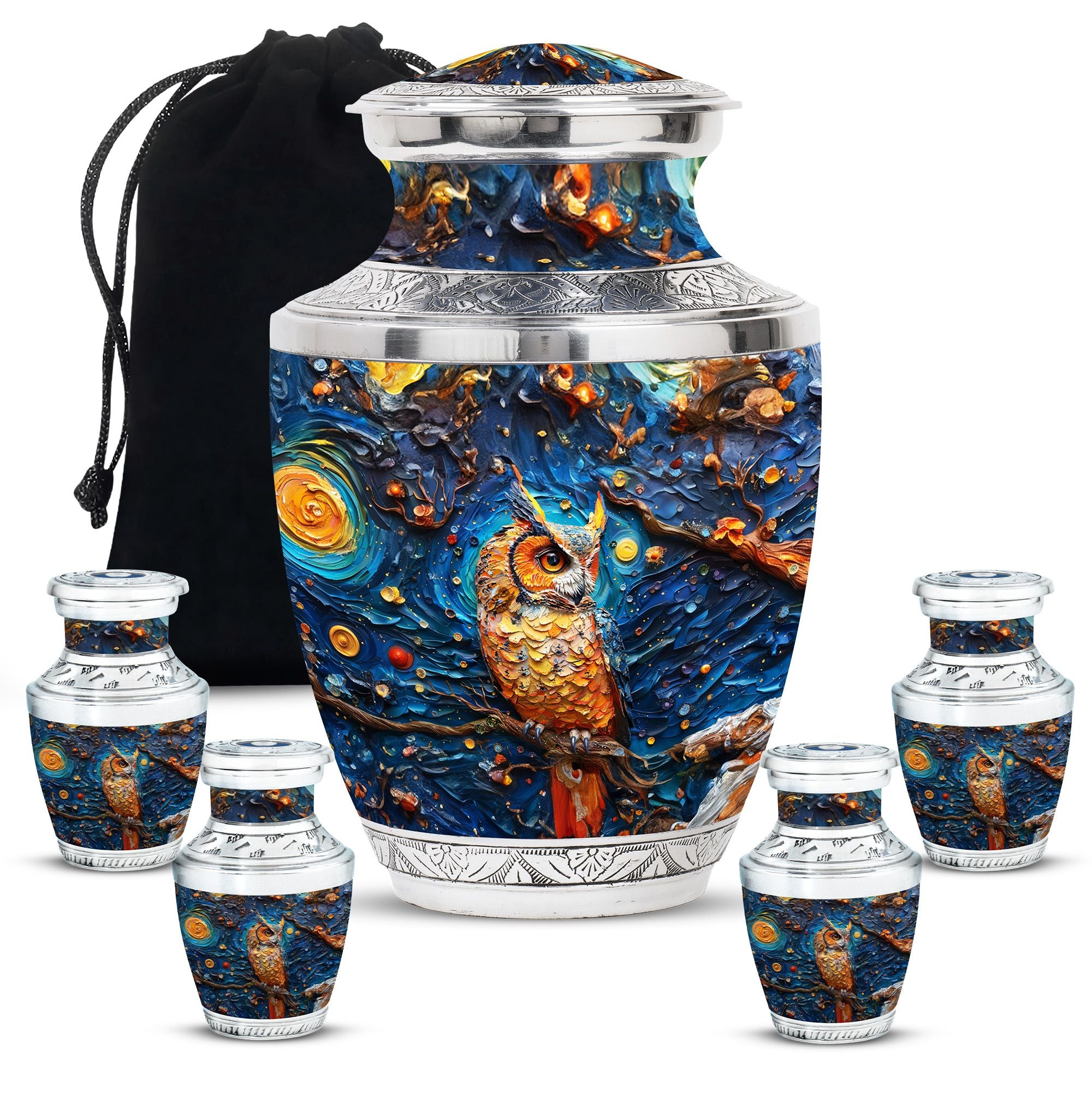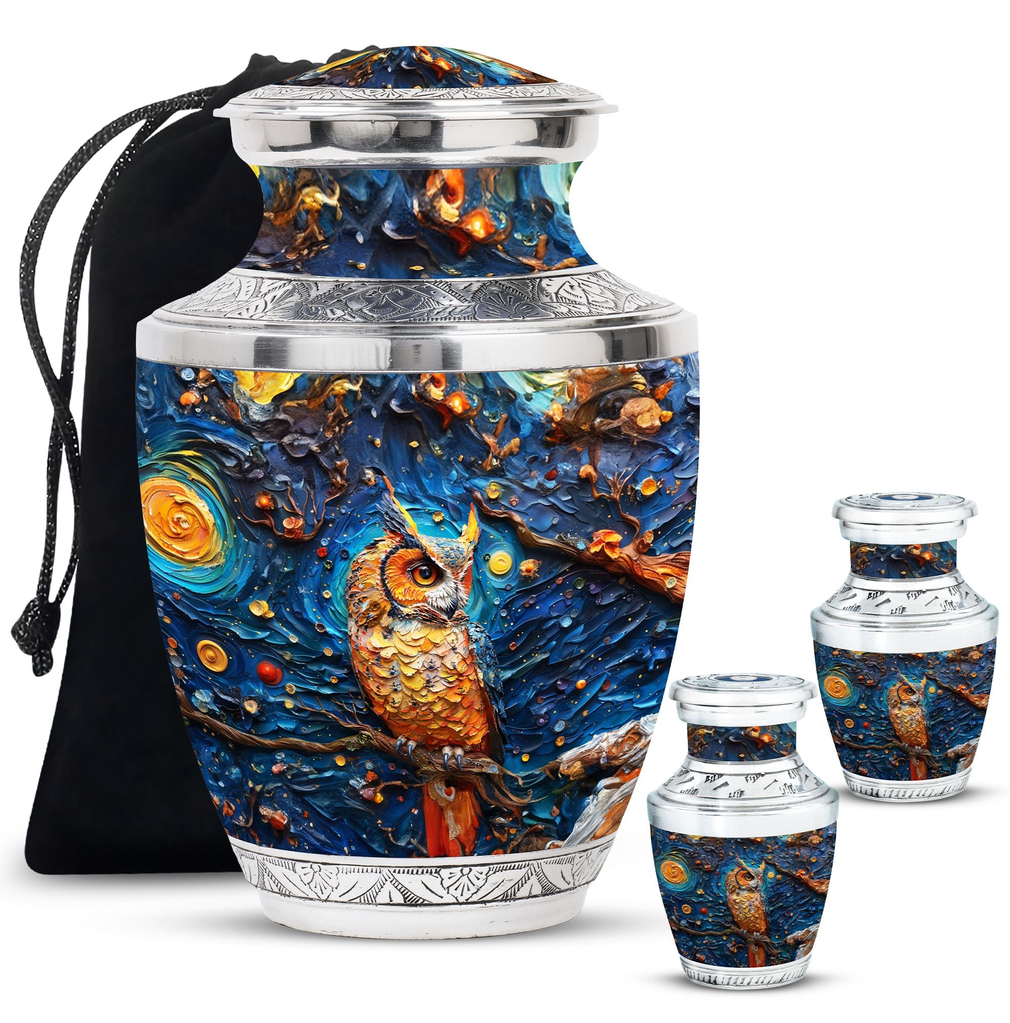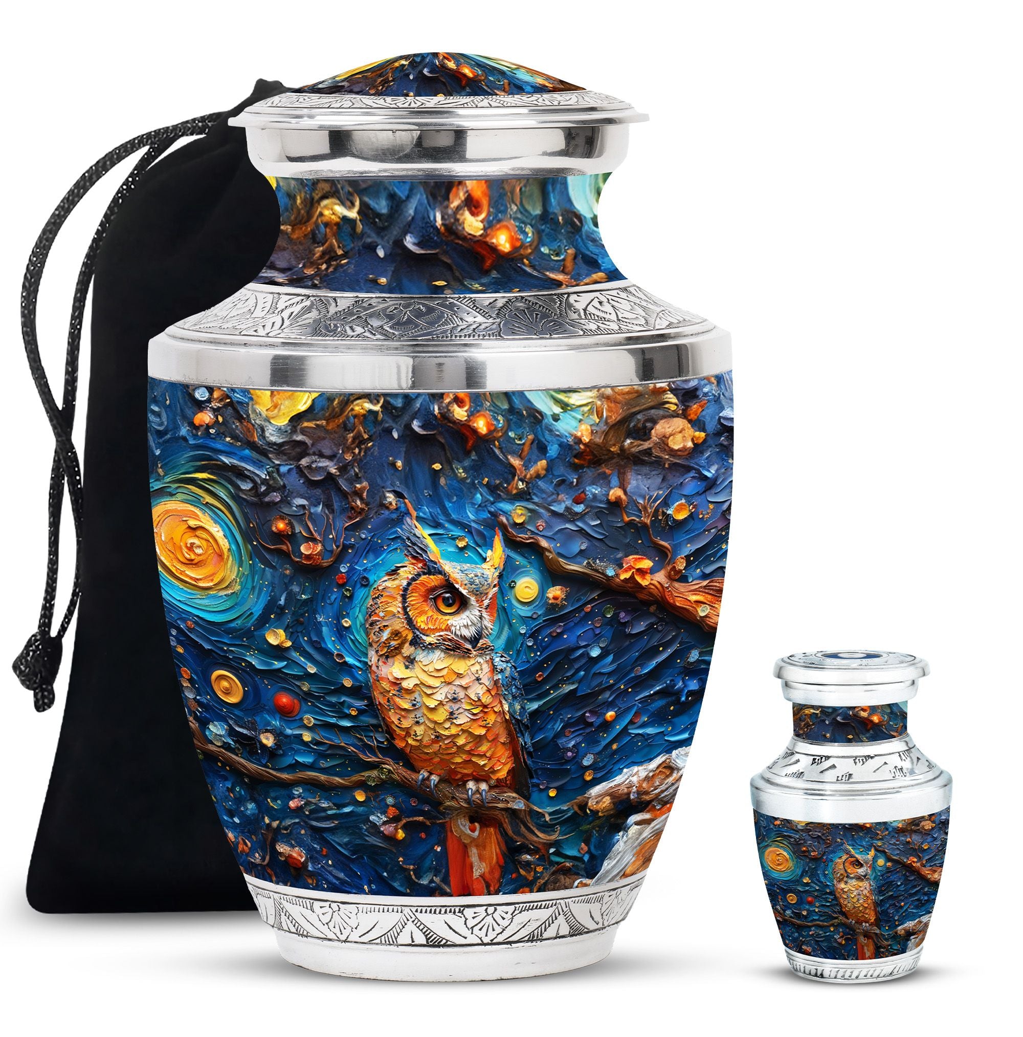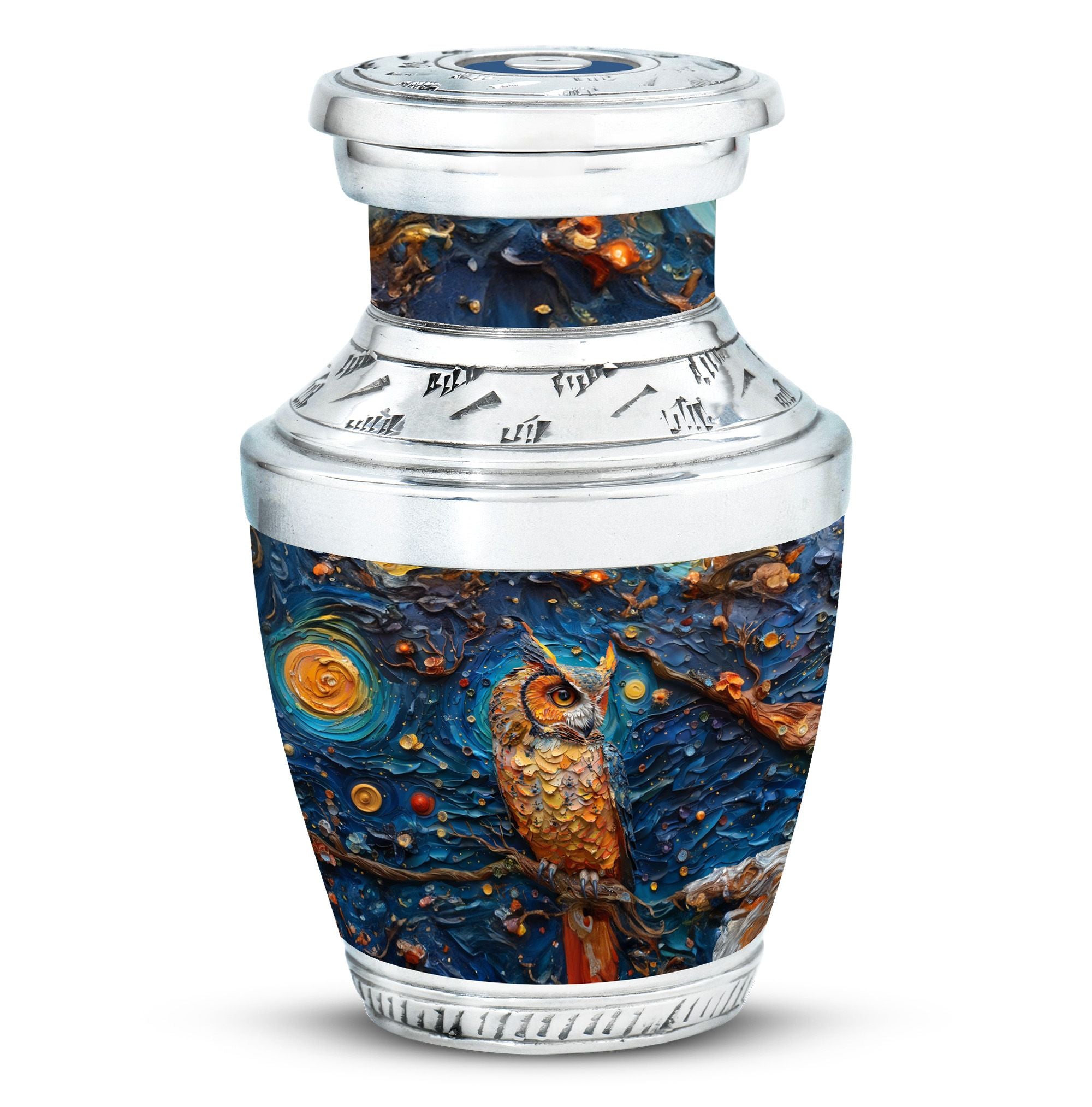 Crafted from high-quality aluminum, this urn blends artistry with durability. The intricate owl motif symbolizes guidance and protection, while the smooth finish ensures it looks elegant in any setting. Designed as both a funeral urn for women and a meaningful urn for men & women, this piece serves as a versatile memorial. Its secure screw-top lid keeps ashes safe, and its size makes it suitable for use as a large urn for human ashes or as part of a family memorial display with mini small urns for men or mini urns for ashes for women.