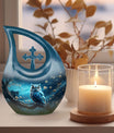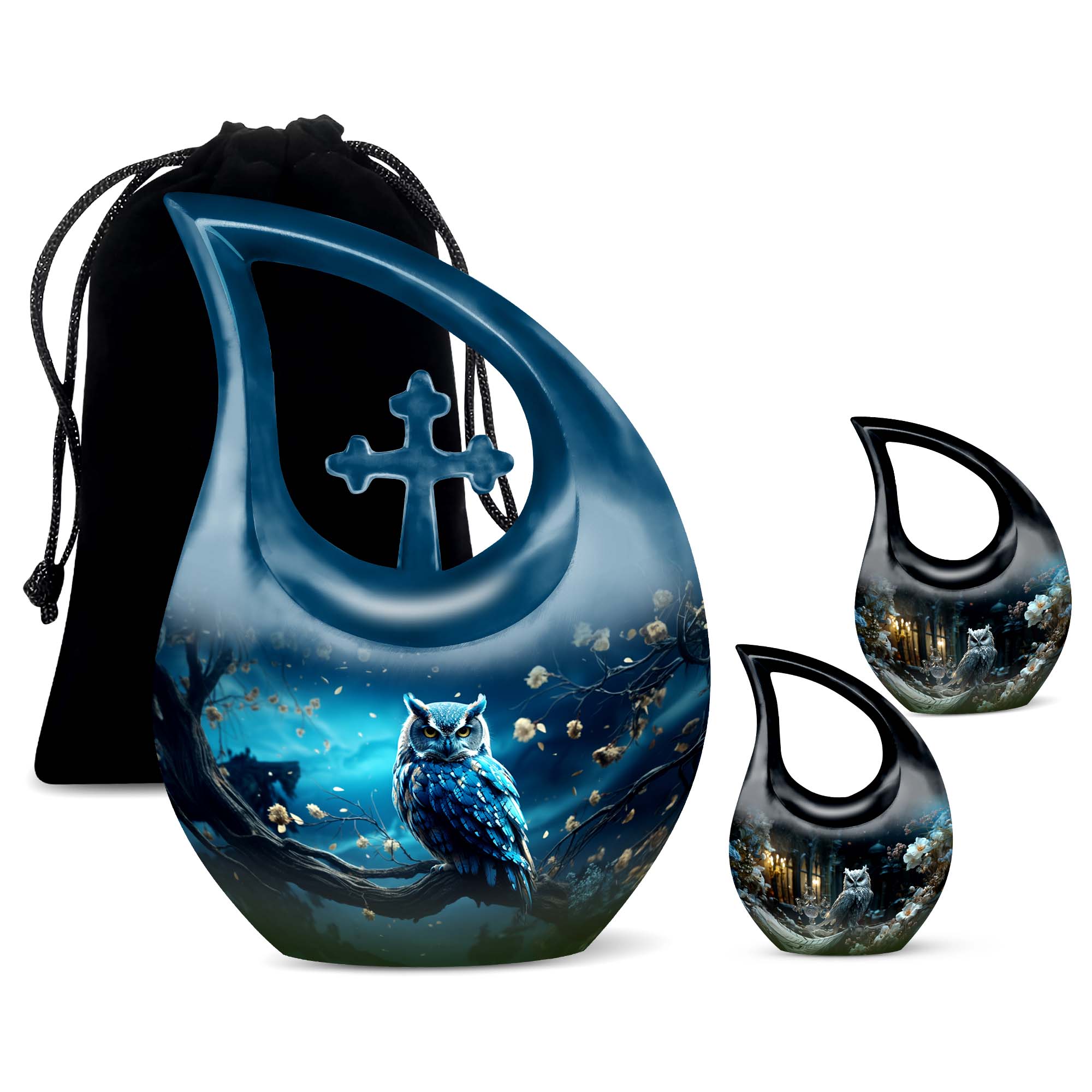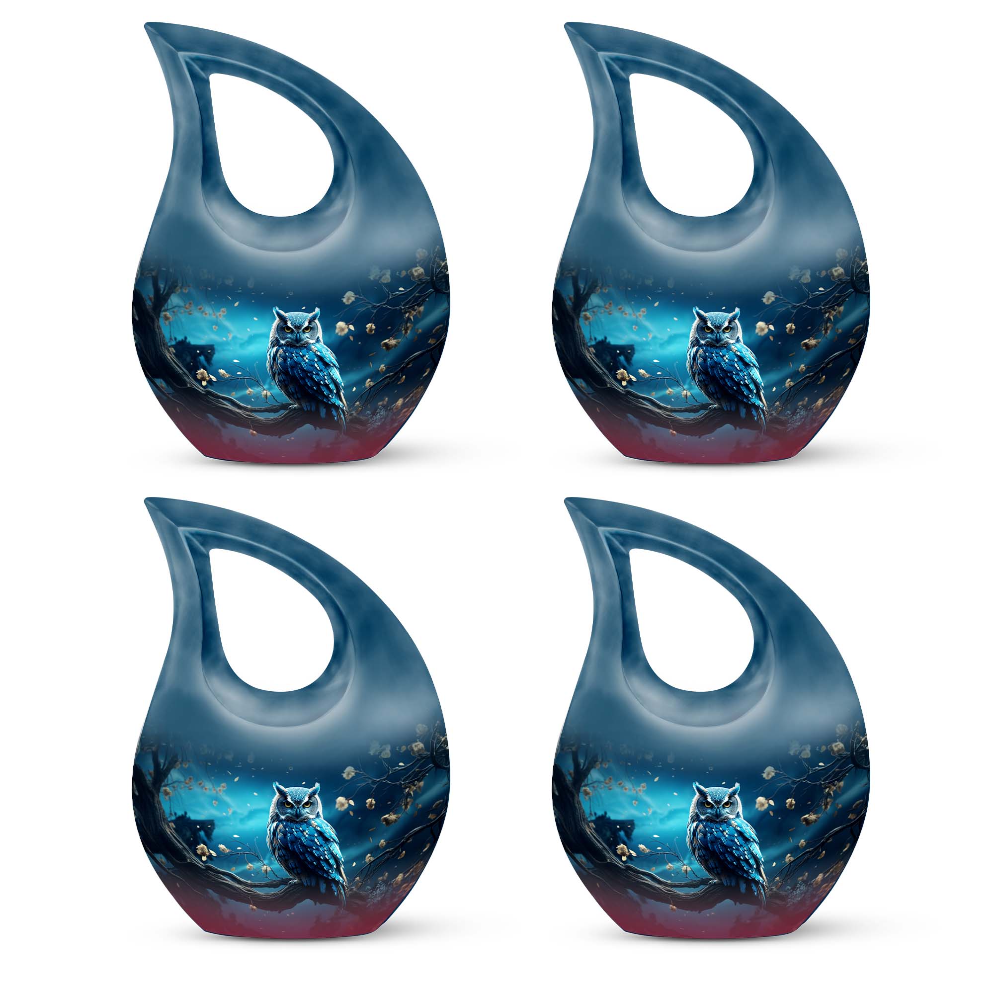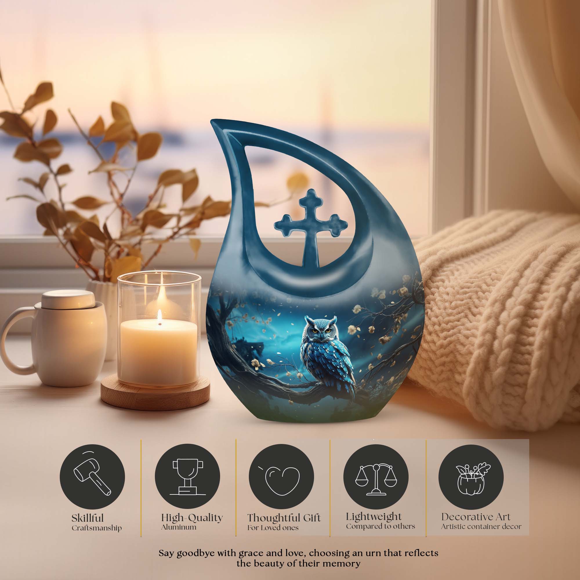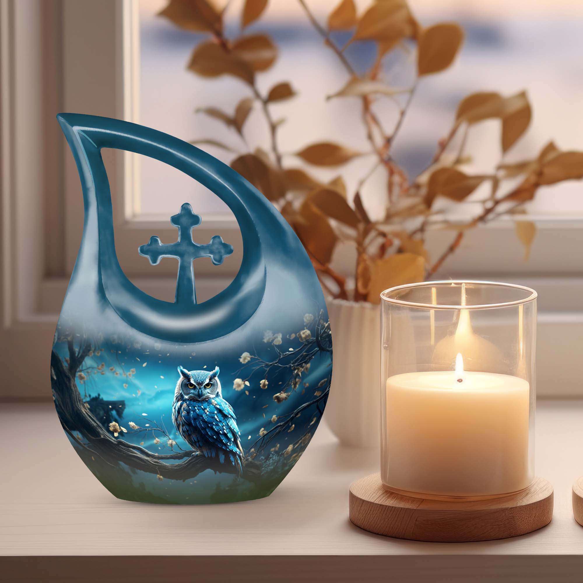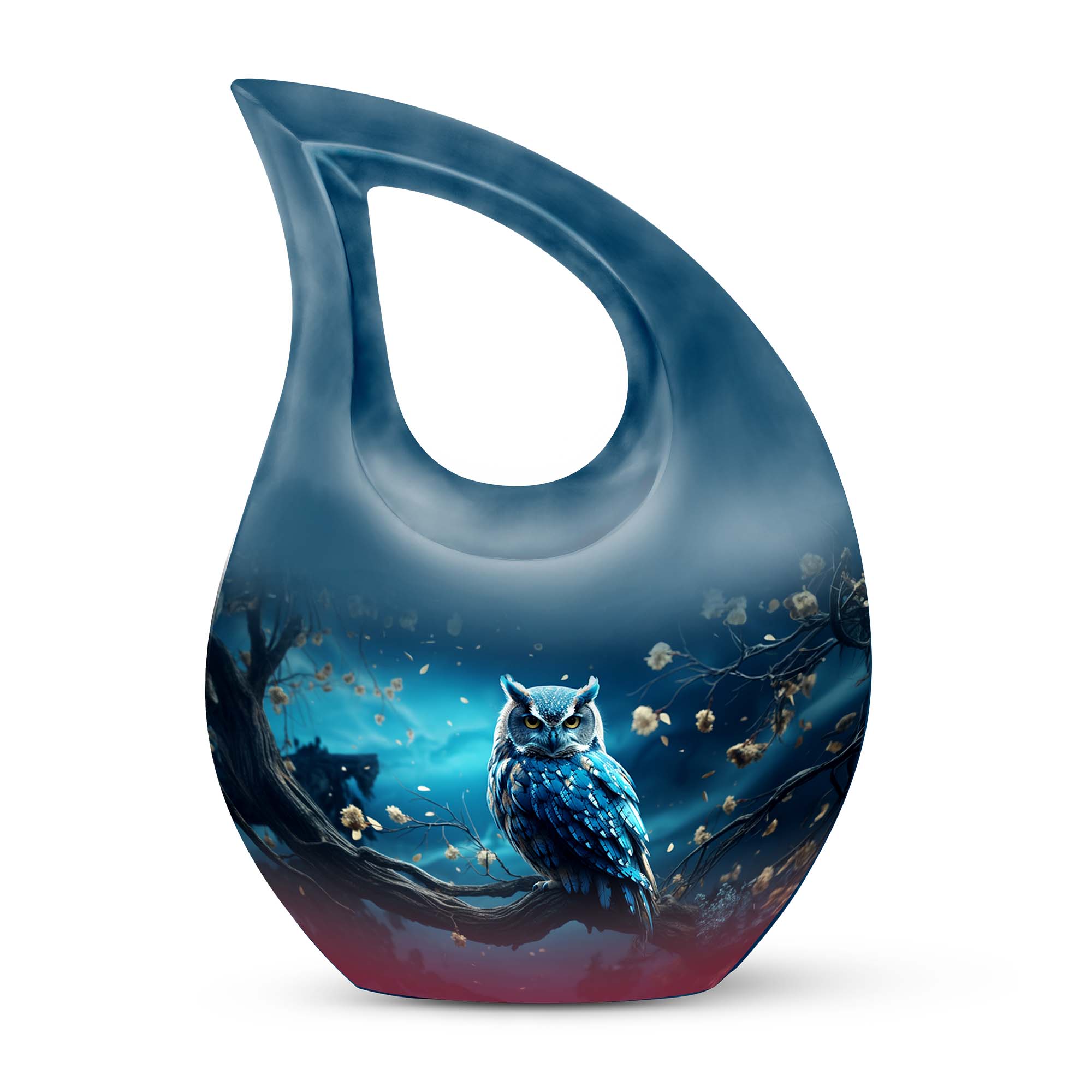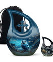 Expertly handcrafted from high-quality aluminum, this large decorative urn for human ashes showcases a deep blue night motif adorned with a majestic owl, symbolizing guidance and protection. The smooth finish and graceful shape make it suitable as both cremation urns for men and cremation urns for women, offering a perfect balance of strength and serenity. Ideal for home display or as a funeral urn for adult ashes men, it captures timeless beauty and peace.