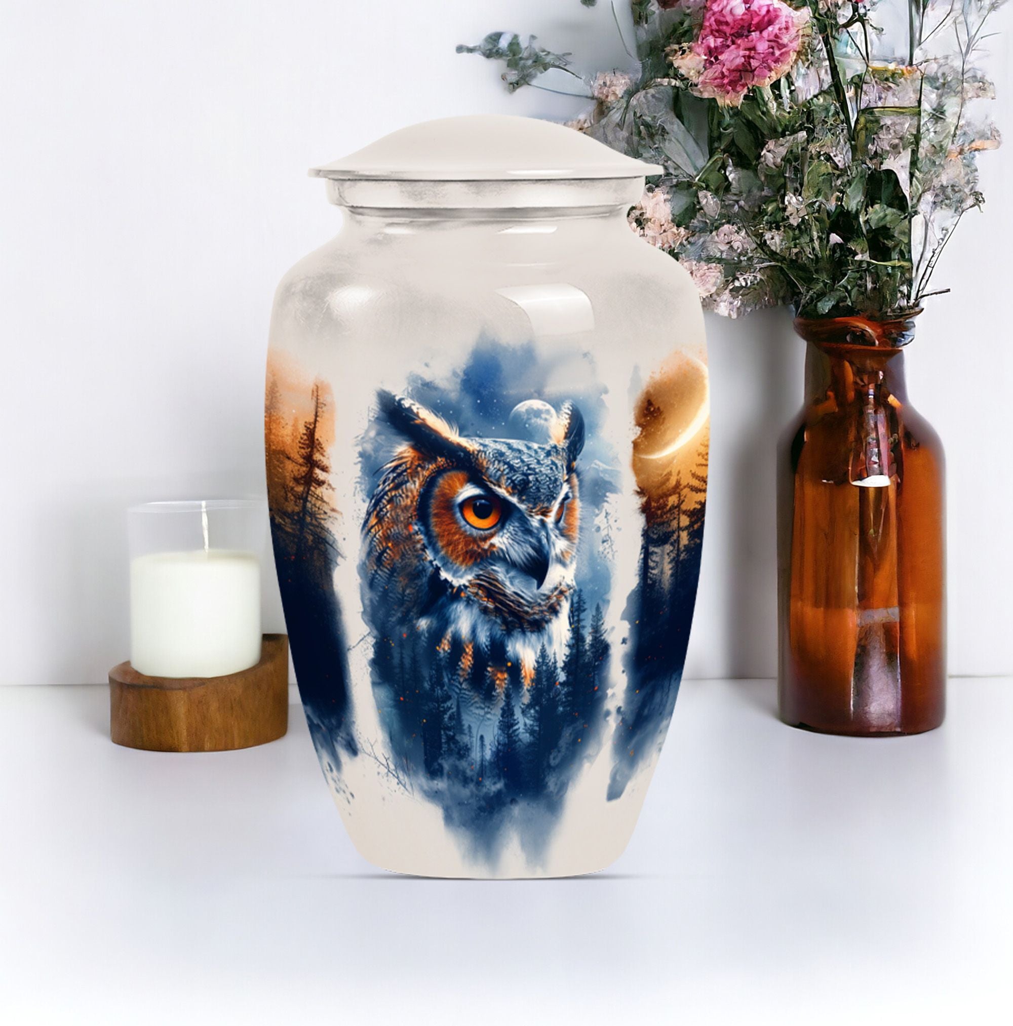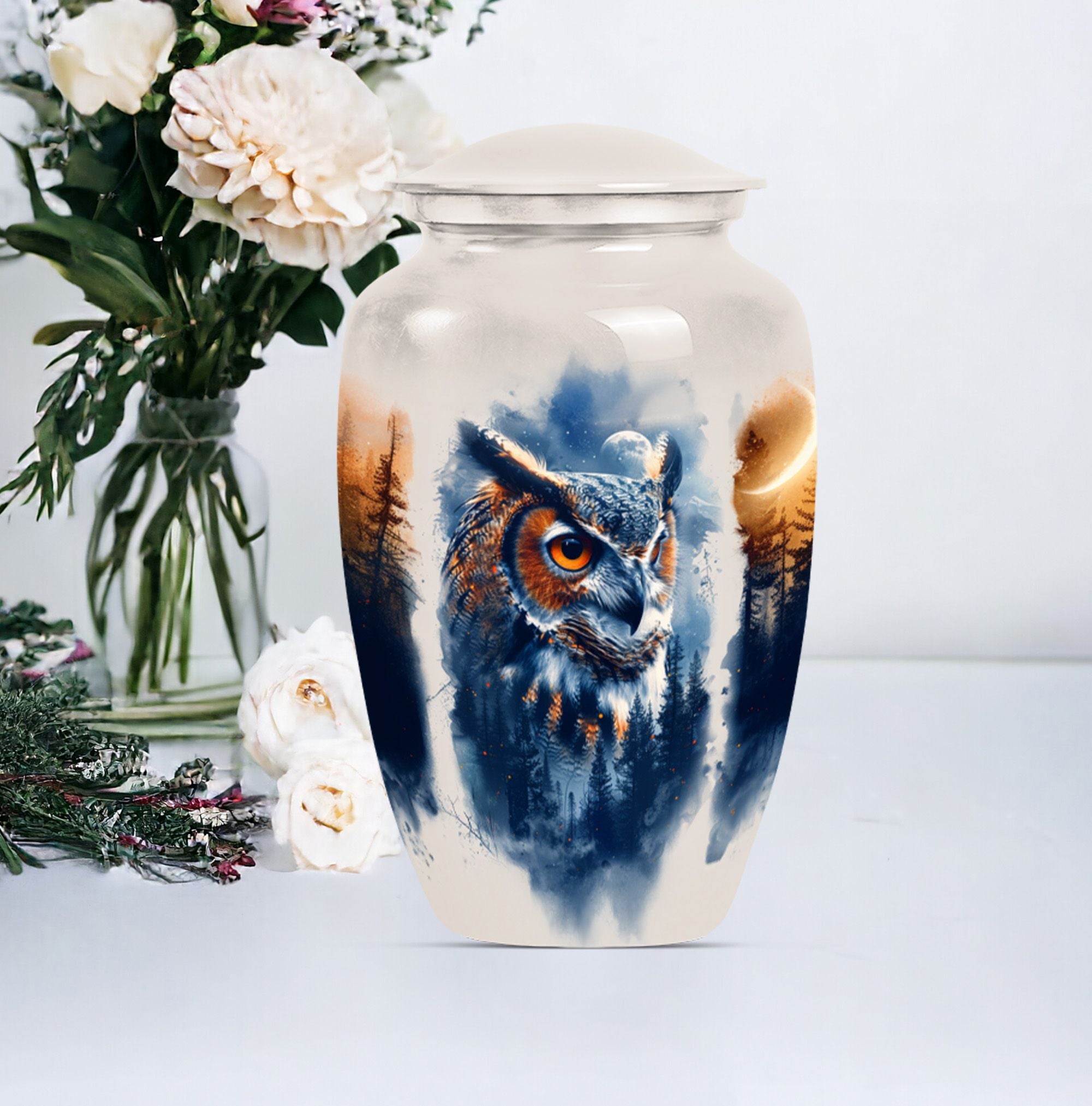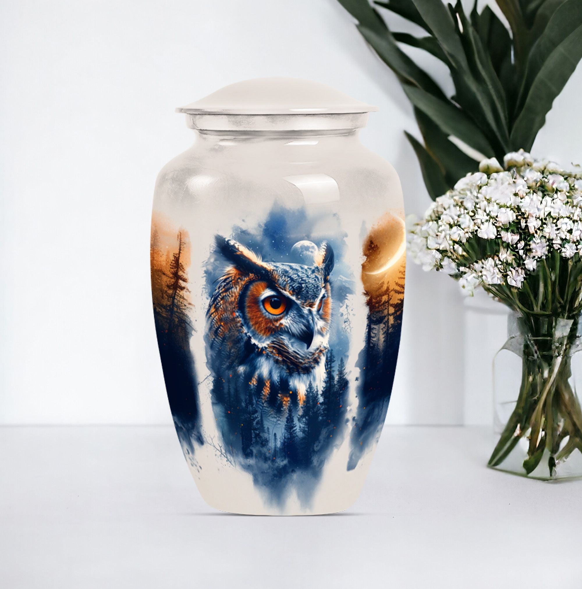 Discover an elegant and lasting homage to your loved one with our 10-inch Owl Cremation Urn, crafted from durable aluminium. This unique urn for ashes masterfully combines functionality with artistry, featuring a captivating design theme of a Wolf Howling. Weighing at 3.3 pounds and offering a generous capacity of 200 cubic inches, it is the ideal keepsake for treasuring those precious memories. The type of Large urns caters to a wider volume requirement - a perfect choice when opting for burial urn for cremation. What’s more, you can even personalize it with engraved names, adding an intimate touch to this significant memorial item. With our classic owl urn, your honouring ceremony will take on a more soulful and poignant meaning. It comes with a velvet pouch for protective containment of ashes, ensuring both ease of use and respectability. As a bonus, it can also serve as a multipurpose urn with a photo frame, furthering its cherished status. Step away from generic funeral urns for adult ashes women, and embrace the symbolism of our Owl Urn, where every detail speaks of love and remembrance.