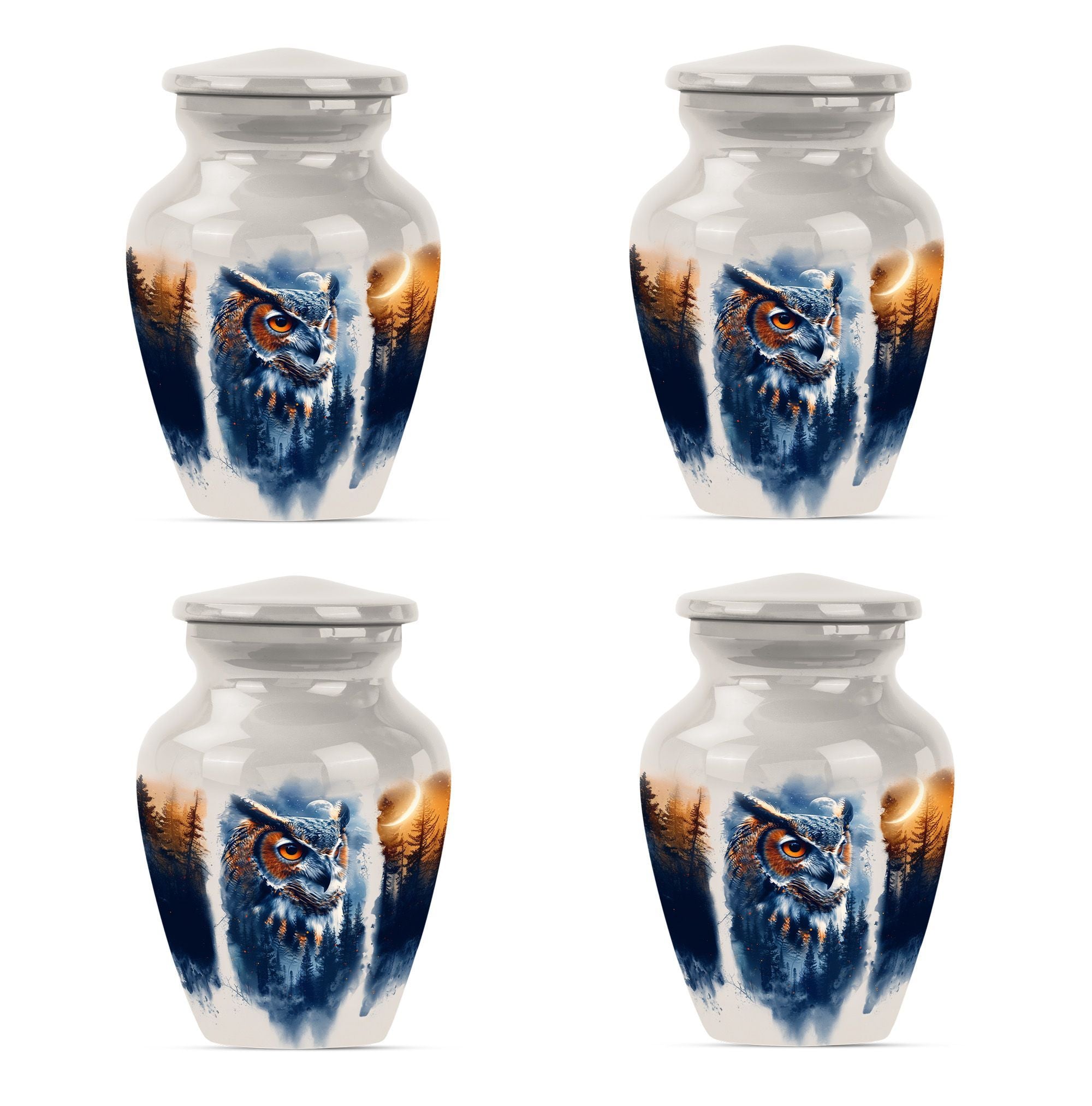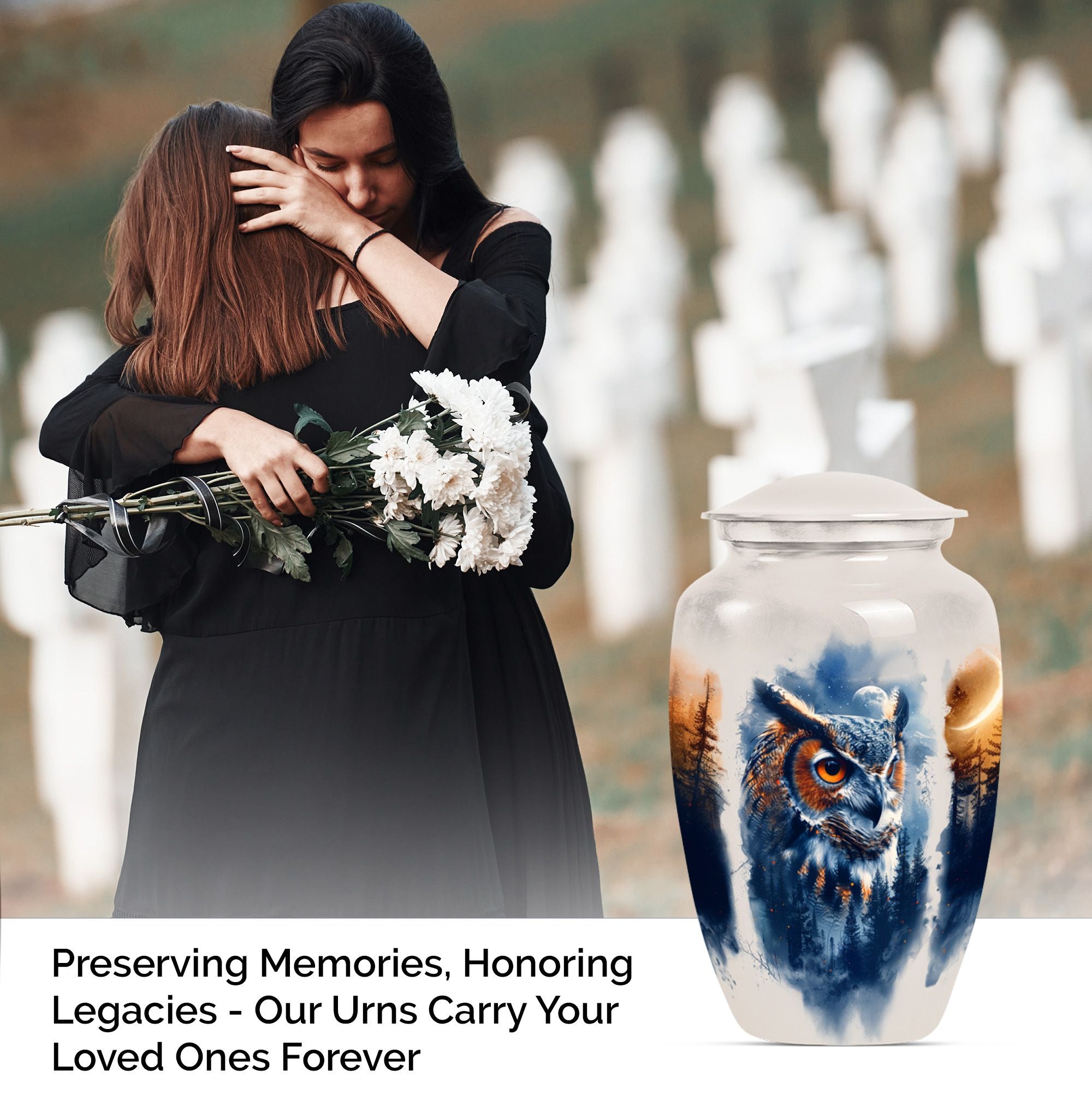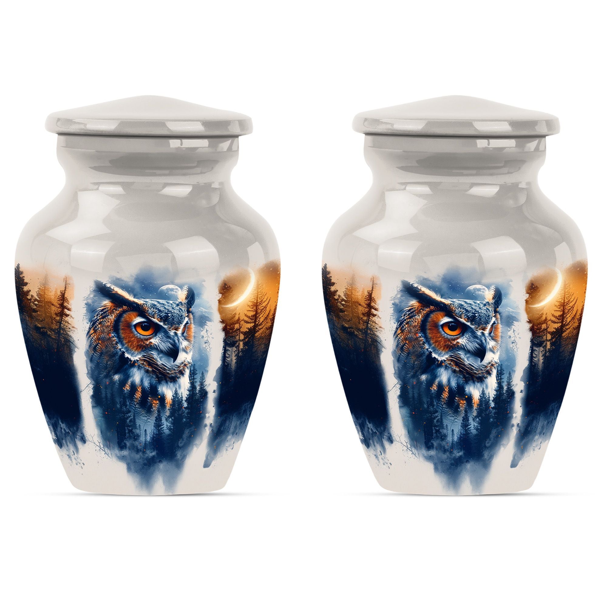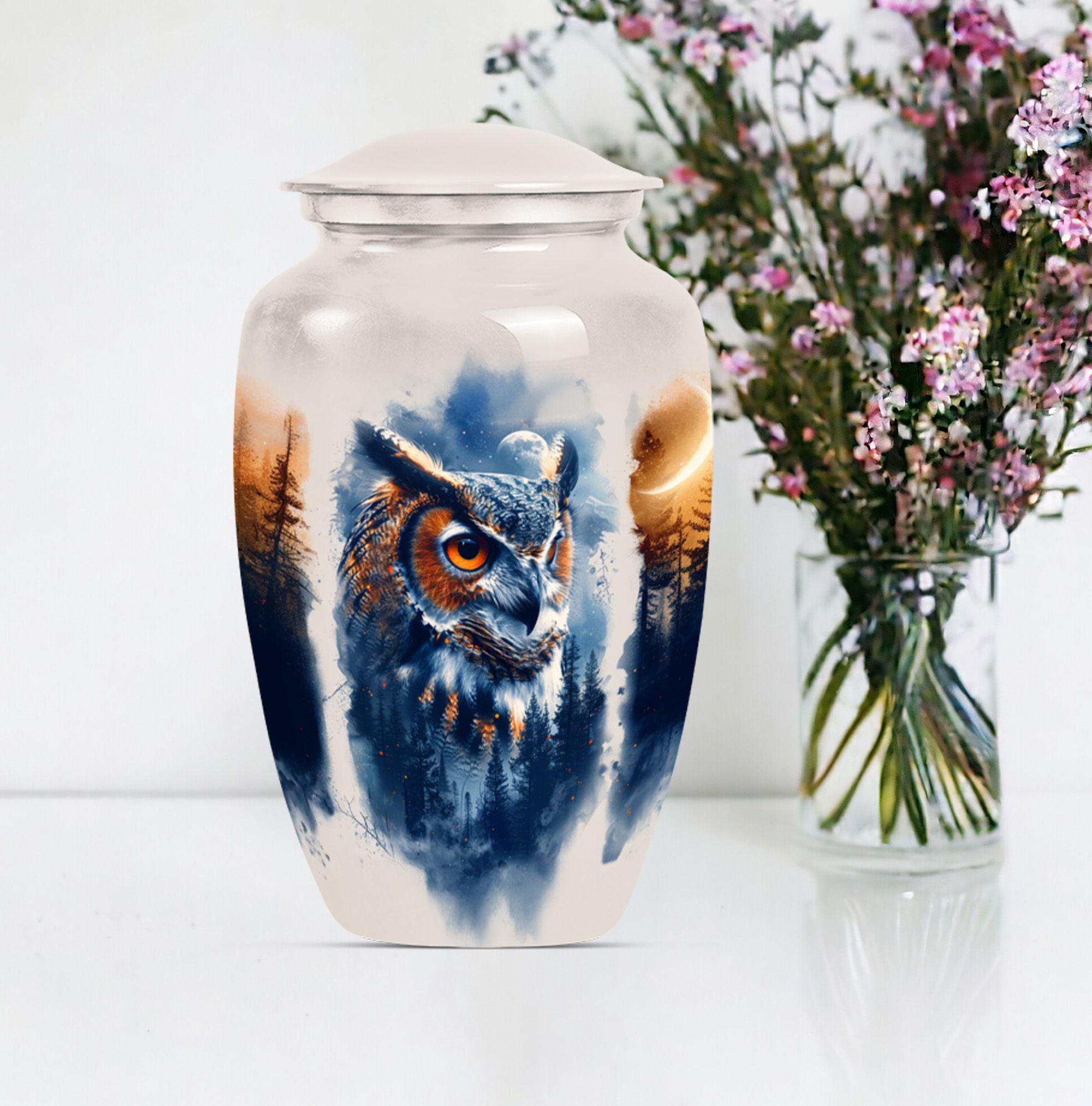 Discover an elegant and lasting homage to your loved one with our 10-inch Owl Cremation Urn, crafted from durable aluminium. This unique urn for ashes masterfully combines functionality with artistry, featuring a captivating design theme of a Wolf Howling. Weighing at 3.3 pounds and offering a generous capacity of 200 cubic inches, it is the ideal keepsake for treasuring those precious memories. The type of Large urns caters to a wider volume requirement - a perfect choice when opting for burial urn for cremation. What’s more, you can even personalize it with engraved names, adding an intimate touch to this significant memorial item. With our classic owl urn, your honouring ceremony will take on a more soulful and poignant meaning. It comes with a velvet pouch for protective containment of ashes, ensuring both ease of use and respectability. As a bonus, it can also serve as a multipurpose urn with a photo frame, furthering its cherished status. Step away from generic funeral urns for adult ashes women, and embrace the symbolism of our Owl Urn, where every detail speaks of love and remembrance.
