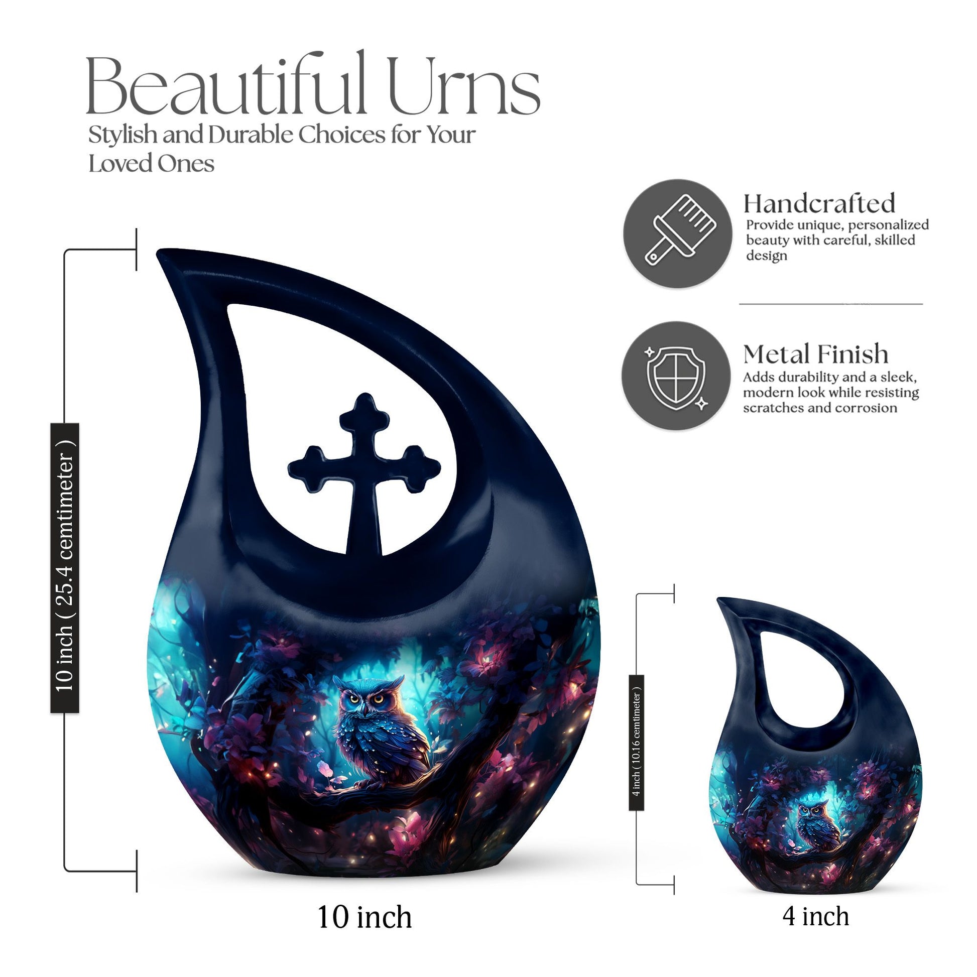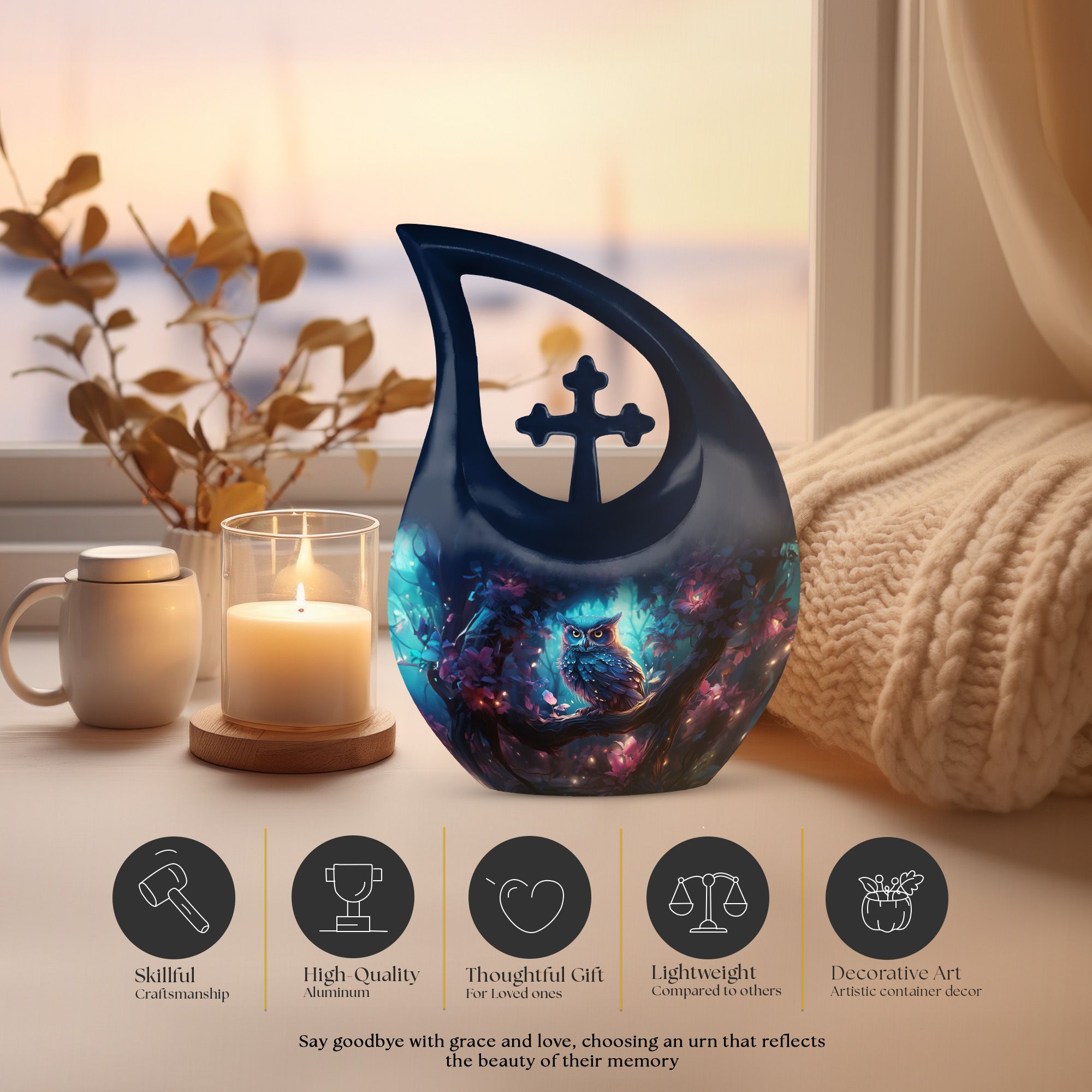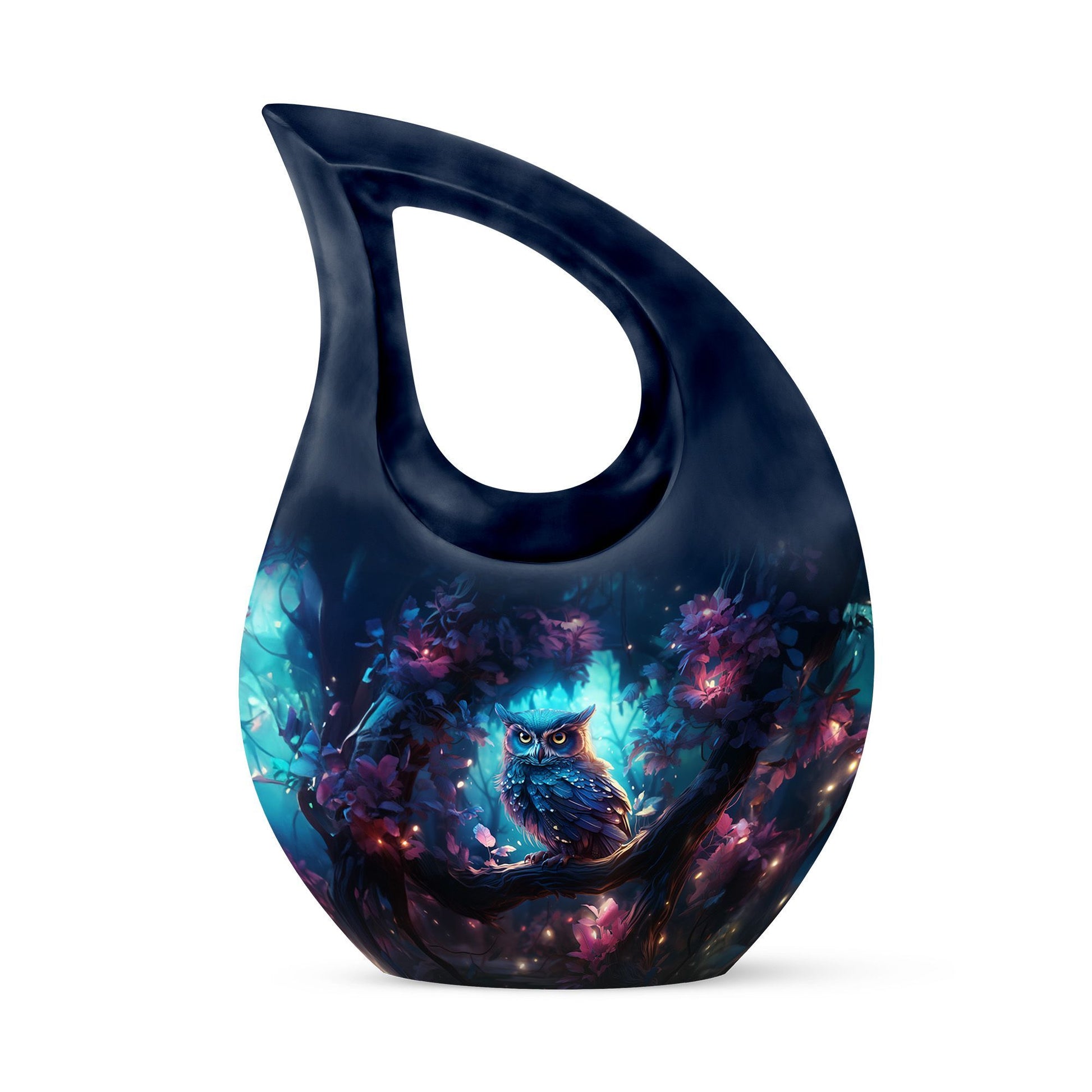 Meticulously handcrafted from durable aluminum, this cremation urn men and cremation urn women design features a deep blue finish with a graceful silver owl engraving, symbolizing intuition, courage, and eternal guidance. The polished teardrop form adds a touch of elegance, while the secure screw-top lid ensures ashes are kept safely and respectfully. Ideal for display or burial, it’s a dignified burial urn men or burial urn for ashes for women.