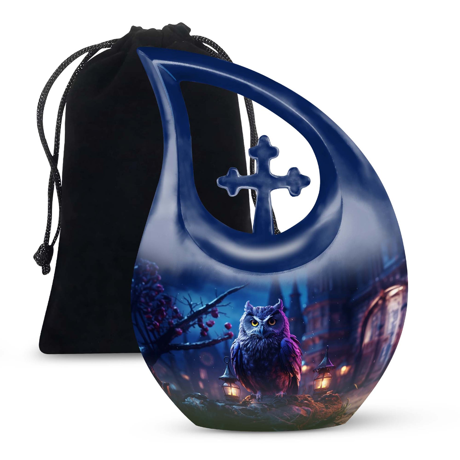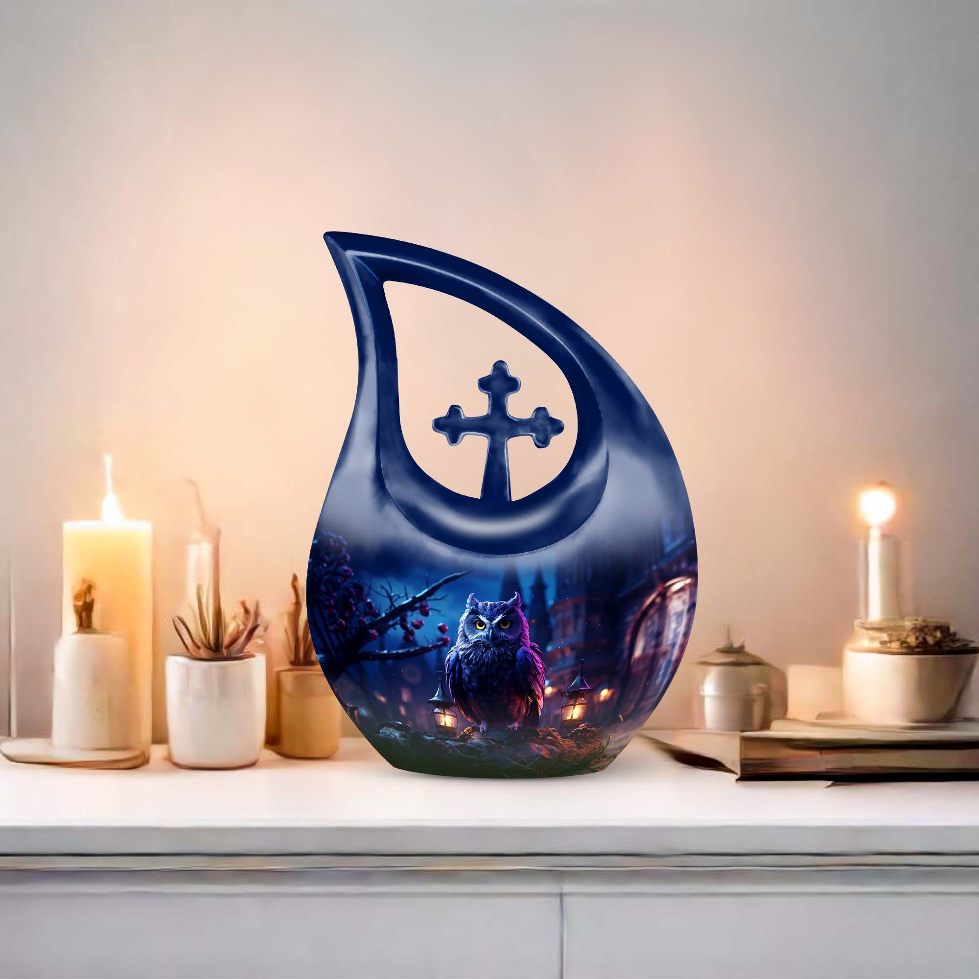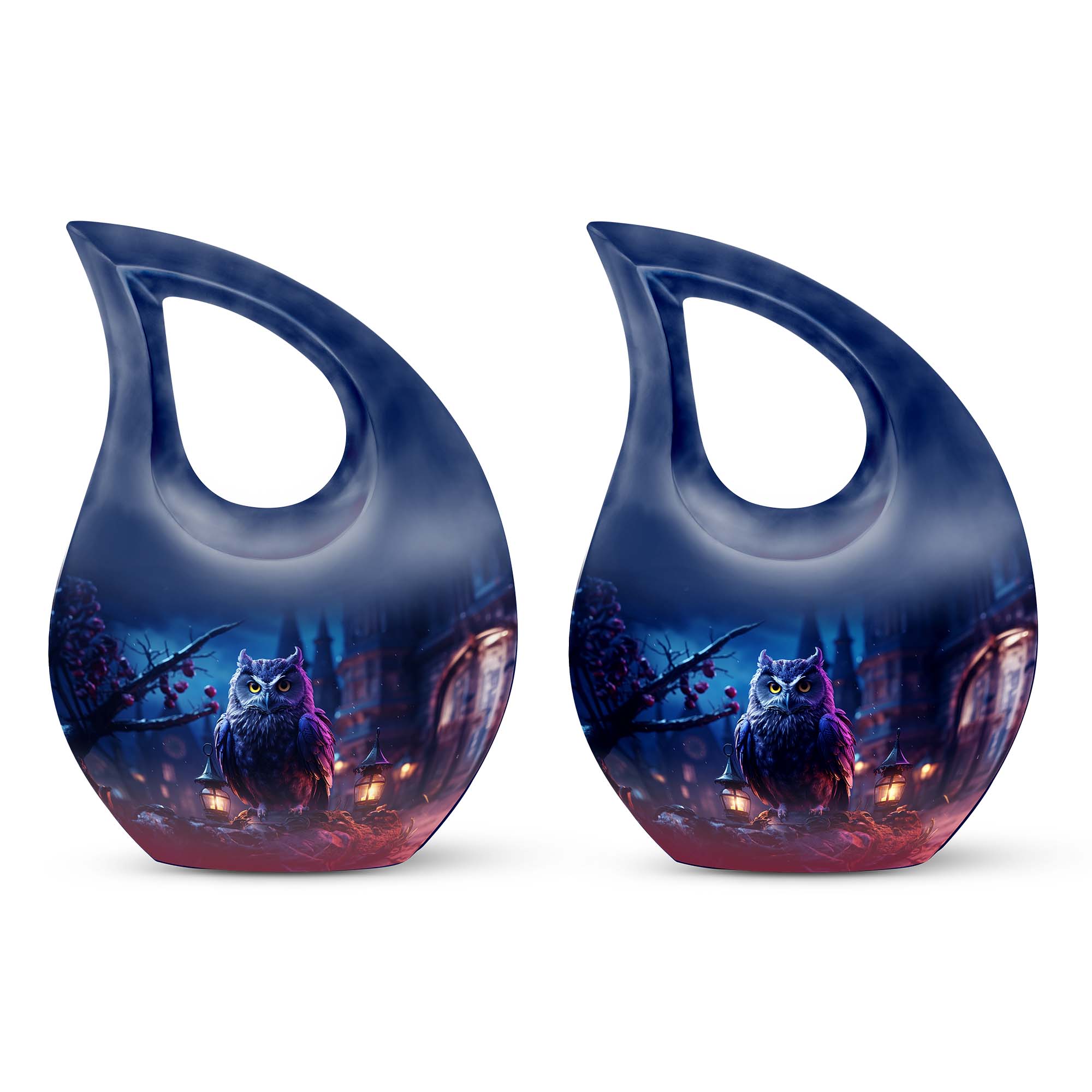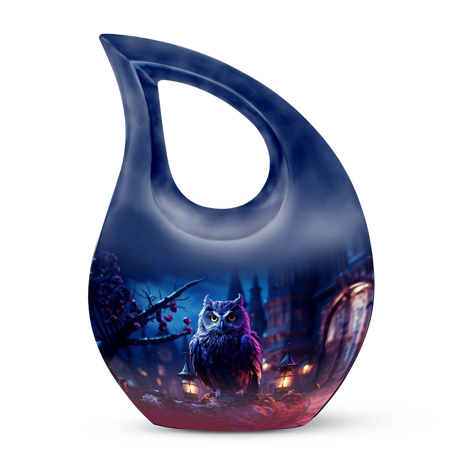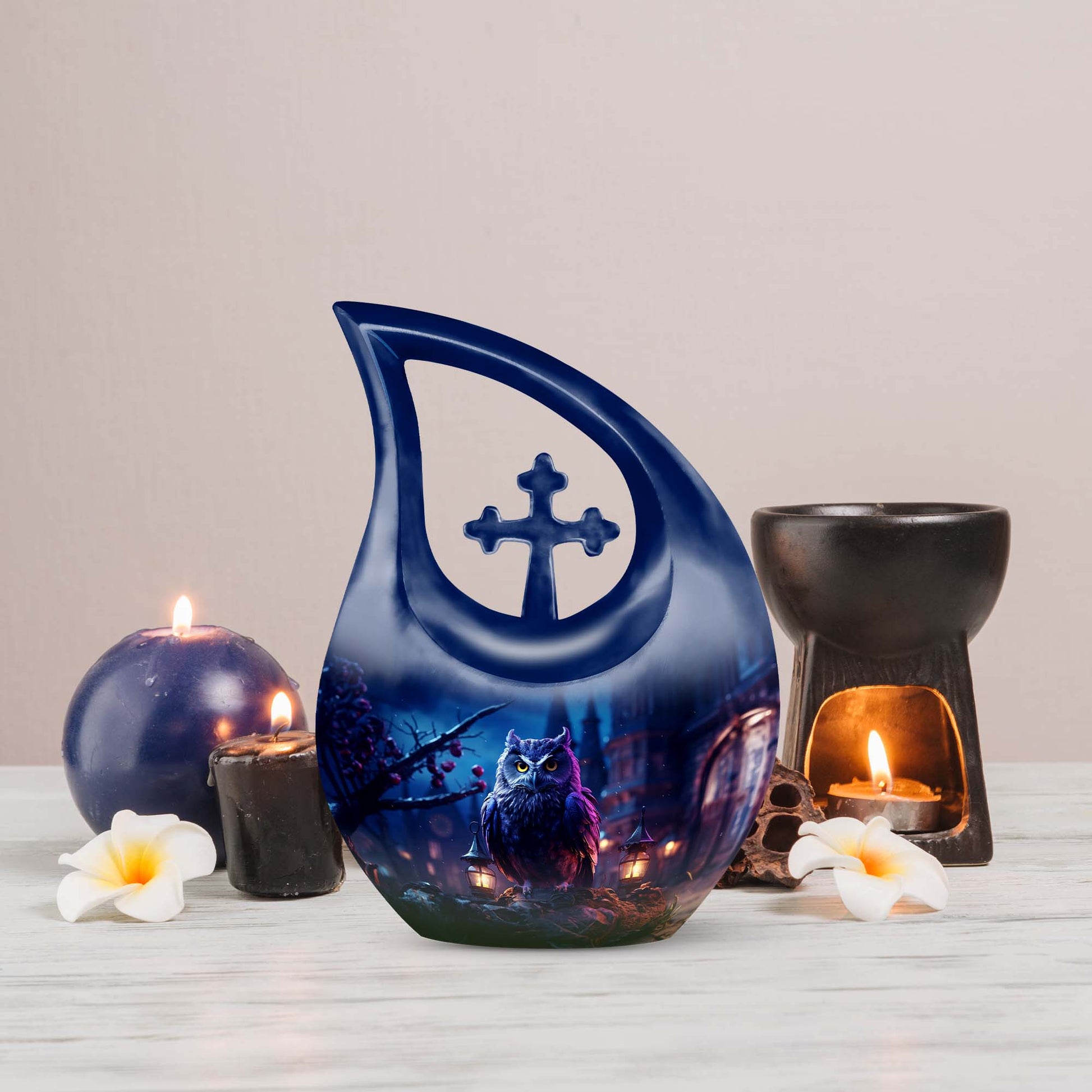 Meticulously crafted from high-quality aluminum, this cremation urn large features an elegant night owl motif surrounded by deep, soothing tones that evoke strength and tranquility. Ideal for both men and women, this large decorative urn seamlessly blends artistry and reverence. Designed for durability and beauty, it stands as one of the most distinctive cremation urns large adult families can cherish for generations.