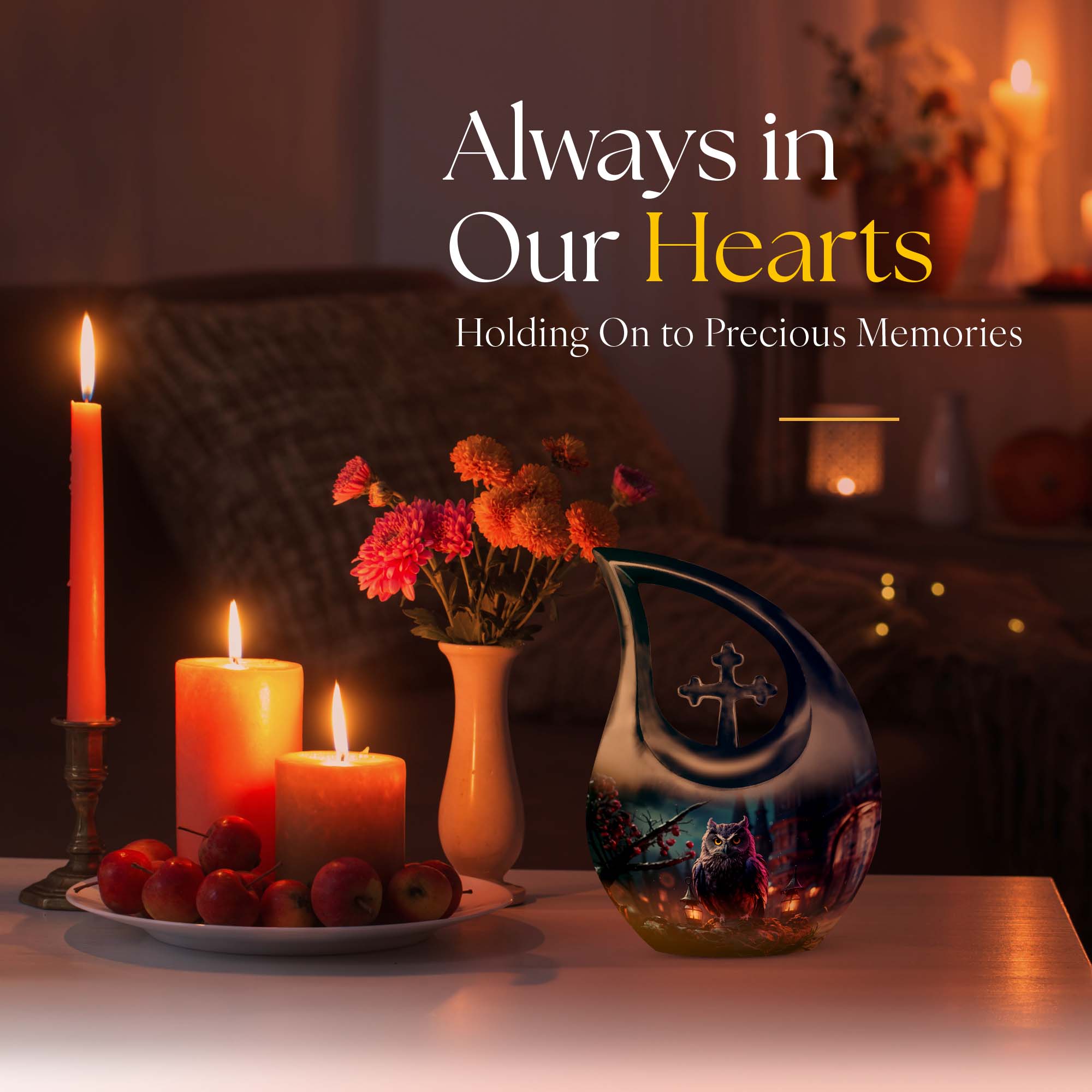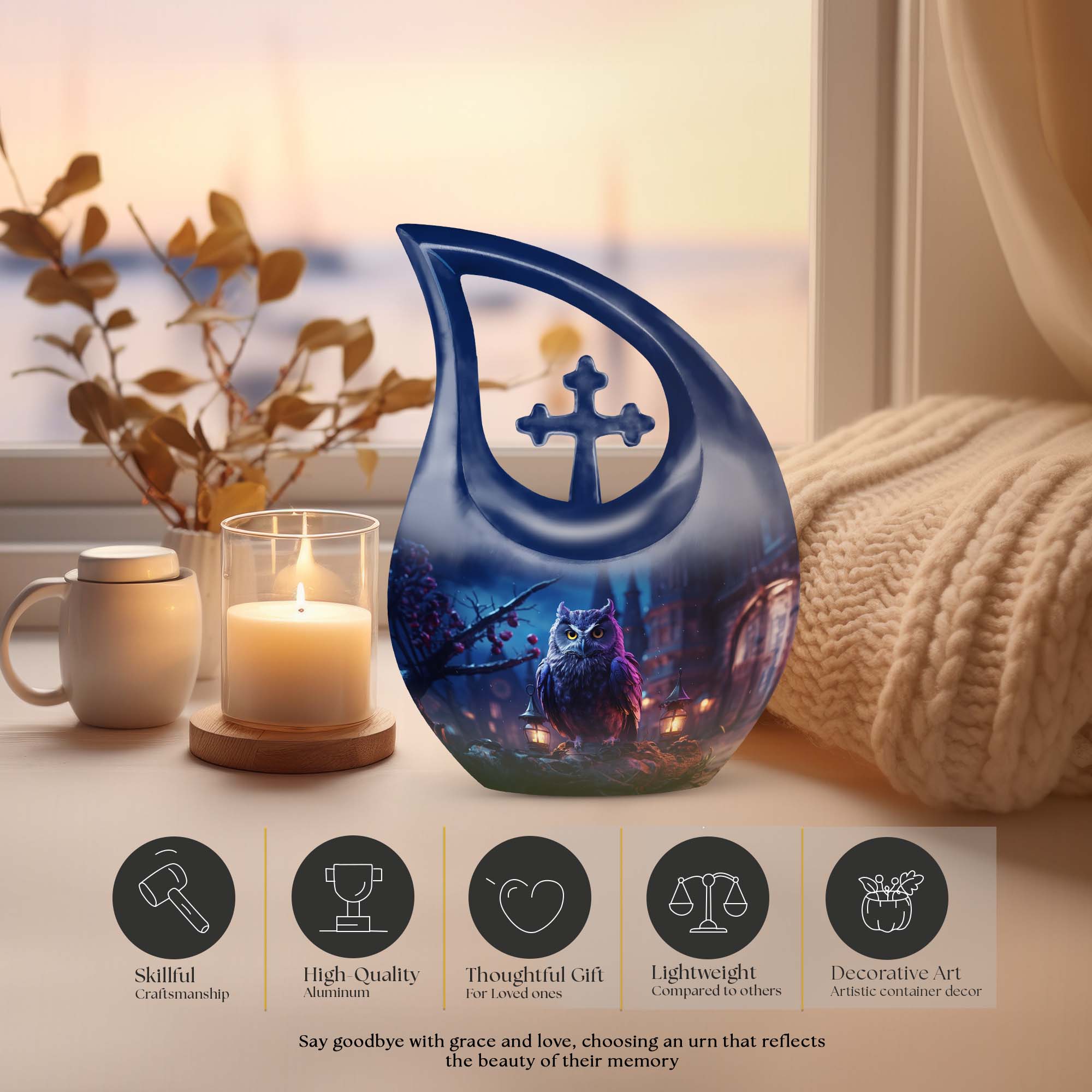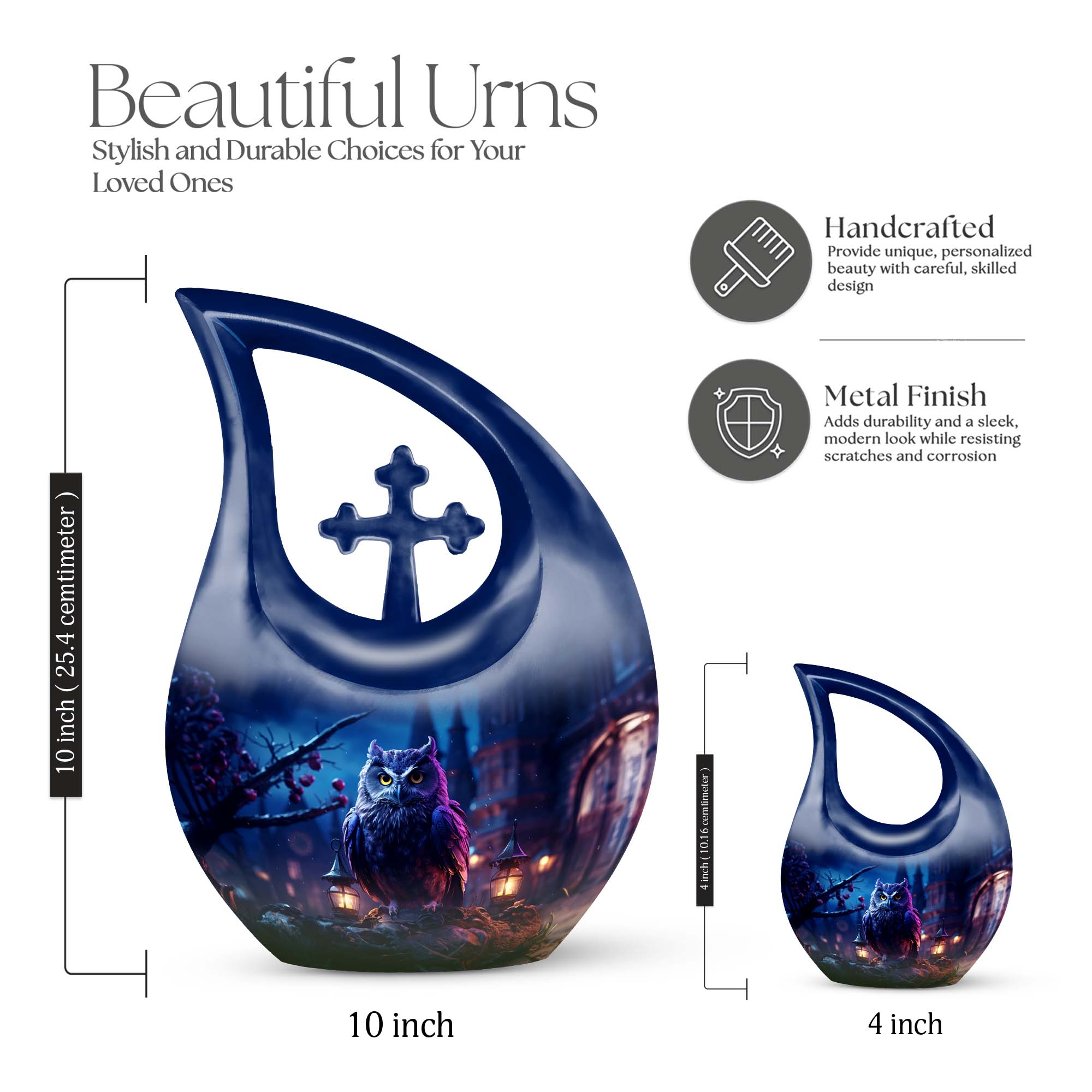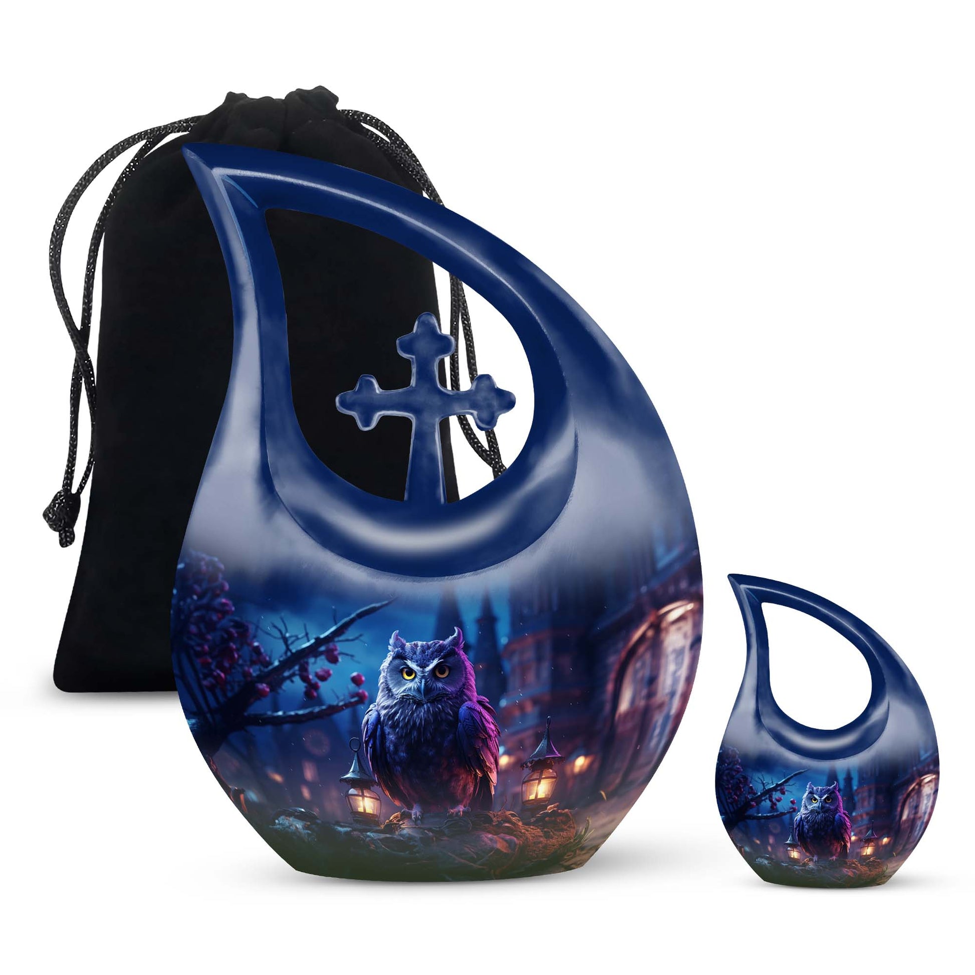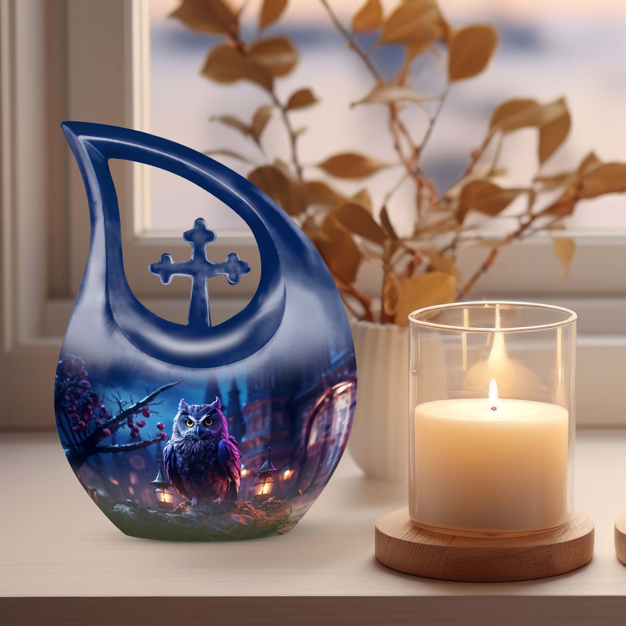 Meticulously crafted from high-quality aluminum, this cremation urn large features an elegant night owl motif surrounded by deep, soothing tones that evoke strength and tranquility. Ideal for both men and women, this large decorative urn seamlessly blends artistry and reverence. Designed for durability and beauty, it stands as one of the most distinctive cremation urns large adult families can cherish for generations.