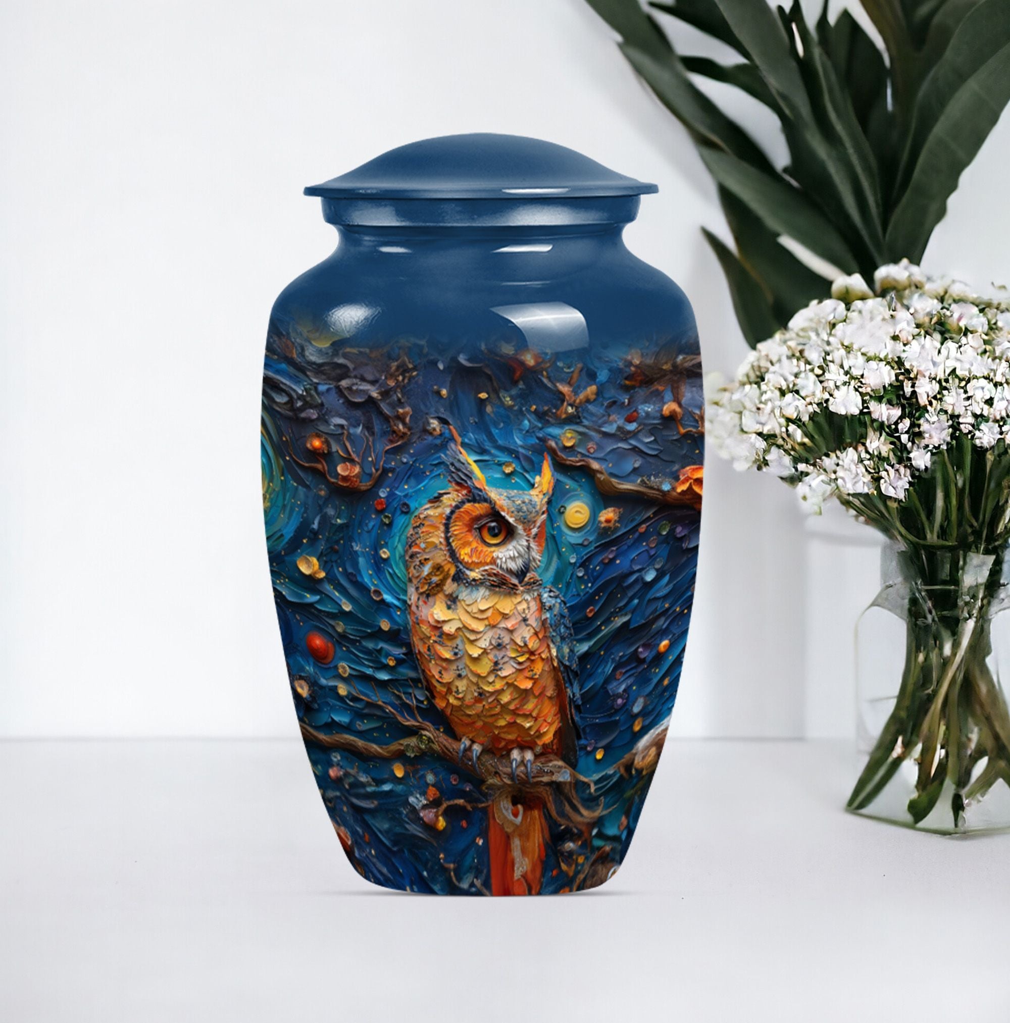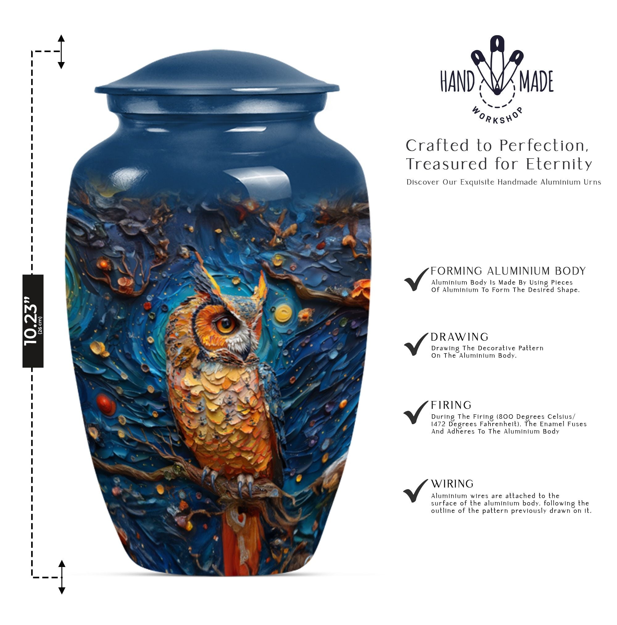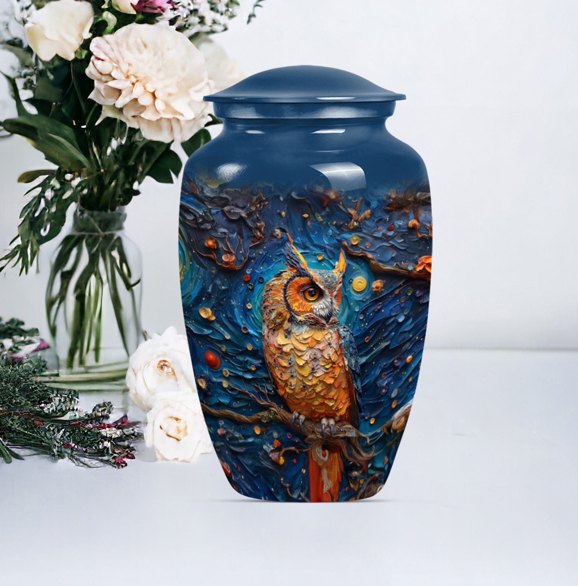 Experience the soothing comfort of an elegant final resting place with this exquisite Owl Urn, a premium burial cremation urn meticulously crafted from durable Aluminium. About 10 Inches in size and weighing 3.3 pounds, this meticulously crafted '10-inch classic urn' provides a capacious space for containment of ashes - precisely a capacity of 200 cubic inches. Encased in a delicate velvet pouch, the urn's intricate 'Wolf Howling' theme offers a tasteful expression of remembrance. Ideal for large urns requirements, this cremation urn not only serves as a memorial but also as a tribute to a cherished relationship. Personalize this urn, engrave names as per your preference, adding a unique touch to it. With the keyword phrases 'Owl Urn', 'Burial Cremation Urns', and 'Cremation Urns' associated with it, the urn stands out as a distinguished offering in the realm of Memorial Ceremony Supplies. Opt for this adult female elegant urn today, and ensure your loved ones rest peacefully while you remember and honour their life.
