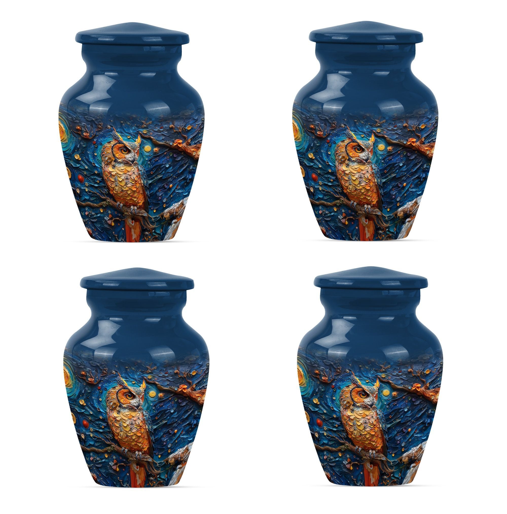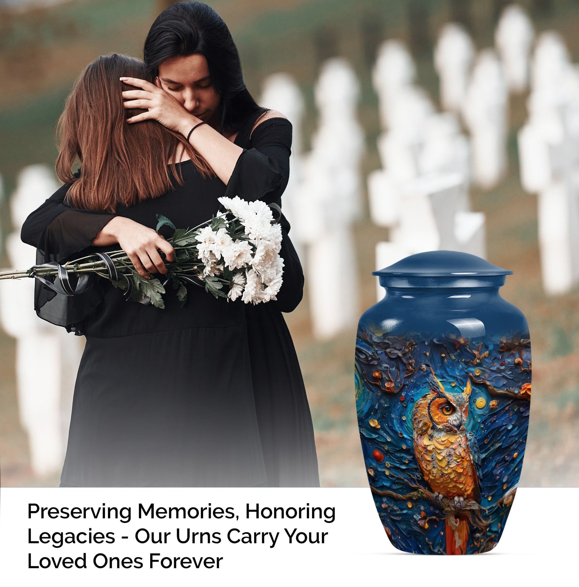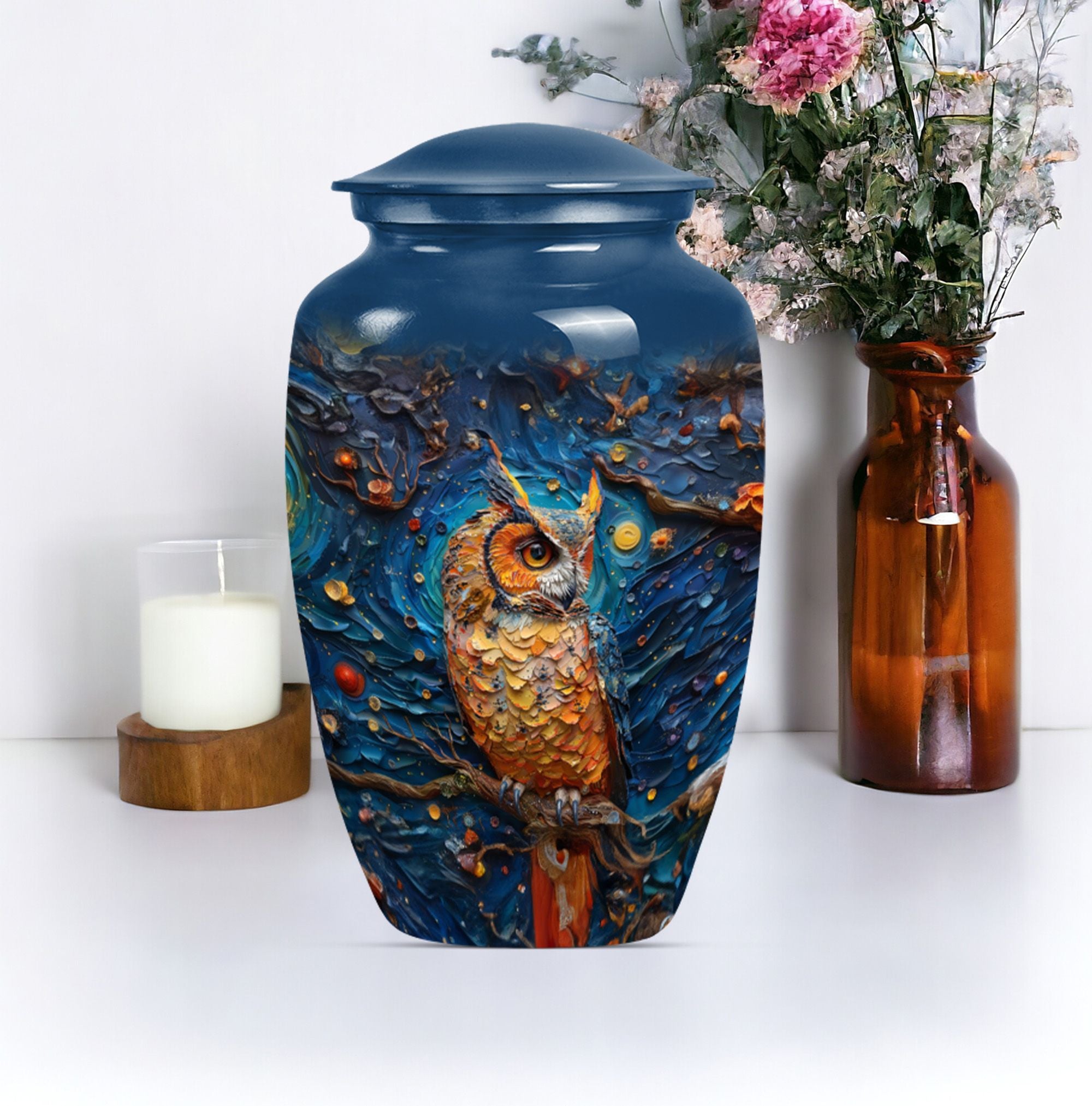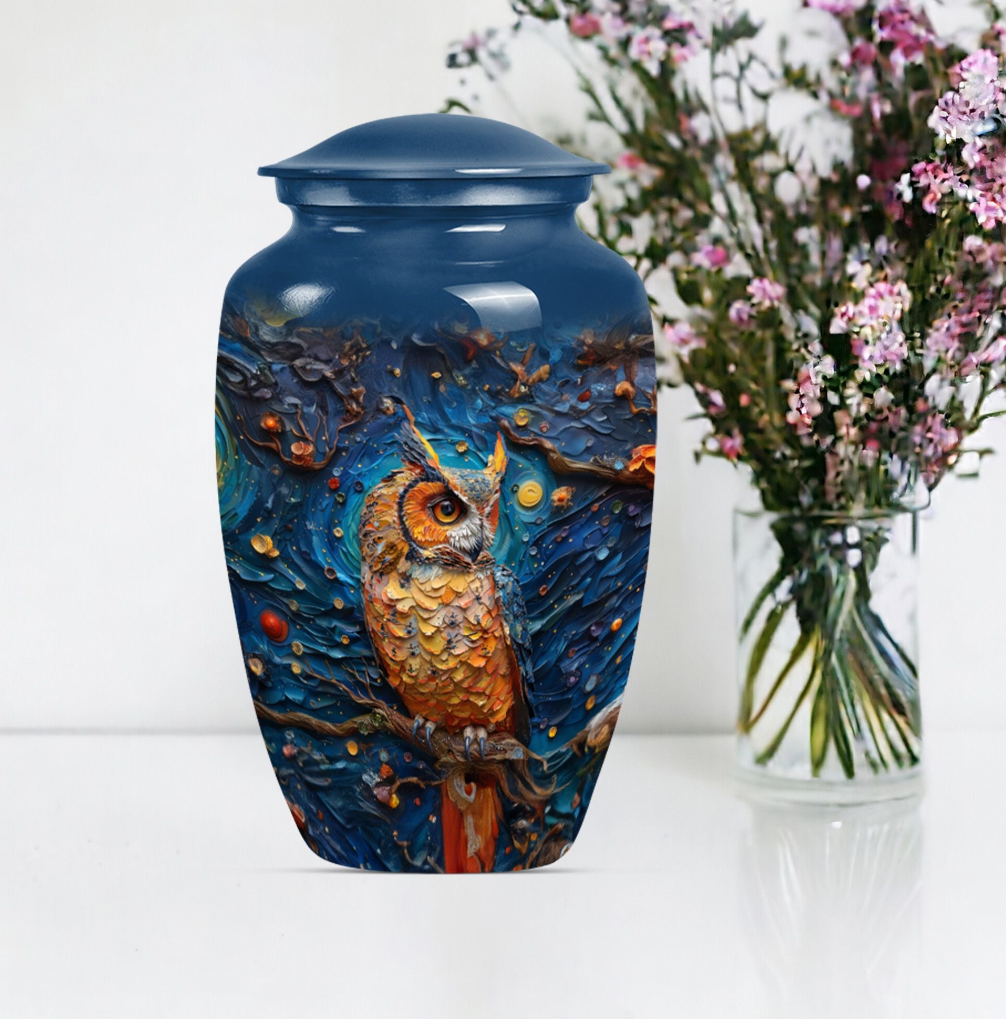 Experience the soothing comfort of an elegant final resting place with this exquisite Owl Urn, a premium burial cremation urn meticulously crafted from durable Aluminium. About 10 Inches in size and weighing 3.3 pounds, this meticulously crafted '10-inch classic urn' provides a capacious space for containment of ashes - precisely a capacity of 200 cubic inches. Encased in a delicate velvet pouch, the urn's intricate 'Wolf Howling' theme offers a tasteful expression of remembrance. Ideal for large urns requirements, this cremation urn not only serves as a memorial but also as a tribute to a cherished relationship. Personalize this urn, engrave names as per your preference, adding a unique touch to it. With the keyword phrases 'Owl Urn', 'Burial Cremation Urns', and 'Cremation Urns' associated with it, the urn stands out as a distinguished offering in the realm of Memorial Ceremony Supplies. Opt for this adult female elegant urn today, and ensure your loved ones rest peacefully while you remember and honour their life.