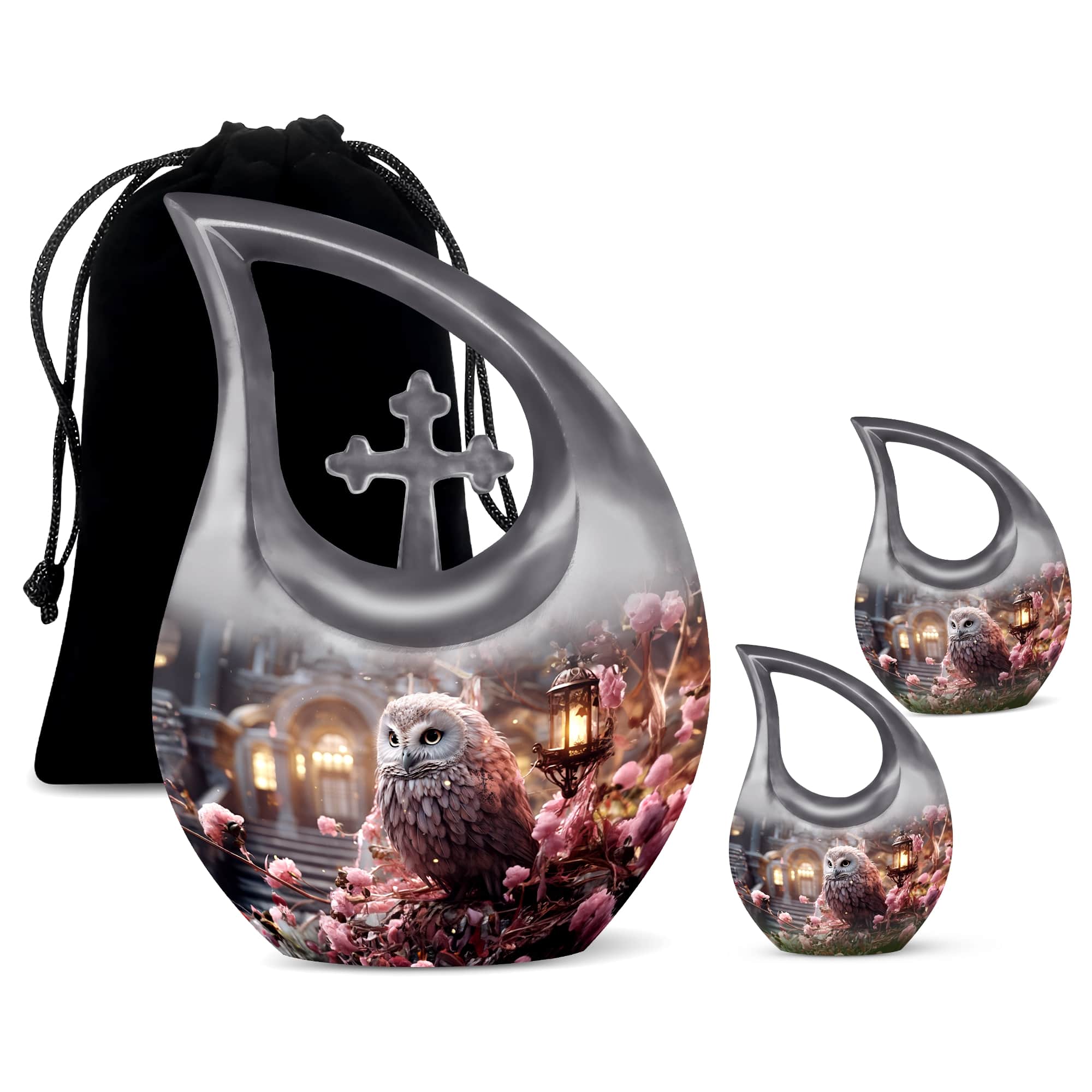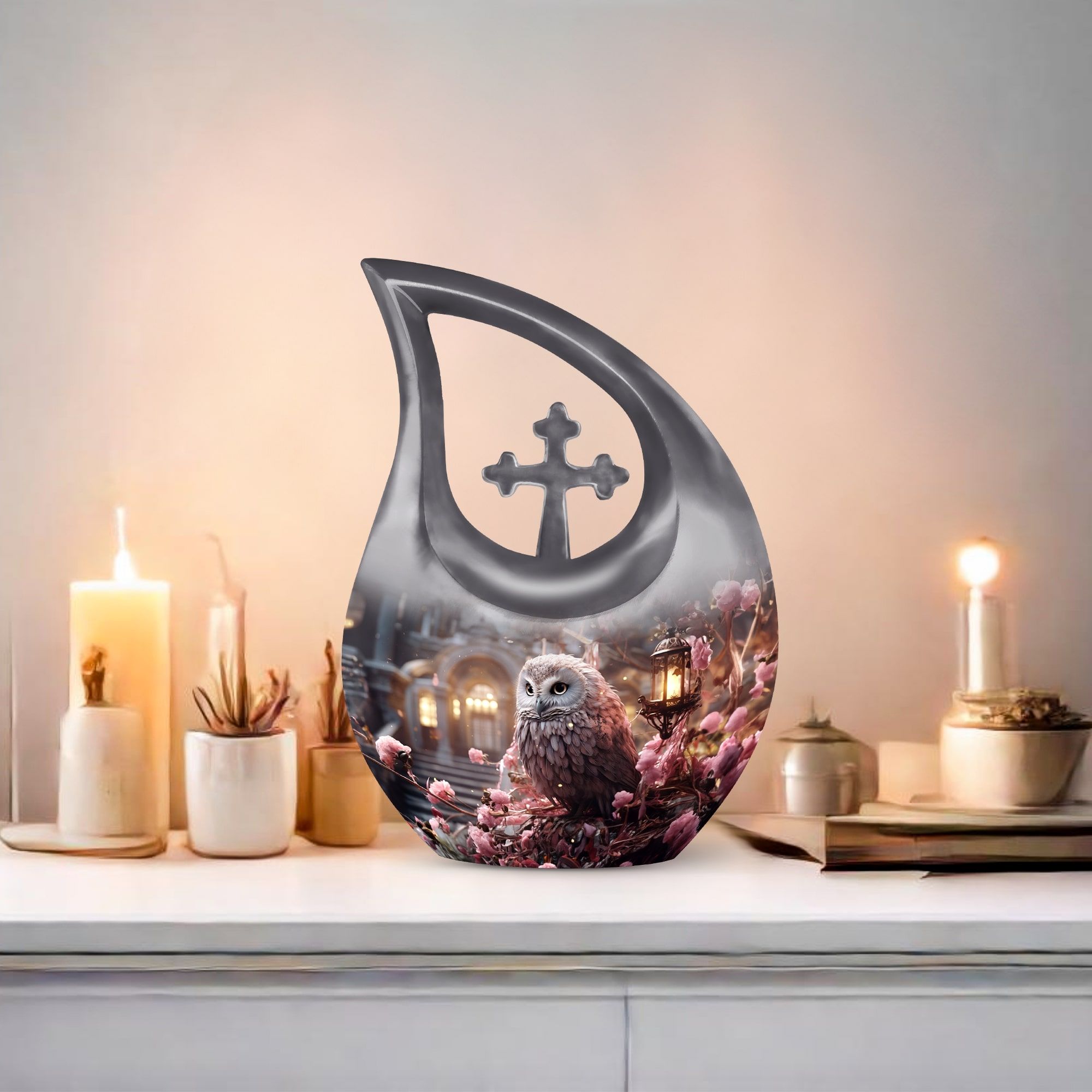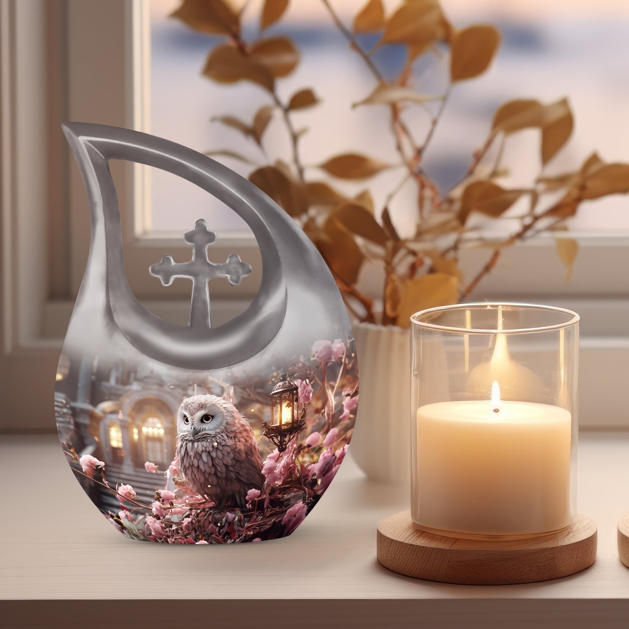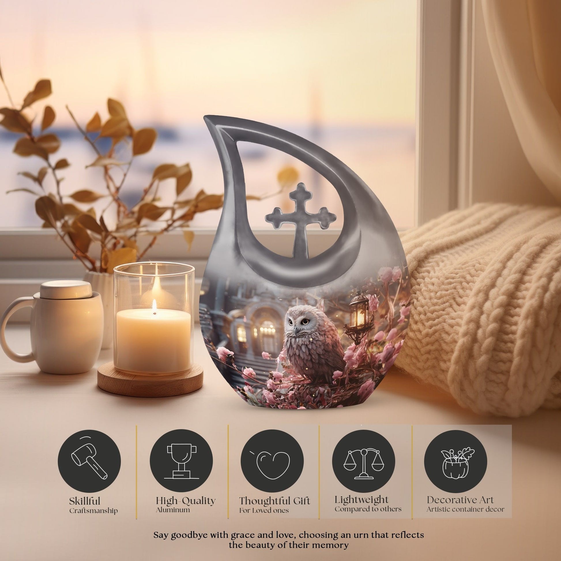 Crafted with care from durable aluminum, this cremation urn for women and men features delicate cherry blossom engravings surrounding a detailed owl motif. Its high-gloss finish and intricate craftsmanship create a lasting tribute, whether used as a large urn or shared as part of a keepsake urns for men ashes collection. Perfect for home display or burial, it offers both elegance and durability.