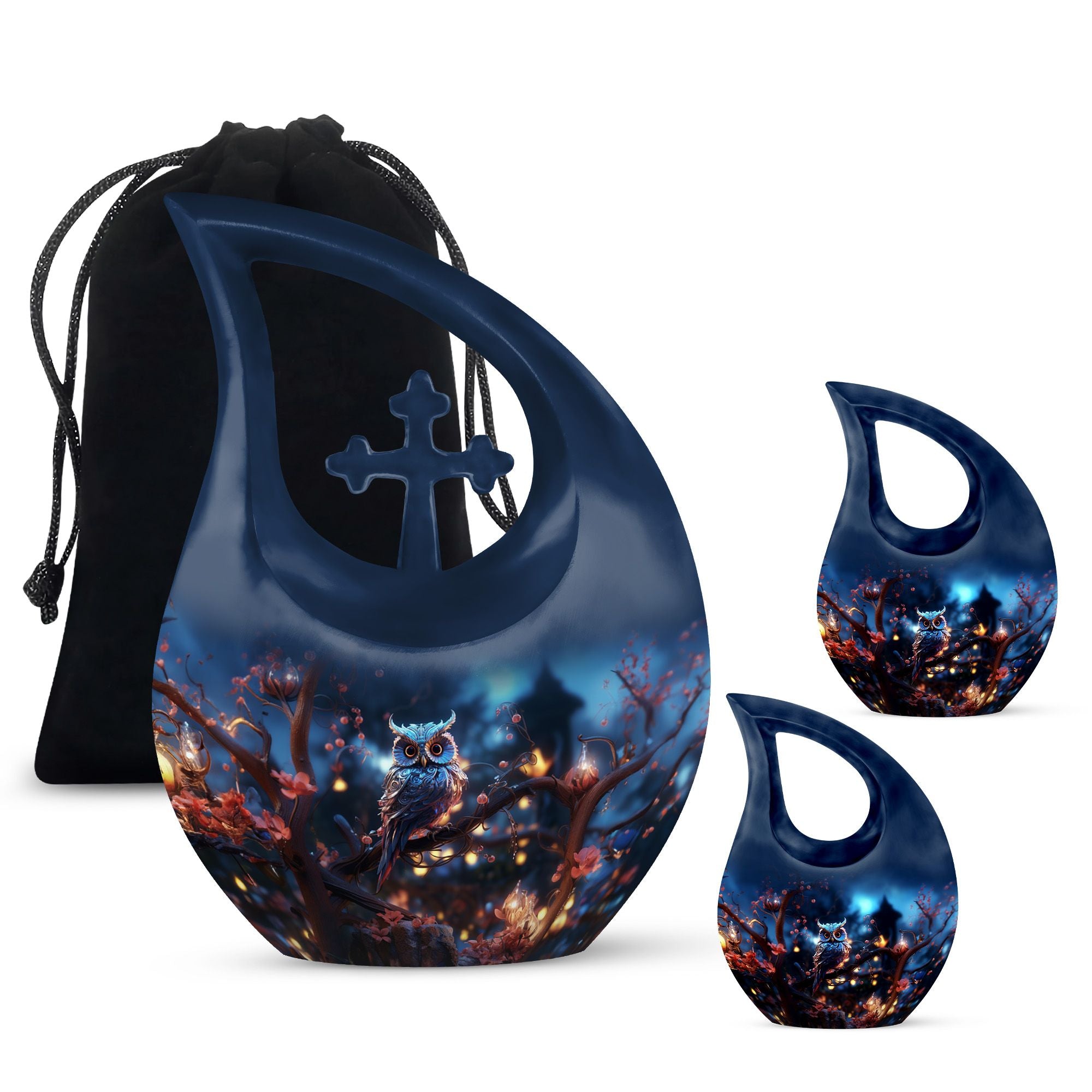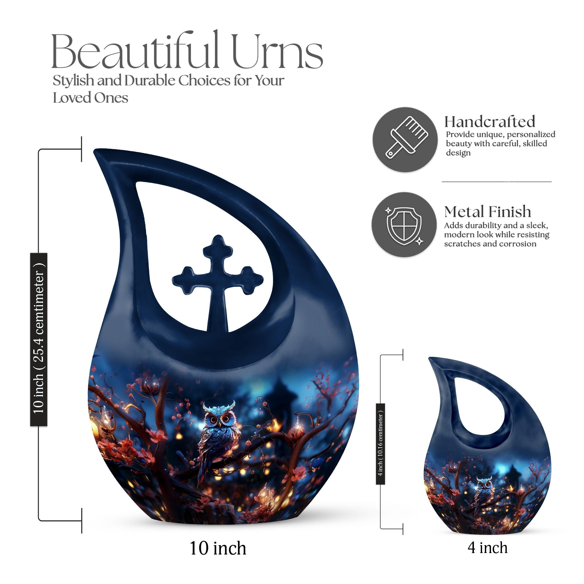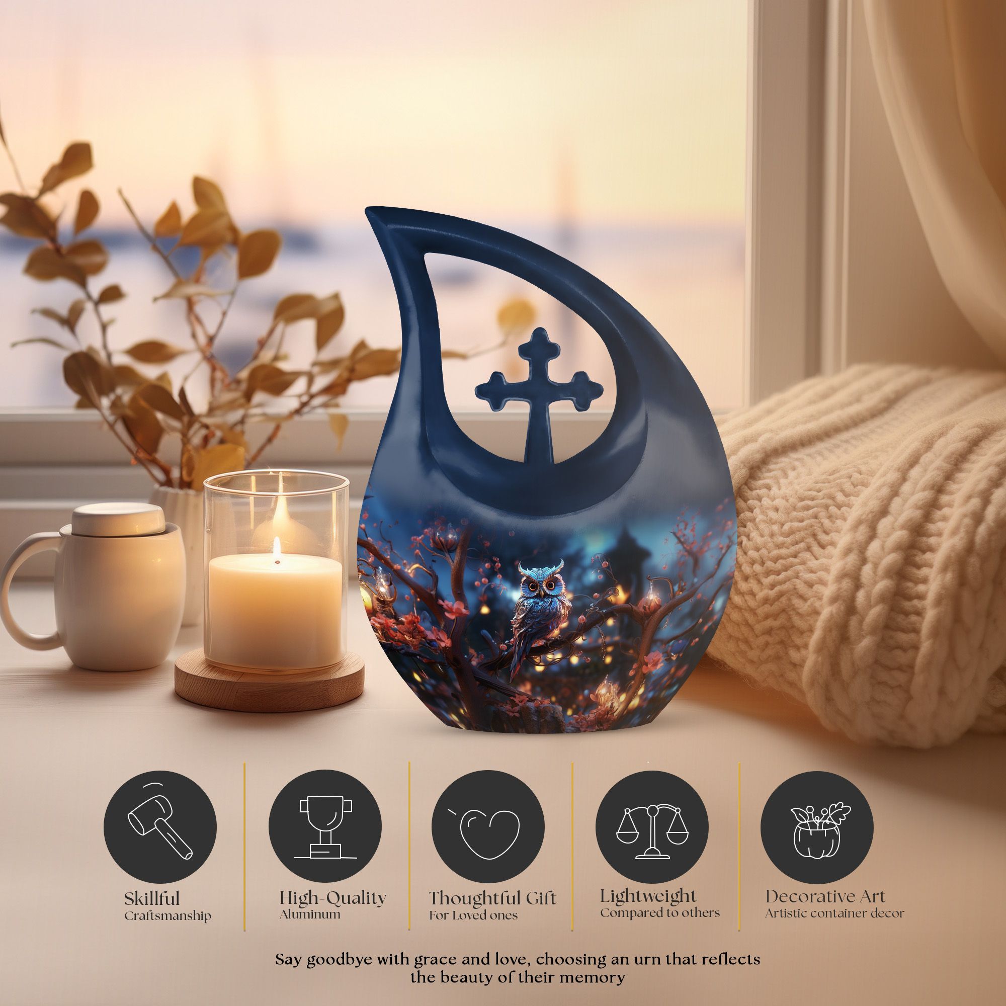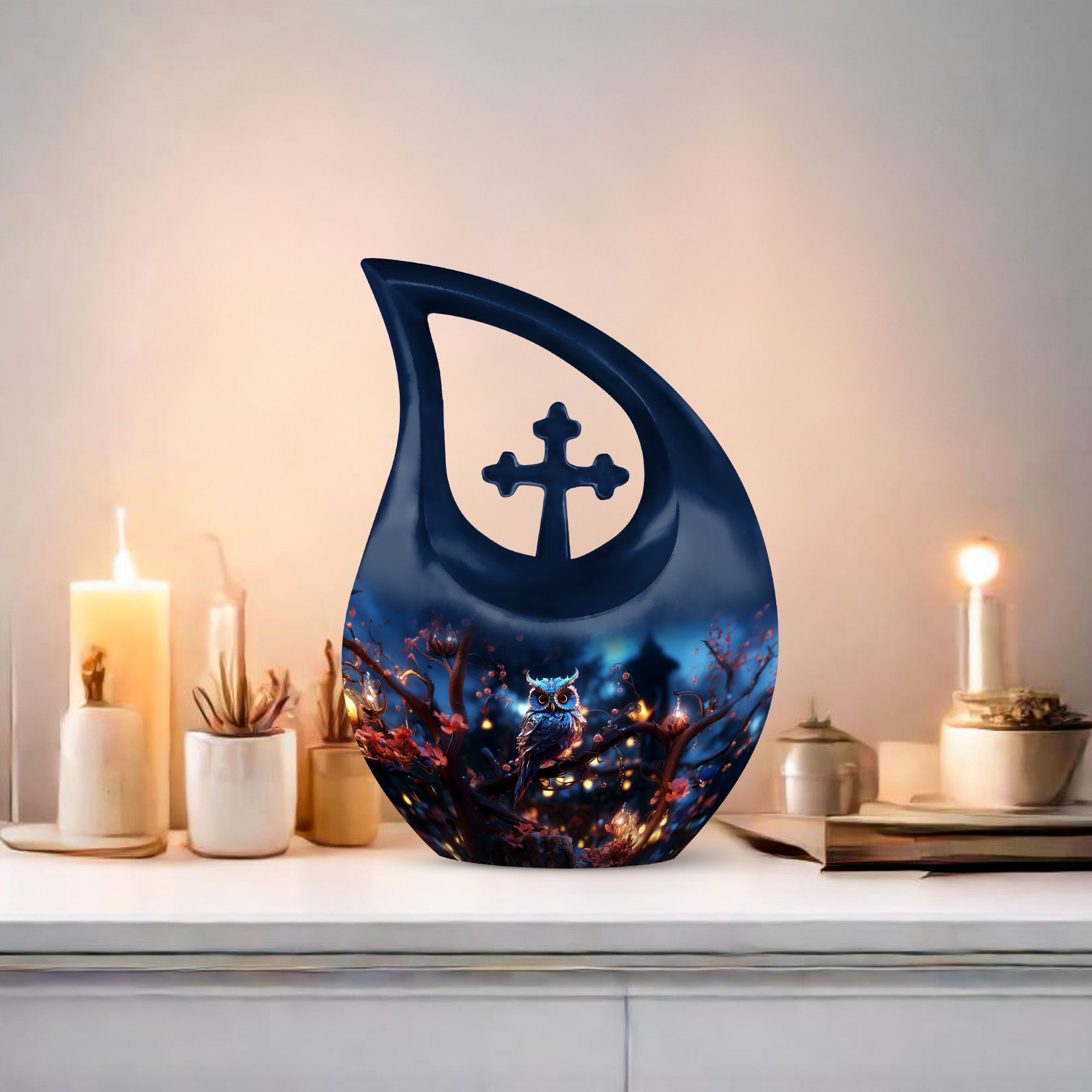 Expertly handcrafted from premium aluminum, this large decorative urn features a deep blue teardrop shape accented with a silver owl design. The polished dark finish exudes tranquility, while the secure screw-top lid ensures the ashes remain safely preserved. This cremation urn large offers both timeless craftsmanship and emotional symbolism, perfect for home display or burial.