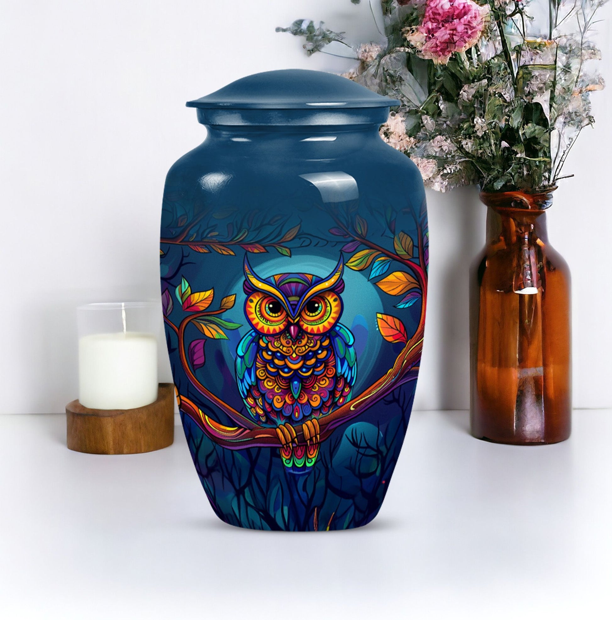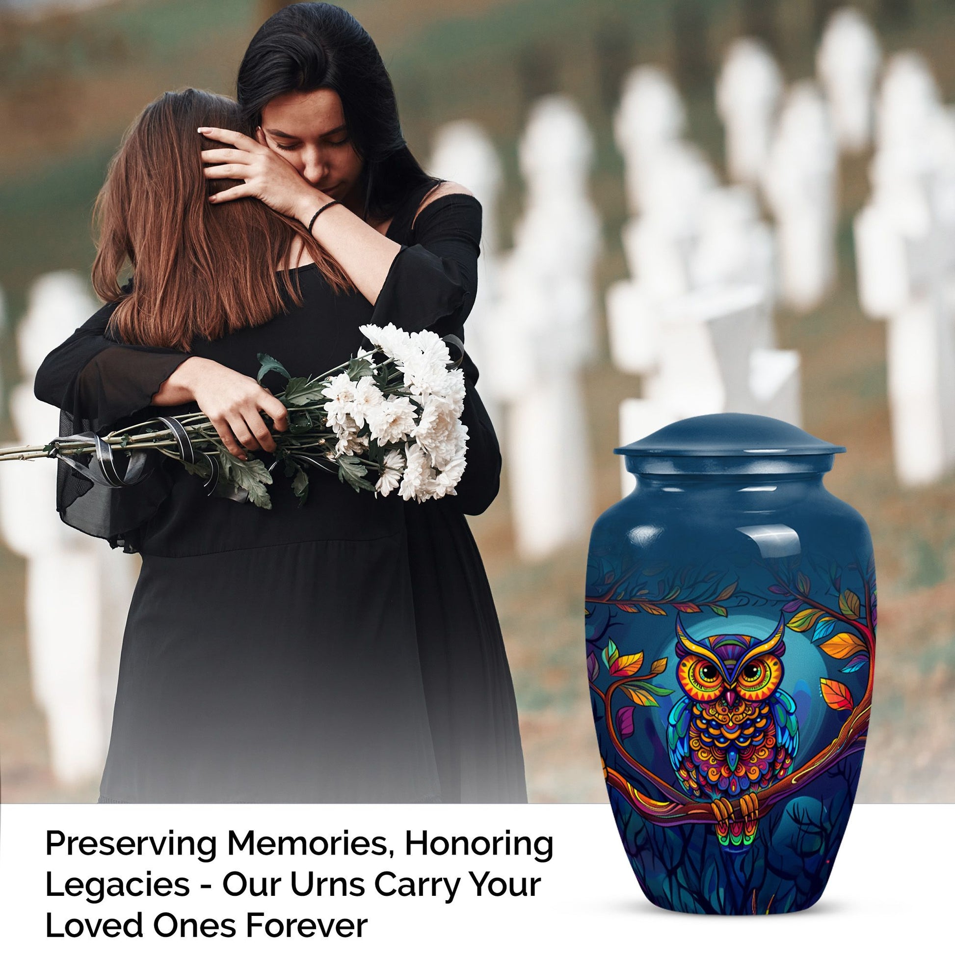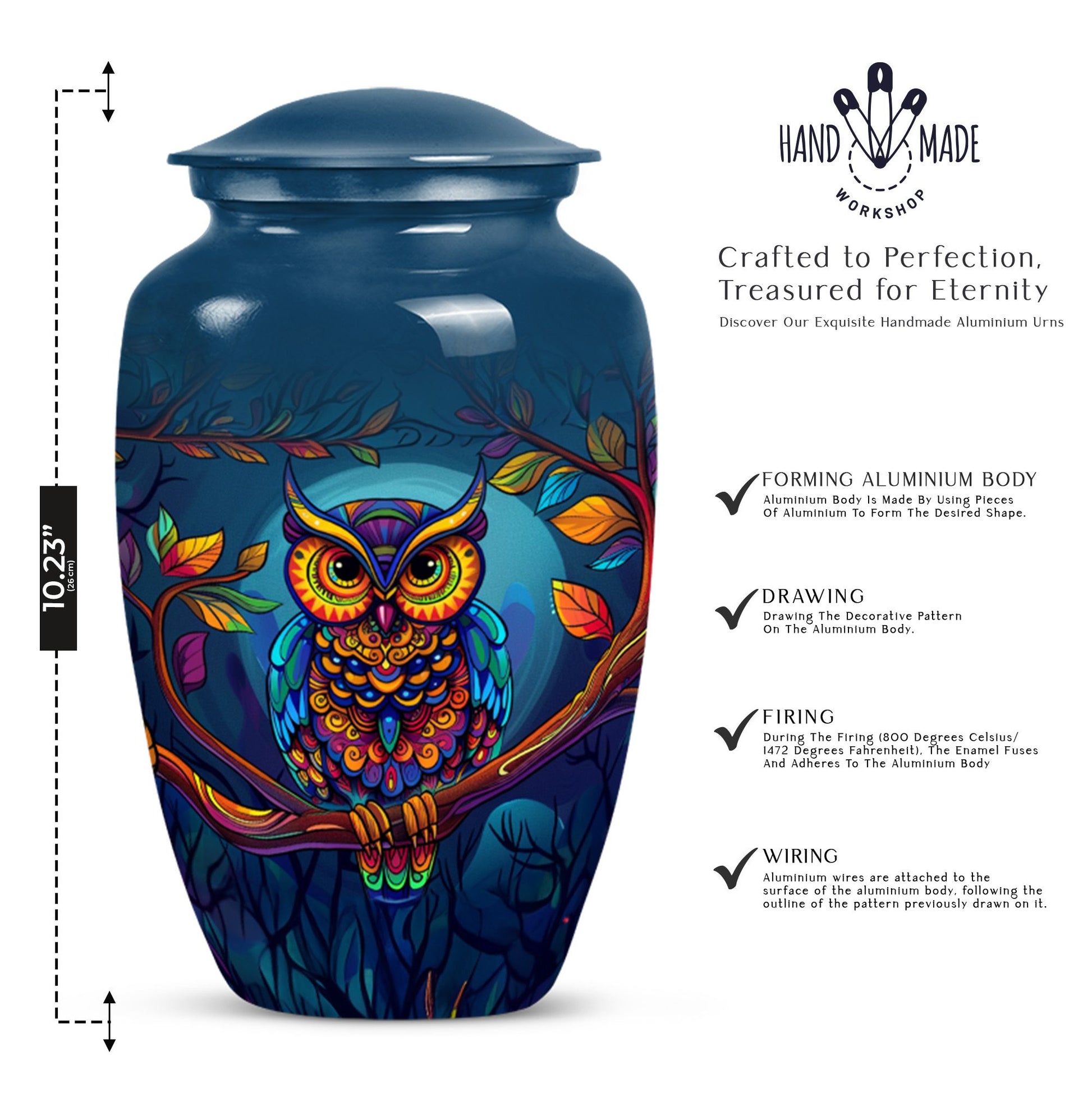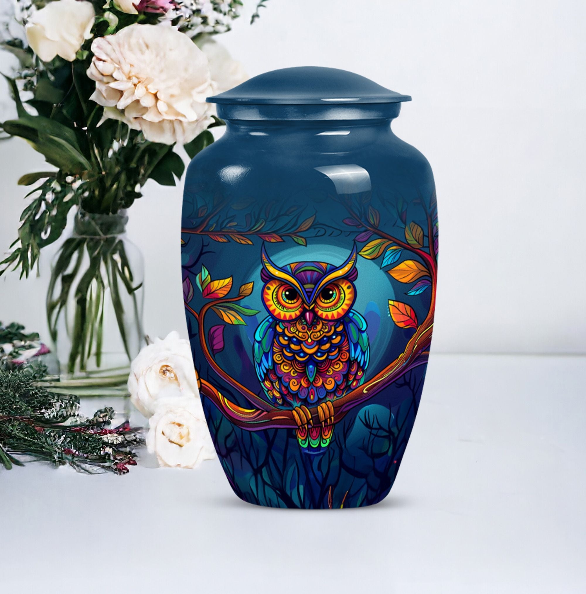 Our distinctive Owl Urn is an expressive piece from our Memorial Ceremony Supplies range, perfect for those seeking a unique, heartfelt tribute. Crafted from high-quality aluminium, this durable 10-inch large urn is designed to securely hold up to 200 cubic inches of ashes. Its abstract theme adds an artistic flair, complementing its classical urn shape. The product weighs only 3.3 pounds, making it a sturdy yet portable choice as an urn for ground burial. In addition, this cremation urn allows for personalized expressions of care through customized engraved names. The package includes a soft velvet pouch providing further protection and proper containment of the ashes. This listing does not include any specific design elements as it emphasizes the urn's primary and abstract nature. Remember your loved ones with our owl memorial urn for women ashes - a unique tribute for any adult female. It's more than just an urn; it's a memory holder.