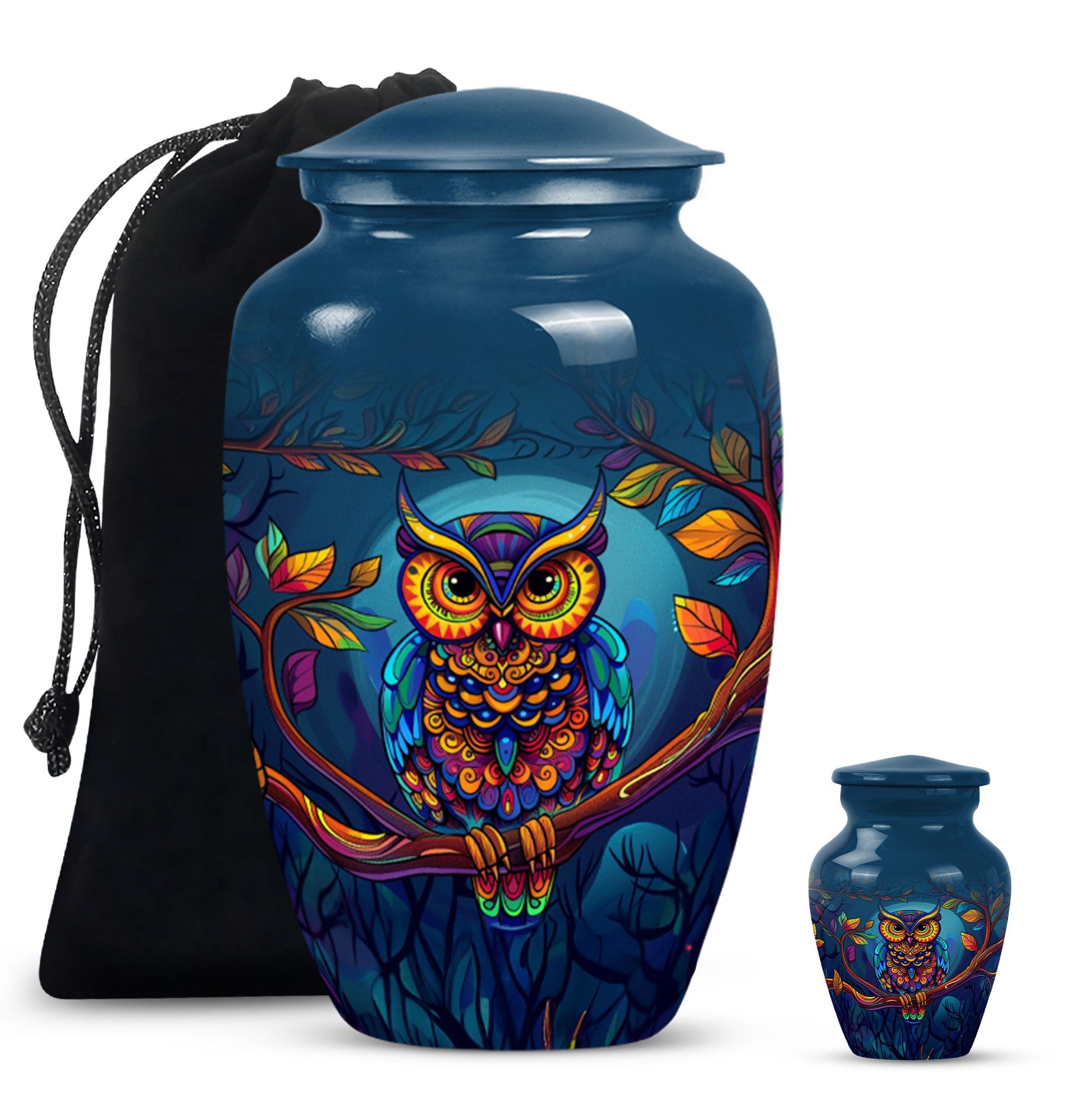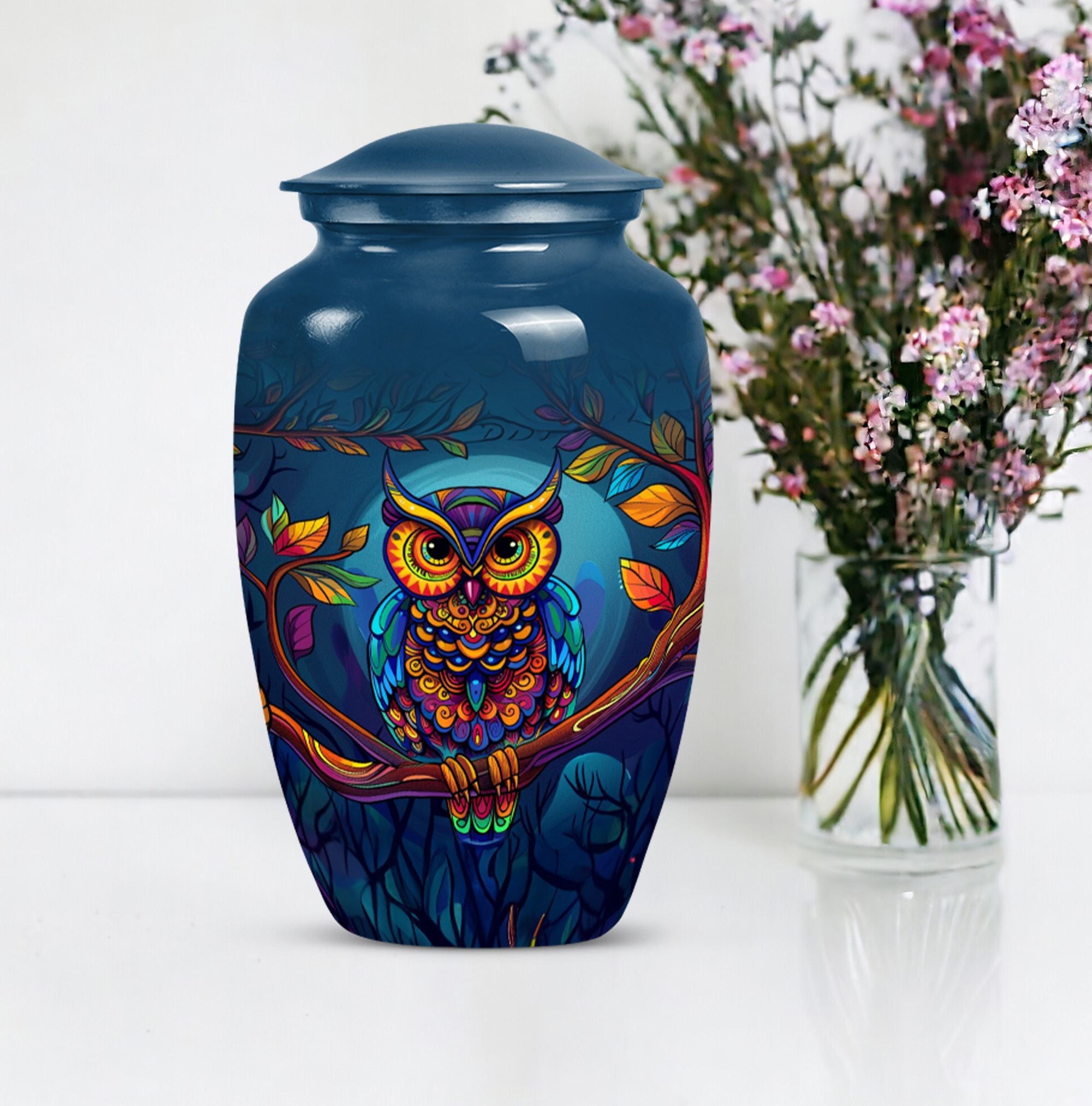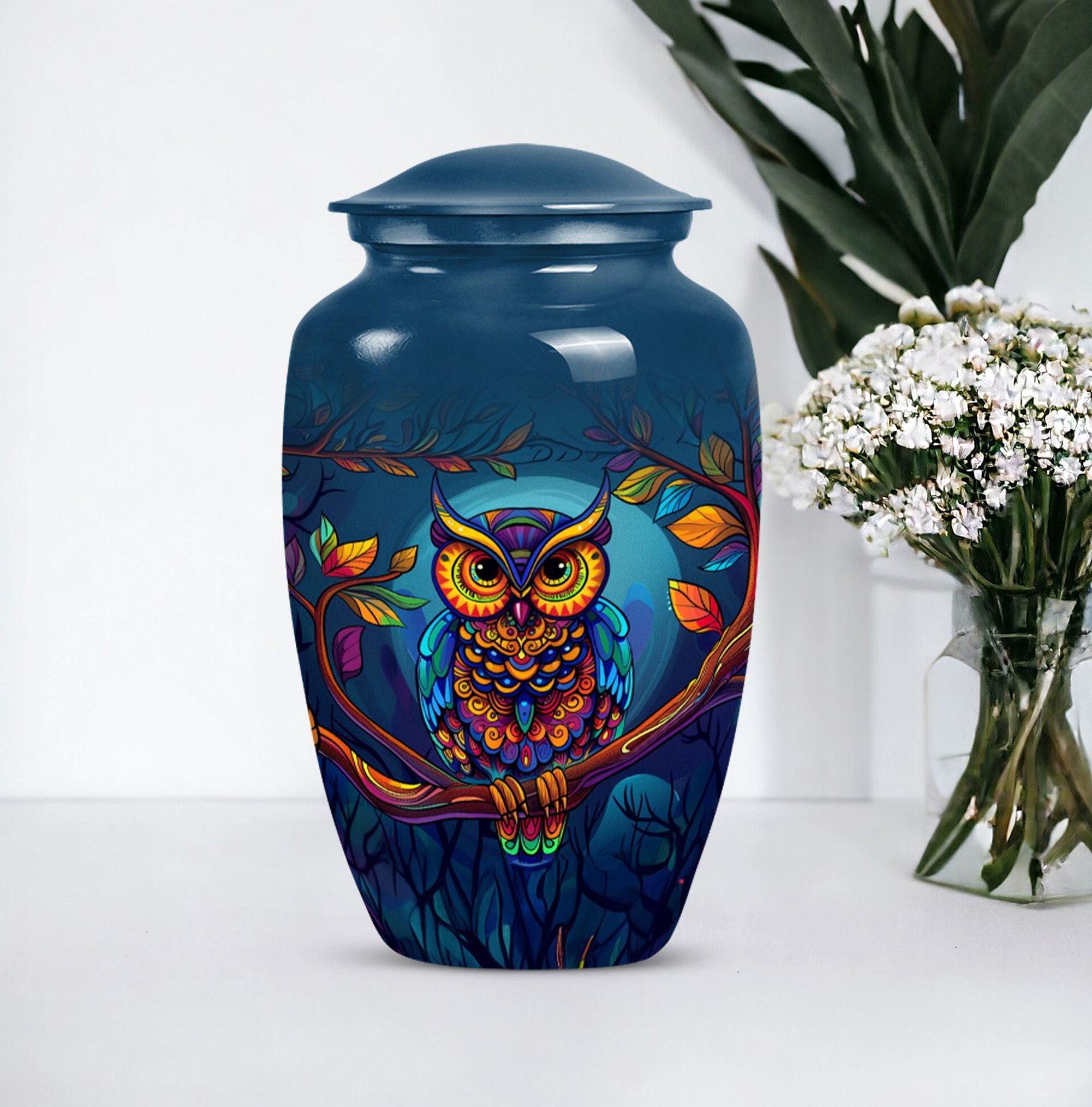 Our distinctive Owl Urn is an expressive piece from our Memorial Ceremony Supplies range, perfect for those seeking a unique, heartfelt tribute. Crafted from high-quality aluminium, this durable 10-inch large urn is designed to securely hold up to 200 cubic inches of ashes. Its abstract theme adds an artistic flair, complementing its classical urn shape. The product weighs only 3.3 pounds, making it a sturdy yet portable choice as an urn for ground burial. In addition, this cremation urn allows for personalized expressions of care through customized engraved names. The package includes a soft velvet pouch providing further protection and proper containment of the ashes. This listing does not include any specific design elements as it emphasizes the urn's primary and abstract nature. Remember your loved ones with our owl memorial urn for women ashes - a unique tribute for any adult female. It's more than just an urn; it's a memory holder.