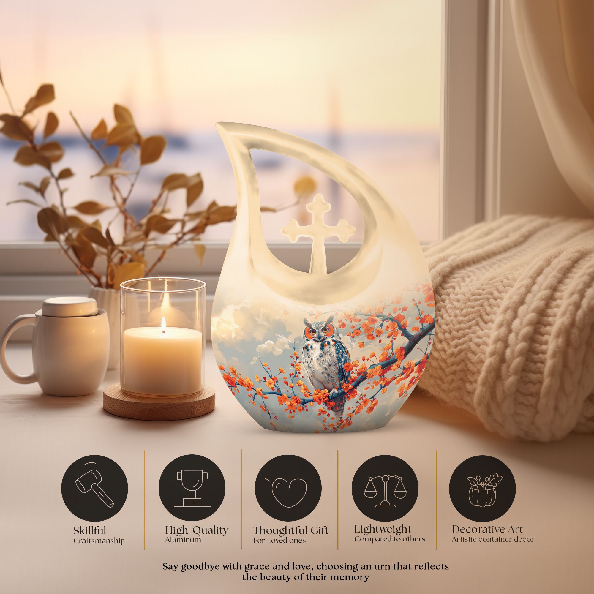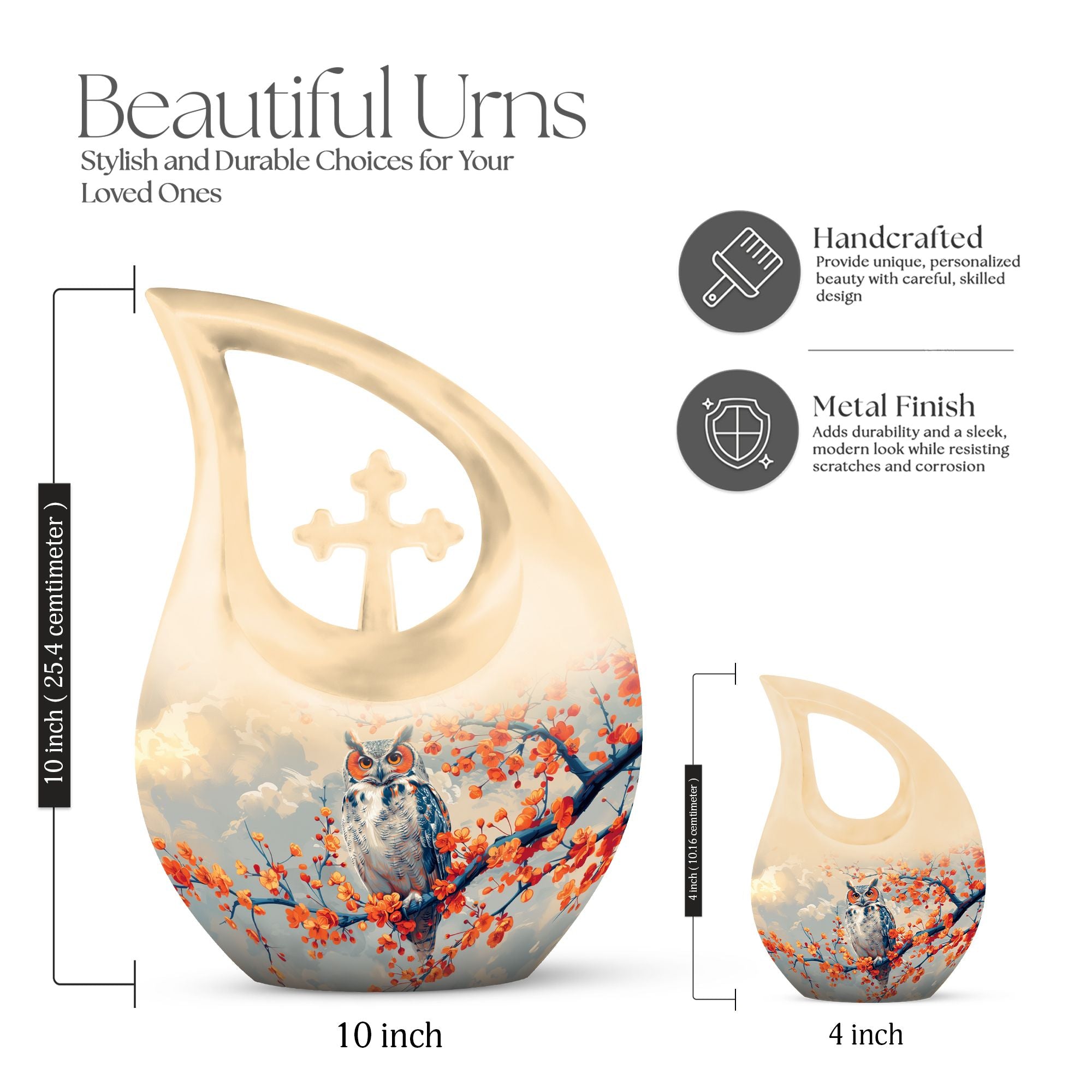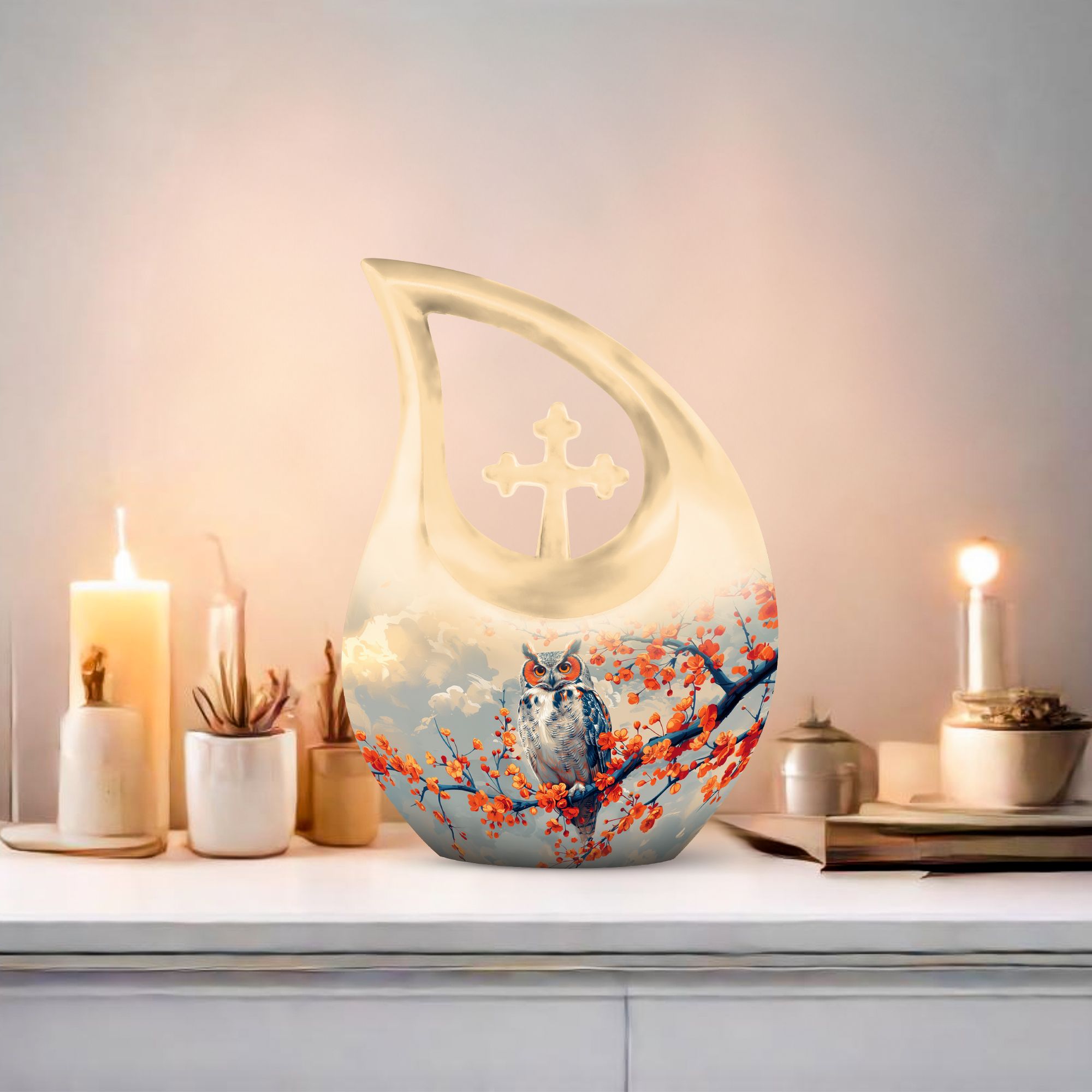 Crafted from durable aluminium, this beautifully detailed piece serves as a dignified large urn for adult ashes, suitable for both men and women. The owl motif adds an element of spiritual reassurance, making it an ideal option among large human urns and adult urns for human ashes large. With a secure screw-top lid and a full 200-cubic-inch capacity, this urn fulfills the needs of those looking for human urns for ashes adult large, large adult urns for human ashes, or even a heartfelt large urn mom tribute.