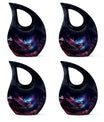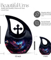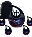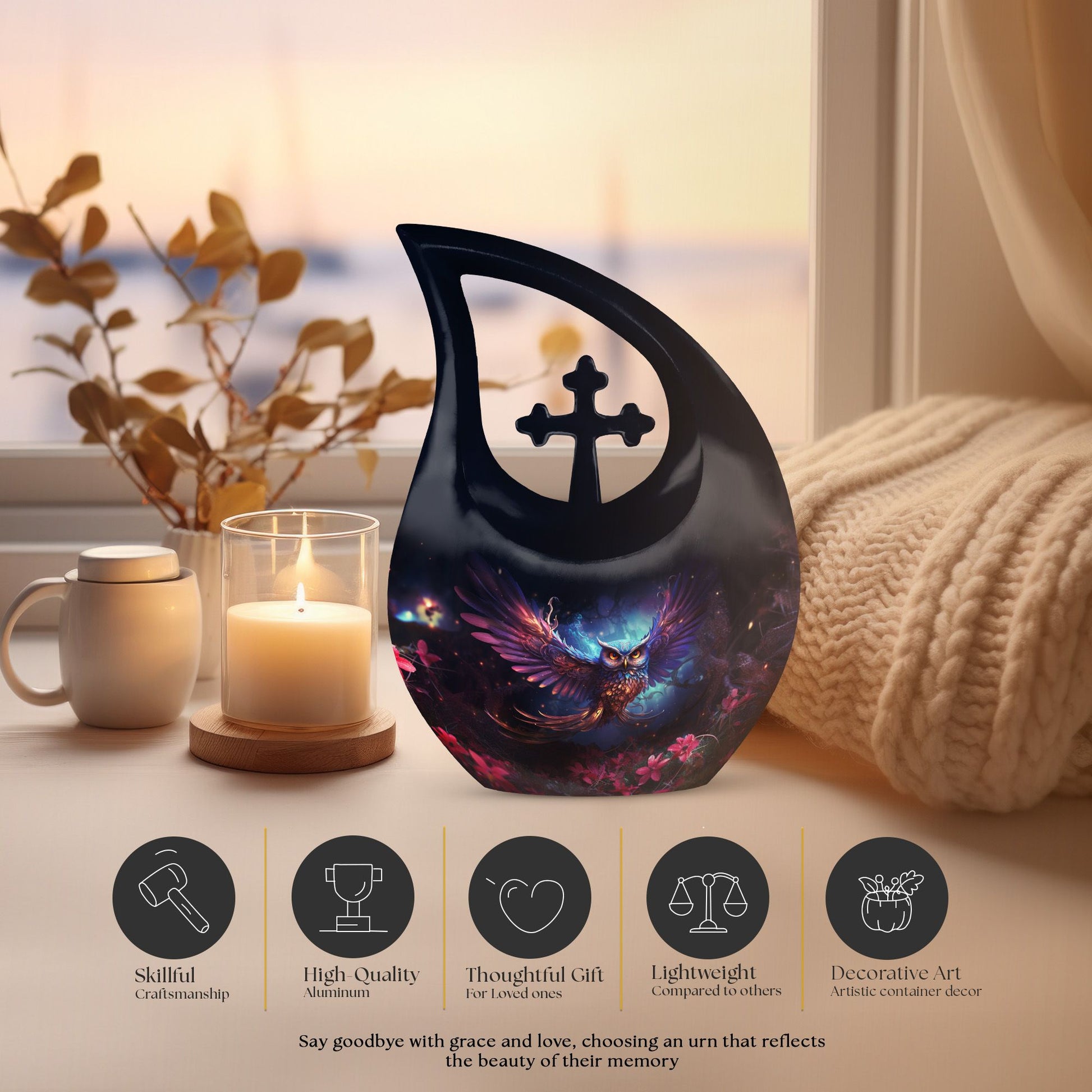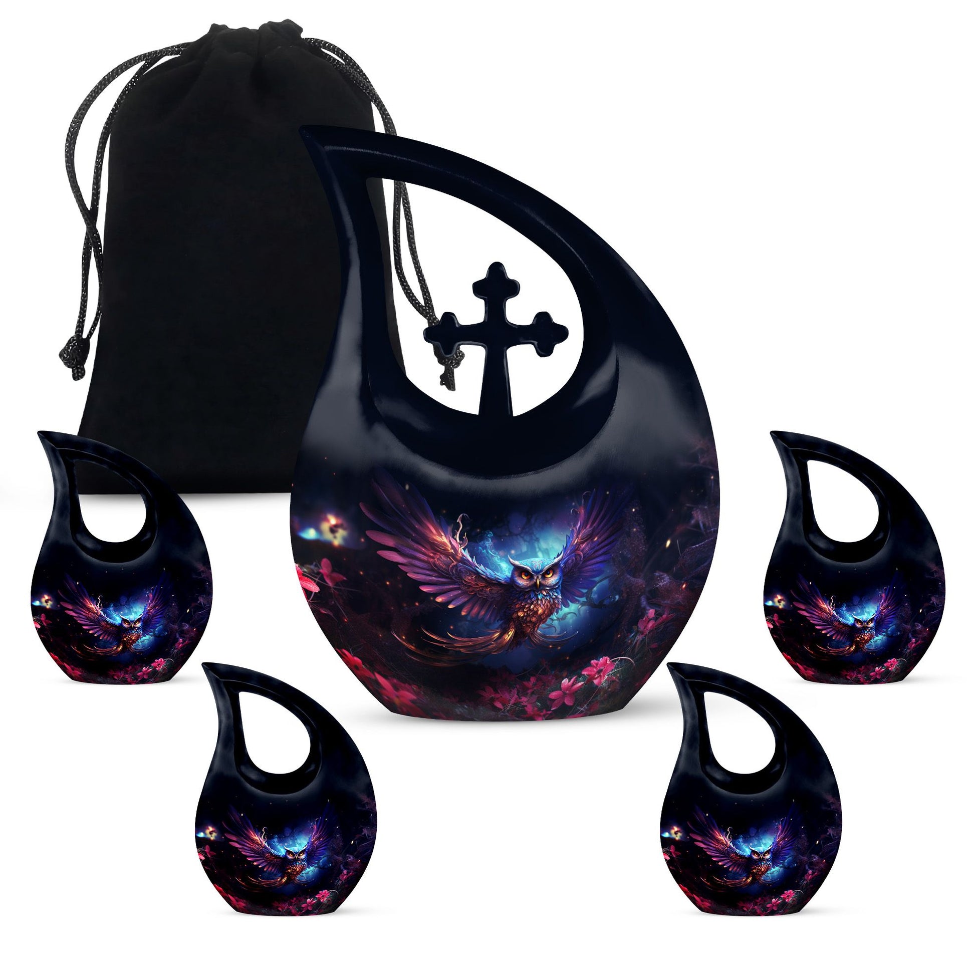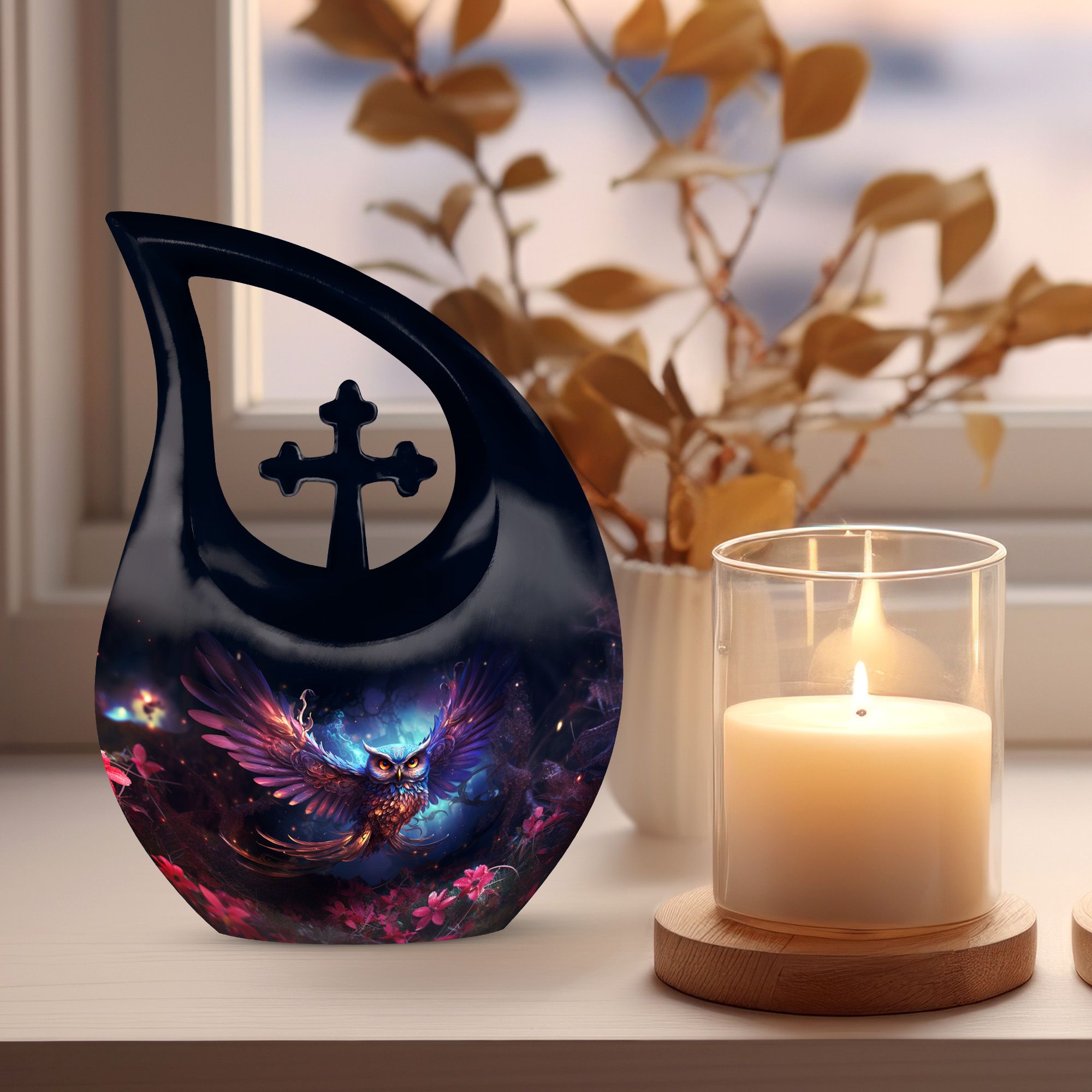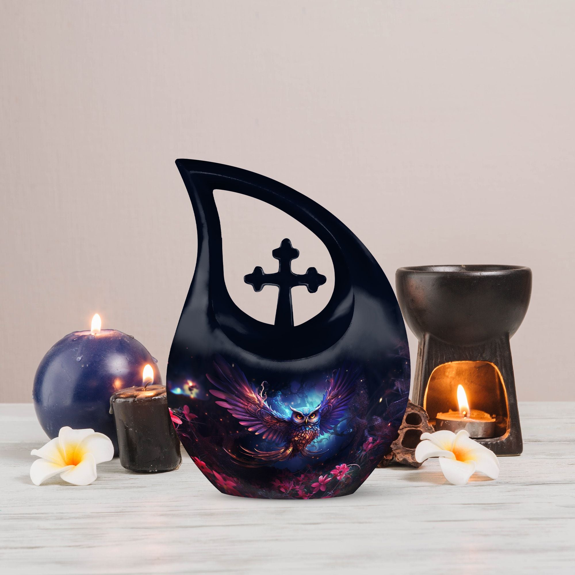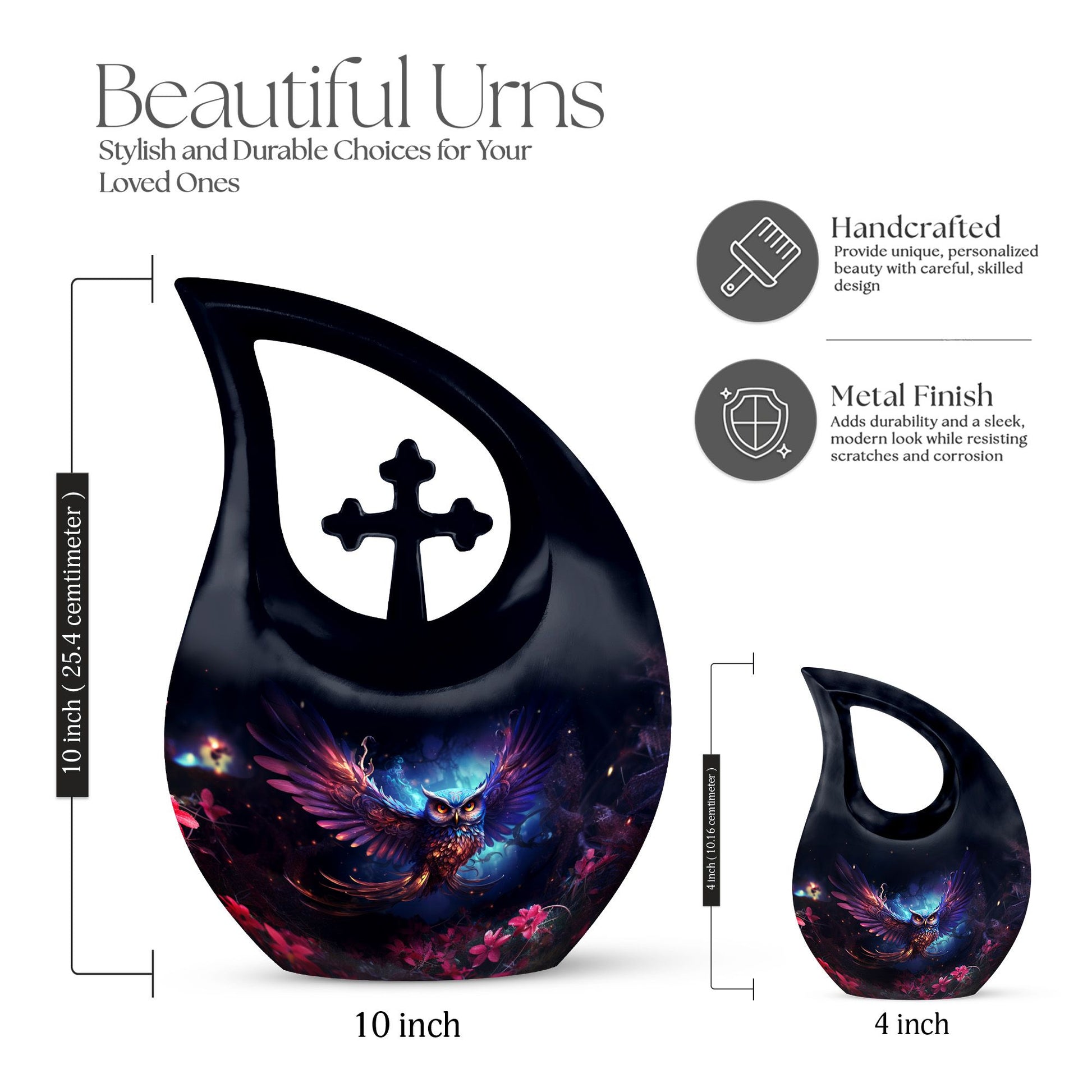 Crafted from high-quality aluminum, this urn set includes one large urn for ashes adult male or female and matching keepsake urns for family sharing. The intricate owl design is hand-finished with shimmering enamel tones that bring depth and beauty to the memorial. Perfect for home display, burial, or funeral services, this large decorative urn provides both strength and grace.
