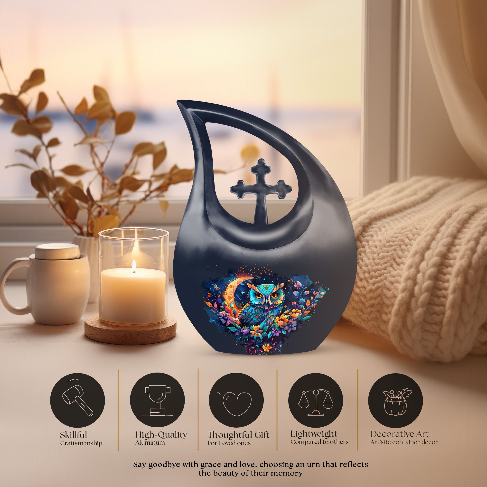 Handcrafted from premium aluminium, this 10-inch cremation urn women and cremation urn men option combines durability with unique artistry. The detailed multicolor owl design and smooth polished finish make it a standout tribute piece for home display or ceremony. With a secure screw-top lid, it safely holds ashes and fits the needs of burial urns urn for ashes for women or men, as well as cremation urns women collections.