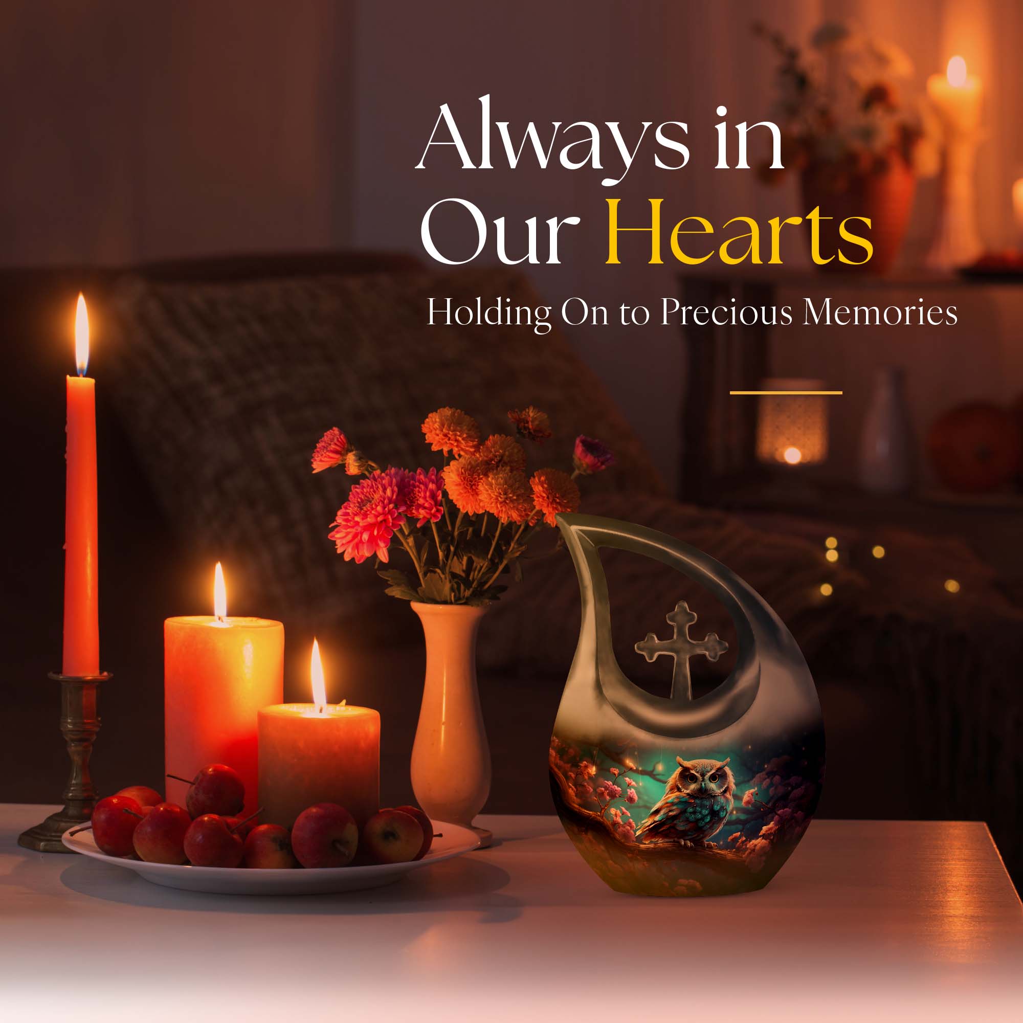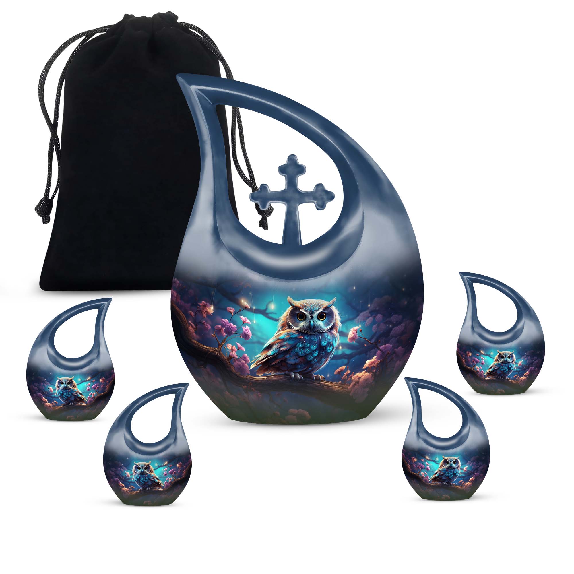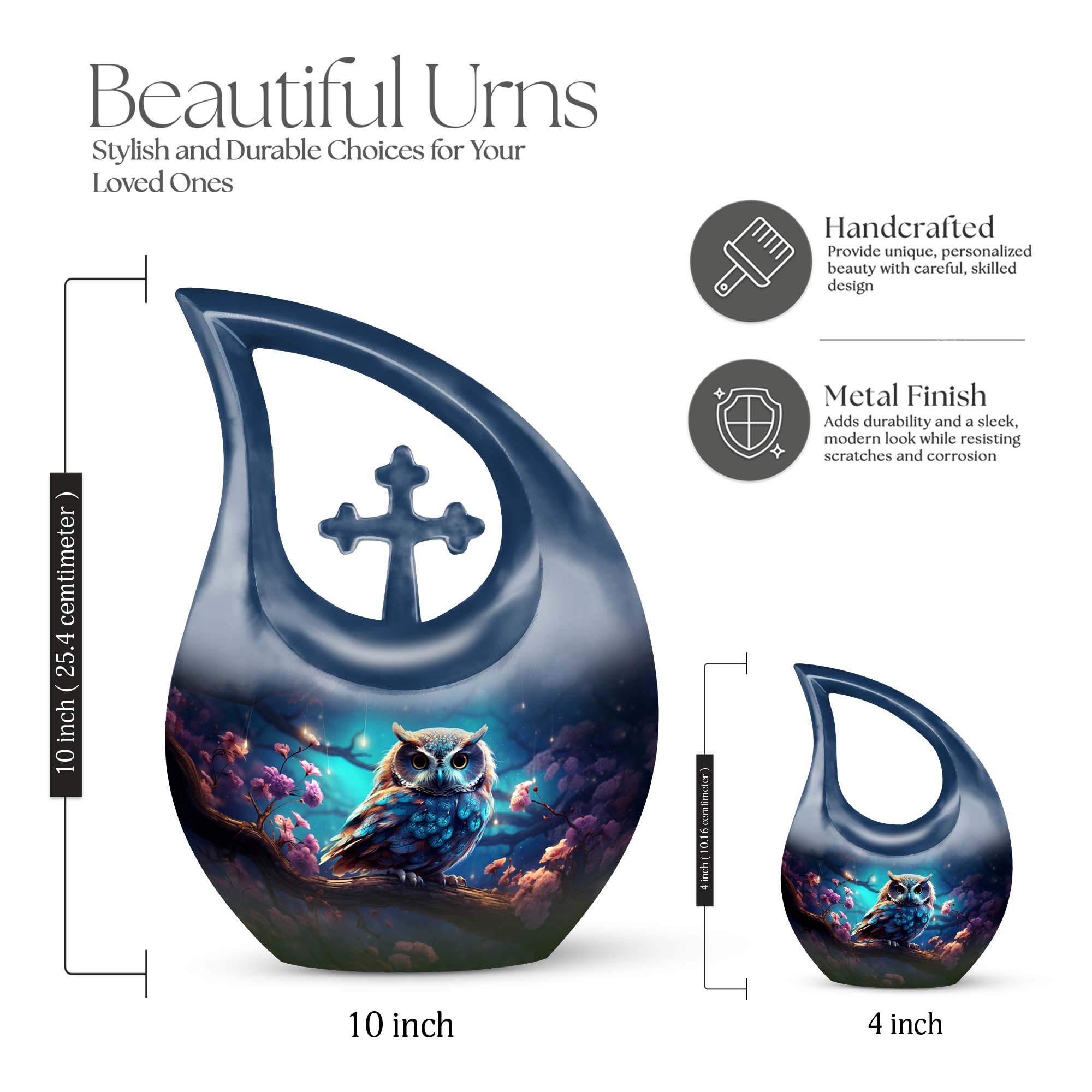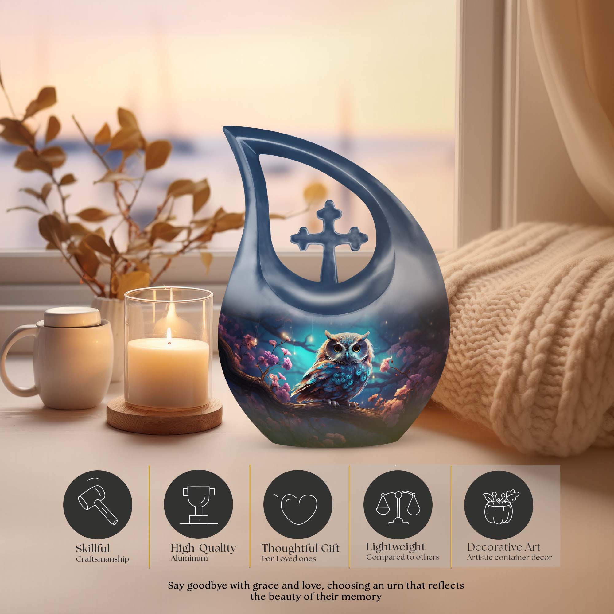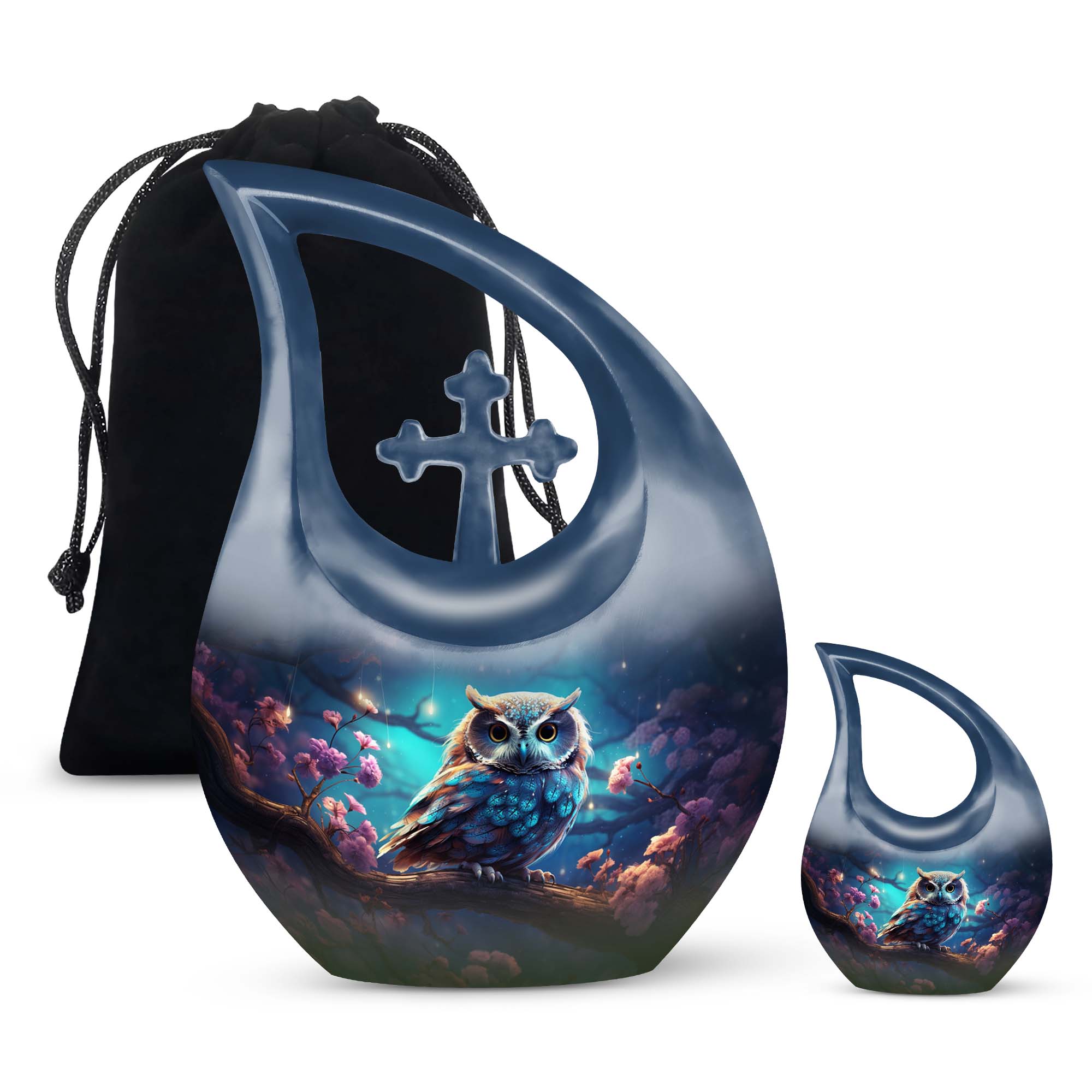 Crafted with precision from premium aluminum, this urn combines durability with refined artistry. The rich night-tone finish paired with a detailed owl motif makes this one of the most elegant cremation urns for women and men alike. Whether used as a large urn for adult ashes or as part of a keepsake urns for women collection, it captures timeless beauty and emotional depth.