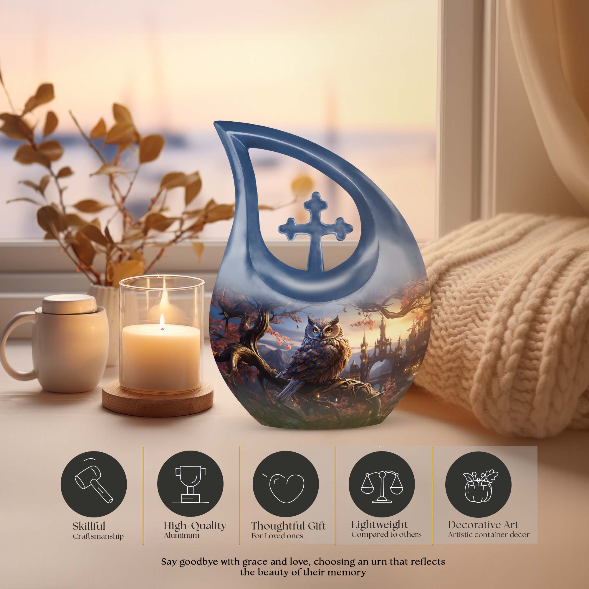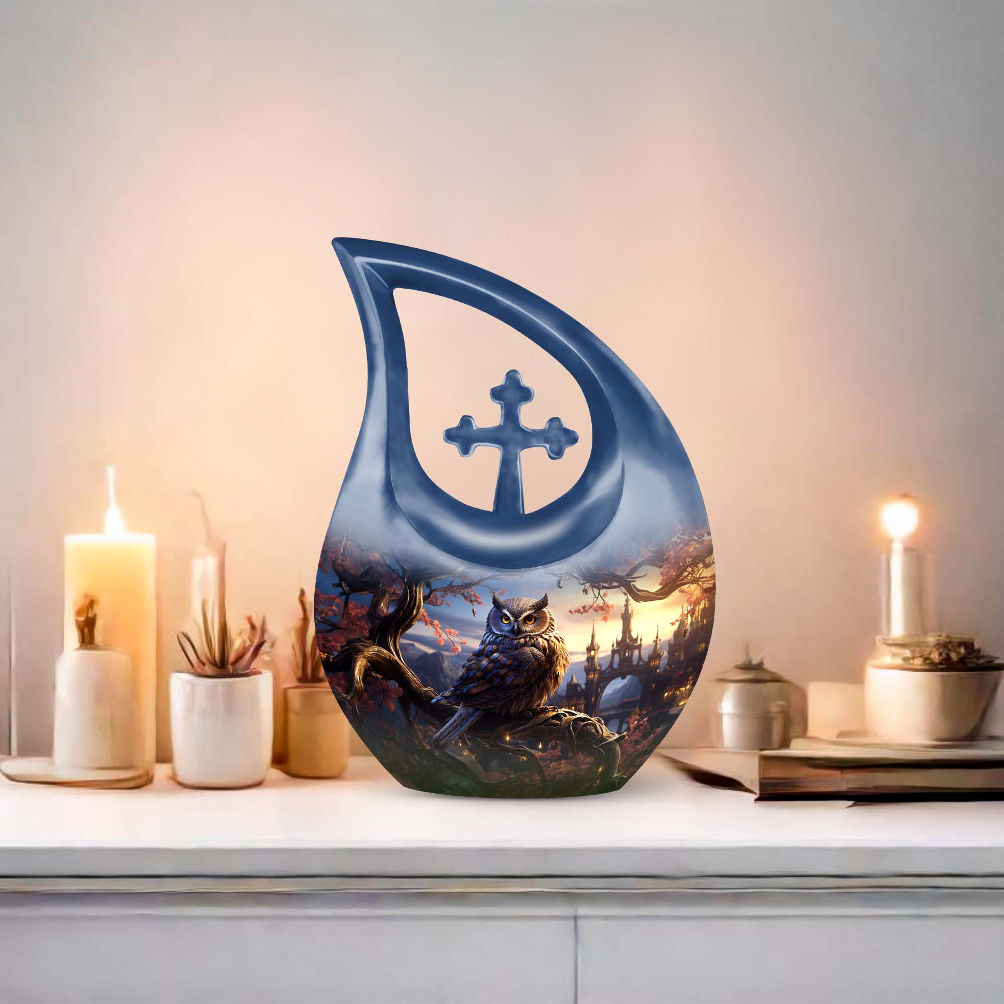 Expertly handcrafted from high-quality aluminum, this cremation urn women and cremation urn men features an intricate owl engraving over a rich, shimmering finish. The design captures light beautifully, making it one of the most elegant funeral urns women and funeral urns men available. Durable, secure, and refined, it’s ideal for display at home, a memorial service, or burial.