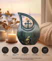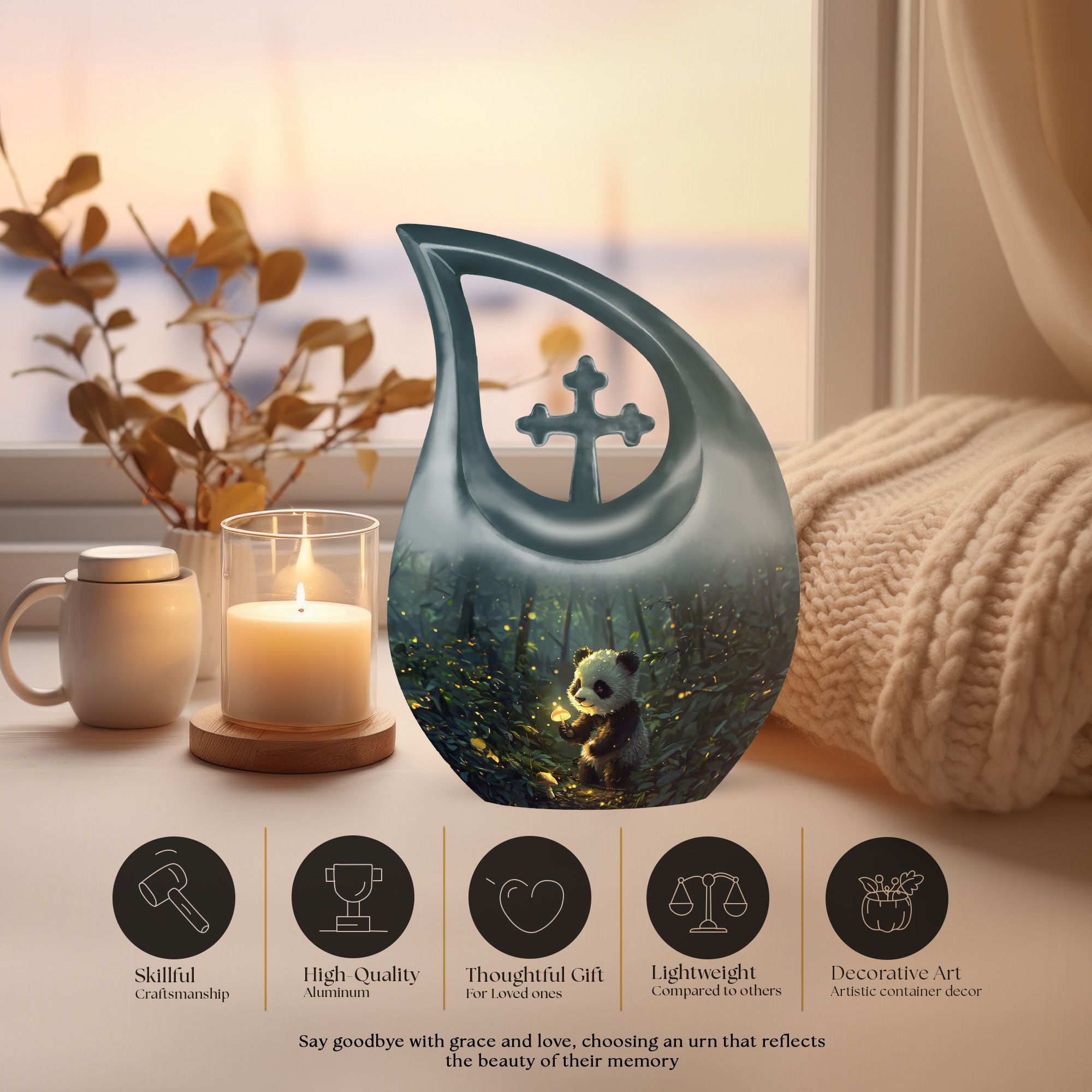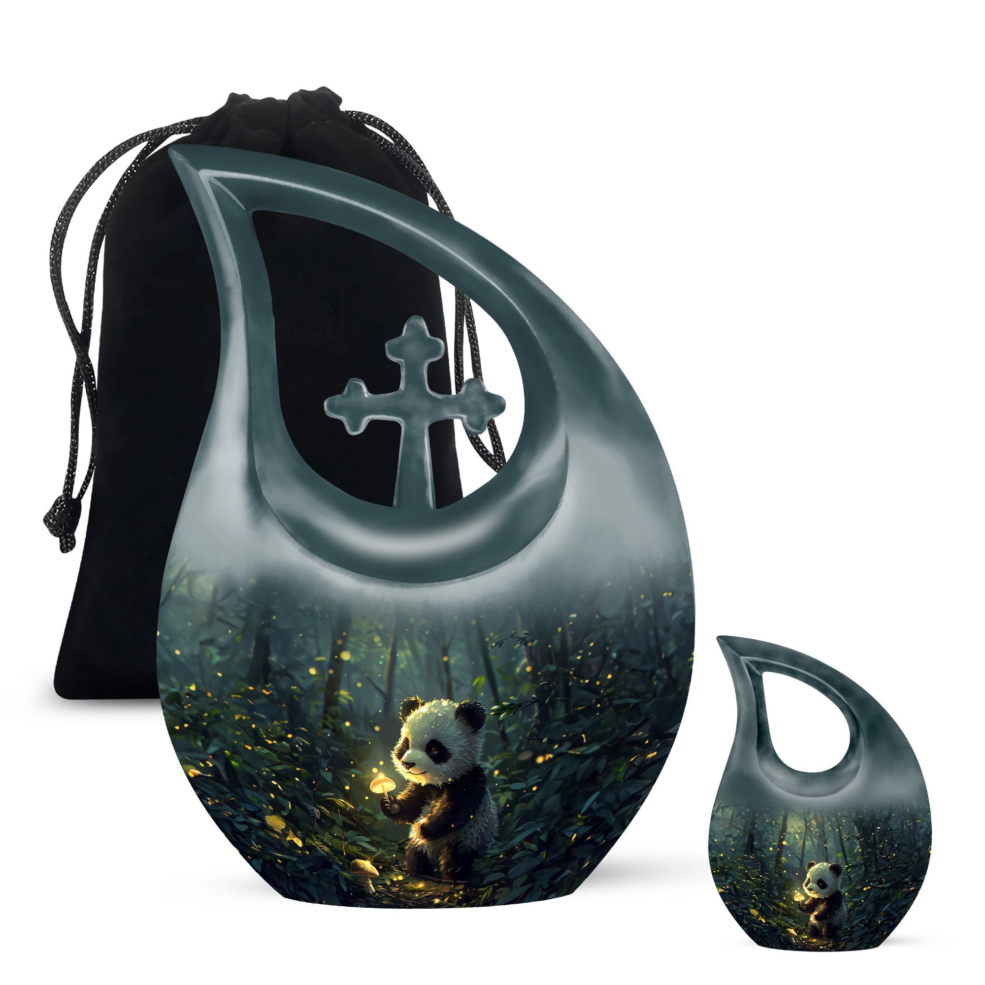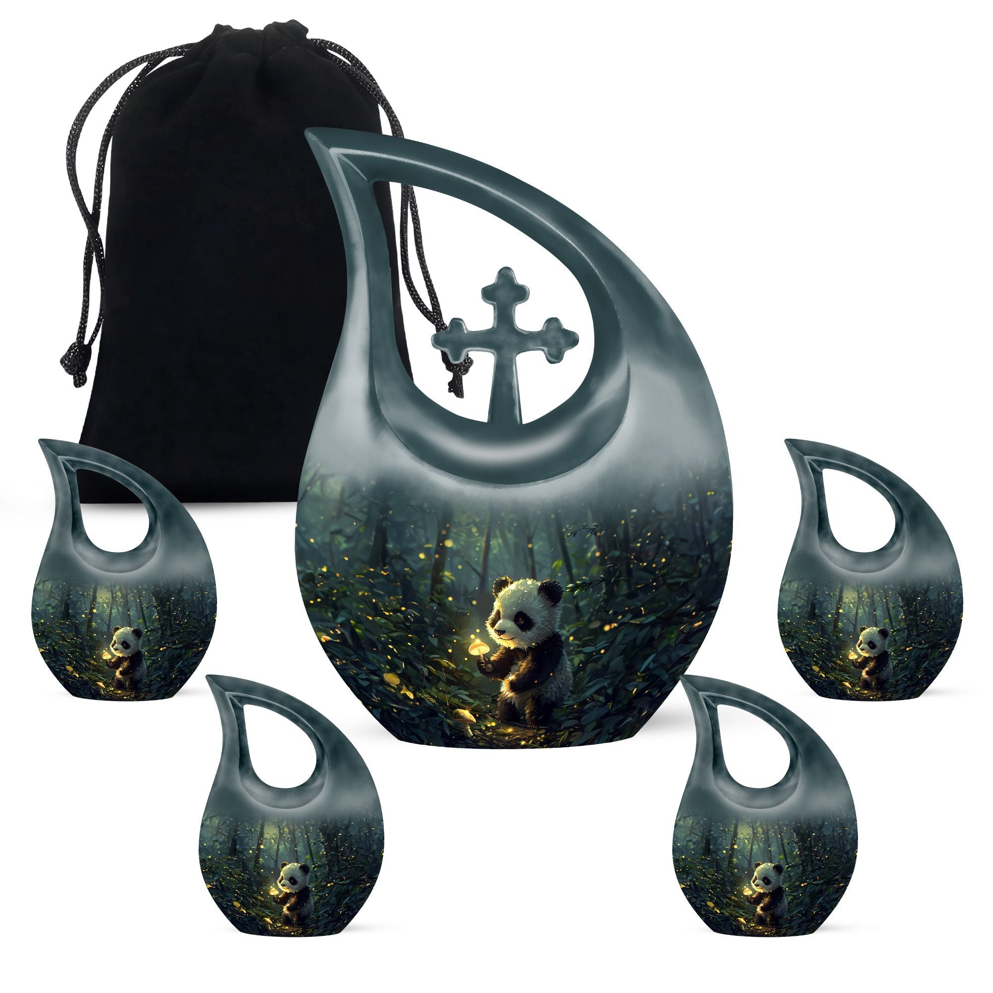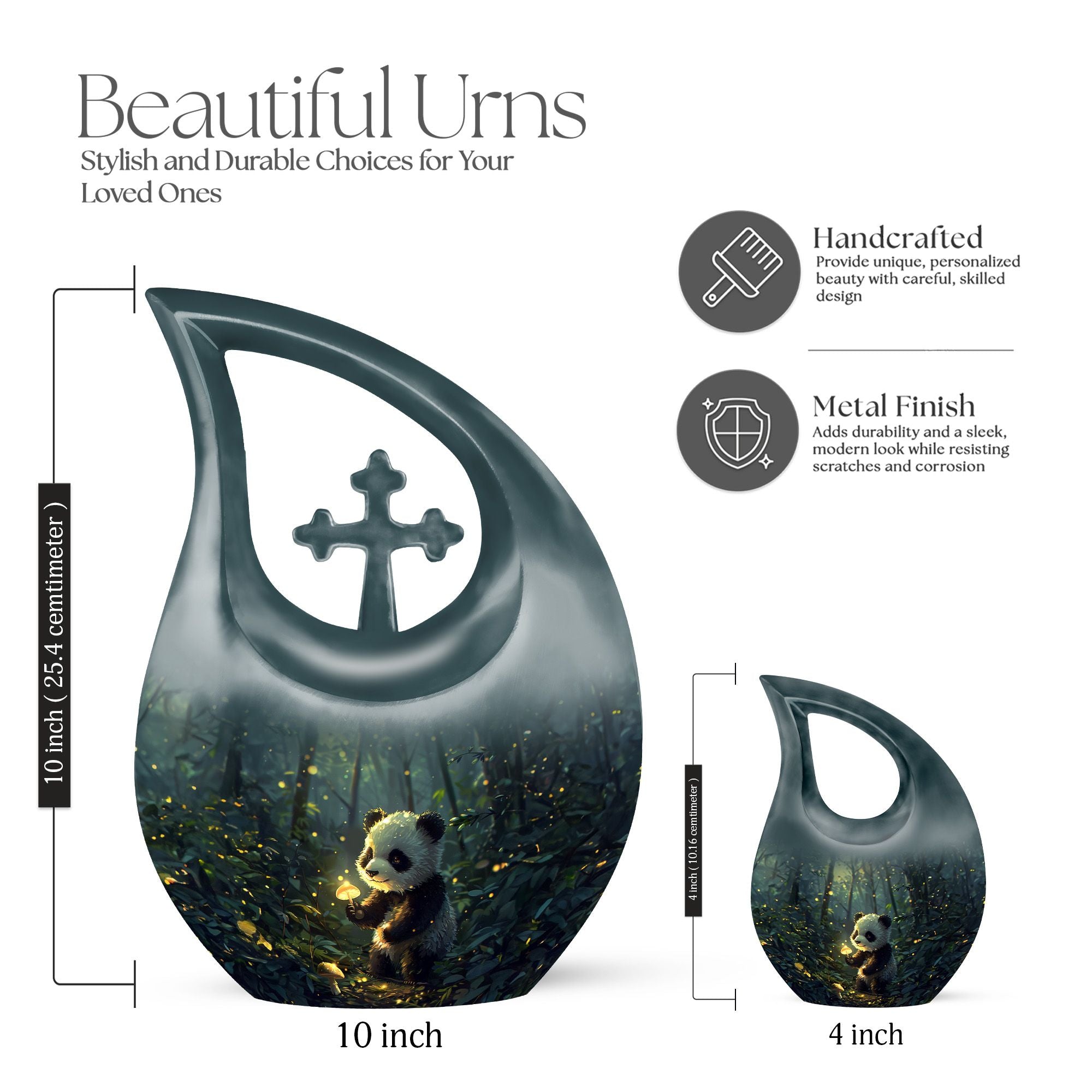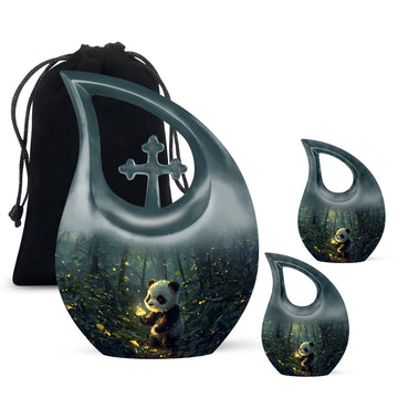 Crafted from durable aluminum, this 10 inch urn features soft panda artwork that conveys harmony and comfort. With a secure screw-top lid and a smooth, elegant finish, it is ideal for those looking for a human cremation urn, cremation urns for human ashes adult set, cremation ashes keepsake, or beautifully designed cremation urn keepsake options. Its craftsmanship ensures long-lasting dignity and dependable protection.