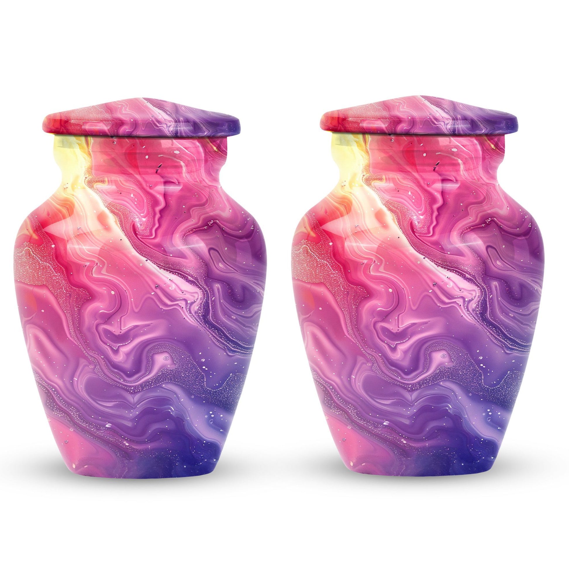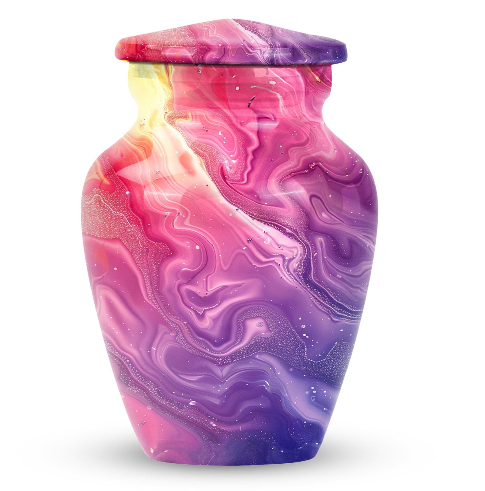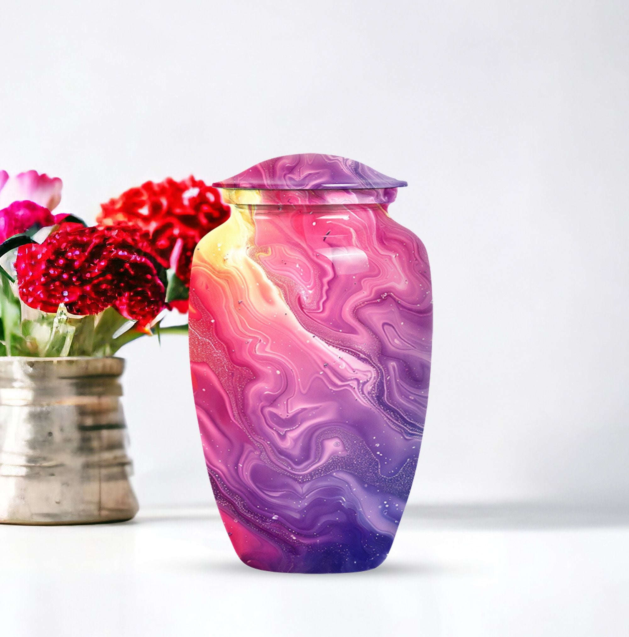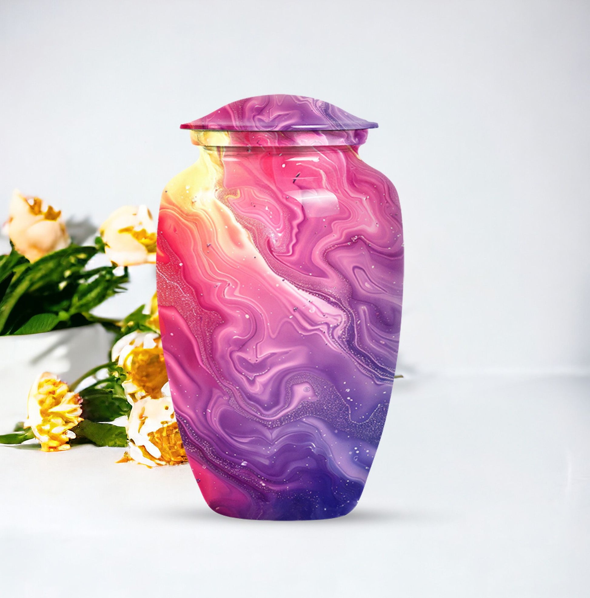 Create a lasting tribute to your loved ones with this Pastel Swirl Urn, a must-have from our collection of high-quality memorial urns. This large urn has a size of 10 inches in height, and its weight is a solid 3.3 pounds, signifying its robust and durable nature. Crafted meticulously from aluminium, it is resilient and long-lasting, a fitting resting place for your cherished one. The urn offers an impressive capacity of 200 cubic inches, apt for accommodating your dear ones' cremation ashes comfortably. The abstract theme adds a touch of artistic beauty, leaving a soothing impression on the onlookers. A notable feature of this cremation adult urn is the option for customization; you can personalize it with the engraved names enhancing the sentimentality attached to it. The urn arrives with a velvet pouch, ensuring the containment of the urn in a respectful and aesthetically pleasing manner. For those seeking burial urns for cremation ashes or human ash adult urns - this contemporary yet timeless urn is an excellent choice.