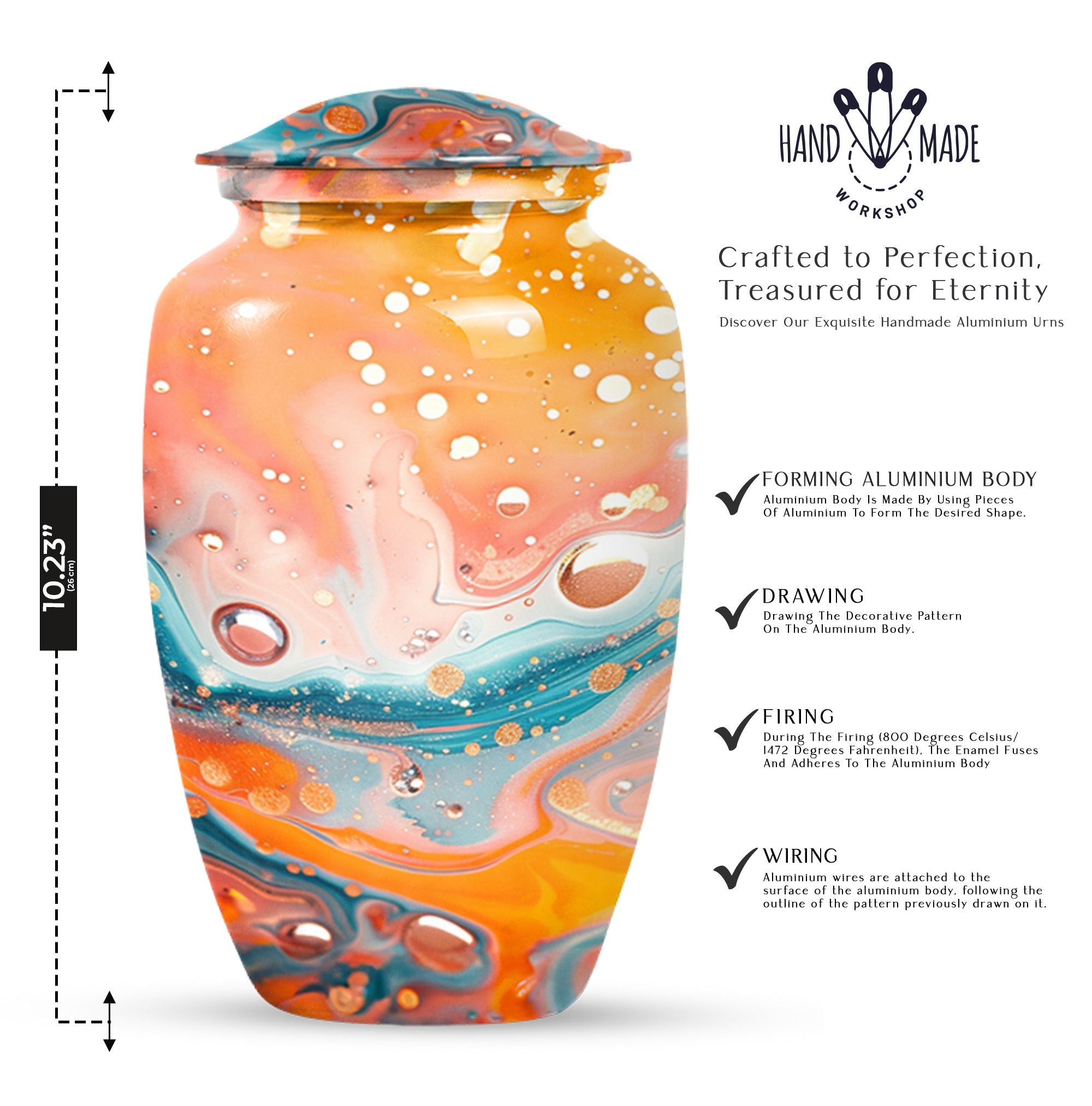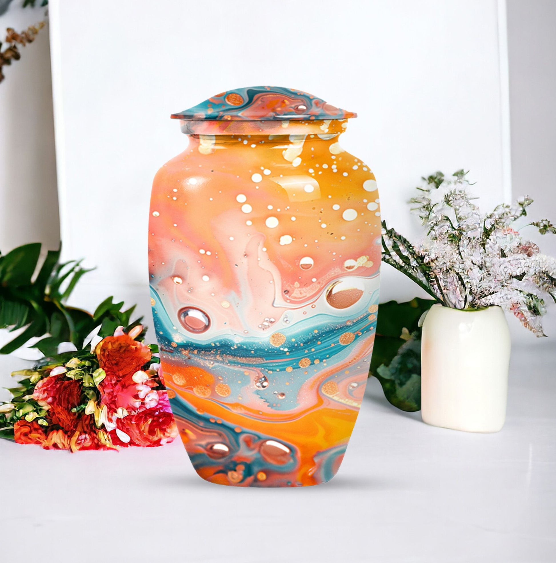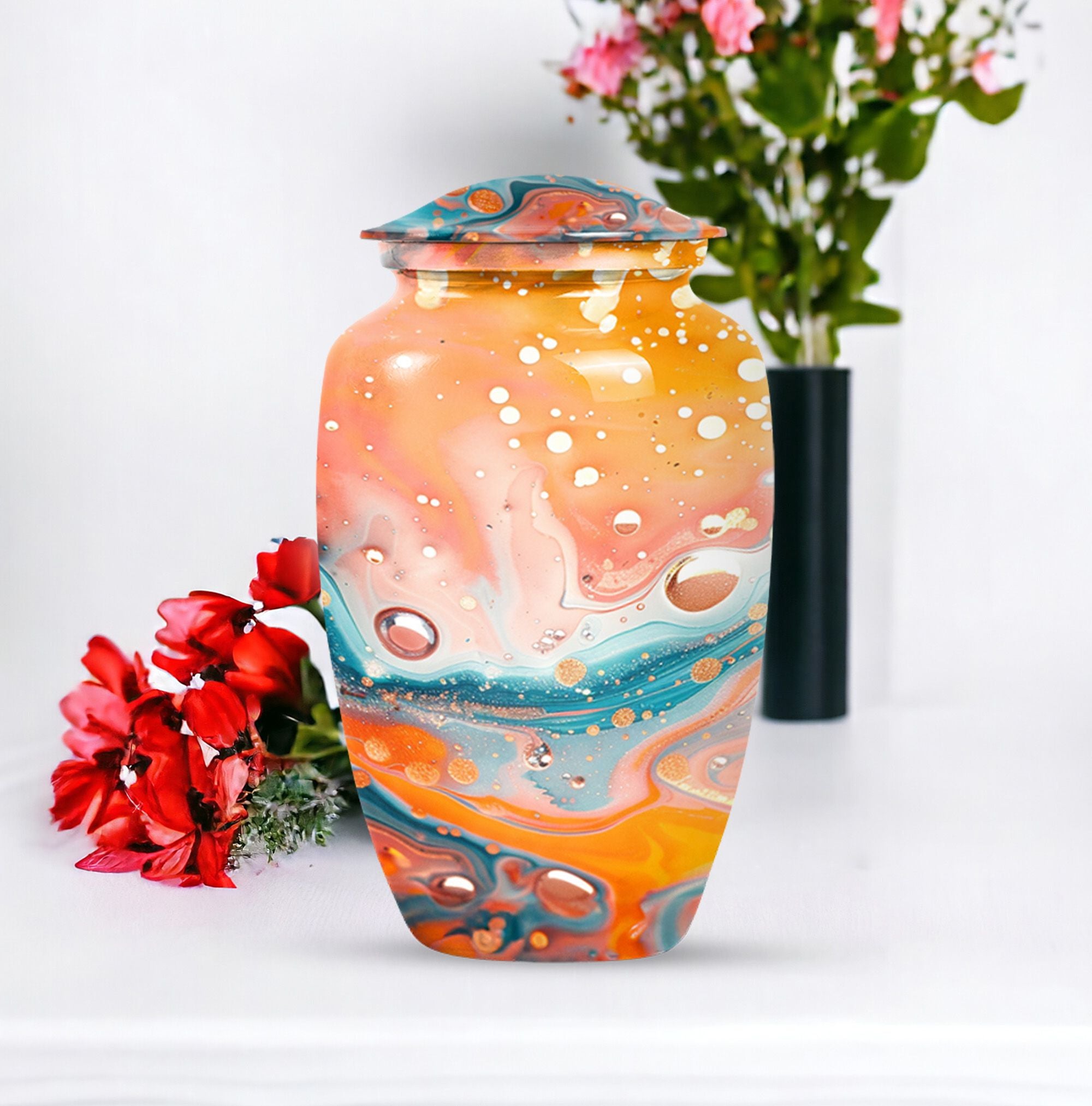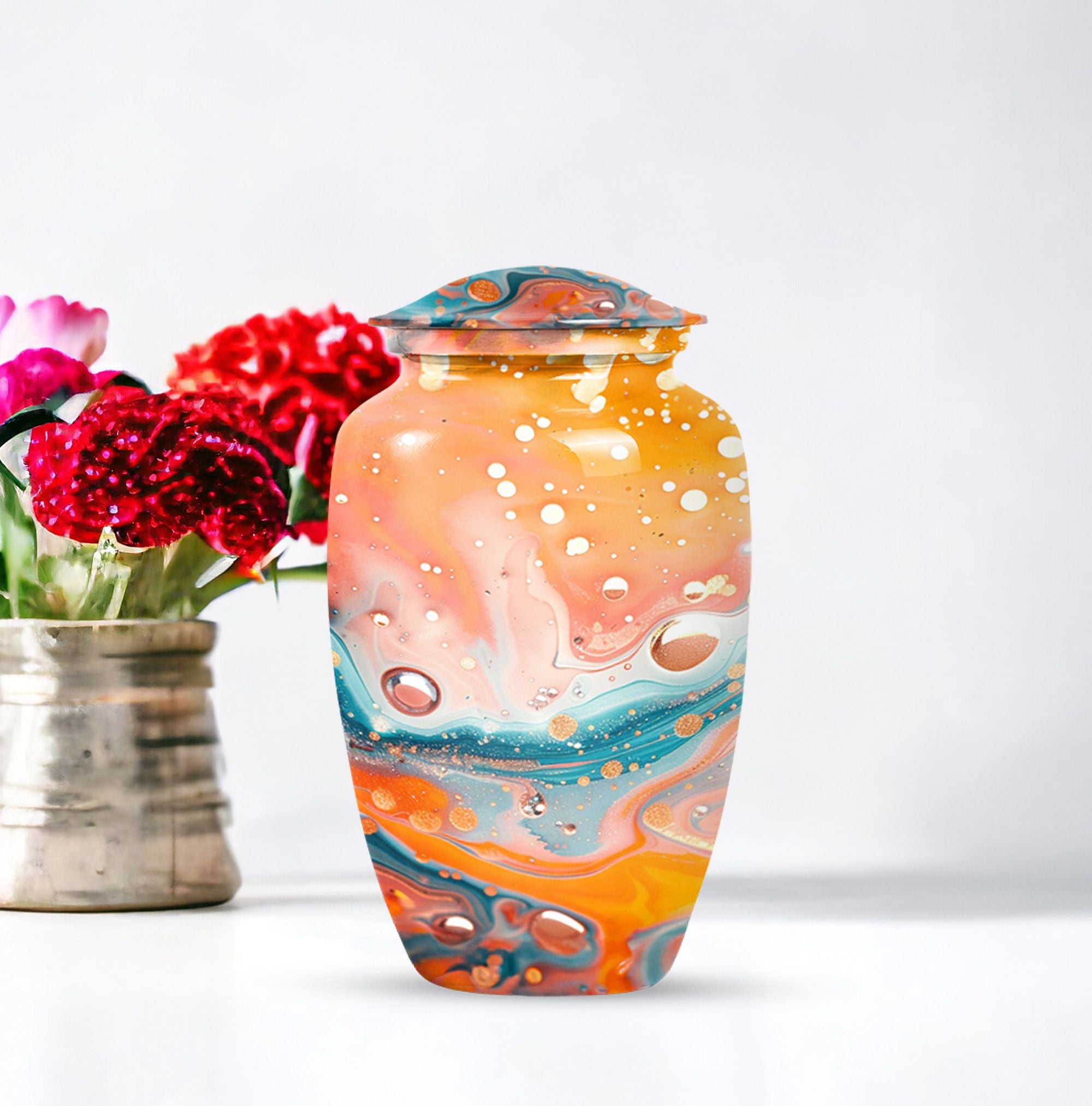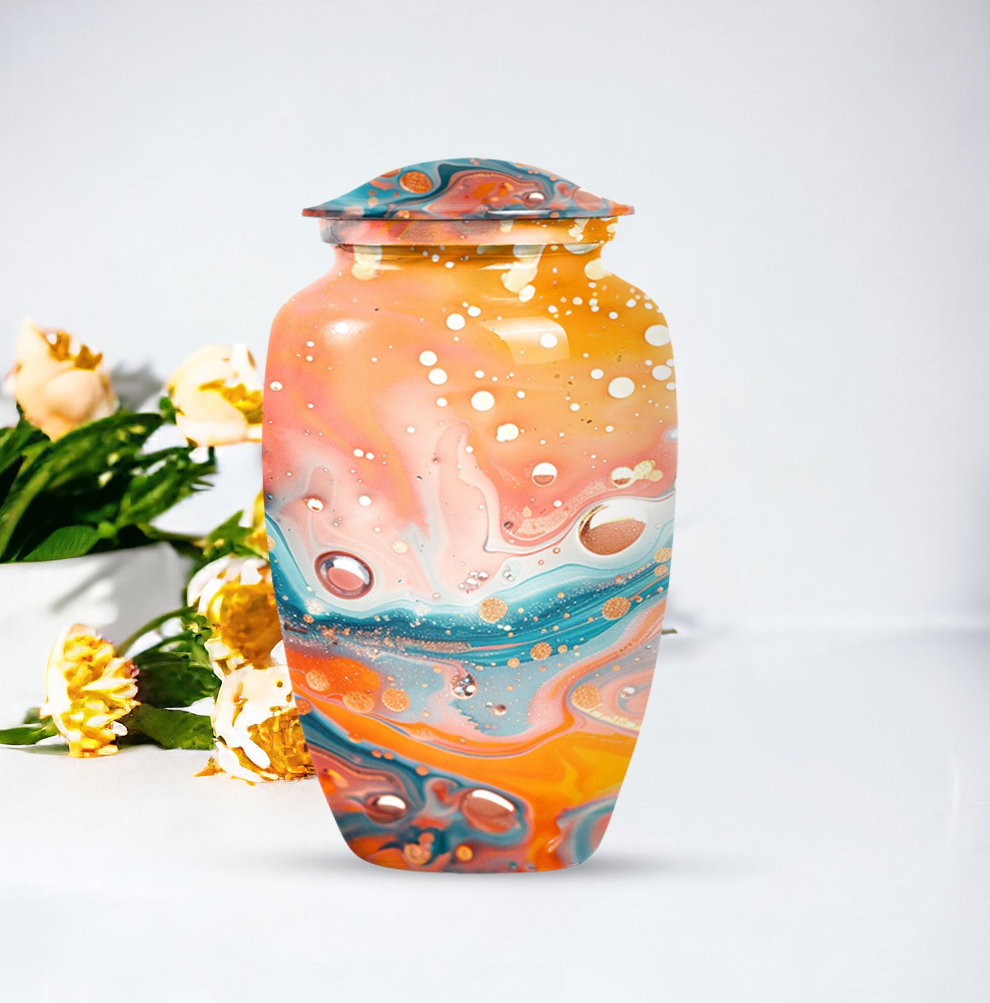 Honoring loved ones made easy with the elegantly crafted Pastel Swirl Urn. This classic-style, large urn for human ashes measures 10 inches in height, offering a capacity of 200 cubic inches. Manufactured using premium aluminium, this urn is designed to be robust and long-lasting. Weighing at a sturdy 3.3 pounds, it can securely contain ashes without any worry. Thoughtfully designed, it comes with a velvet pouch for a dignified containment of ashes. This cremation urn offers an abstract theme, adding a sense of uniqueness and character. Further, to make it extra special, you can personalize it with engraved names. It's an ideal selection for those seeking cremation urns for men, human ash ashes adult female, and urn. Comforting, tasteful, and resplendent, the Pastel Swirl Urn transforms your tribute to your dear ones into a cherished keepsake.