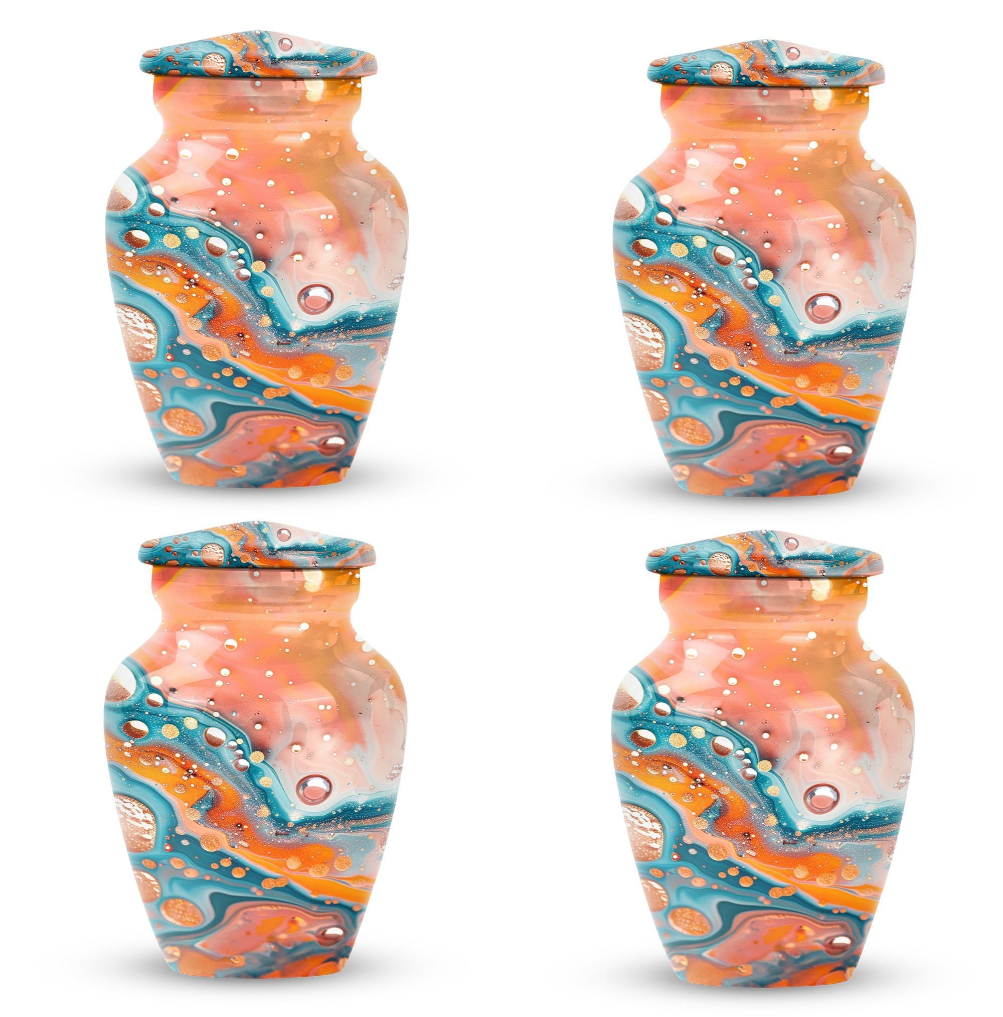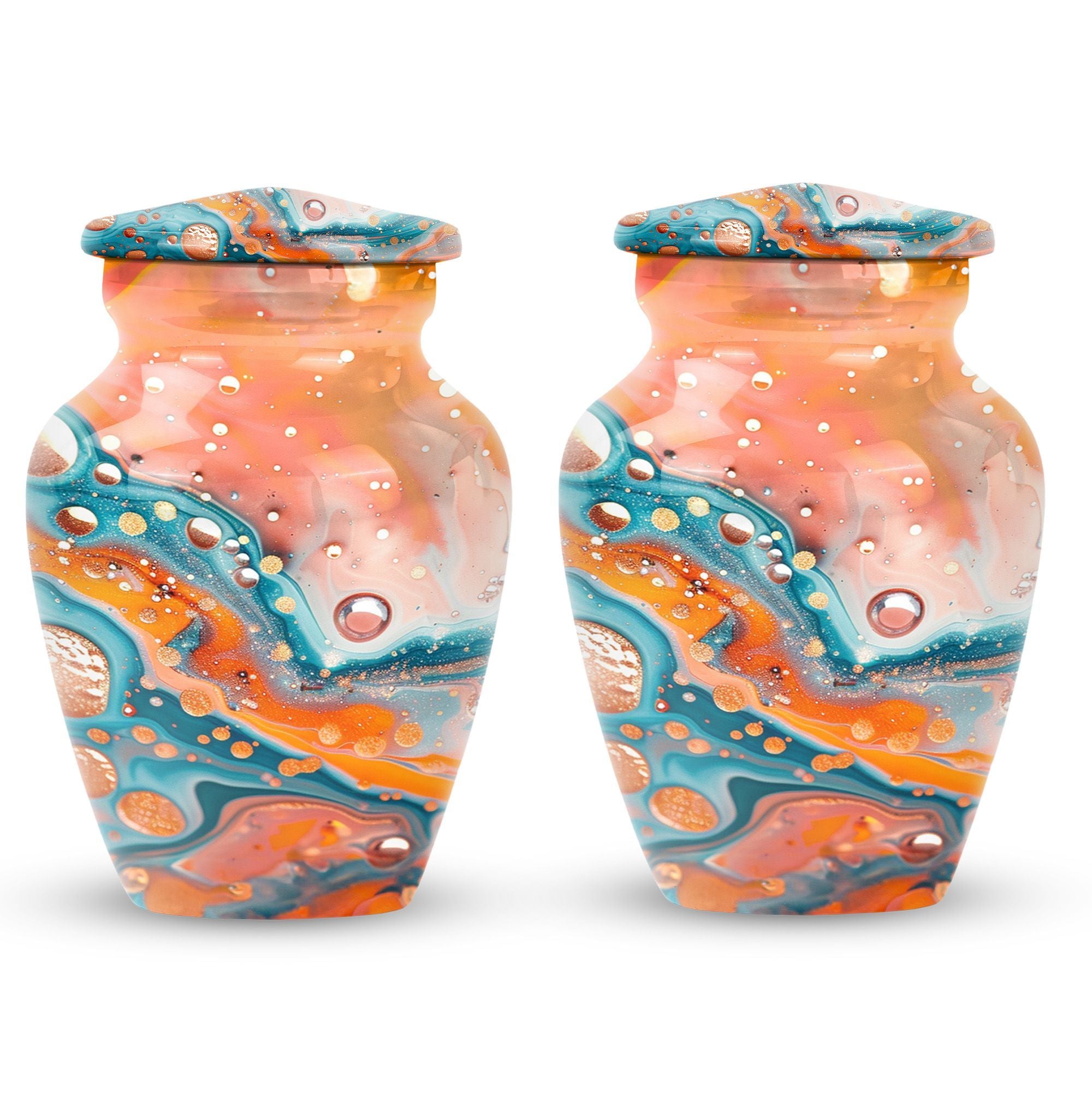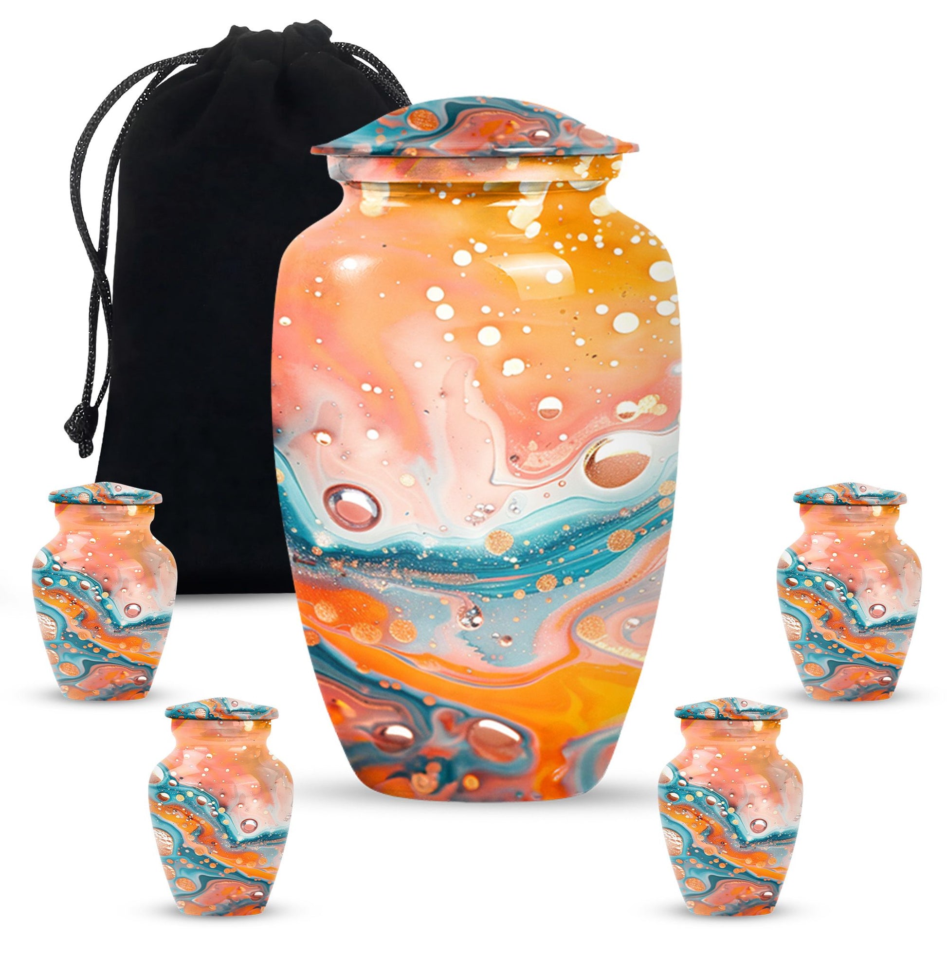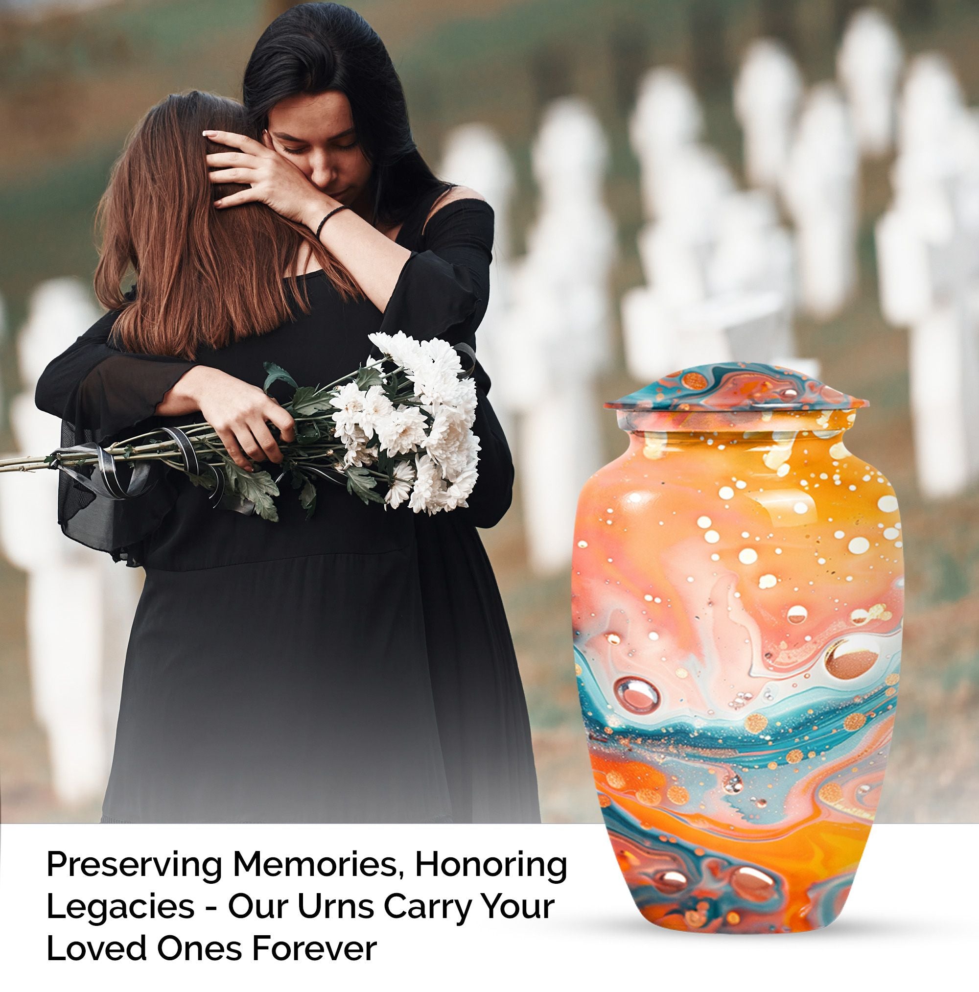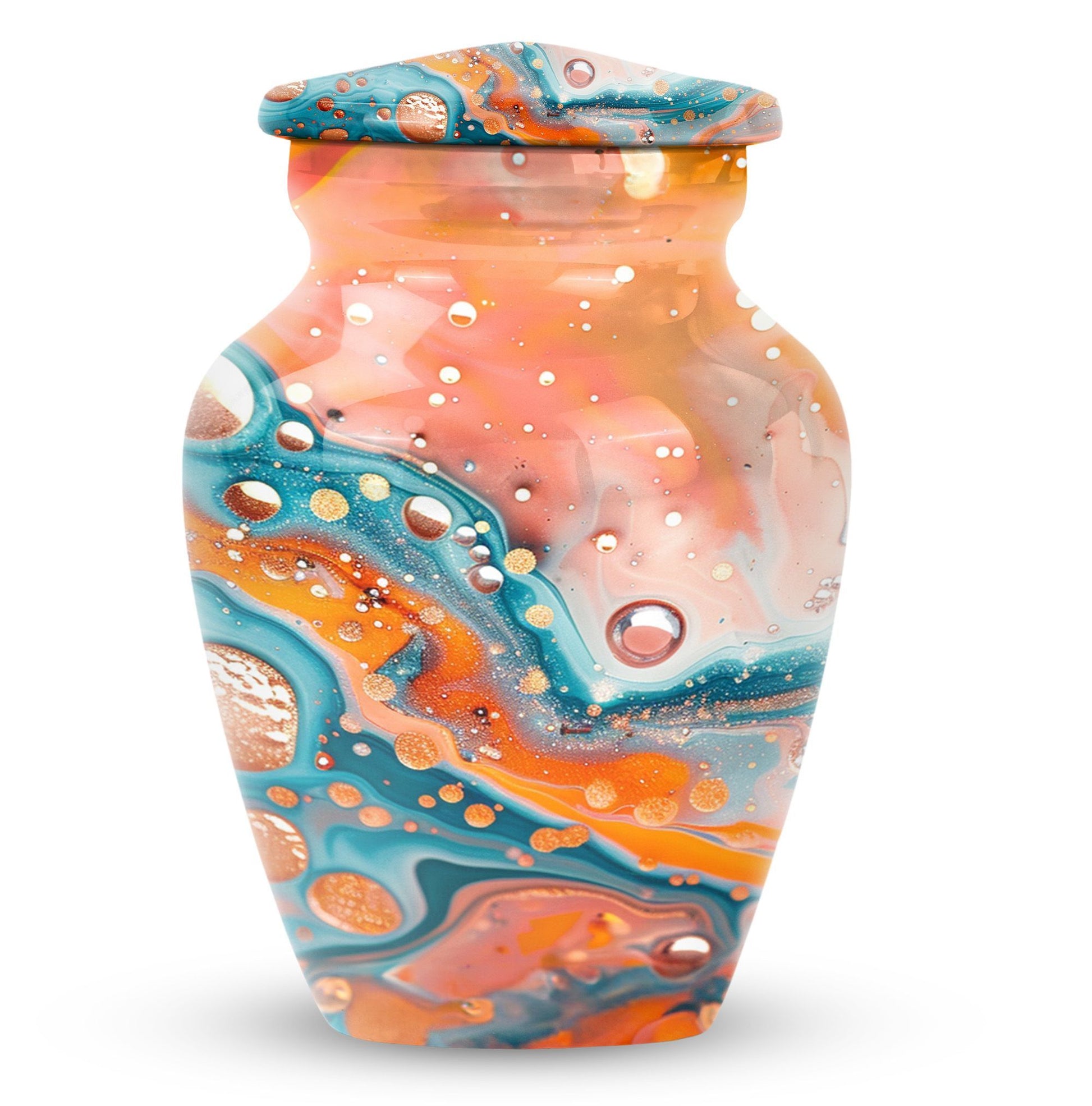 Honoring loved ones made easy with the elegantly crafted Pastel Swirl Urn. This classic-style, large urn for human ashes measures 10 inches in height, offering a capacity of 200 cubic inches. Manufactured using premium aluminium, this urn is designed to be robust and long-lasting. Weighing at a sturdy 3.3 pounds, it can securely contain ashes without any worry. Thoughtfully designed, it comes with a velvet pouch for a dignified containment of ashes. This cremation urn offers an abstract theme, adding a sense of uniqueness and character. Further, to make it extra special, you can personalize it with engraved names. It's an ideal selection for those seeking cremation urns for men, human ash ashes adult female, and urn. Comforting, tasteful, and resplendent, the Pastel Swirl Urn transforms your tribute to your dear ones into a cherished keepsake.