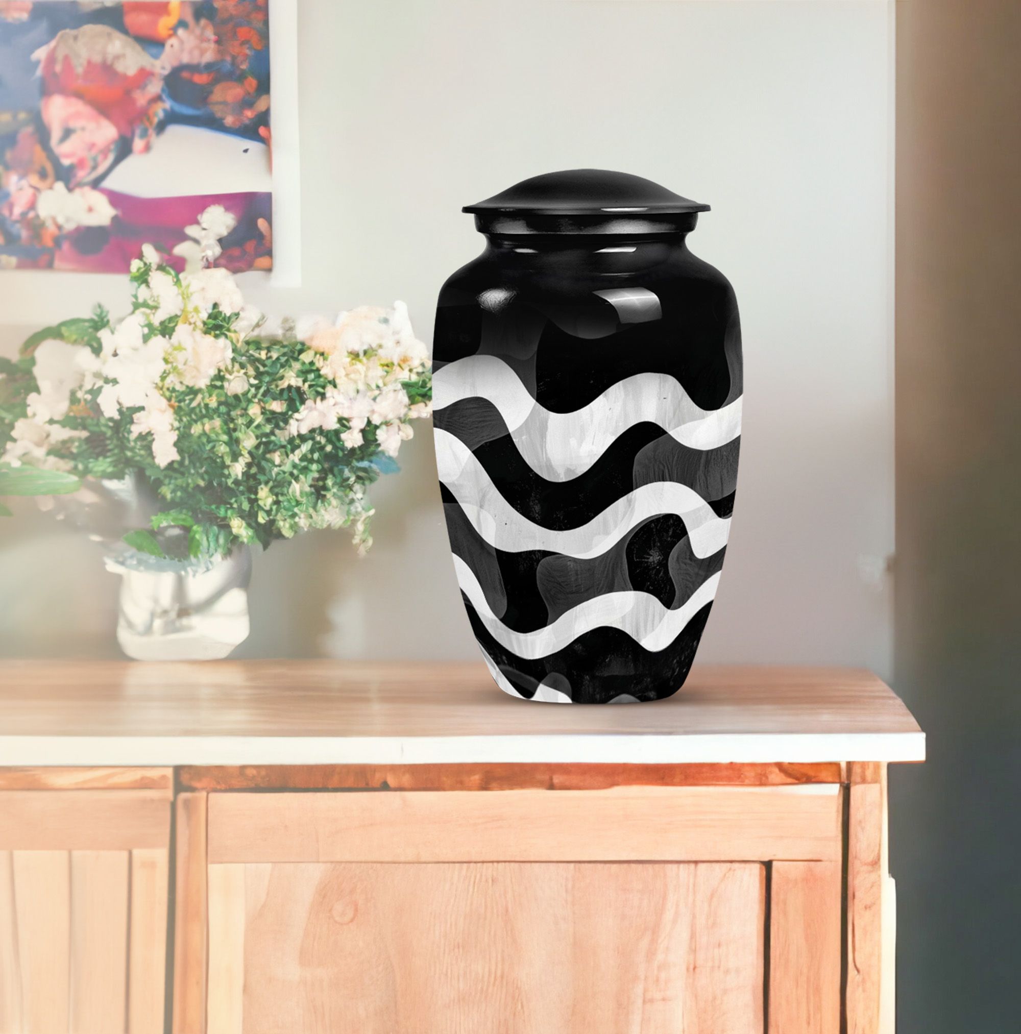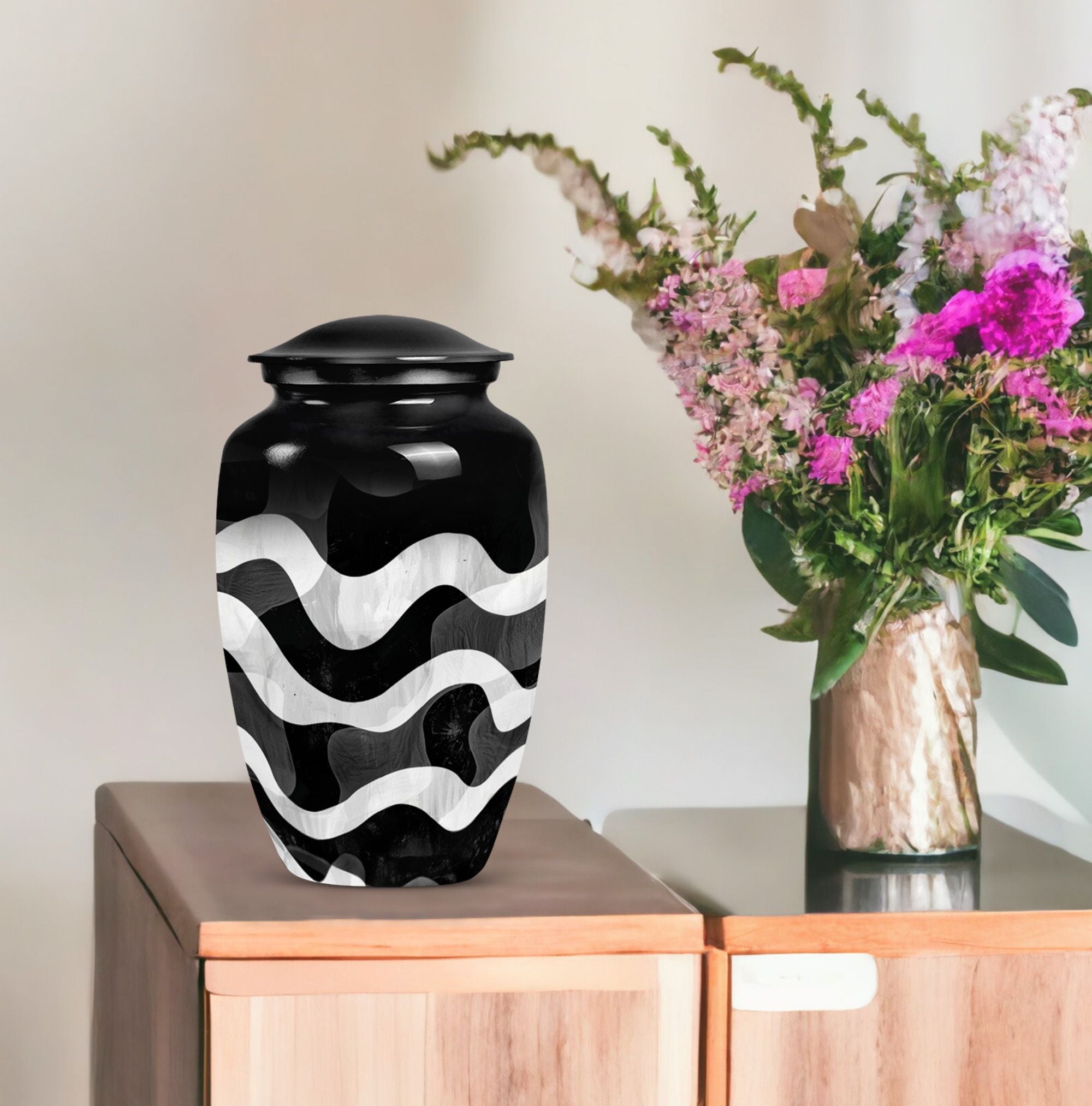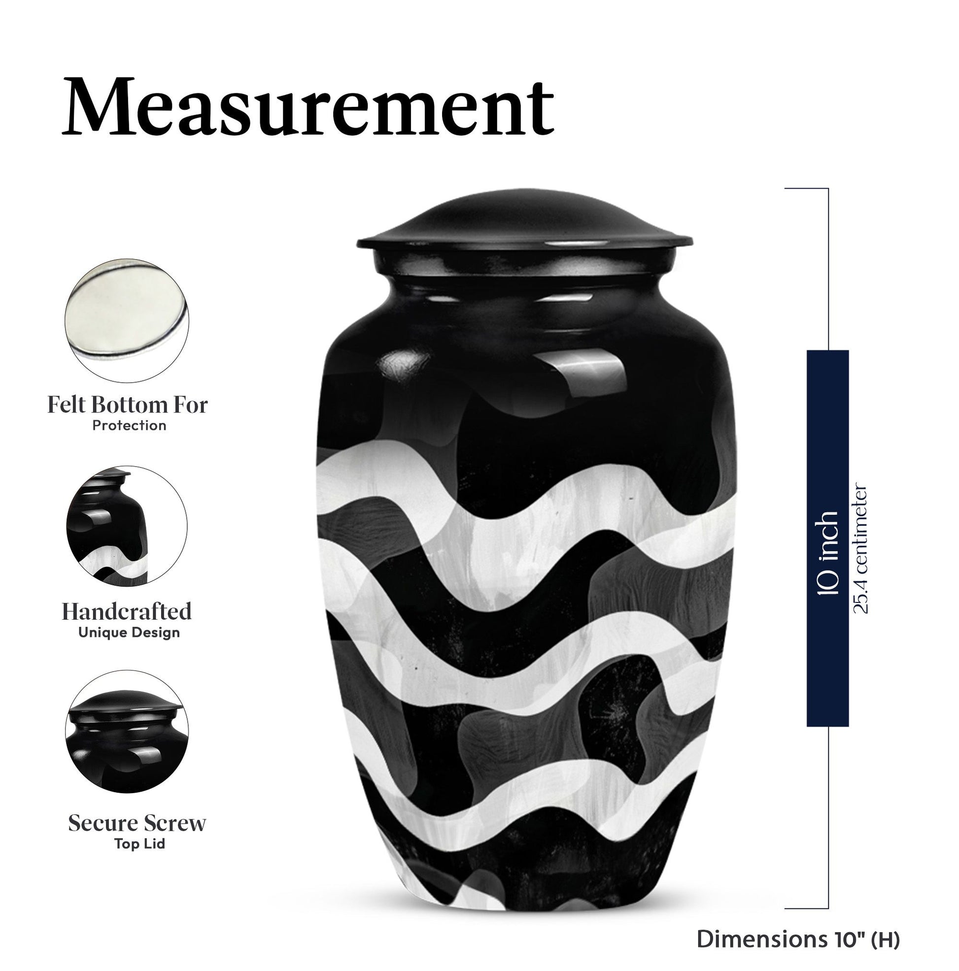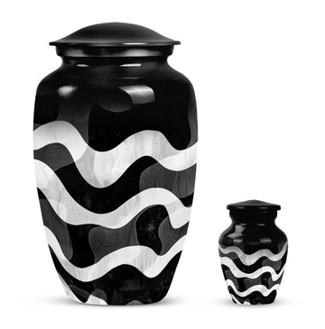 For those wishing to honor their loved ones in a heartfelt and distinctive way, look no further than this uniquely patterned urn. This large urn, with its 10-inch stature, combines artistry and functionality. It is constructed from top-notch aluminium, ensuring long-lasting durability and preserving the sanctity of contents. Furthermore, it is robust, weighing a solid 3.3 pounds. The urn's capacity of 200 cubic inches makes it an ideal choice for preserving human ashes. The package also includes an elegant velvet pouch for containment of ashes, adding a touch of sophistication and tactility. Personalizing the urn is possible as it comes with an option for engraving names, leaving a lasting memory of your cherished one. Search phrases such as 'funeral urn for mom', 'urn ash ashes adult', 'burial urns', and 'cremation urn adult' may lead you to this remarkable creation. This abstract-themed classic urn is an outstanding choice for a memorial ceremony supplies, channeling the profound of respects, love, and memories.