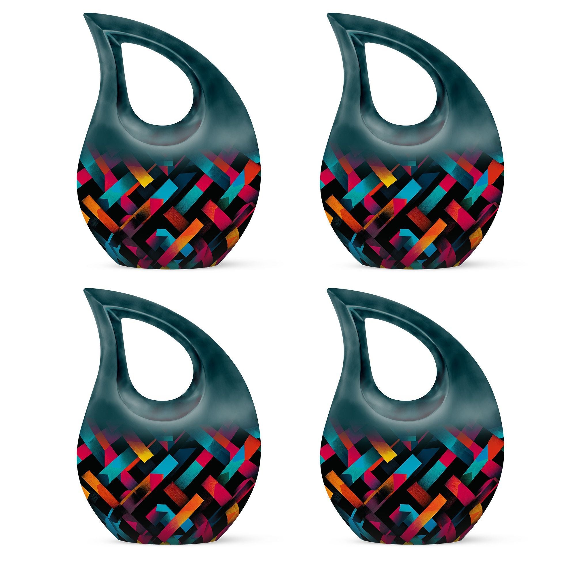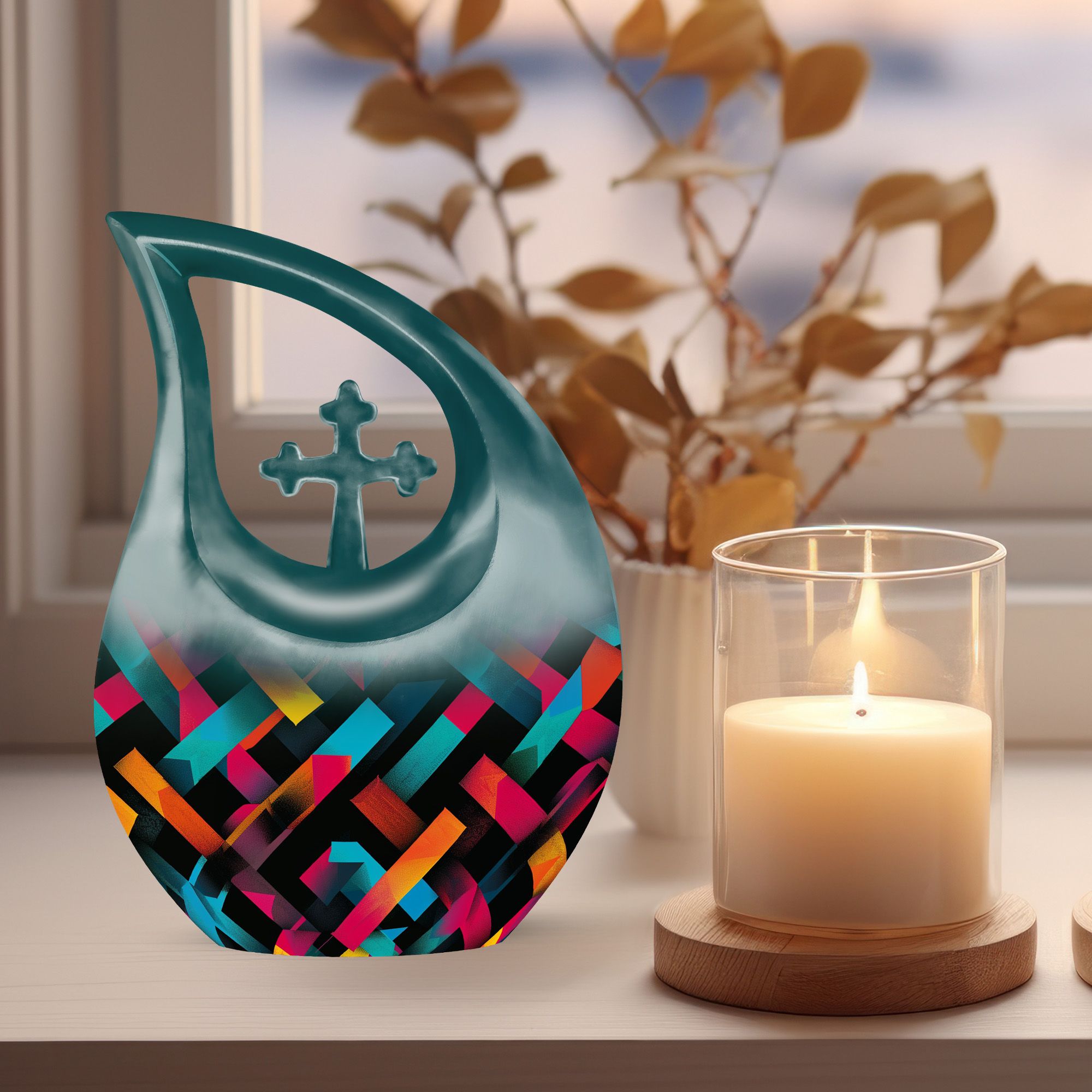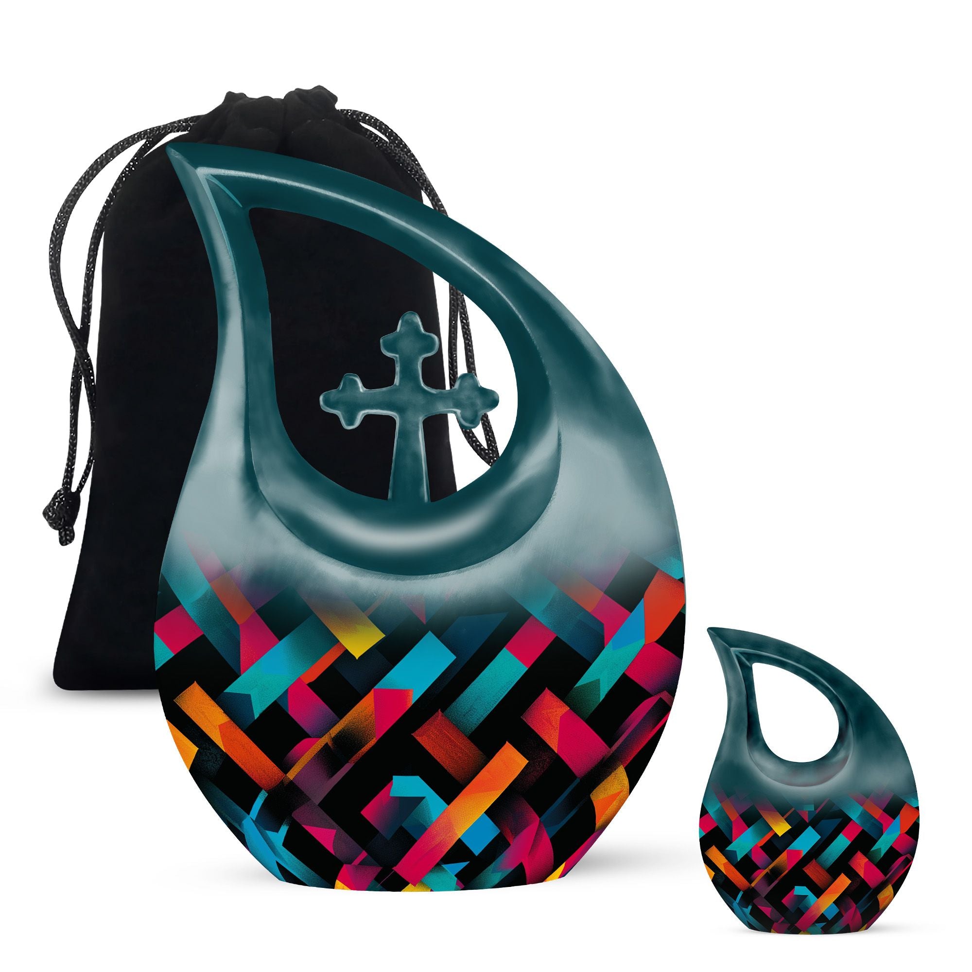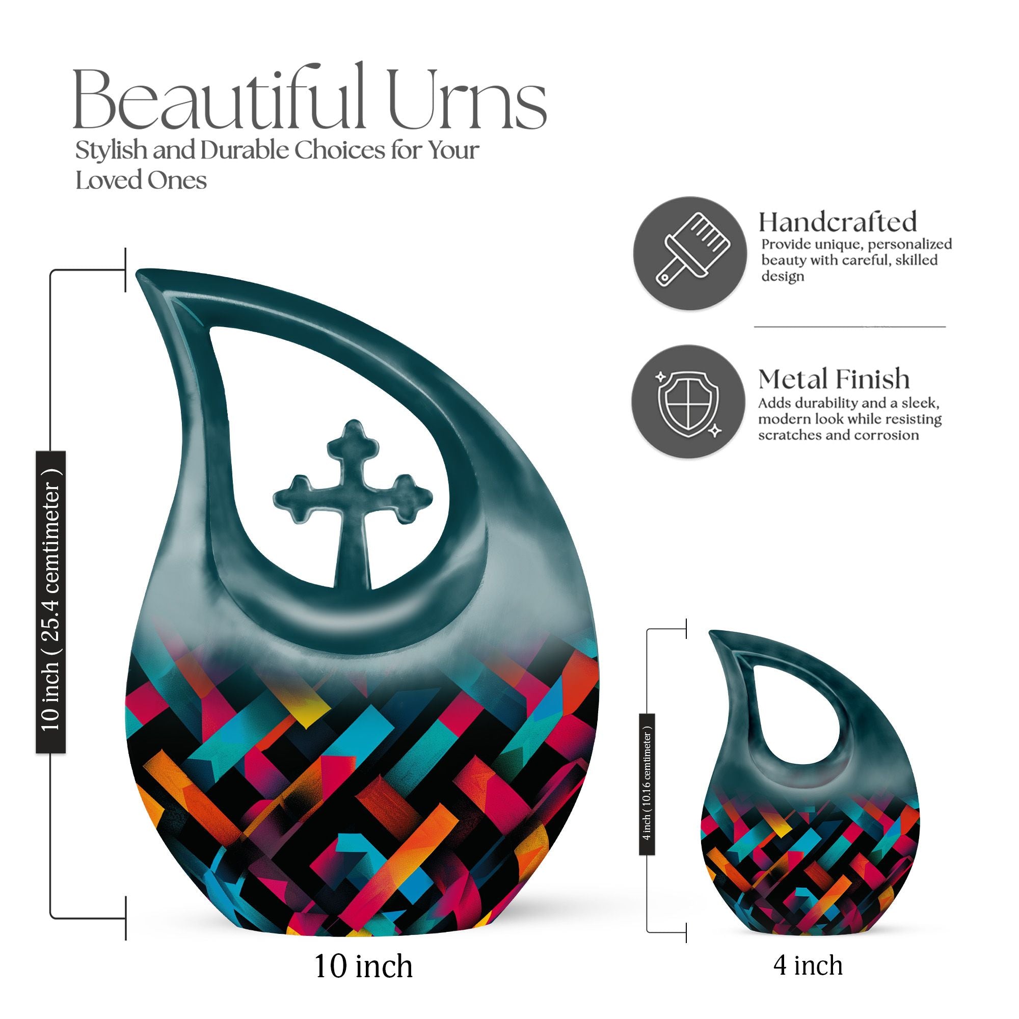 Honor the memory of your loved ones with this meticulously crafted 10-inch Pattern Urn. Boasting a unique design theme, this cremation container features a soothing 'Cross Drop' design. Each urn is precision-crafted from durable aluminium, ensuring longevity and heartening preservation. With a substantial capacity of 200 cubic inches, the urn comfortably holds the ashes of your loved one, acting as a touching tribute to their life. The urn weighs 3.3 pounds and displays a balance of robust durability and delicate design. Augment its significance with your personalized touch by engraving names onto the urn, making it an artifact of cherished memories. Further, the package comes supplied with a velvet pouch for dignified containment of ashes. Our large urns harmoniously blend design and practicality, serving as ideal memorial urns or burial urns. Remember, cherish, and celebrate your loved ones with our unique selection of personalized urns for ashes.