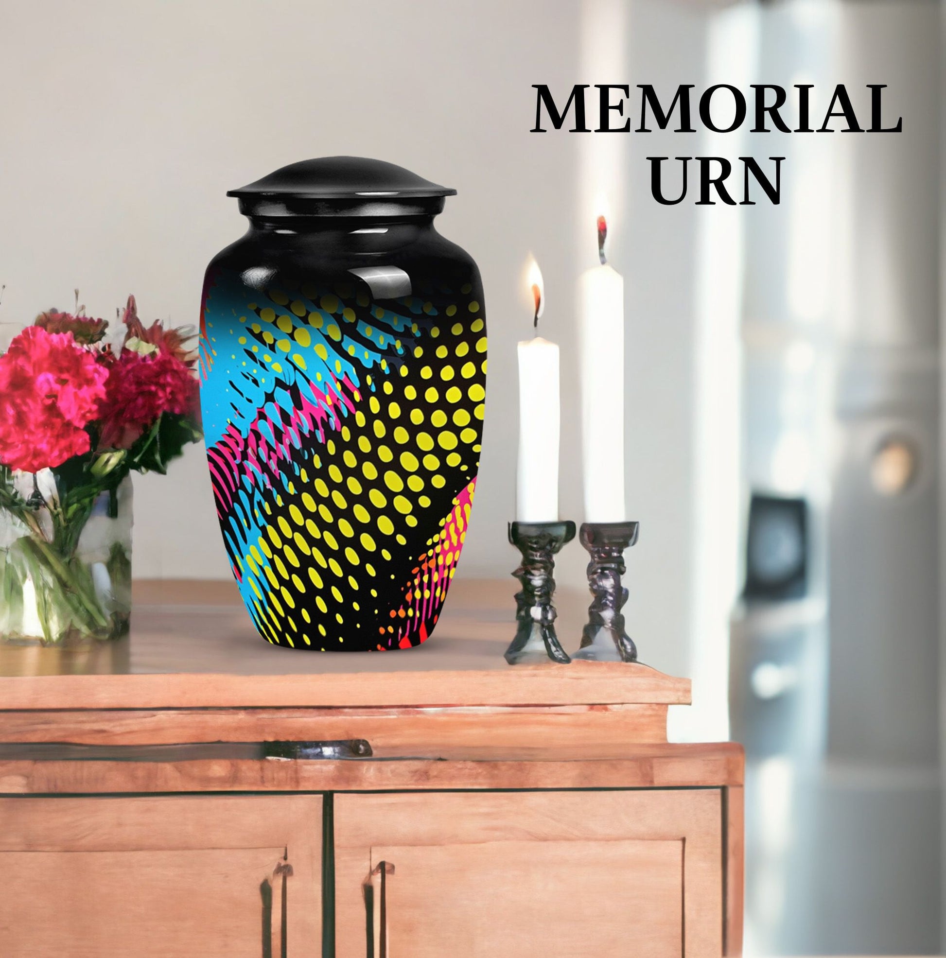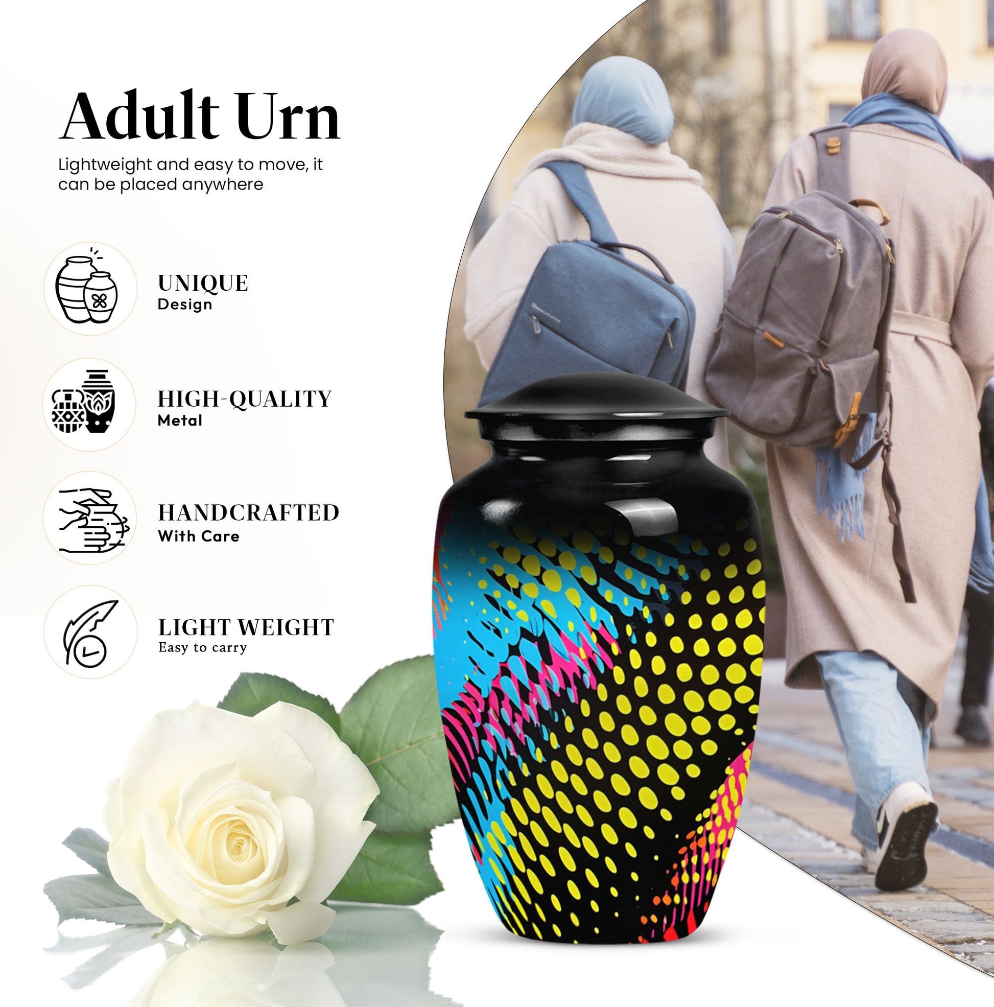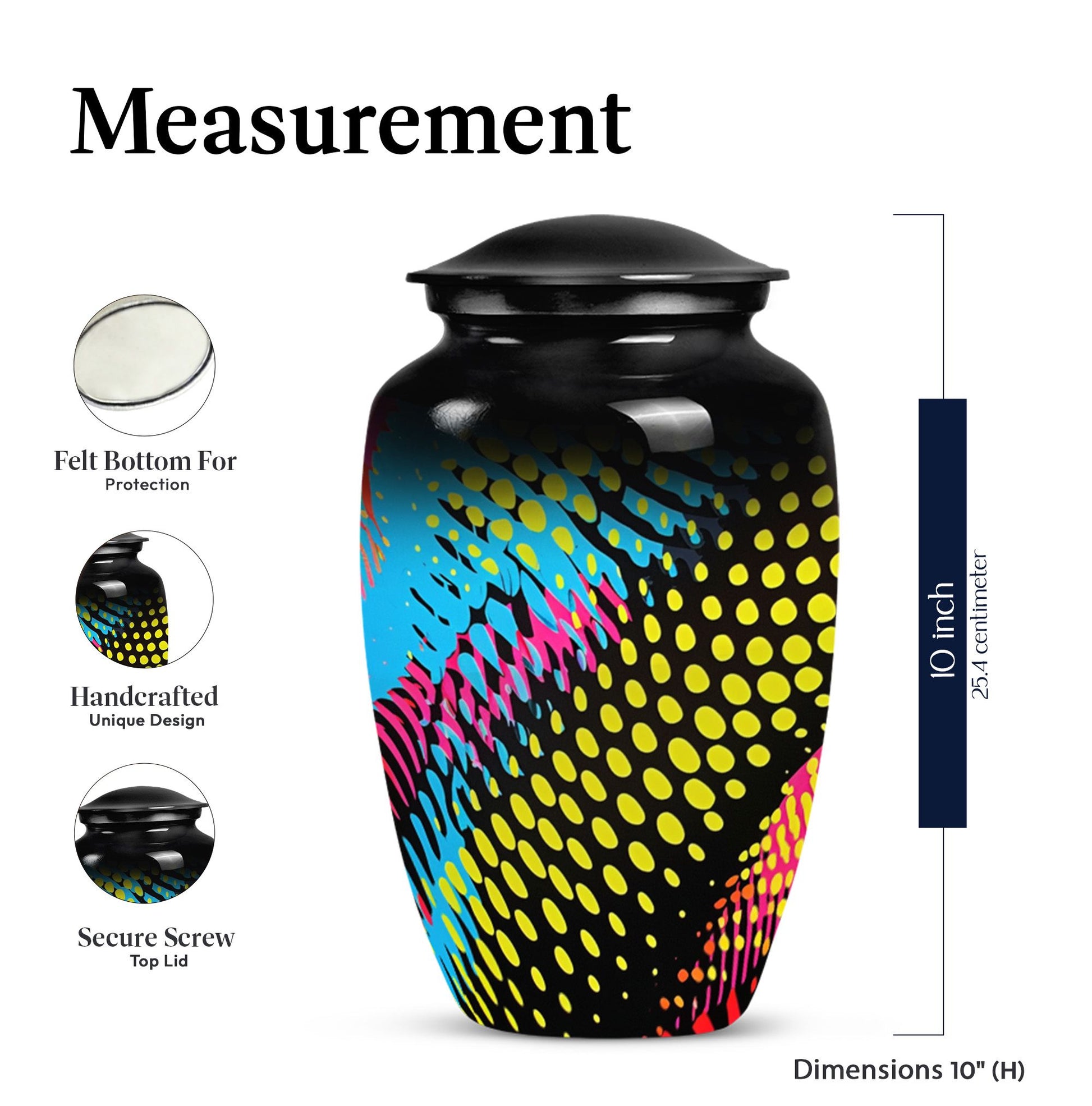 Discover the deep symbolism and comfort in our uniquely Pattern Urn, handcrafted for adult human ashes. Measuring 10 inches in height, perfectly proportioned, and weighing a solid 3.3 pounds, this cremation personalized urn unites artistry and functionality. The large urn is gracefully designed from Aluminium, embodying an Abstract theme that resonates with sentiments, making it a respectful resting place for your loved one. It accommodates up to 200 cubic inches of ashes based on the classic urn design. Our package includes a plush velvet pouch for keeping the remains contained and secure. We also offer an option to personalize with engraved names, adding an invaluable personal touch to this urn. Our cremation urn is not just an object but a cherished token that symbolizes enduring love and remembrance. Ideal for those seeking urns for cremation ashes for men or personalized urns for cremation ashes for the beloved mother. Let our urn ash burial urn brighten your memories and soothe your heart.