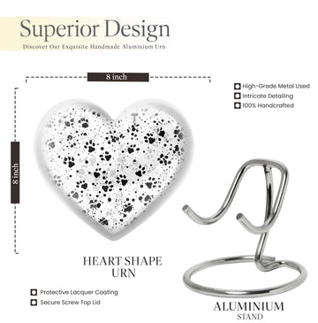 Discover the PAWS Urn, an impeccably crafted funeral keepsake designed for male adults. Tailored with an abstract theme, this large urn is precisely constructed with the highest standard aluminium to serve as a treasured memorial. Holding a generous capacity of 200 cubic inches, its robustness is further highlighted by its 10-inch stature and a weight of 3.3 pounds. The urn's quaint customization feature allows you to personalize it with engraved names, adding a touch of intimate remembrance. Its unique 'heart urn' design sways away from traditional urn forms, providing an endearing aesthetic. The product also comes with a plush velvet pouch intended for the safeguarding of ashes. While primarily specified as a 'cremation urn' for males, it is not limited as such. Our collection also includes female urns and Companion Urns for Two Adults. Please note that irrespective of its use, every single urn is crafted with the highest level of dedication, symbolizing love, honor, and respect.