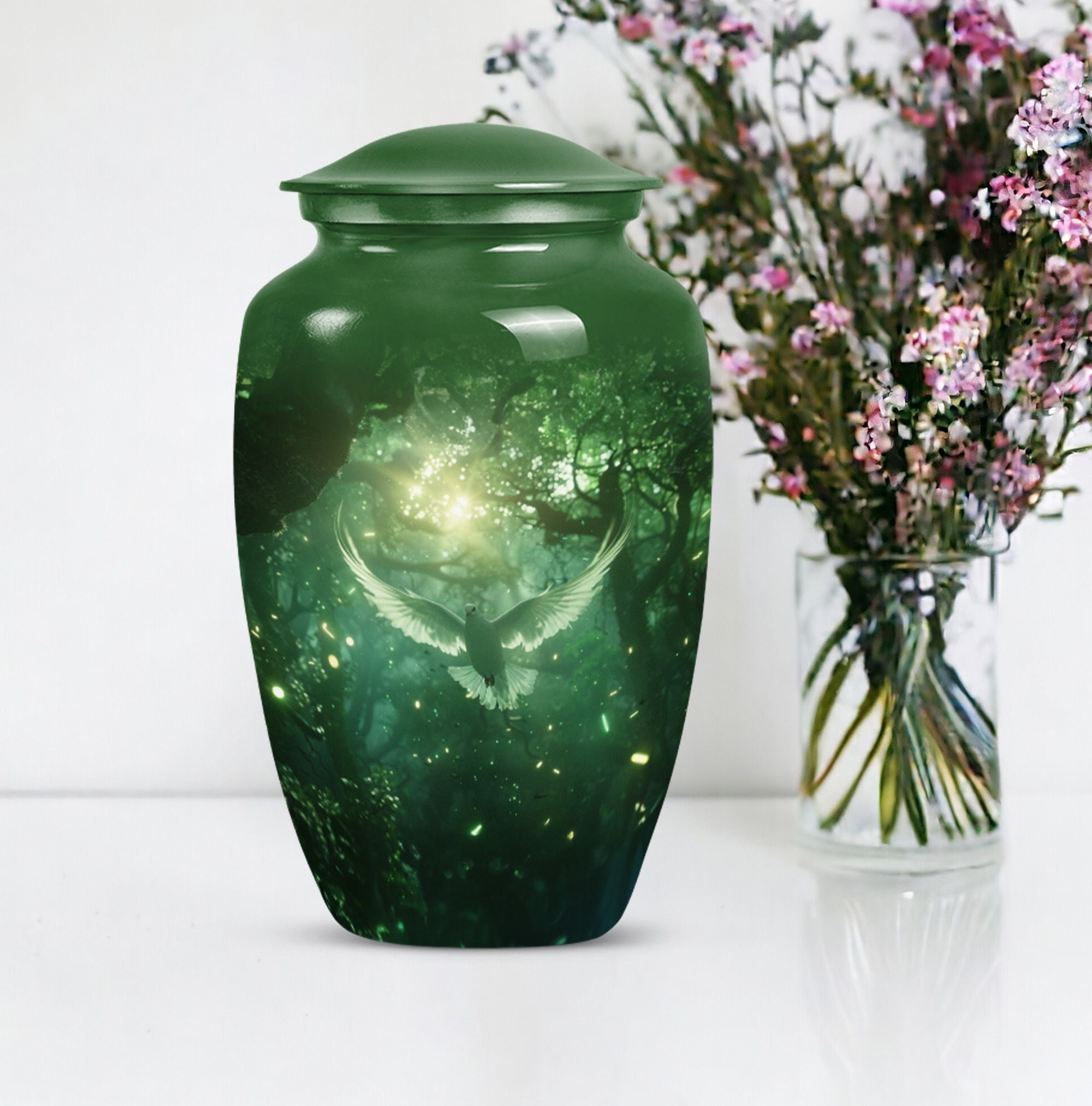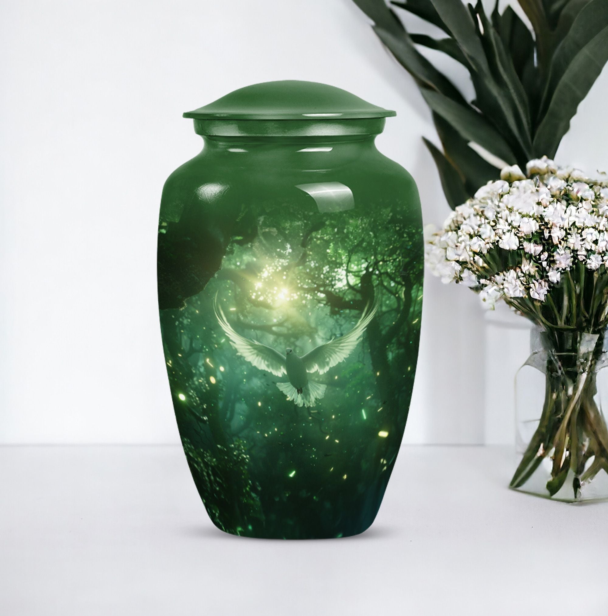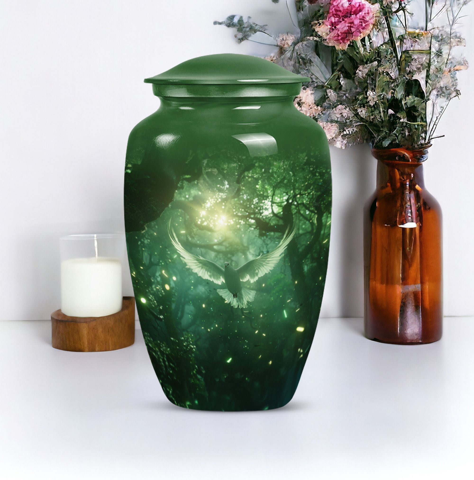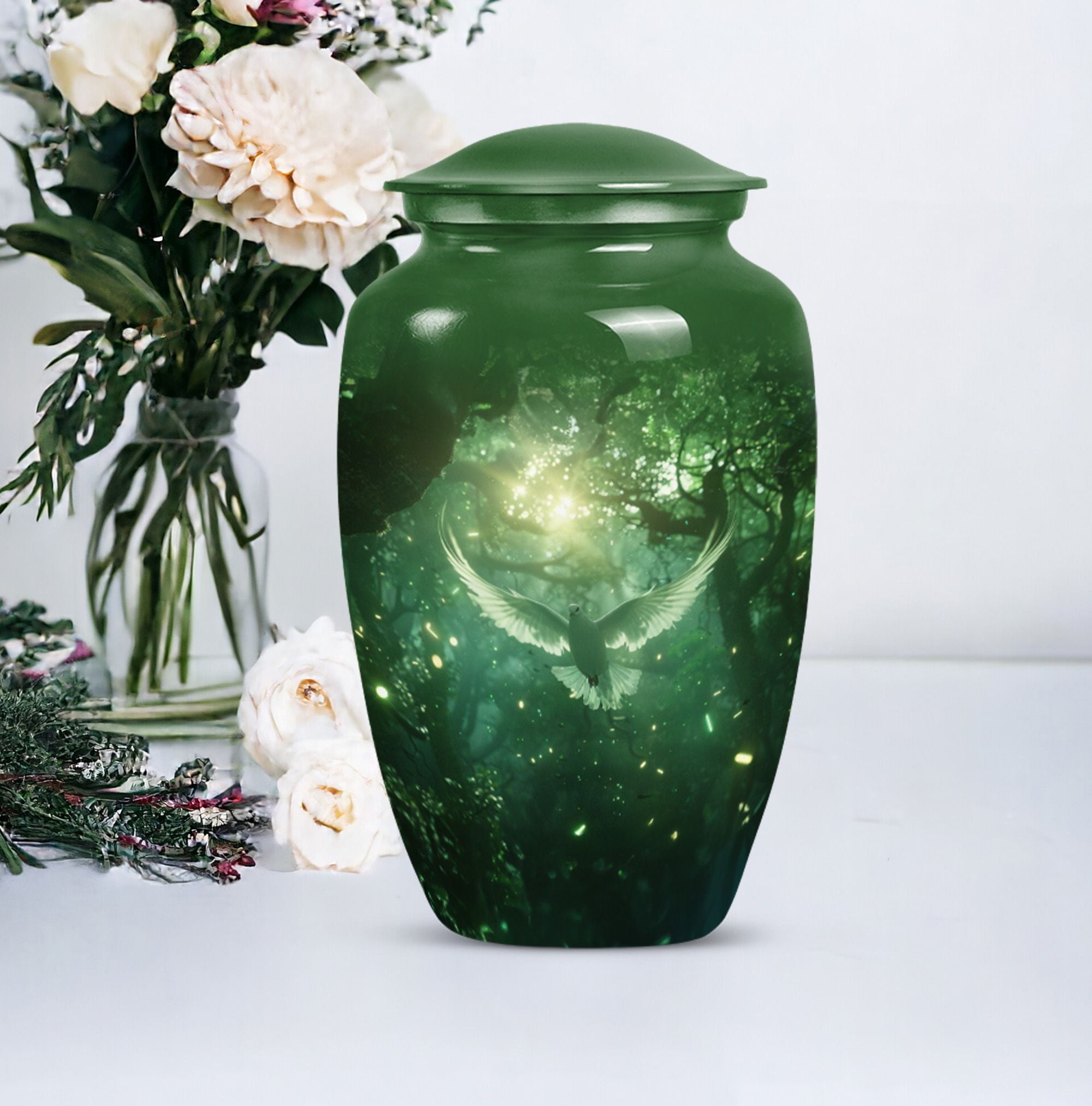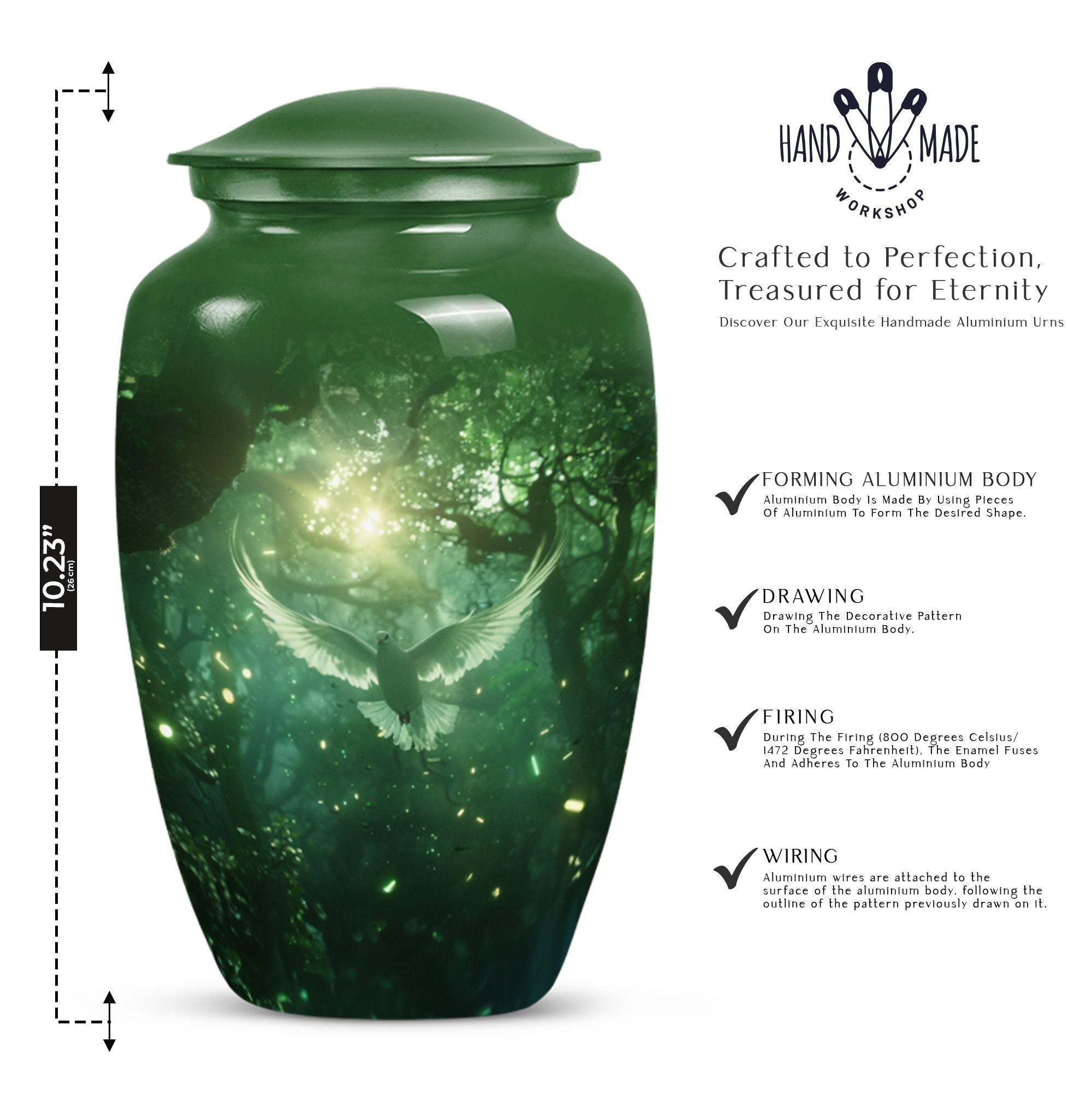 Experience the tranquility and peace offered by our Dove Urn, a timeless memorial medium-sized urn skillfully crafted from durable aluminium. With its impressive 10-inch height and a weight of 3.3 pounds, this large funeral urn captivates with its traditional design and graceful dove theme. Besides its beautiful physical attributes, it offers a substantial internal capacity of 200 cubic inches, ideal for adults. The urn also comes with a tastefully designed velvet pouch for respectful containment and transportation of the ashes. This exquisite urn strikes the perfect balance between functionality and aesthetic appeal, making it an excellent pick for those wanting to celebrate their loved ones' memories. Personalize this cremation urn with engraved names to add that unique, intimate touch. The soothing presence of this treasured piece is sure to bring comfort during challenging times. Note: ash burial urn and cremation urns for human ashes are common search terms in this category by those who treasure the quiet dignity and expressive power offered by such memorable objects.